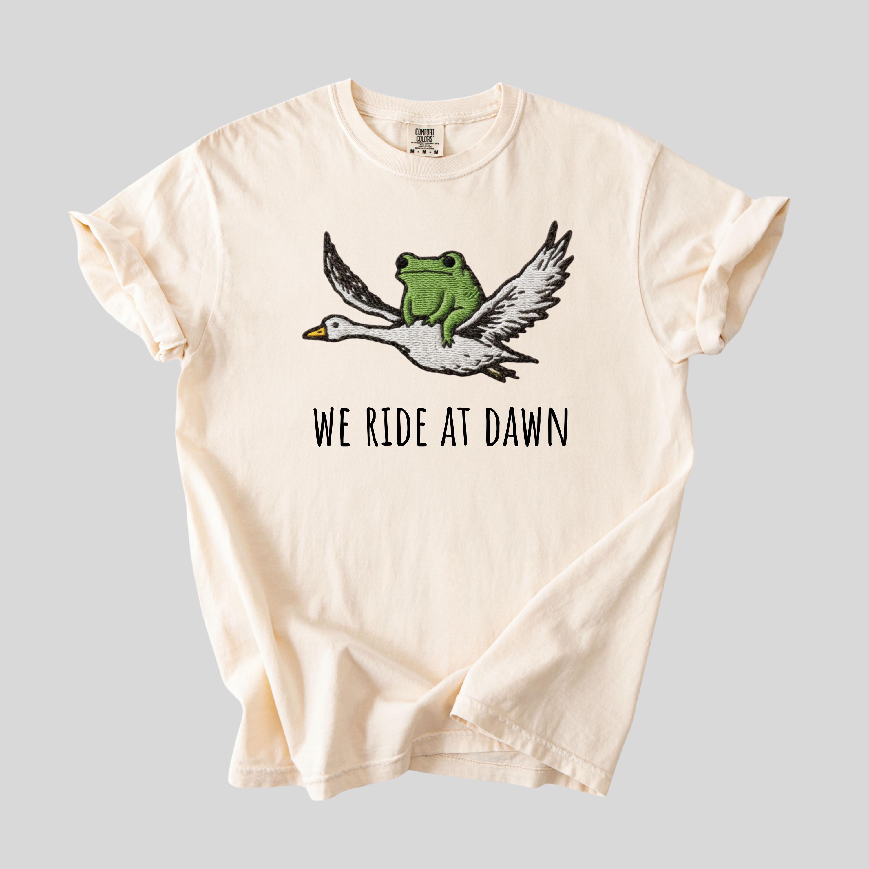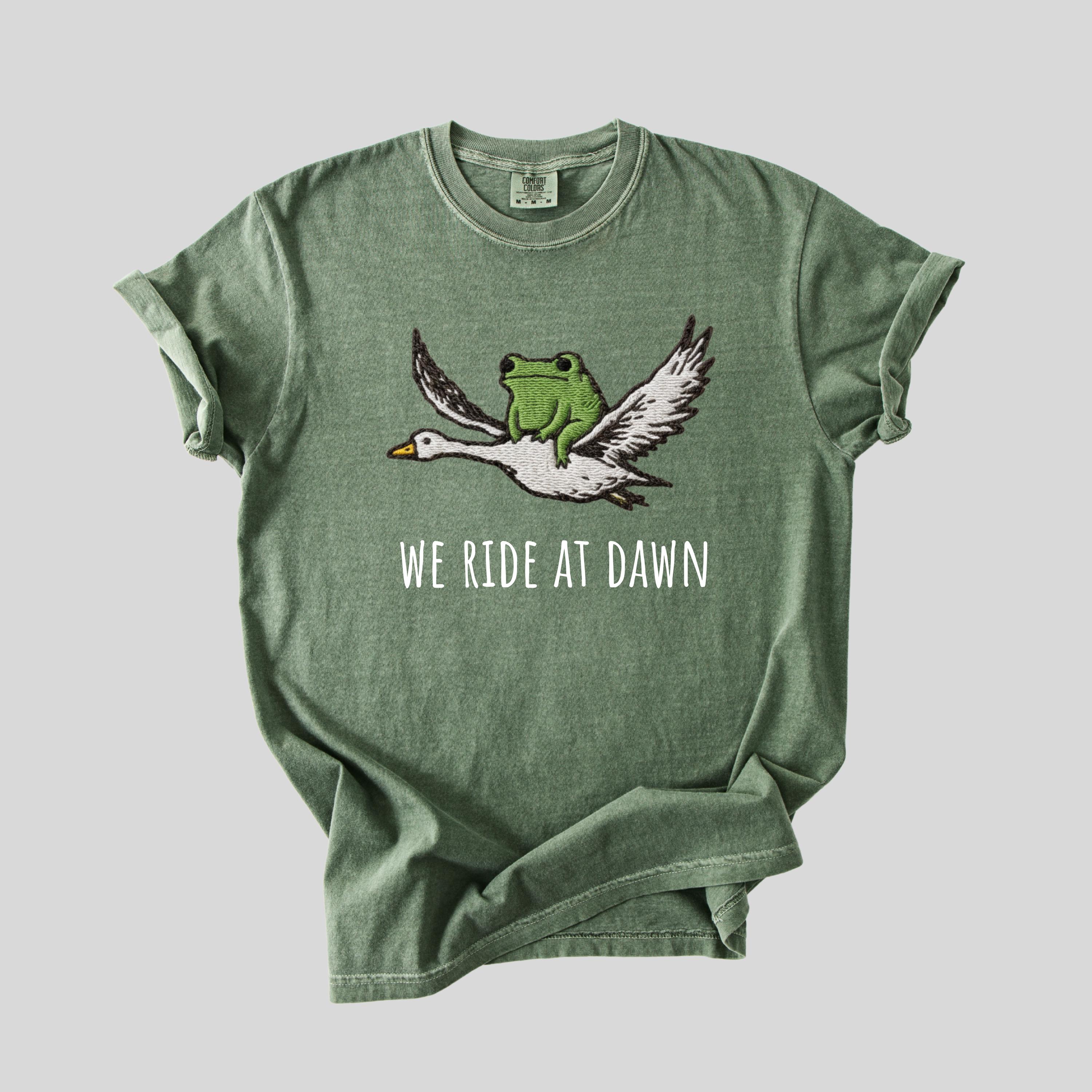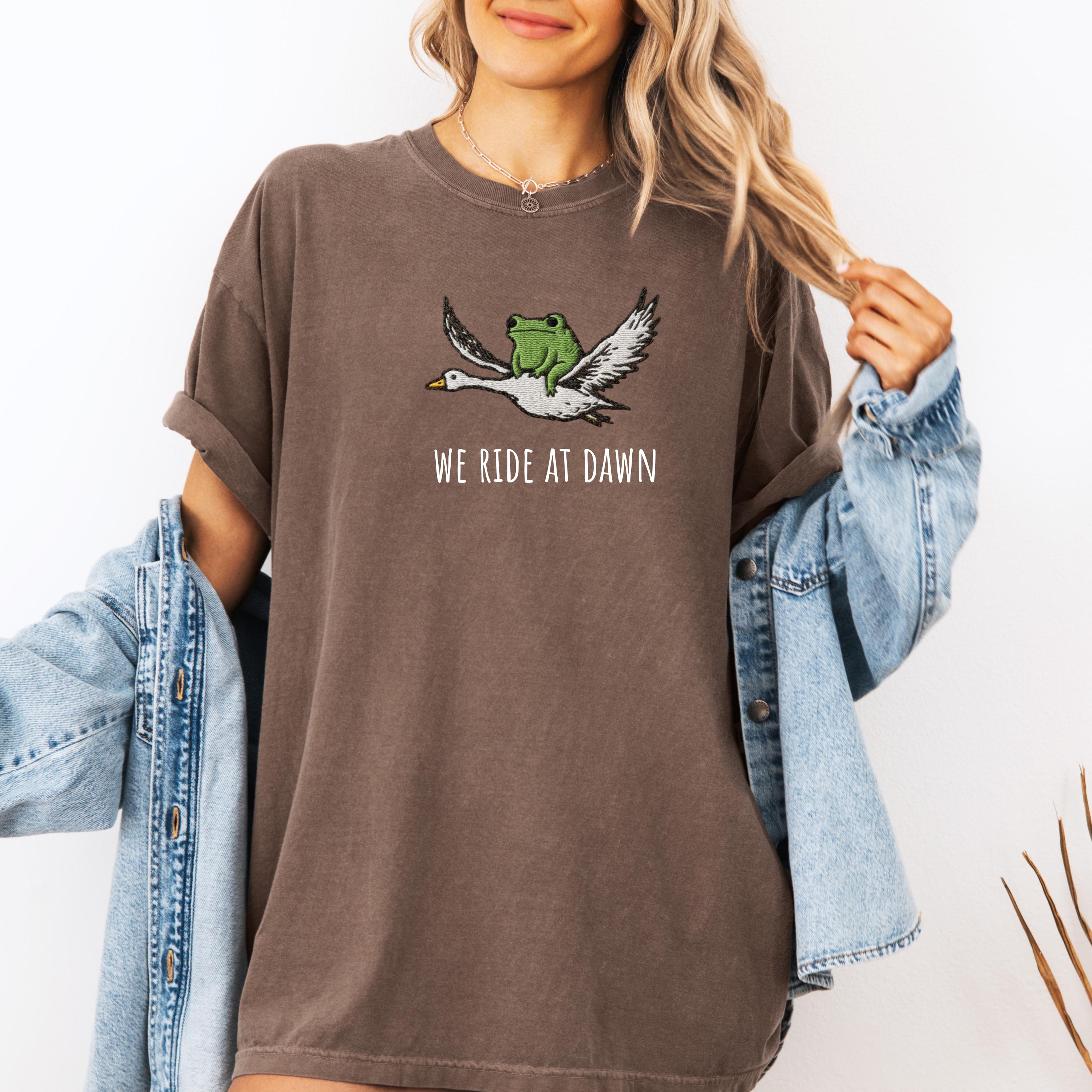 We Ride at Dawn T-Shirt, Funny Frog and Goose Tee, Chaotic Animal Shirt, Whimsical Gamer Gift, Faux Embroidery Shirt. Please note that this is not a real embroidery but high quality printing. 👕 Choose Your Style • The Comfort Colors 1717 short sleeve t-shirt is made from soft, garment-dyed cotton for a vintage look and lived-in feel. It features a relaxed unisex fit, durable heavyweight fabric, and all-day comfort perfect for casual everyday wear. •The Comfort Colors 6014 long sleeve t-shirt is crafted from soft, garment-dyed cotton with a relaxed unisex fit and a classic vintage style. Its heavyweight fabric and ribbed cuffs provide lasting comfort and a cozy feel for everyday wear.
