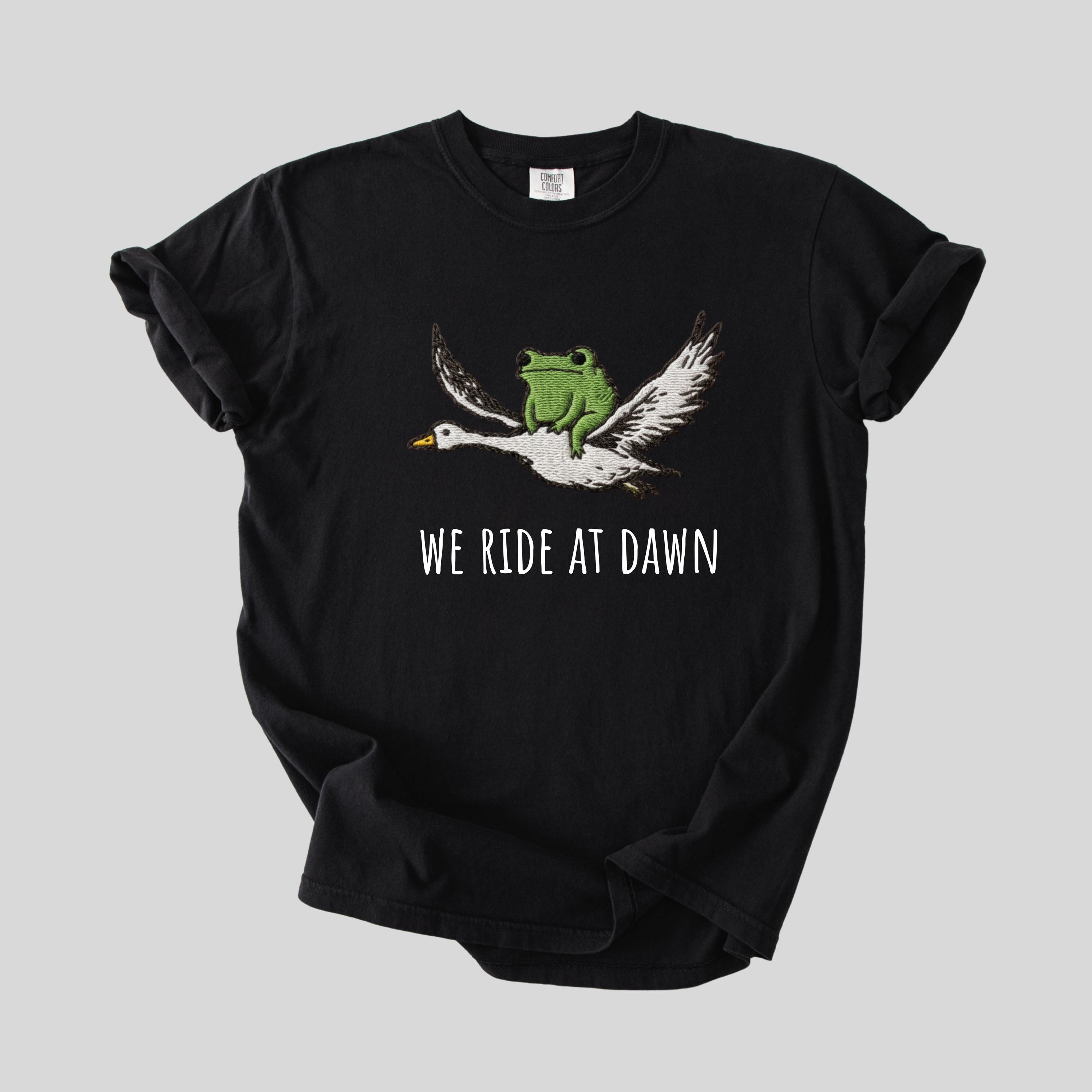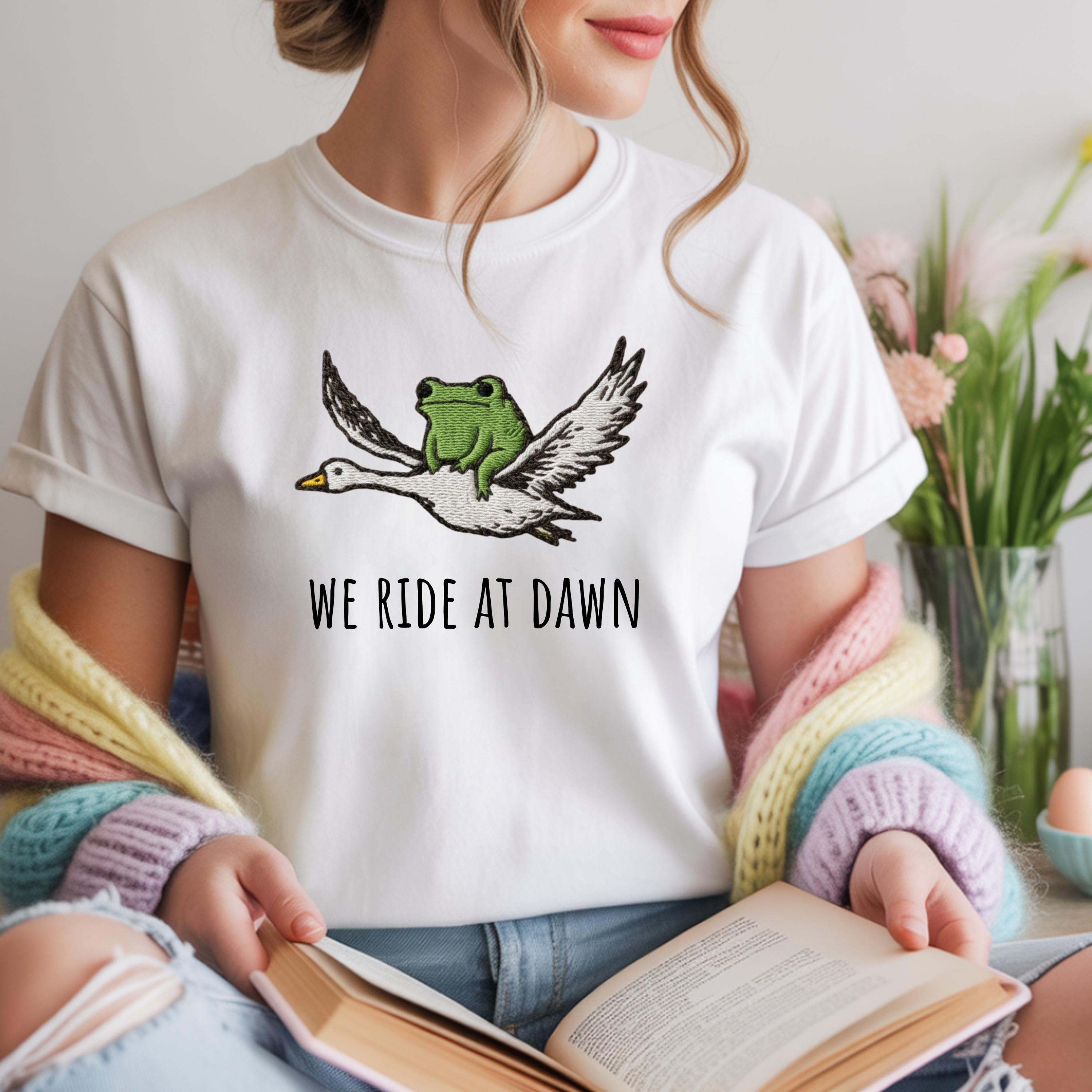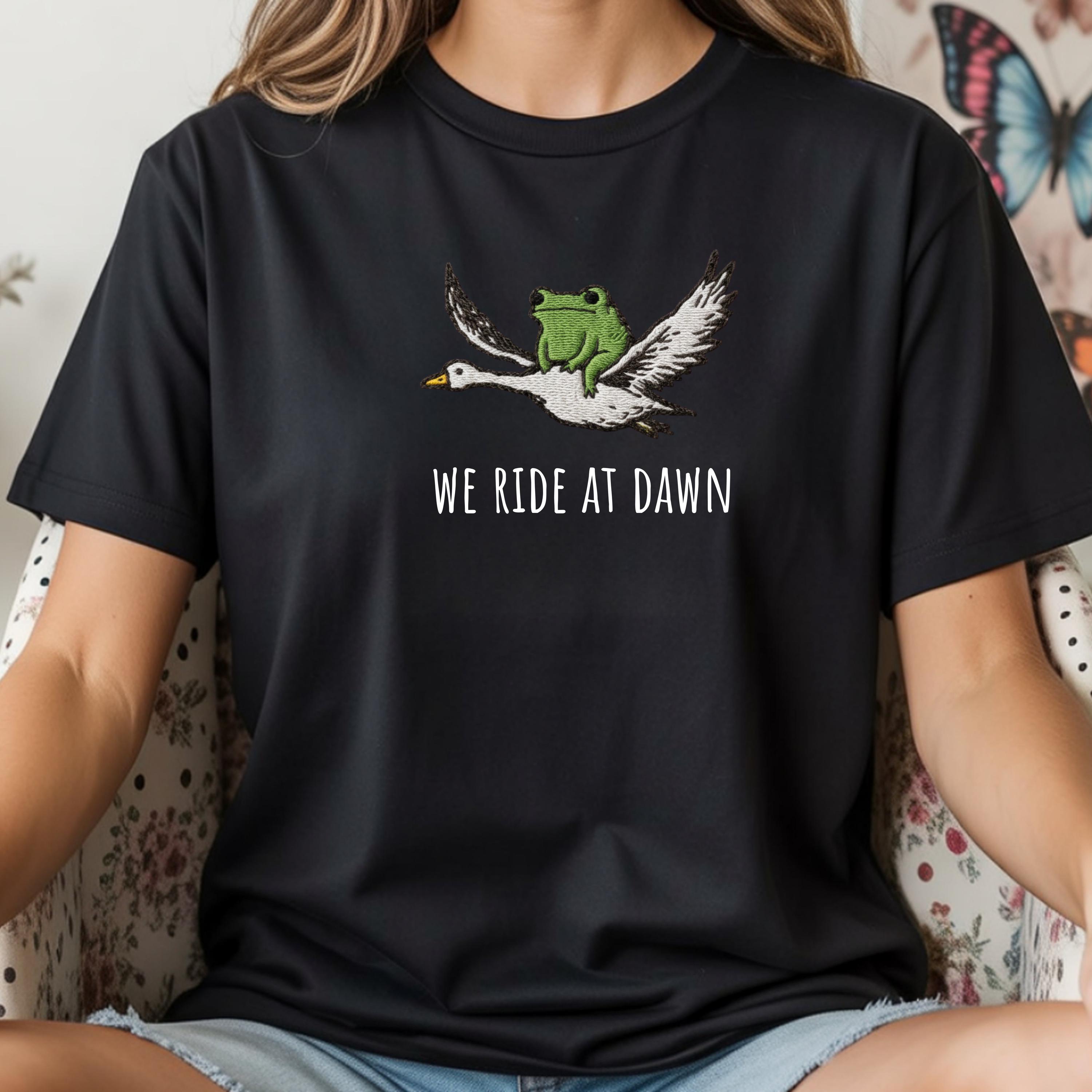We Ride at Dawn T-Shirt, Funny Frog and Goose Tee, Chaotic Animal Shirt, Whimsical Gamer Gift, Faux Embroidery Shirt. Please note that this is not a real embroidery but high quality printing. 👕 Choose Your Style • The Comfort Colors 1717 short sleeve t-shirt is made from soft, garment-dyed cotton for a vintage look and lived-in feel. It features a relaxed unisex fit, durable heavyweight fabric, and all-day comfort perfect for casual everyday wear. •The Comfort Colors 6014 long sleeve t-shirt is crafted from soft, garment-dyed cotton with a relaxed unisex fit and a classic vintage style. Its heavyweight fabric and ribbed cuffs provide lasting comfort and a cozy feel for everyday wear.