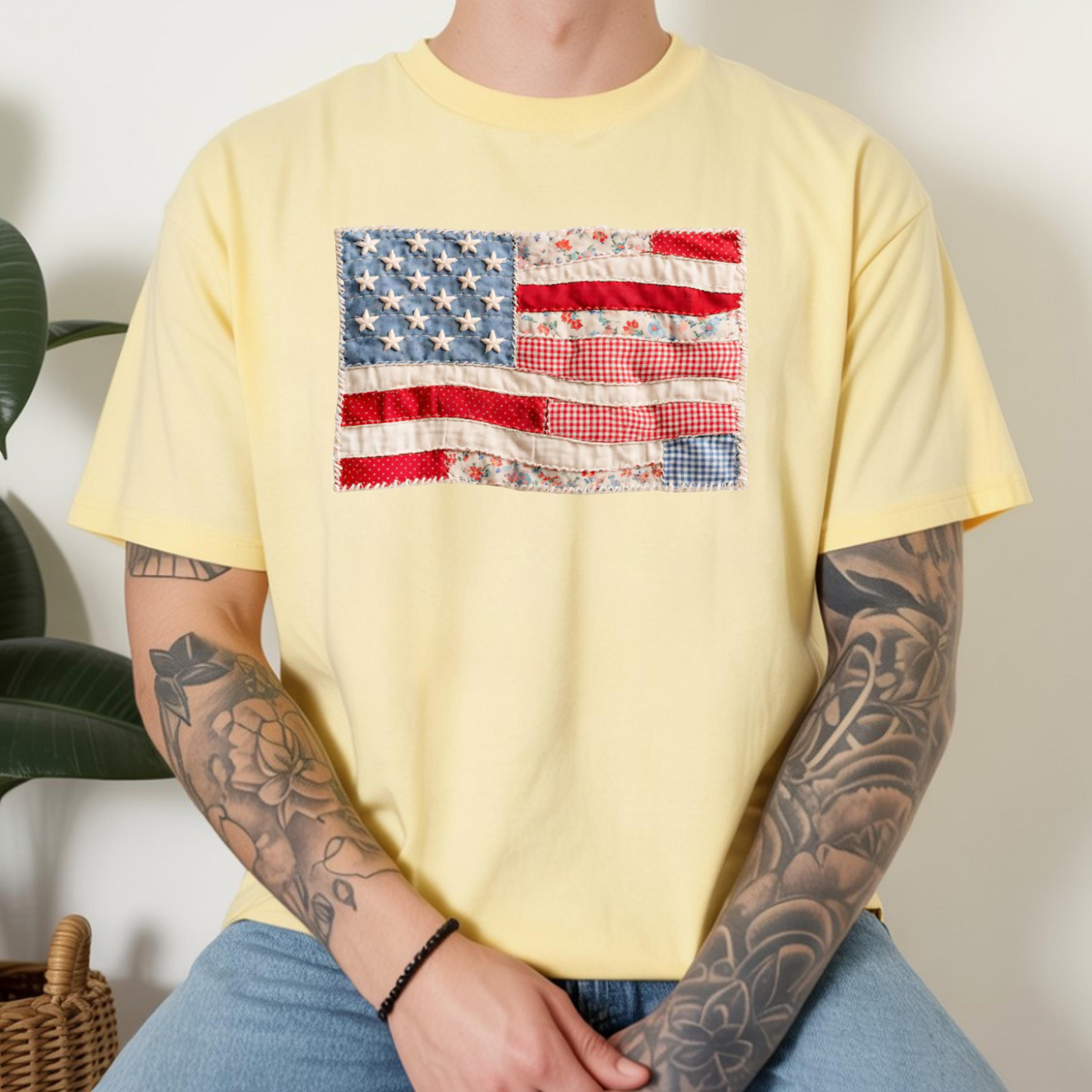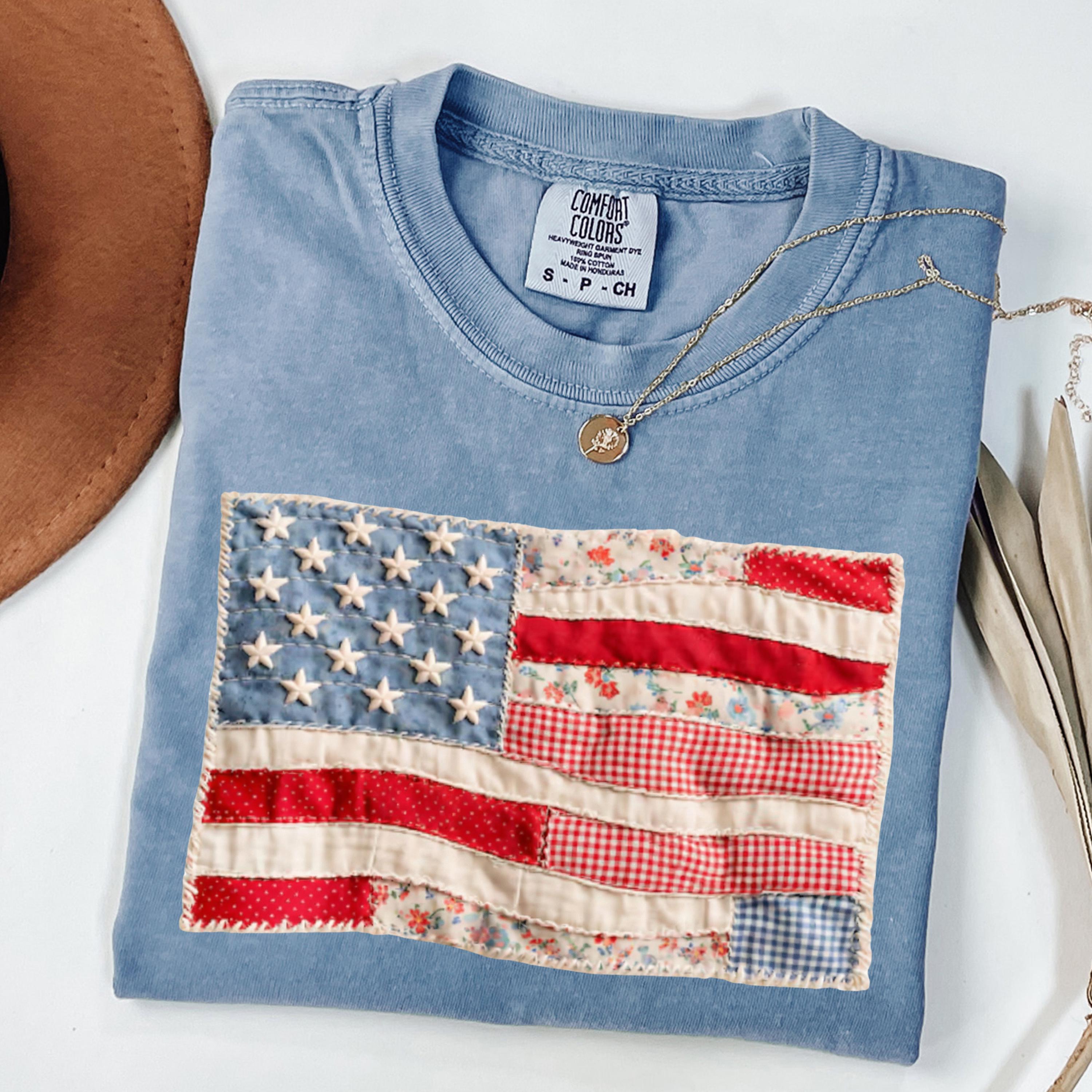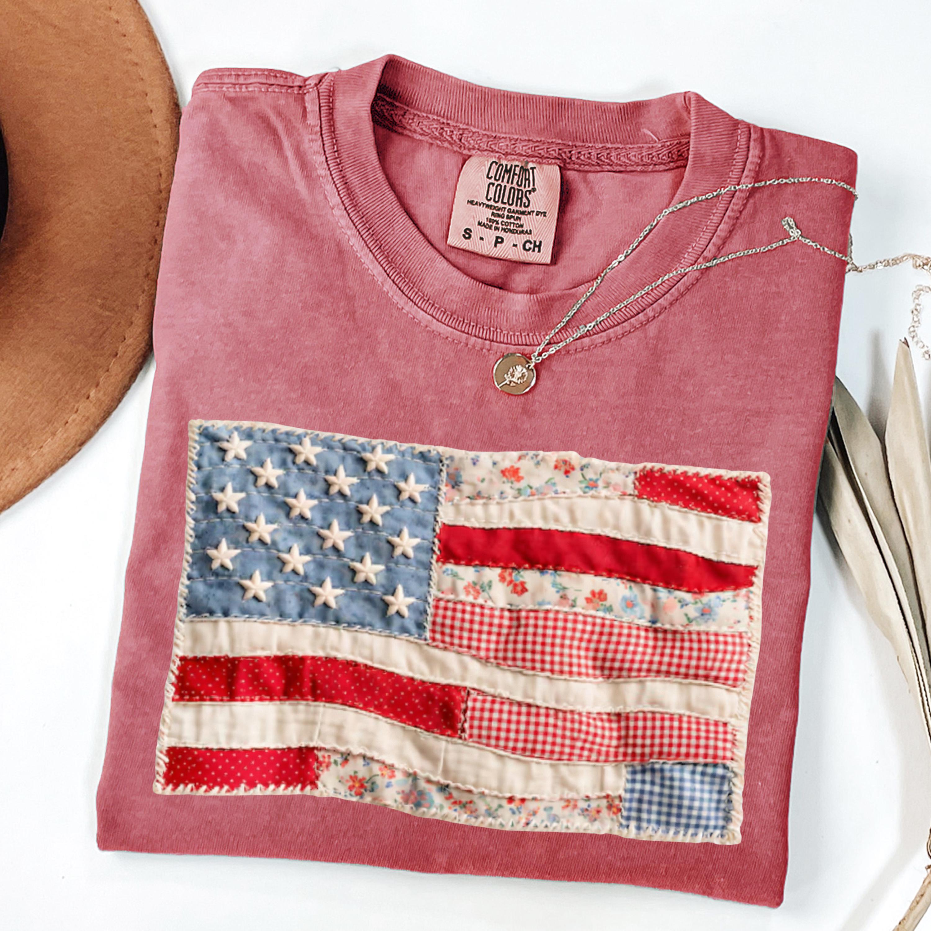 Comfort Colors® 4th of July Shirt, Retro American Flag Shirt, Faux Patchwork USA Shirt, Patriotic Shirt, Fourth of July Shirt,USA Flag Shirt