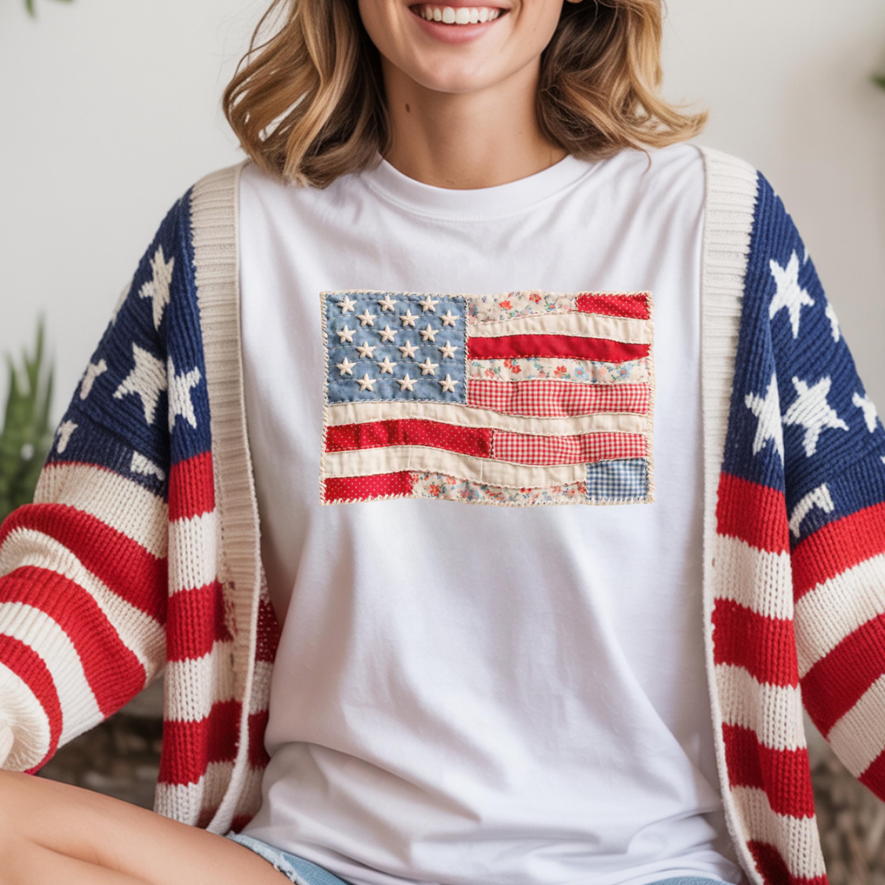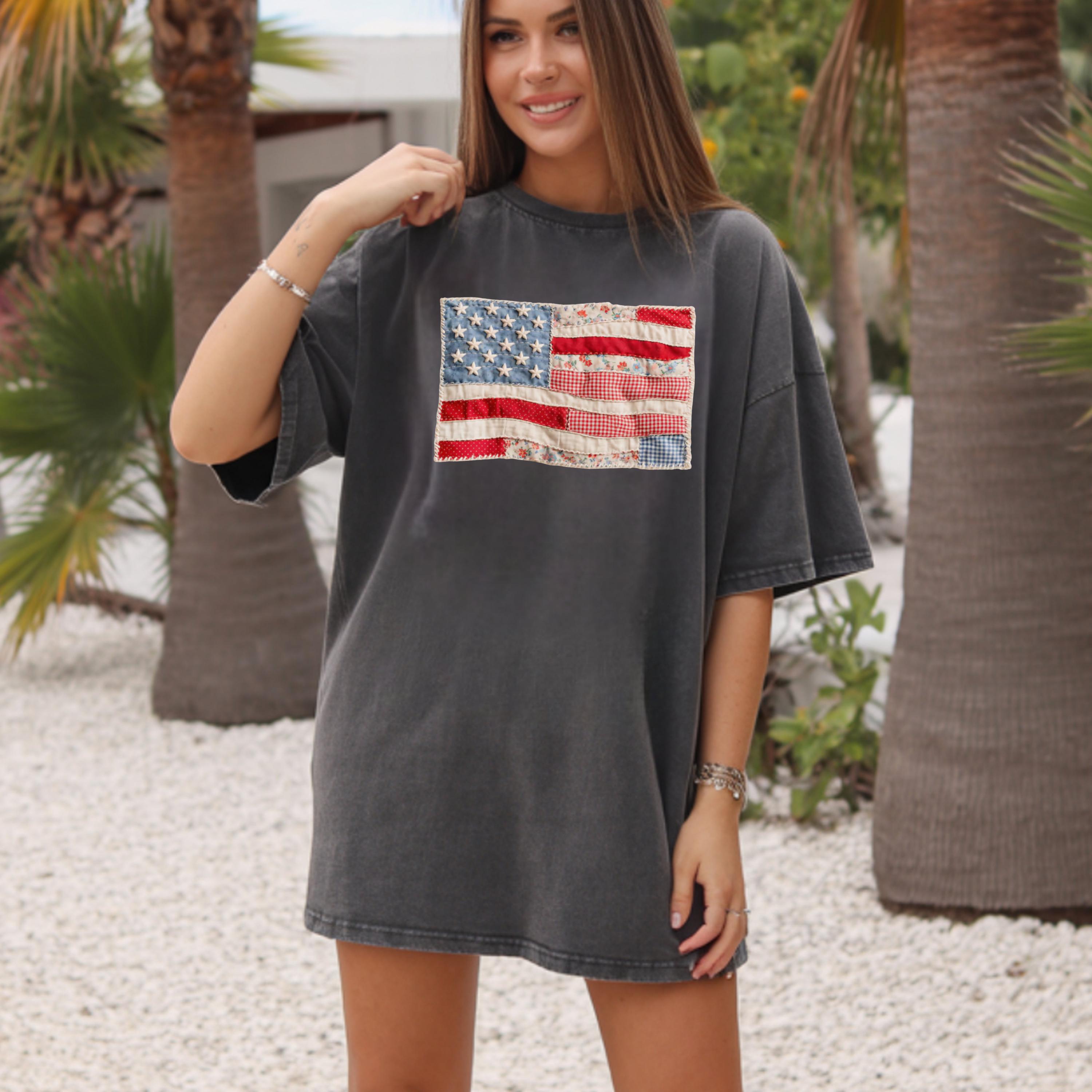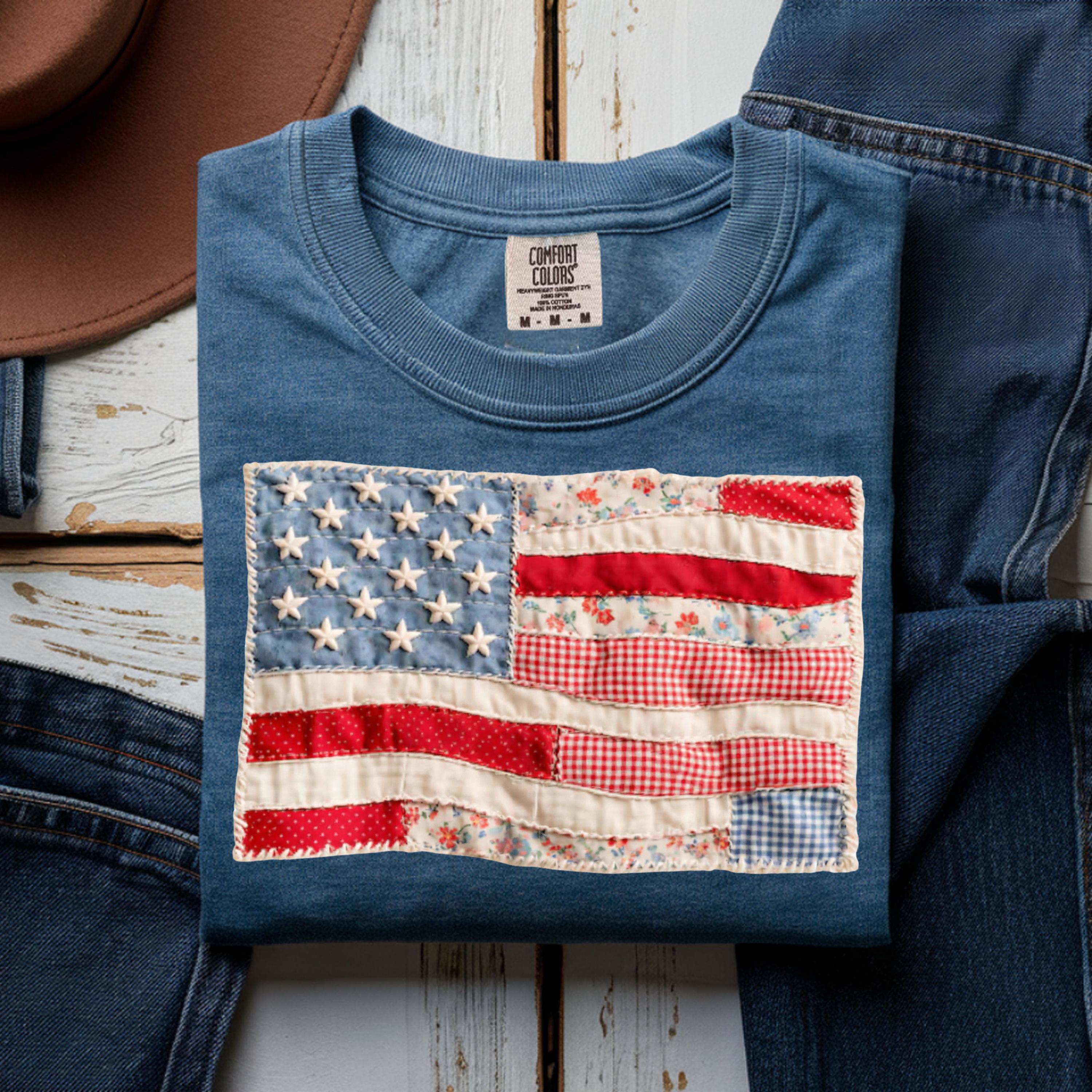 Comfort Colors® 4th of July Shirt, Retro American Flag Shirt, Faux Patchwork USA Shirt, Patriotic Shirt, Fourth of July Shirt,USA Flag Shirt