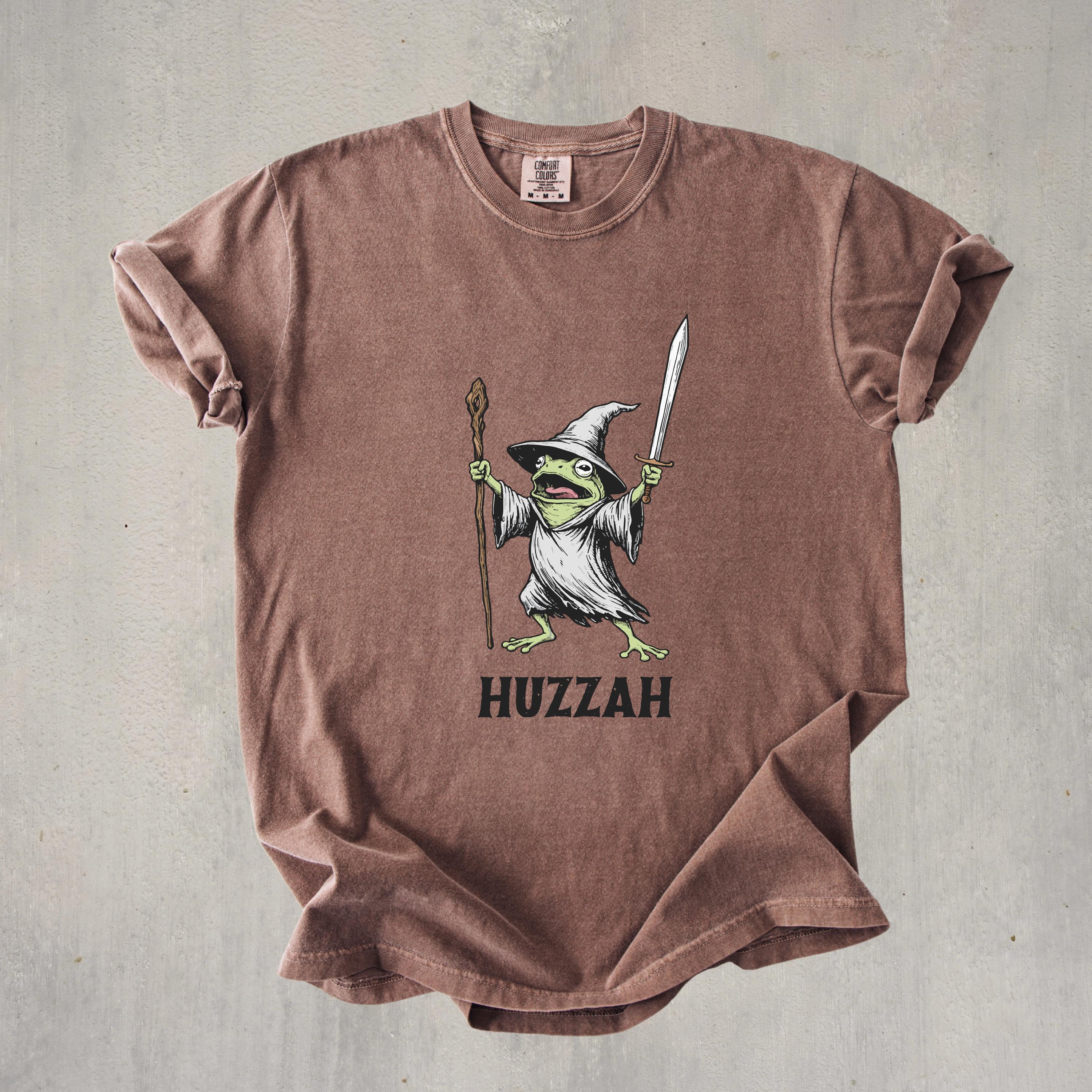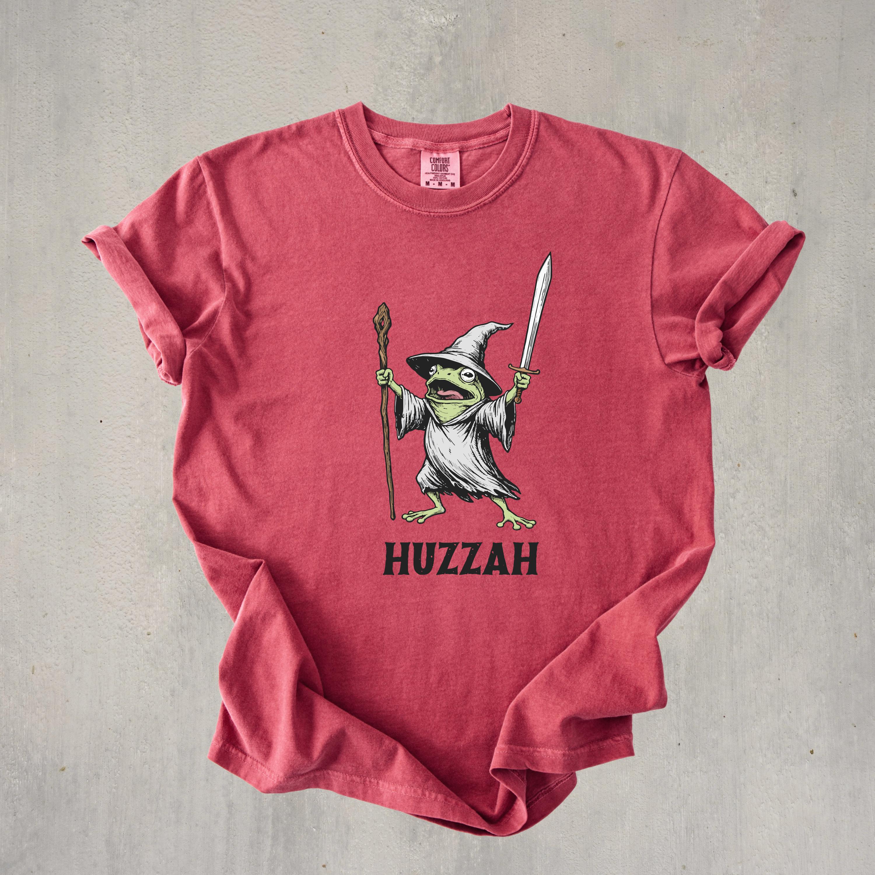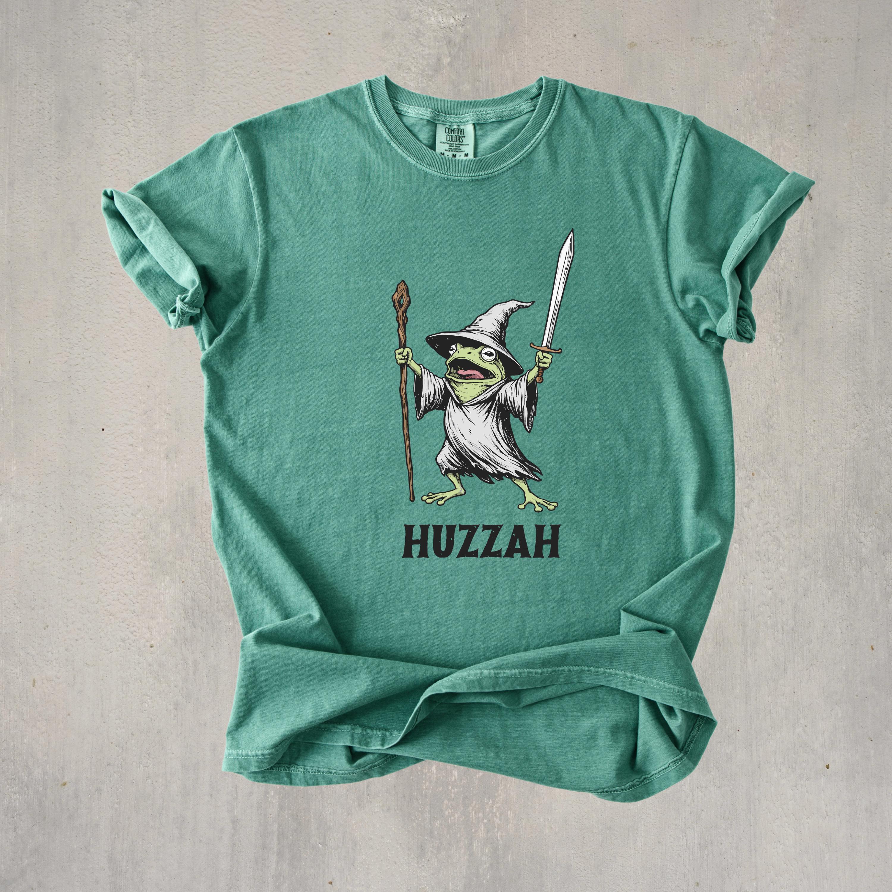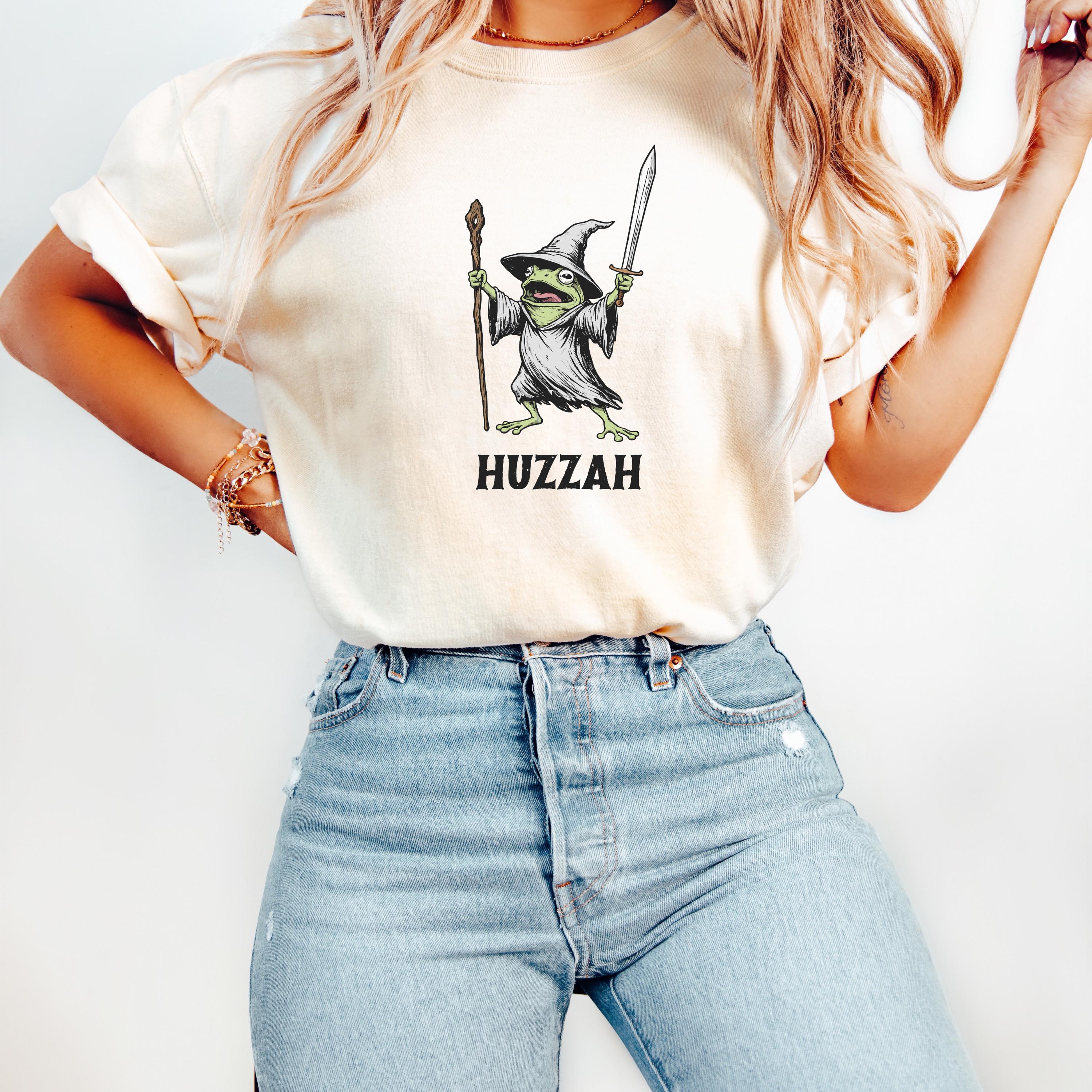 Add a fun fantasy twist to your wardrobe with this “Huzzah” frog wizard t-shirt, featuring a playful frog dressed as a wizard with sword and staff. Perfect for DnD lovers, fantasy fans, and anyone who enjoys quirky humor and unique graphic tees.