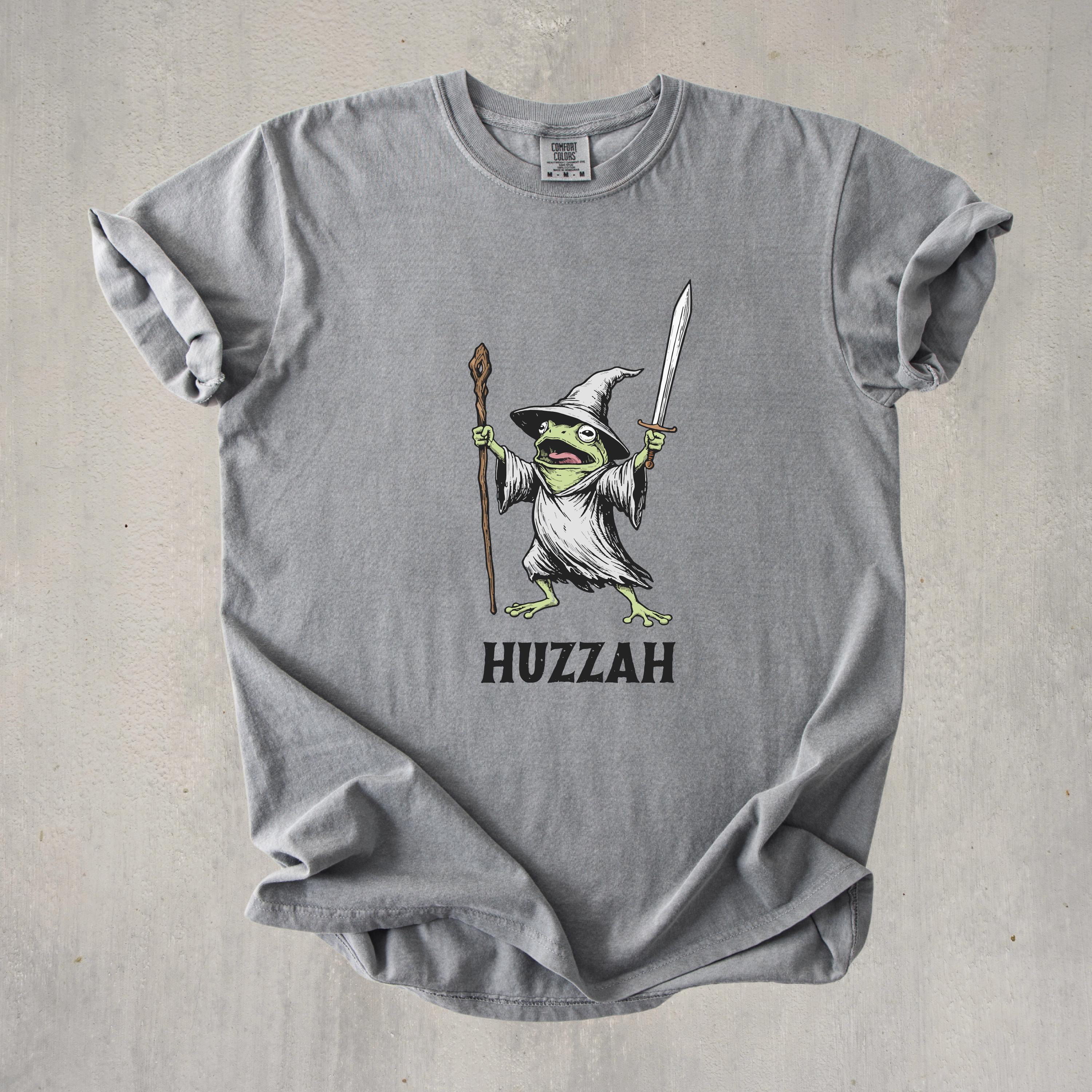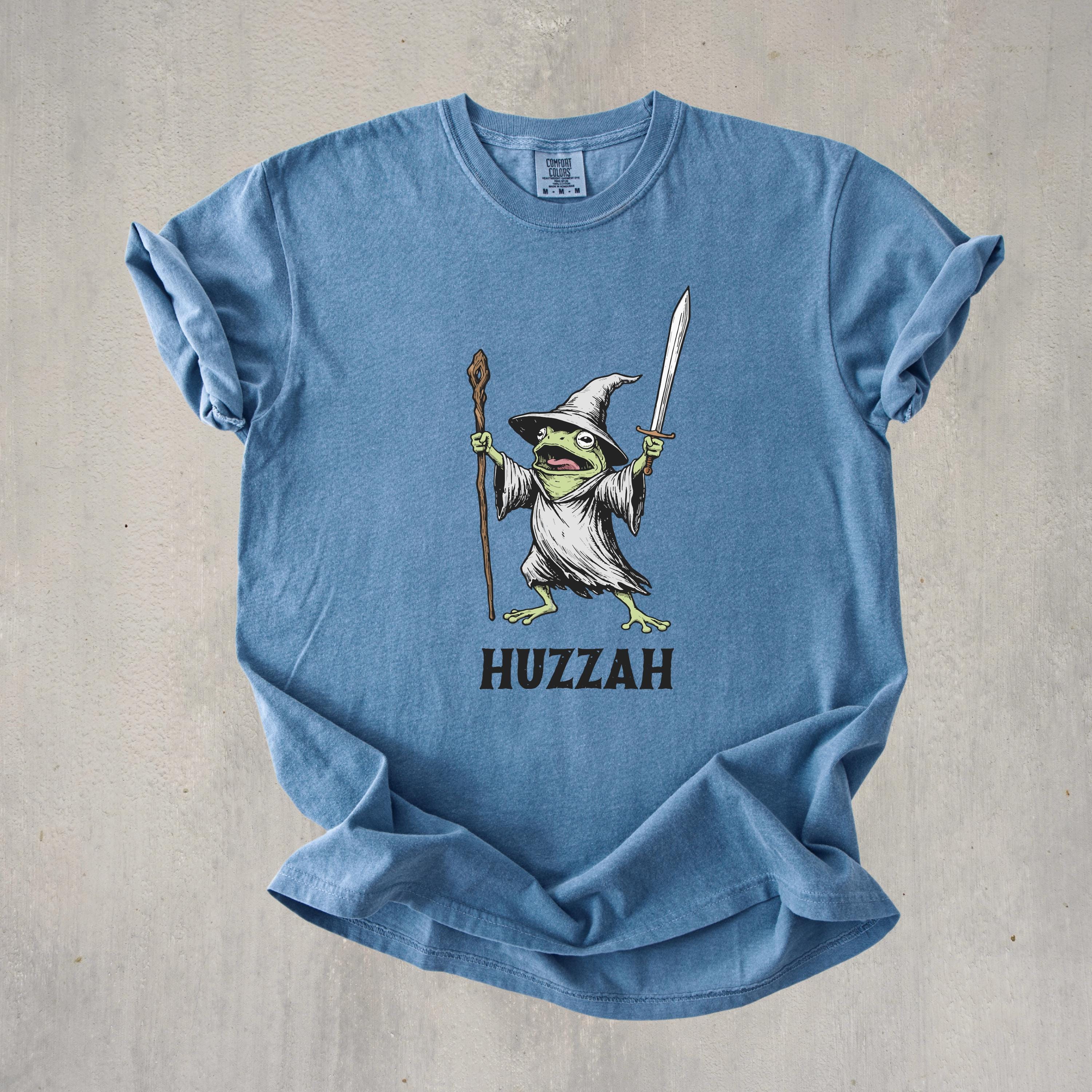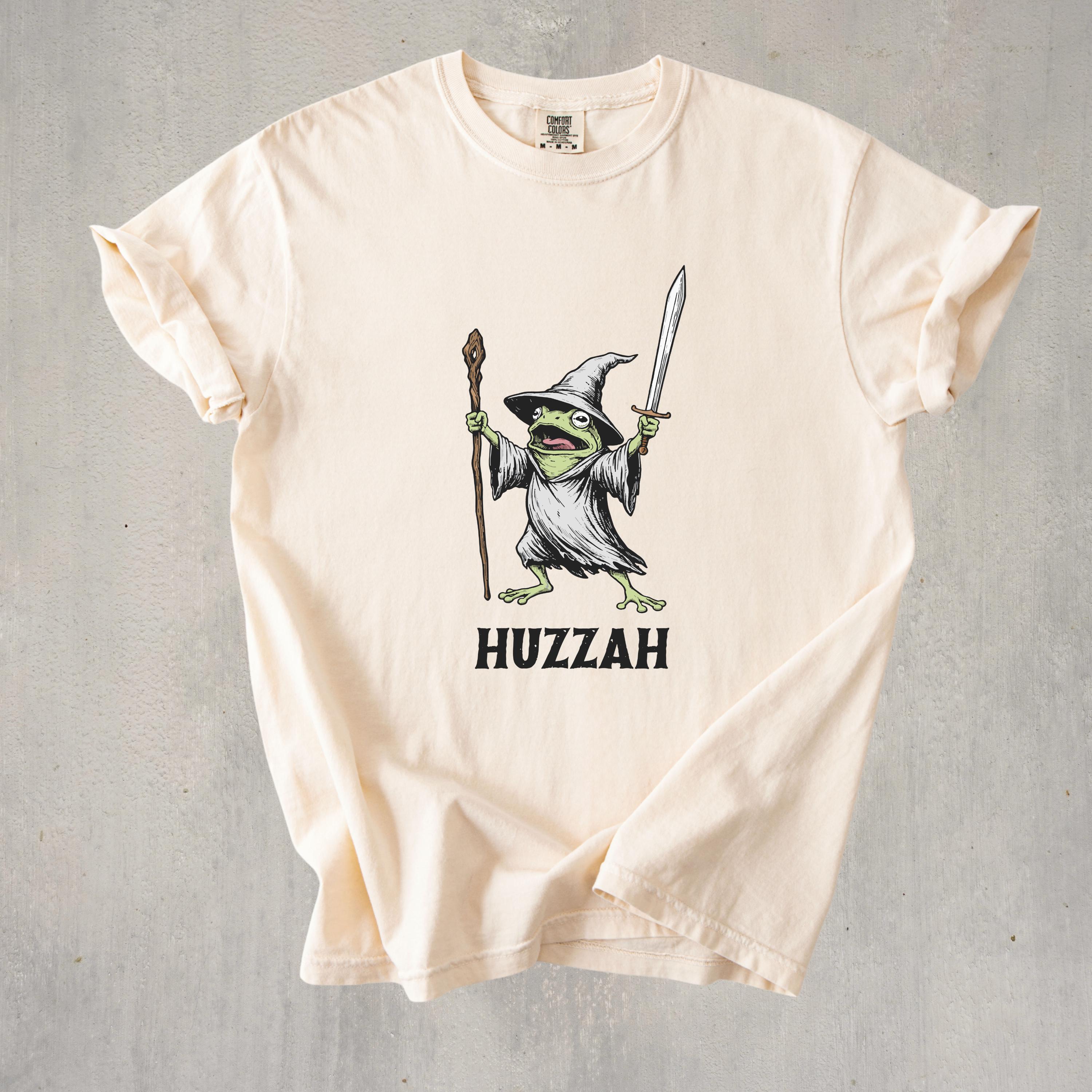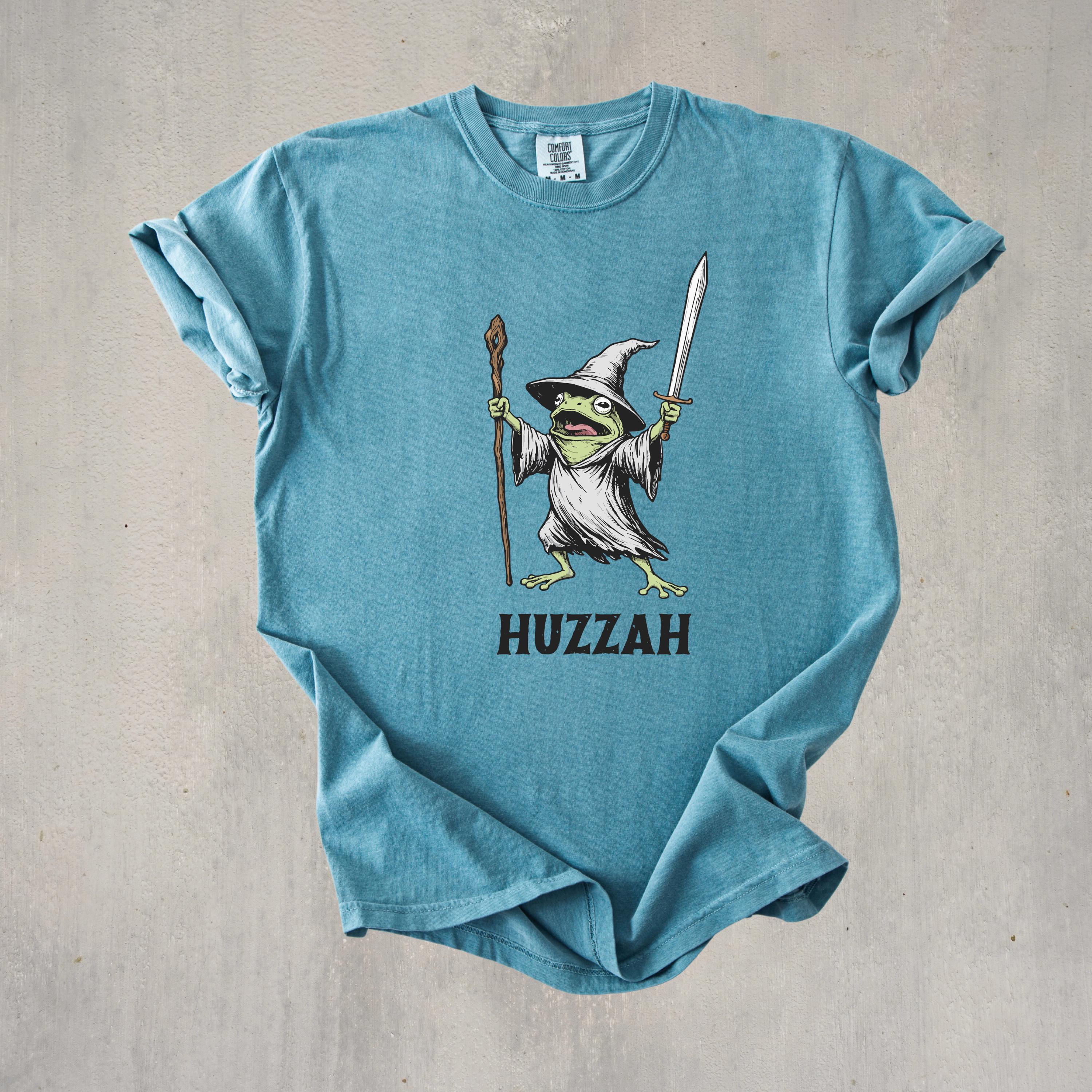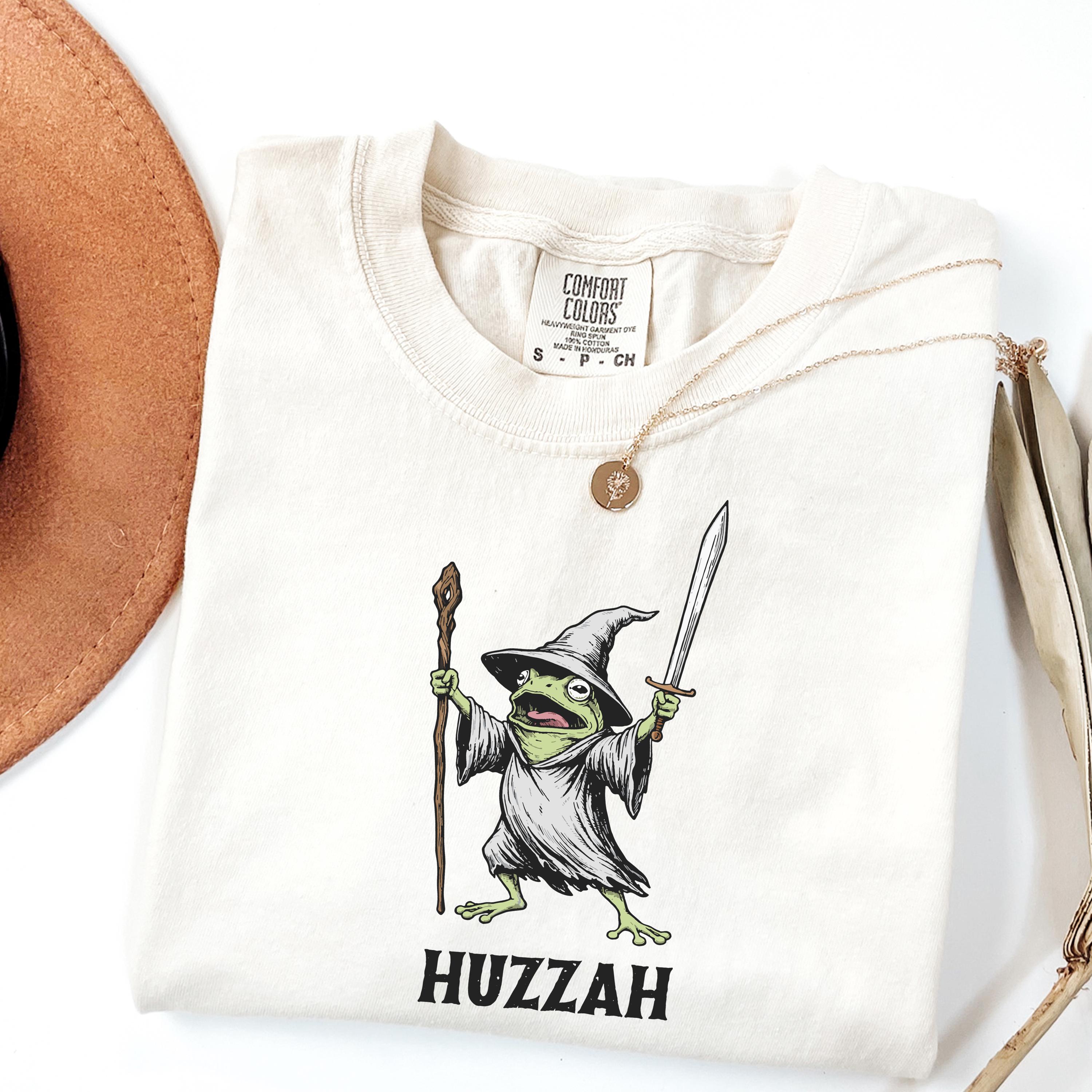 Add a fun fantasy twist to your wardrobe with this “Huzzah” frog wizard t-shirt, featuring a playful frog dressed as a wizard with sword and staff. Perfect for DnD lovers, fantasy fans, and anyone who enjoys quirky humor and unique graphic tees.