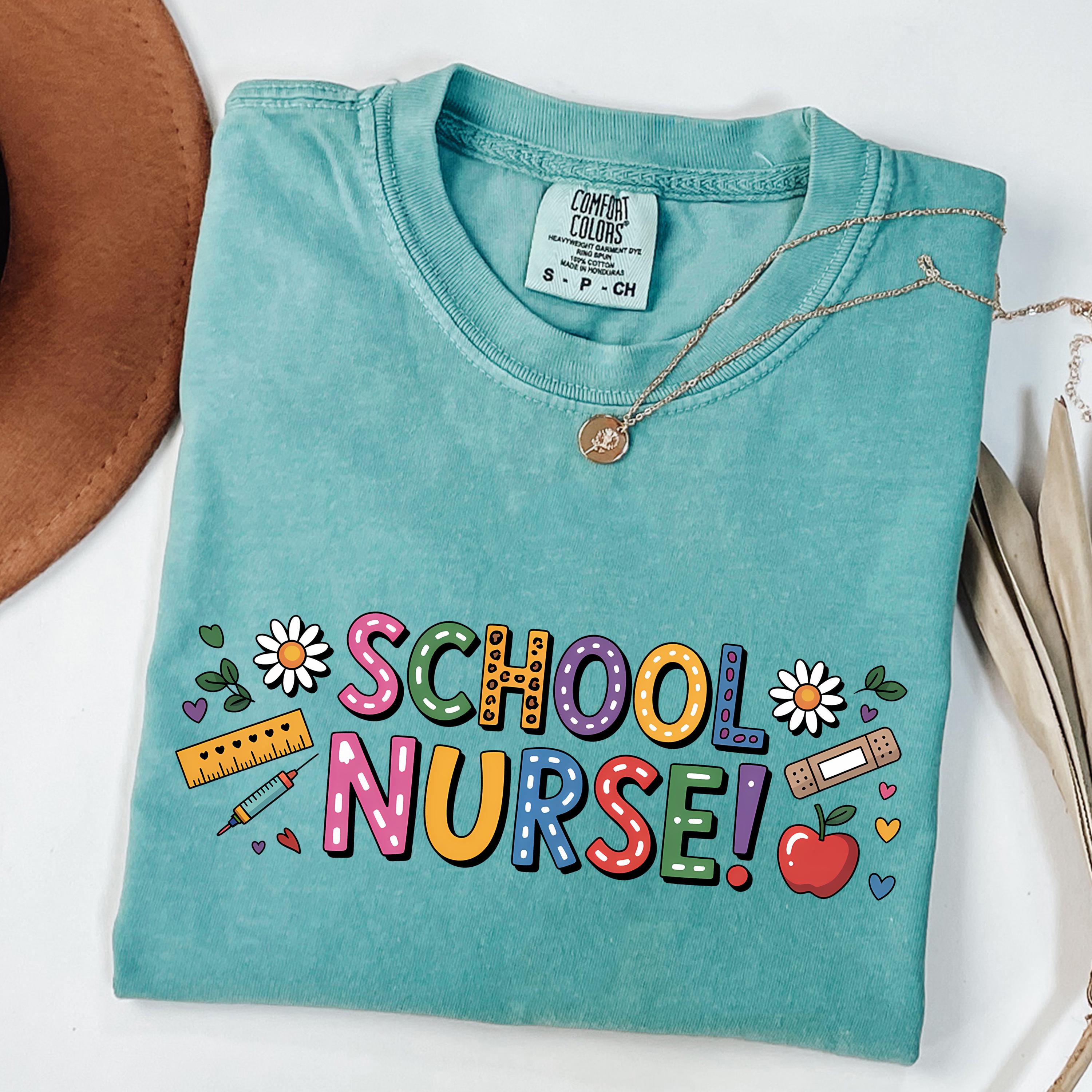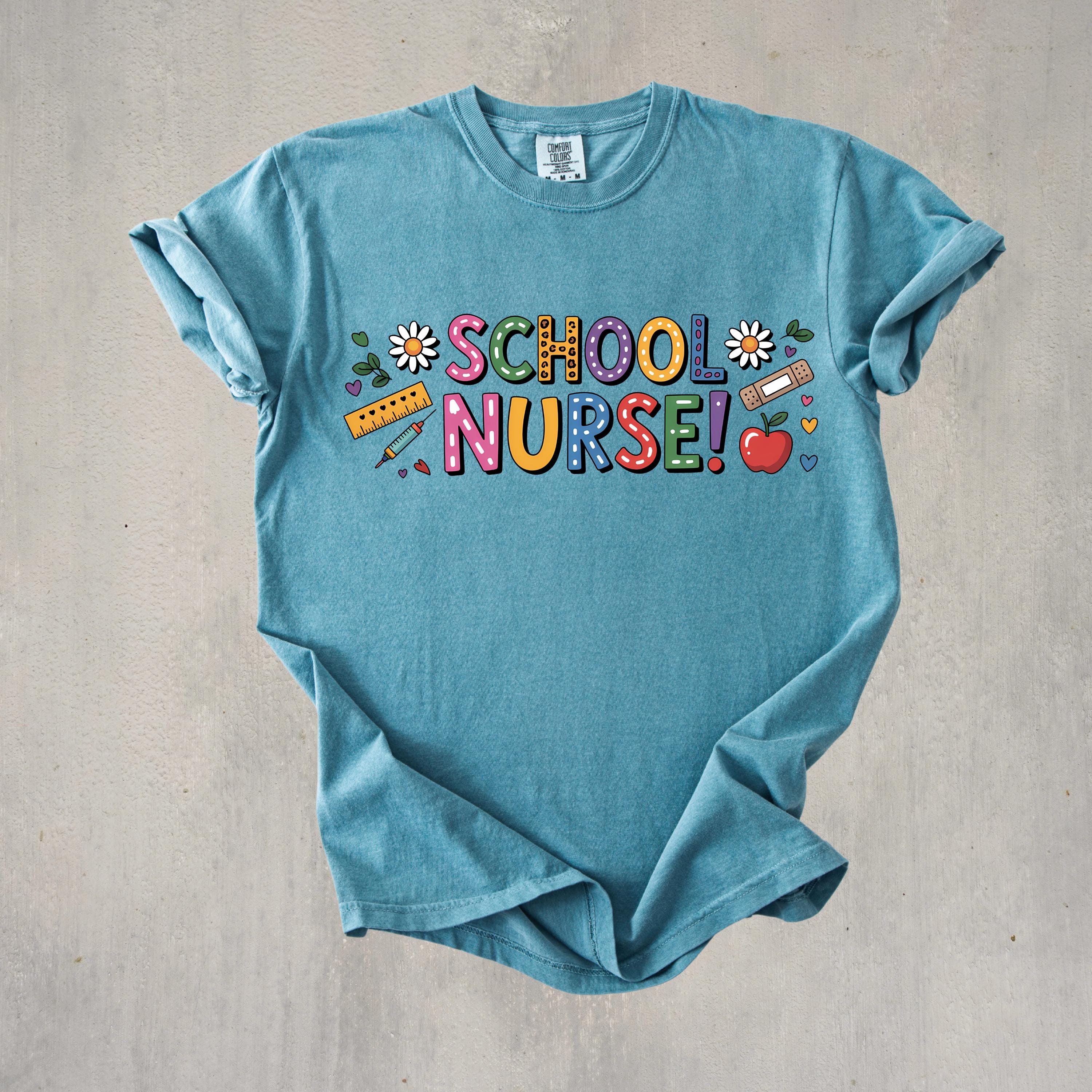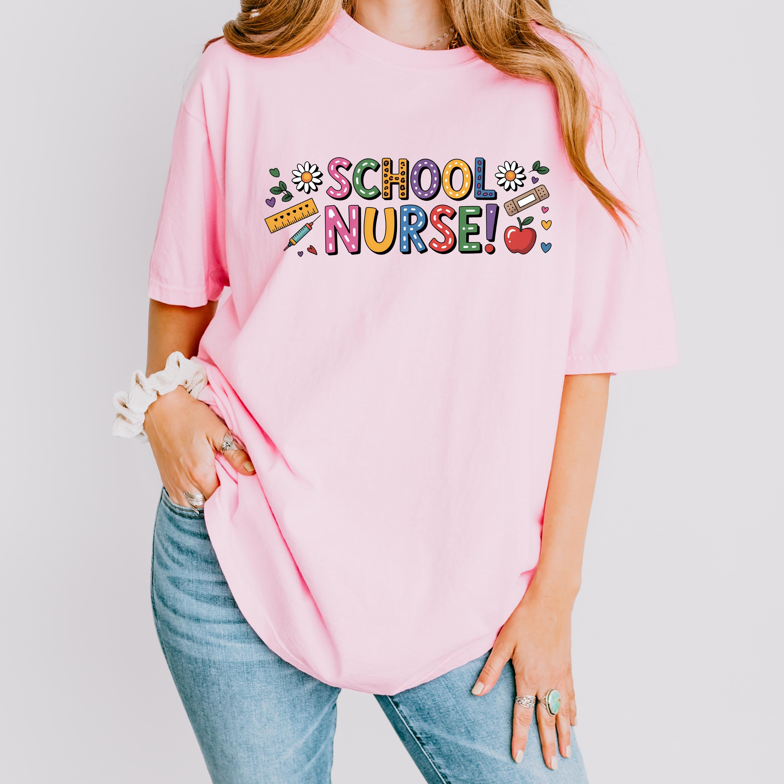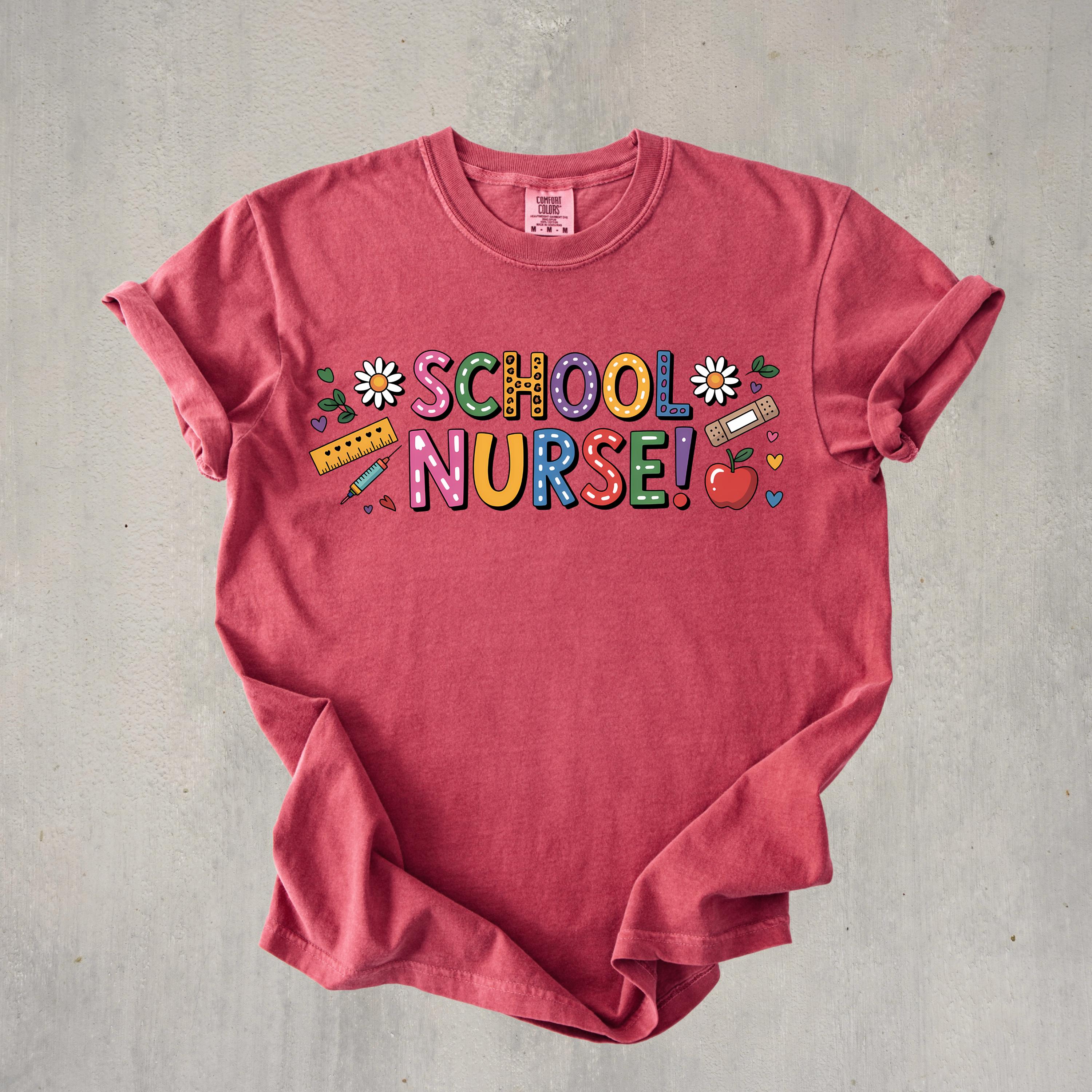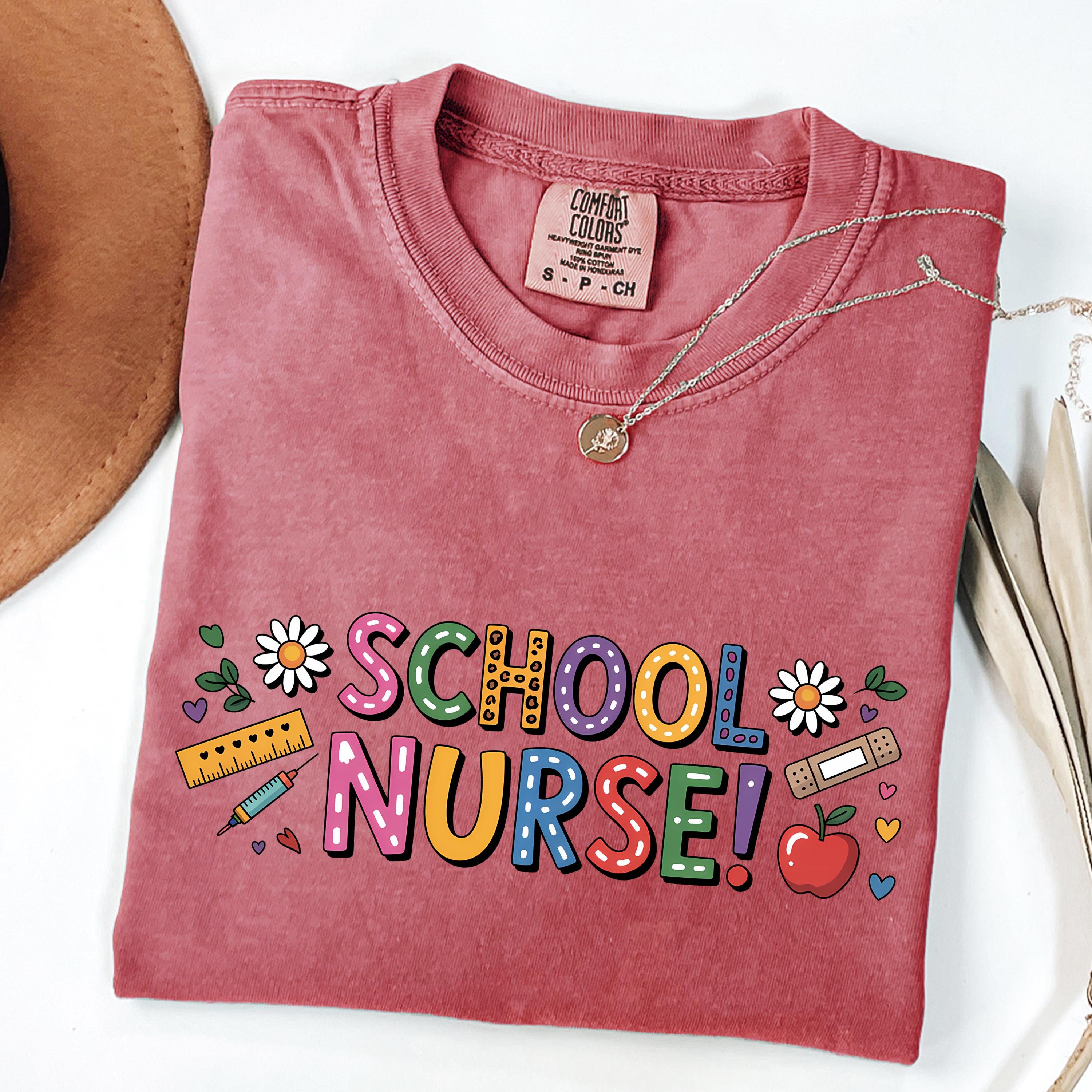 Brighten up your workday with this fun and colorful “School Nurse!” t-shirt, featuring playful graphics and cheerful details. Perfect for school nurses, healthcare staff, and anyone who loves cute and vibrant designs while staying comfortable and stylish.