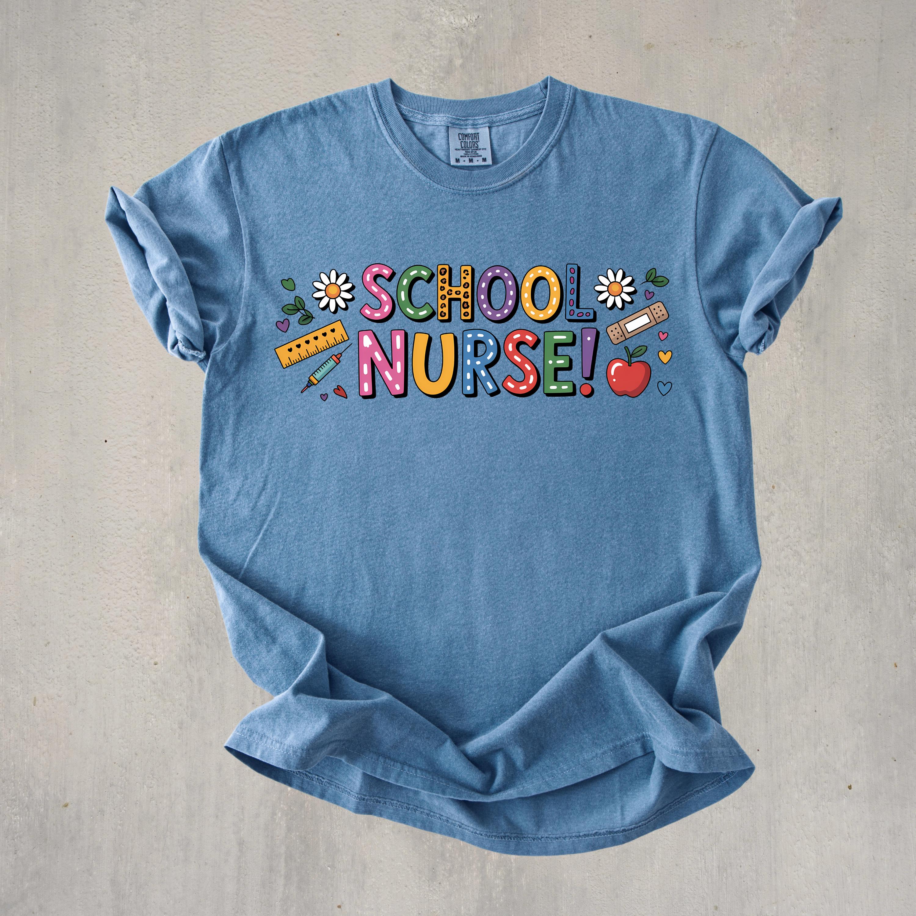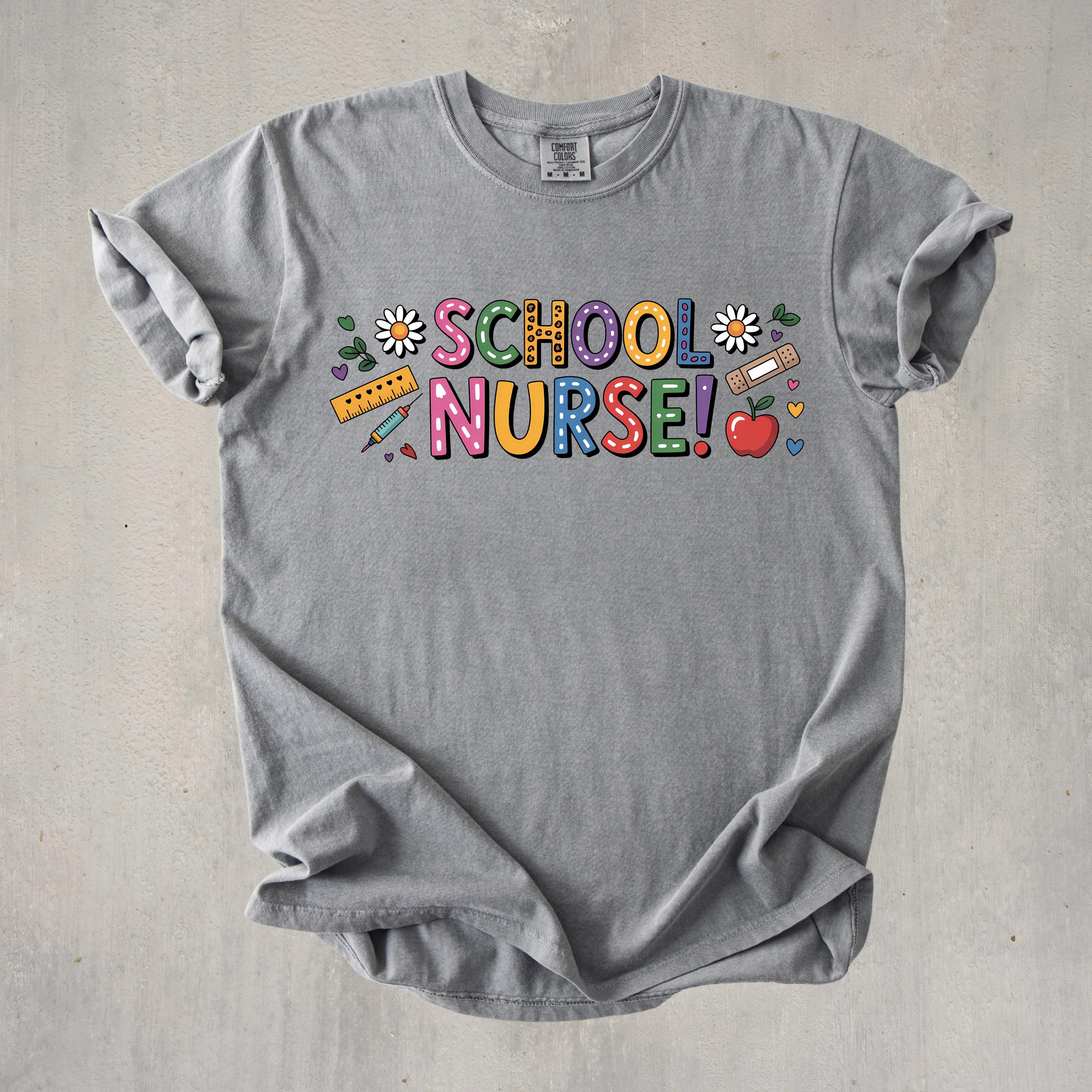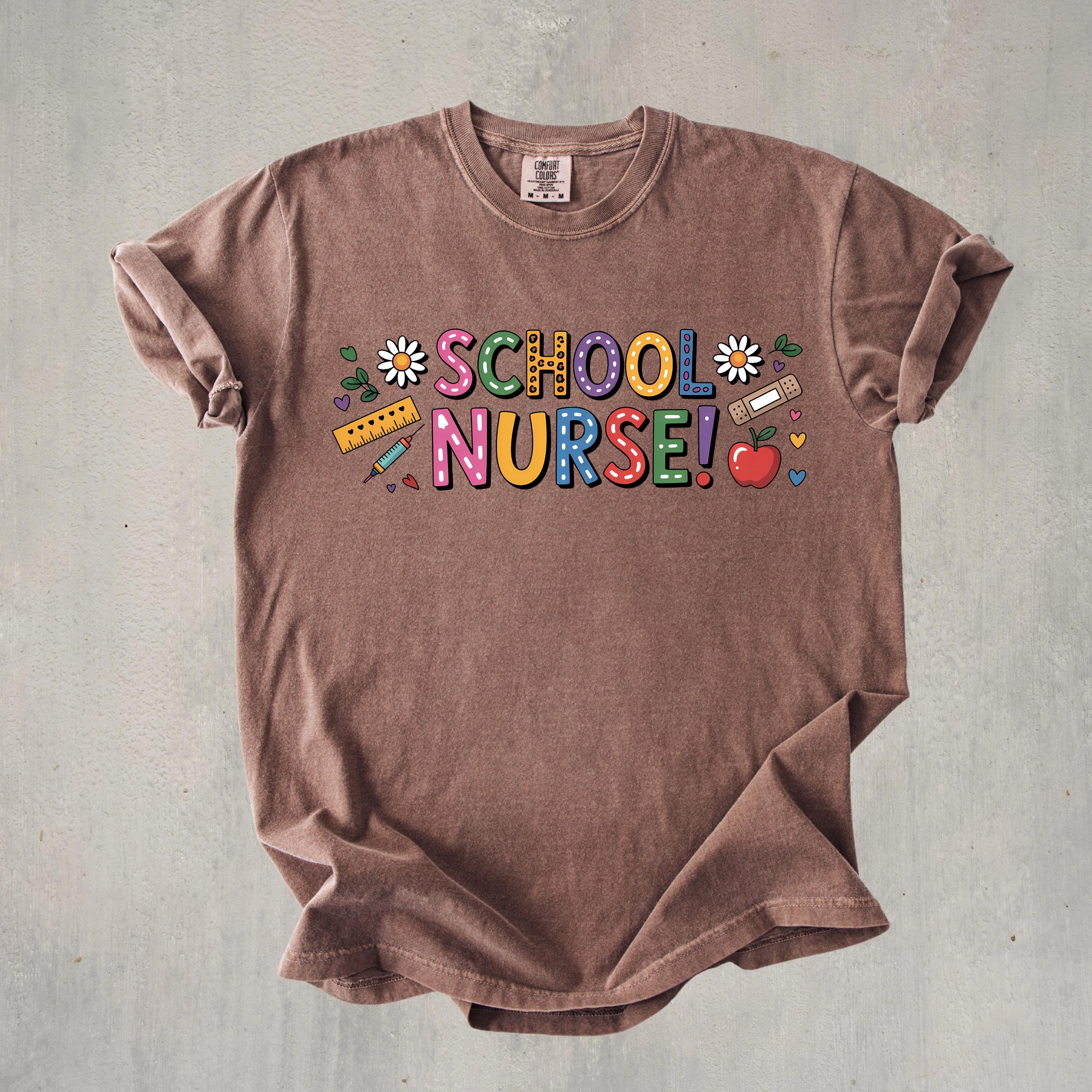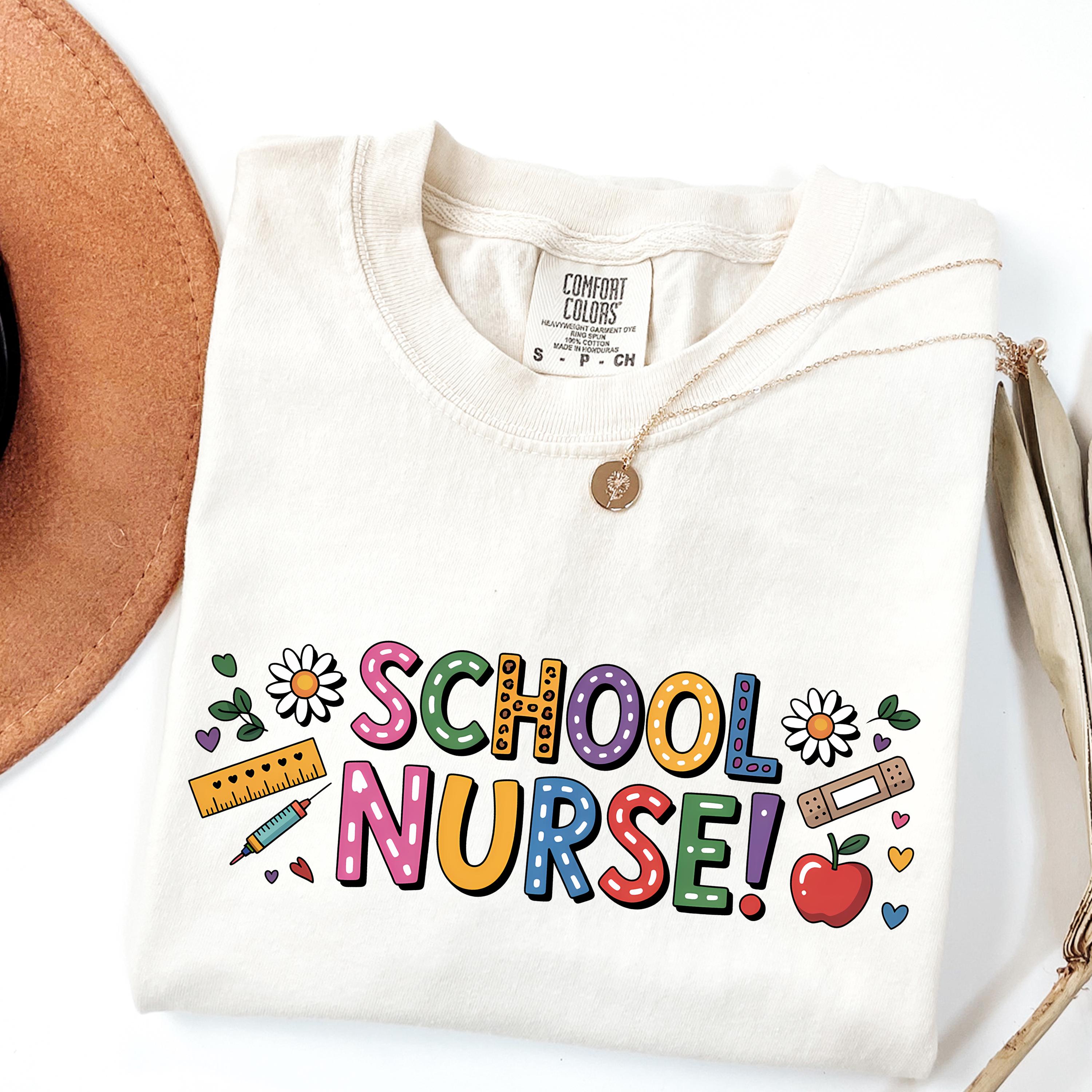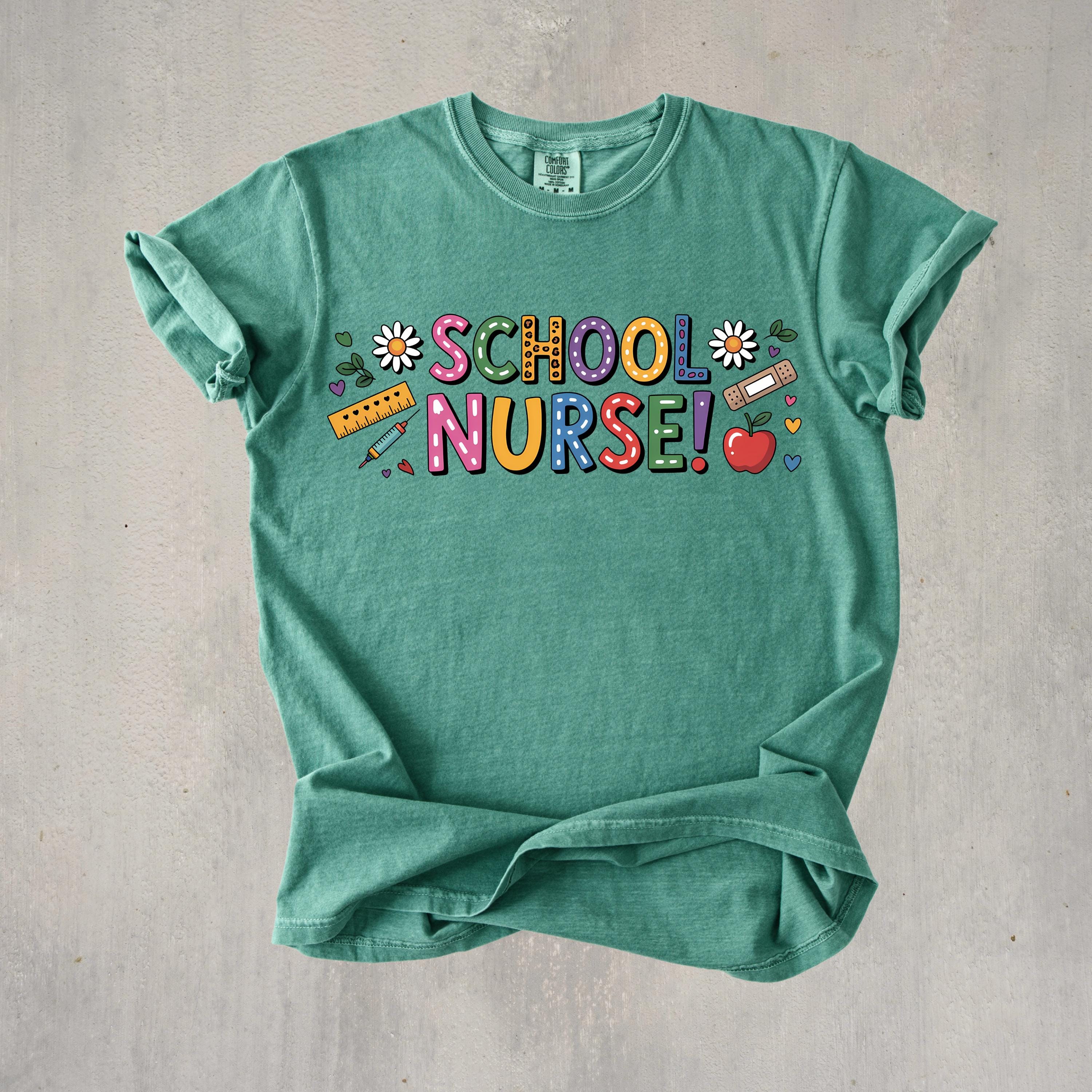 Brighten up your workday with this fun and colorful “School Nurse!” t-shirt, featuring playful graphics and cheerful details. Perfect for school nurses, healthcare staff, and anyone who loves cute and vibrant designs while staying comfortable and stylish.