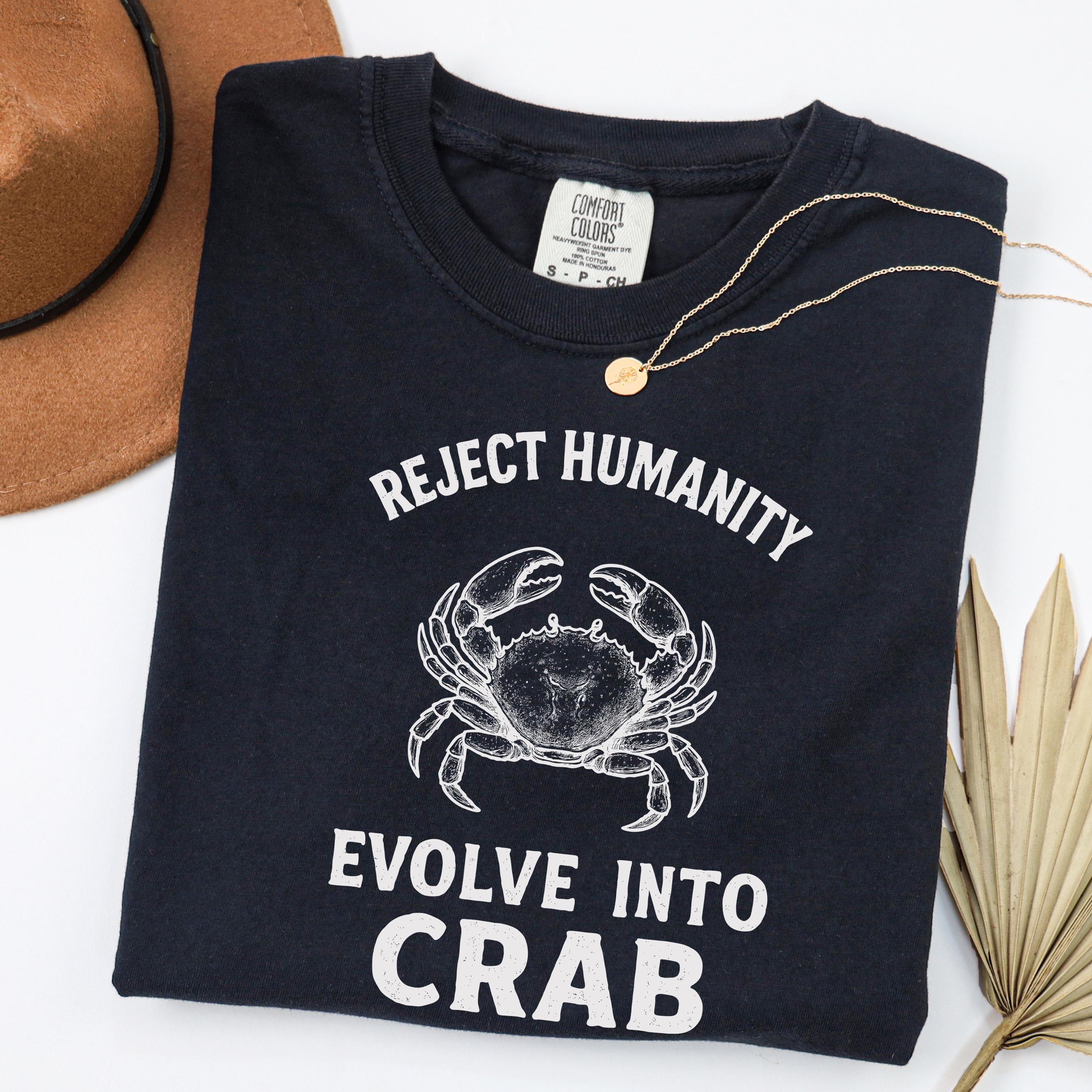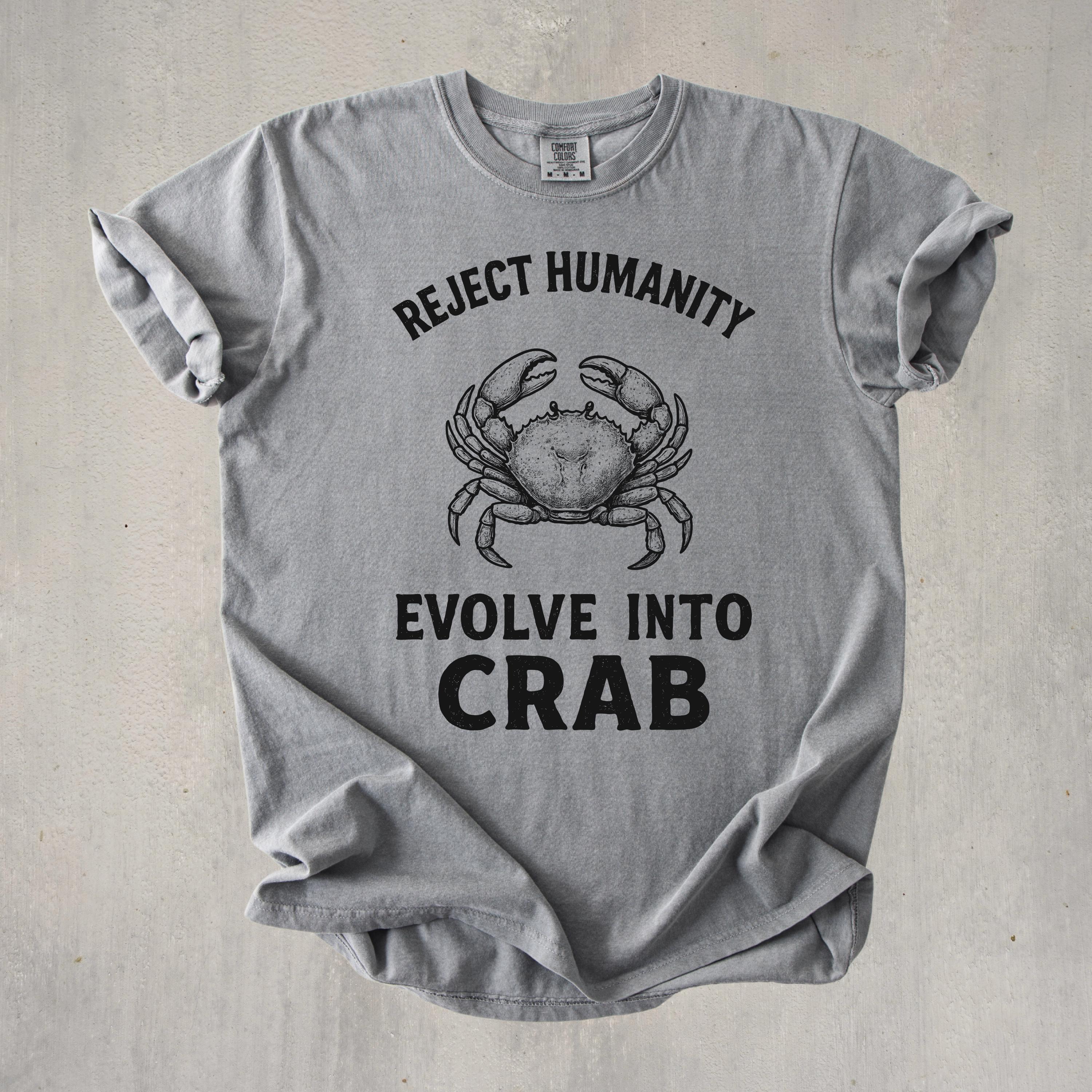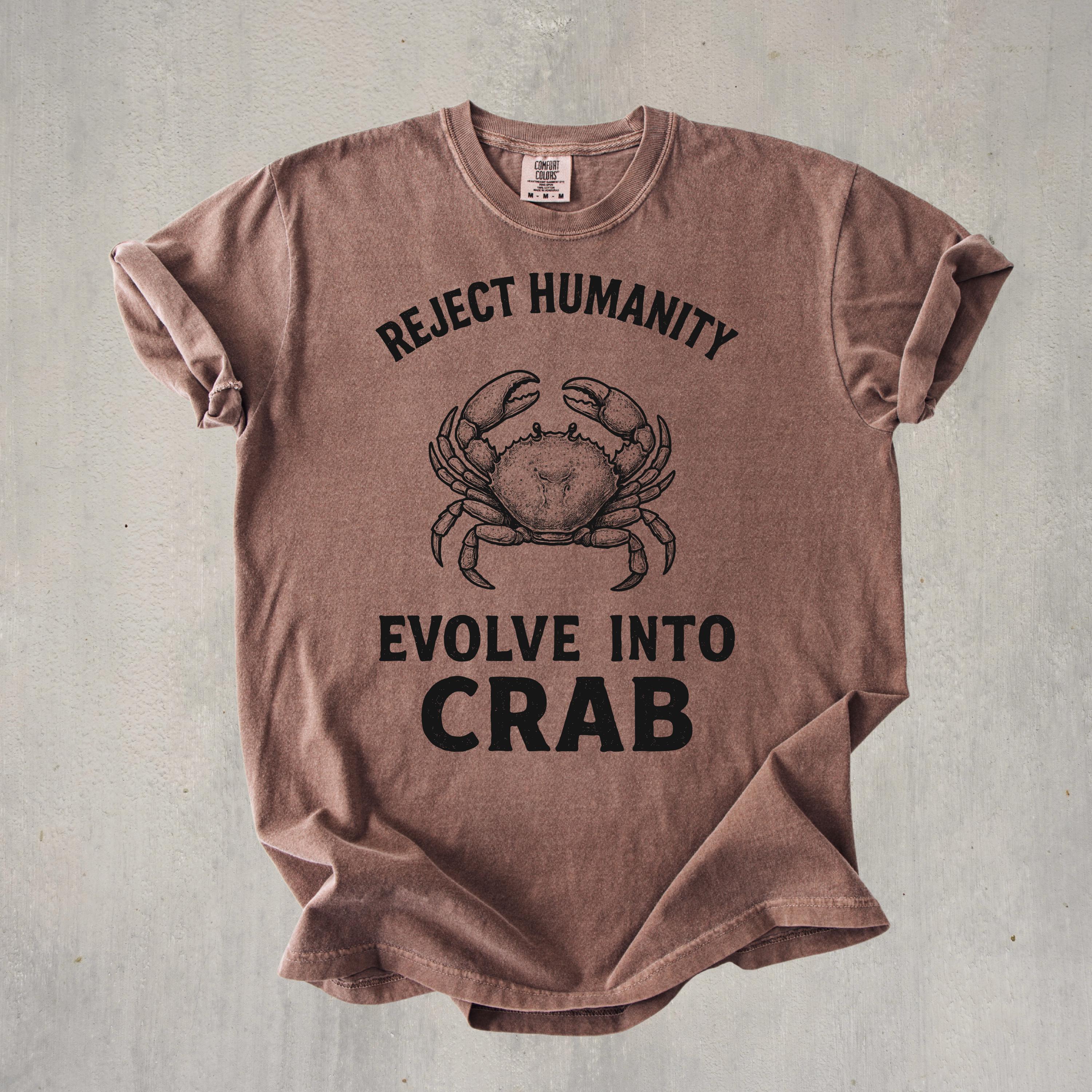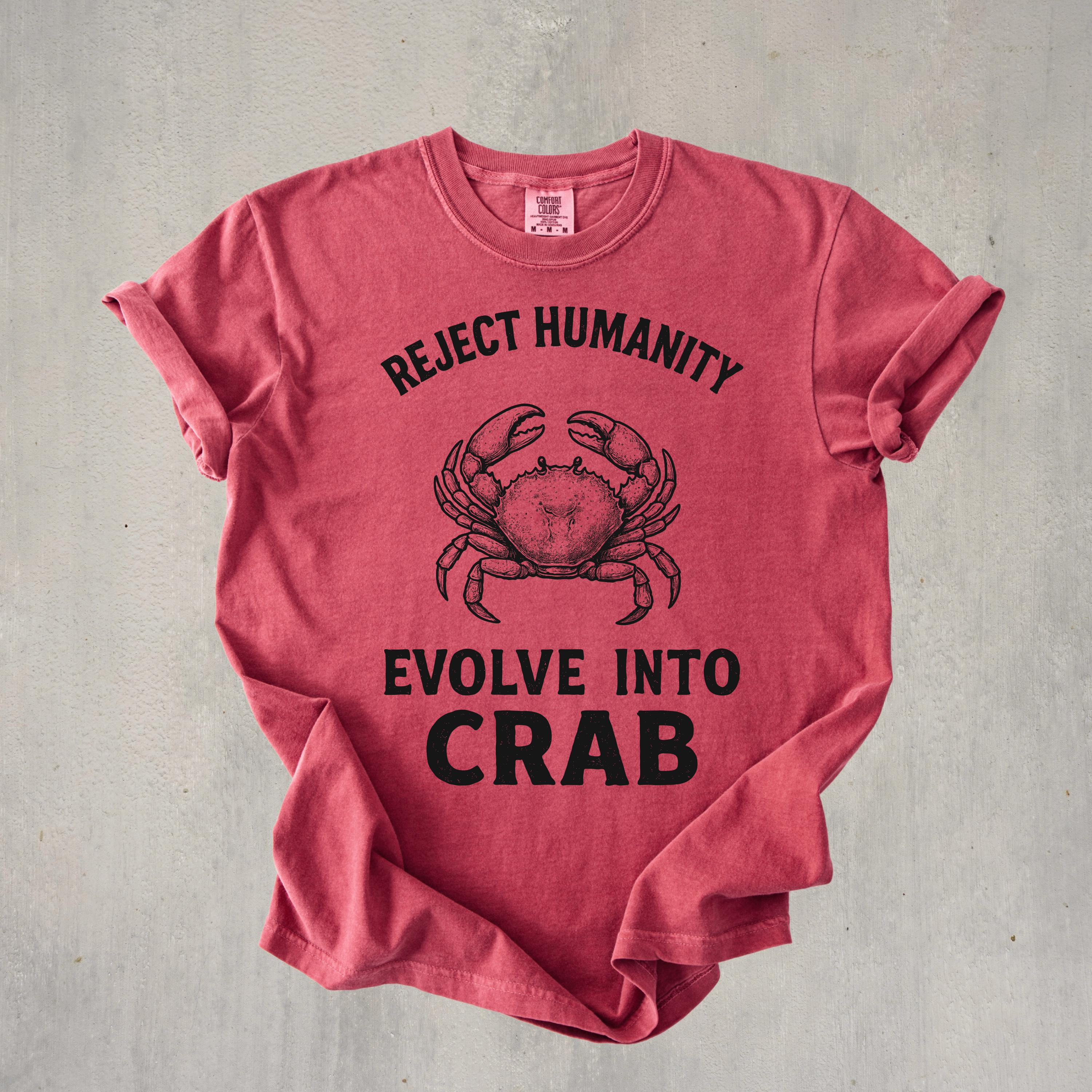 Embrace absurd humor with this “Reject Humanity Evolve Into Crab” t-shirt, featuring a bold vintage-style crab illustration and hilarious meme text. Perfect for those who love internet humor, sarcasm, and unique graphic tees that stand out.👕 This shirt is made using Comfort Colors premium garments: • 1717 short sleeve – soft, garment-dyed cotton with a relaxed unisex fit and vintage look • 6014 long sleeve – heavyweight fabric with ribbed cuffs for a cozy feel and classic style