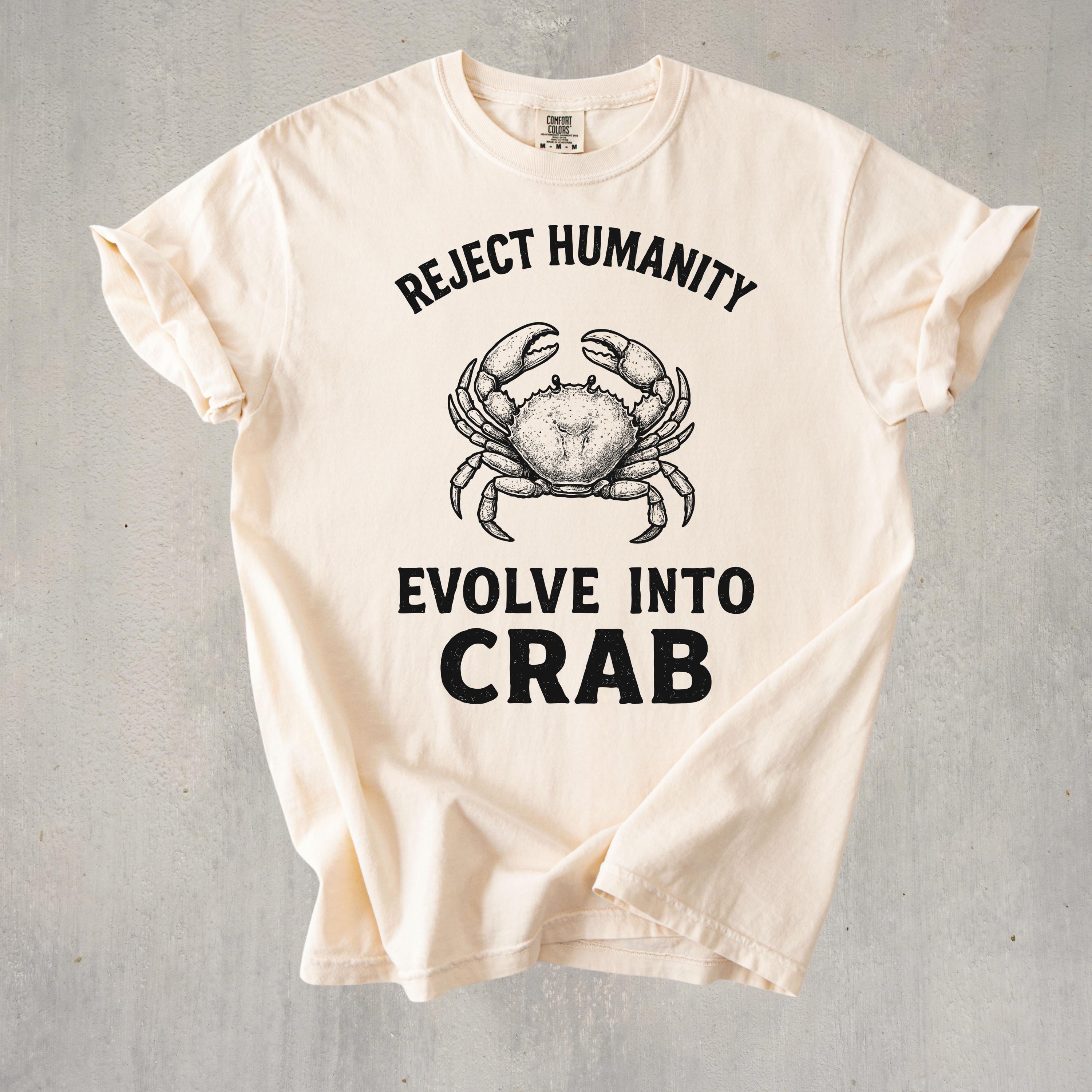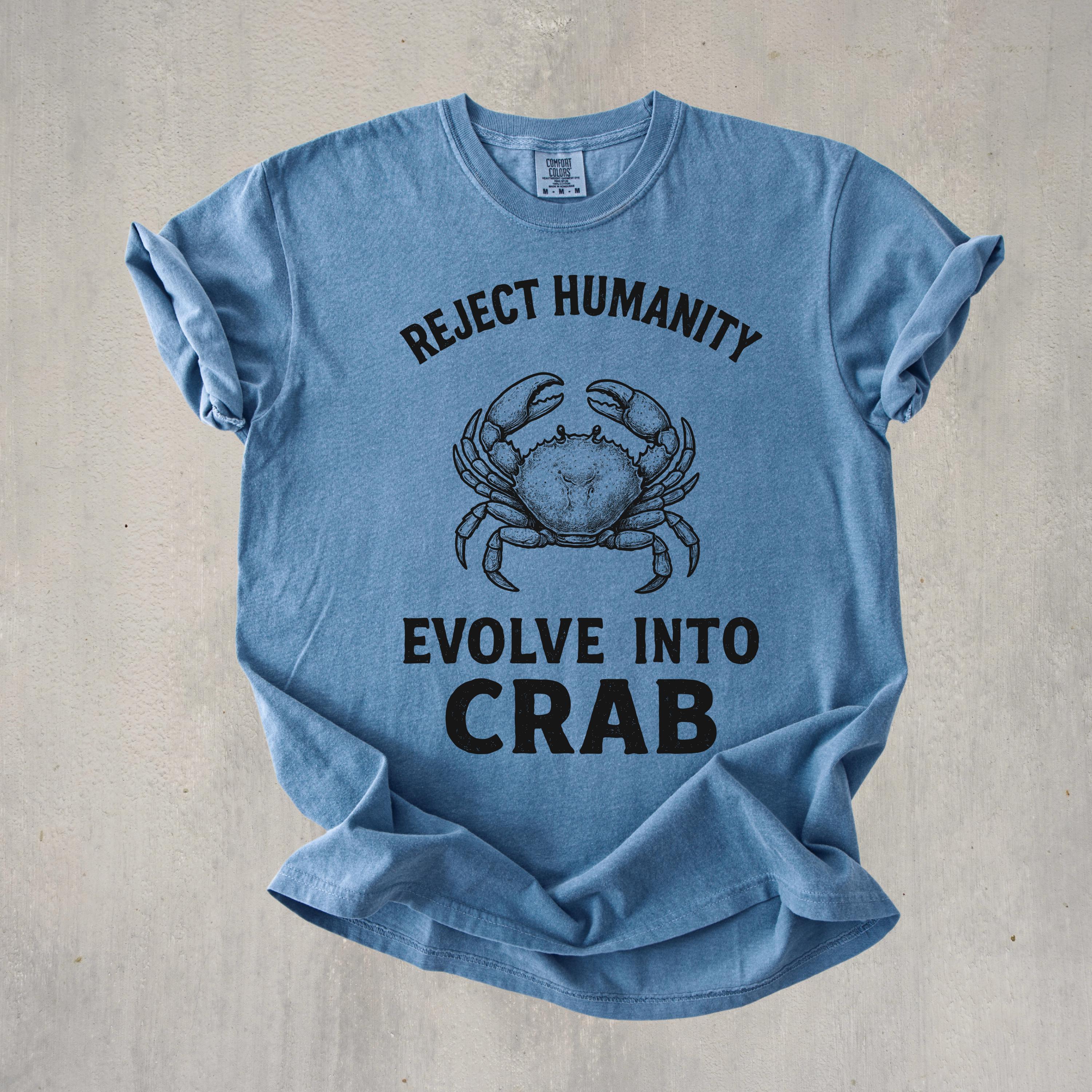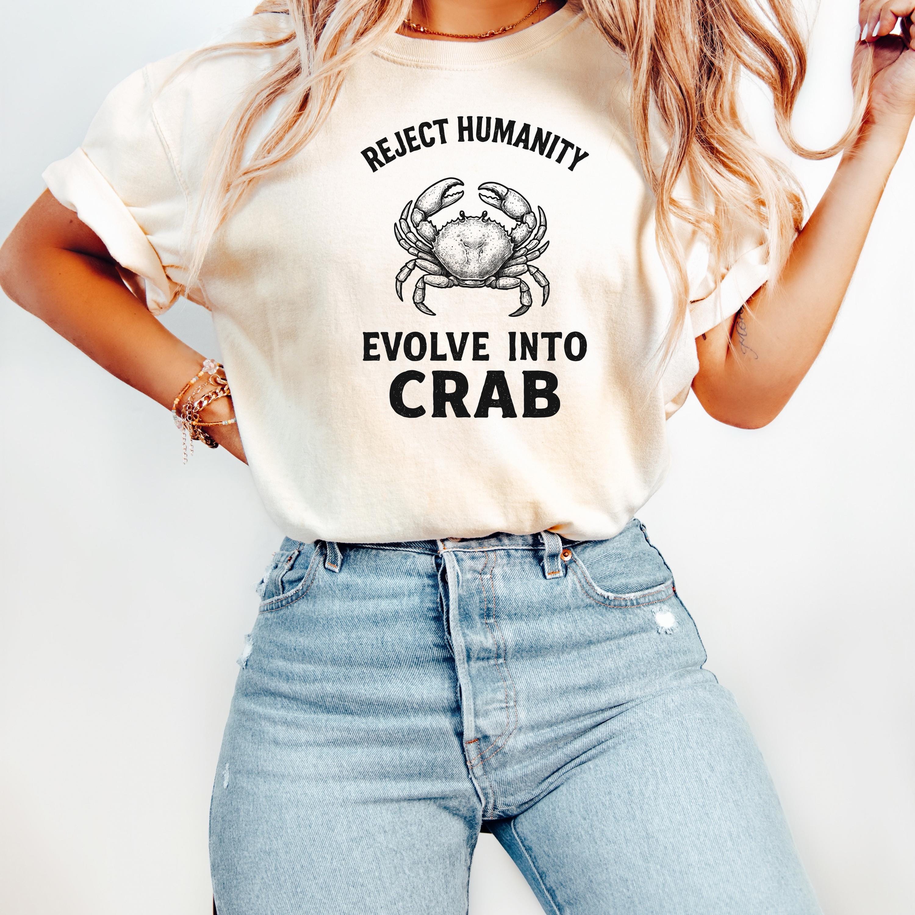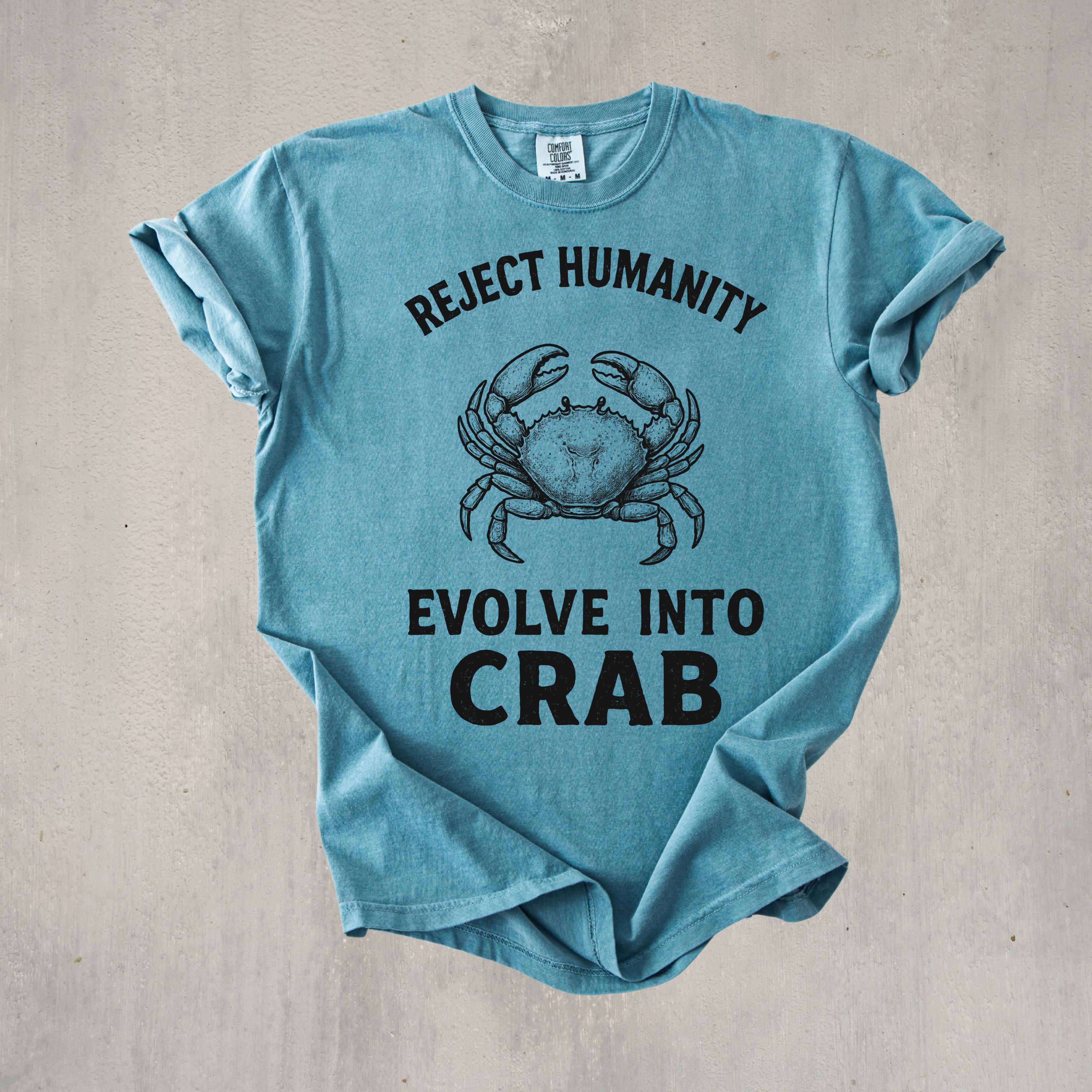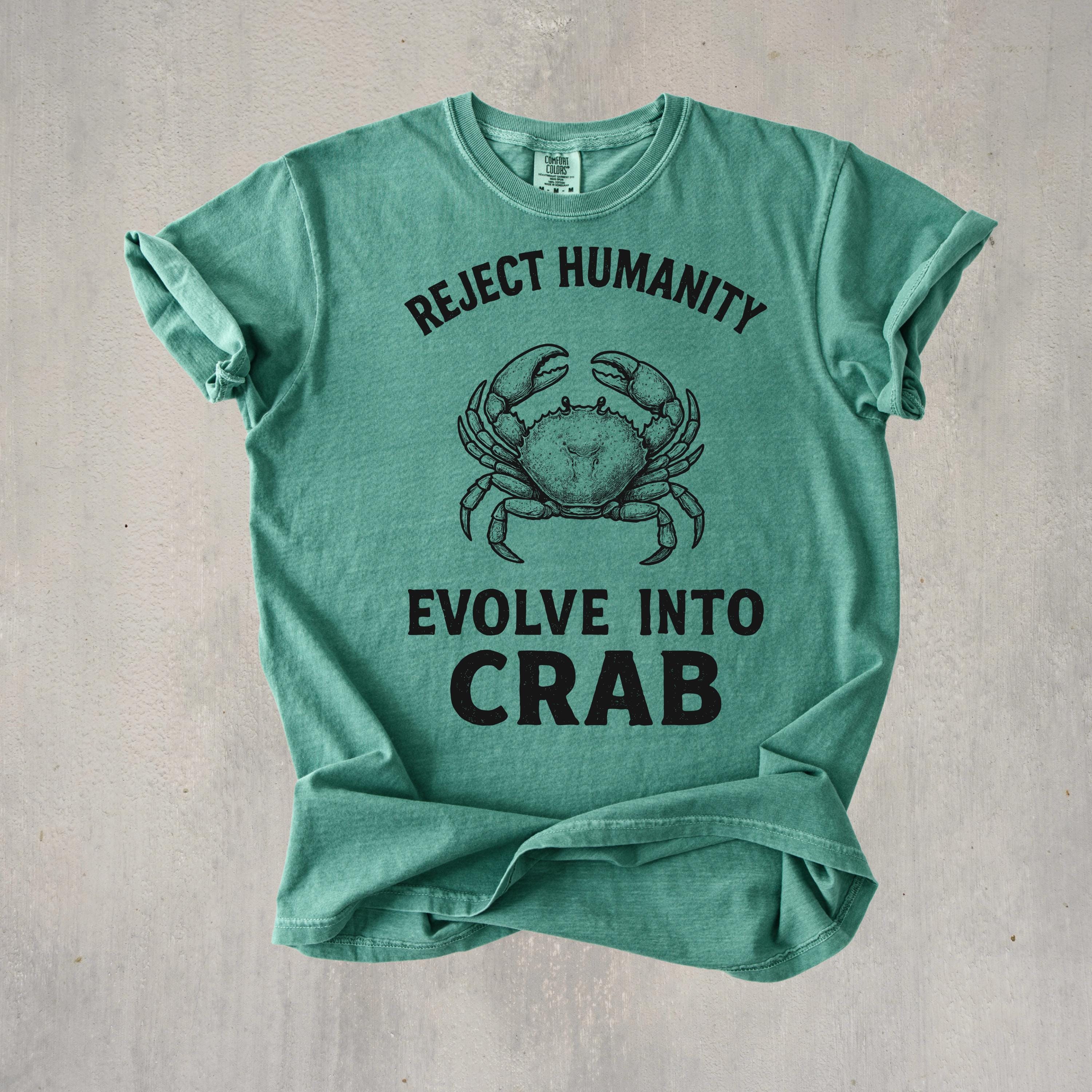 Embrace absurd humor with this “Reject Humanity Evolve Into Crab” t-shirt, featuring a bold vintage-style crab illustration and hilarious meme text. Perfect for those who love internet humor, sarcasm, and unique graphic tees that stand out.👕 This shirt is made using Comfort Colors premium garments: • 1717 short sleeve – soft, garment-dyed cotton with a relaxed unisex fit and vintage look • 6014 long sleeve – heavyweight fabric with ribbed cuffs for a cozy feel and classic style