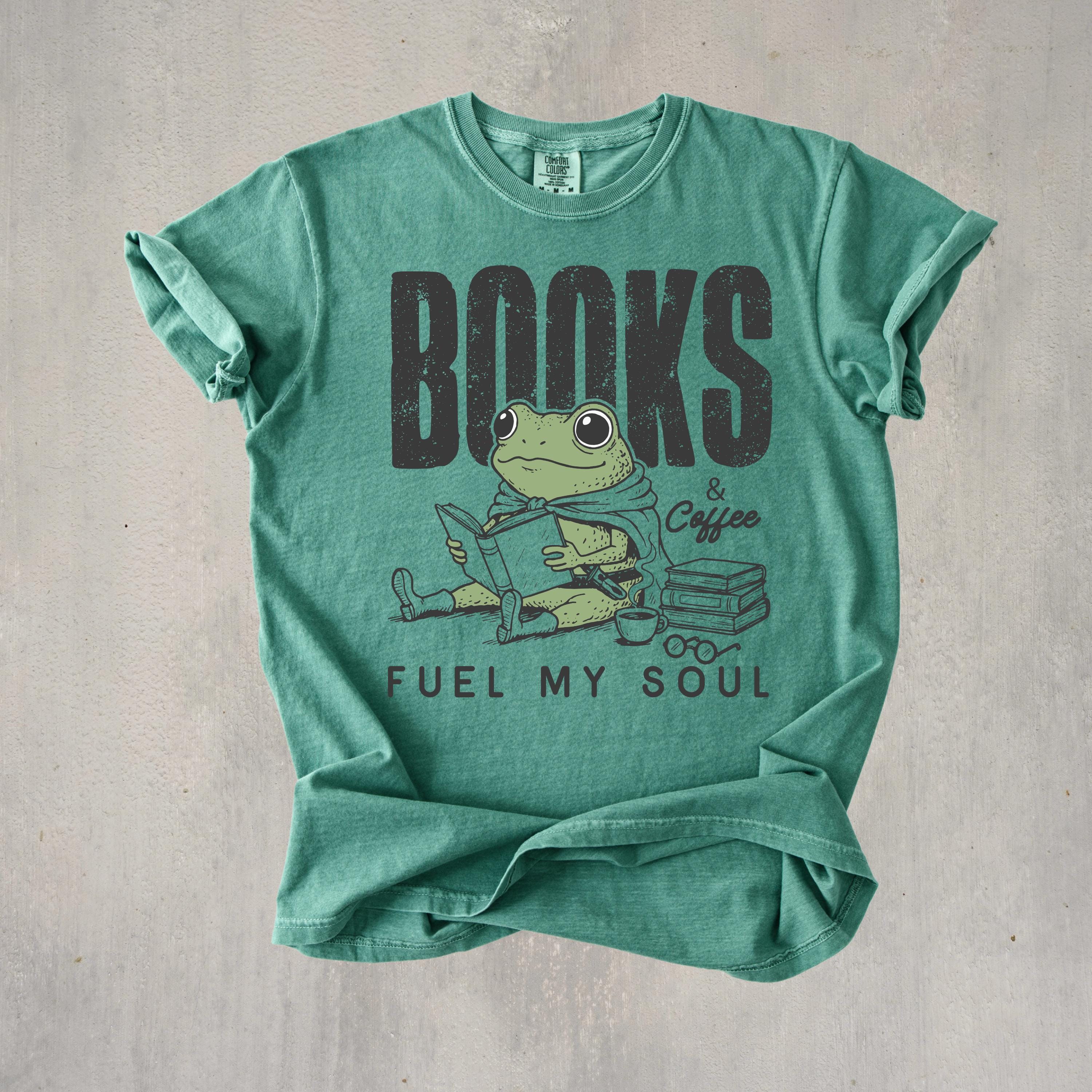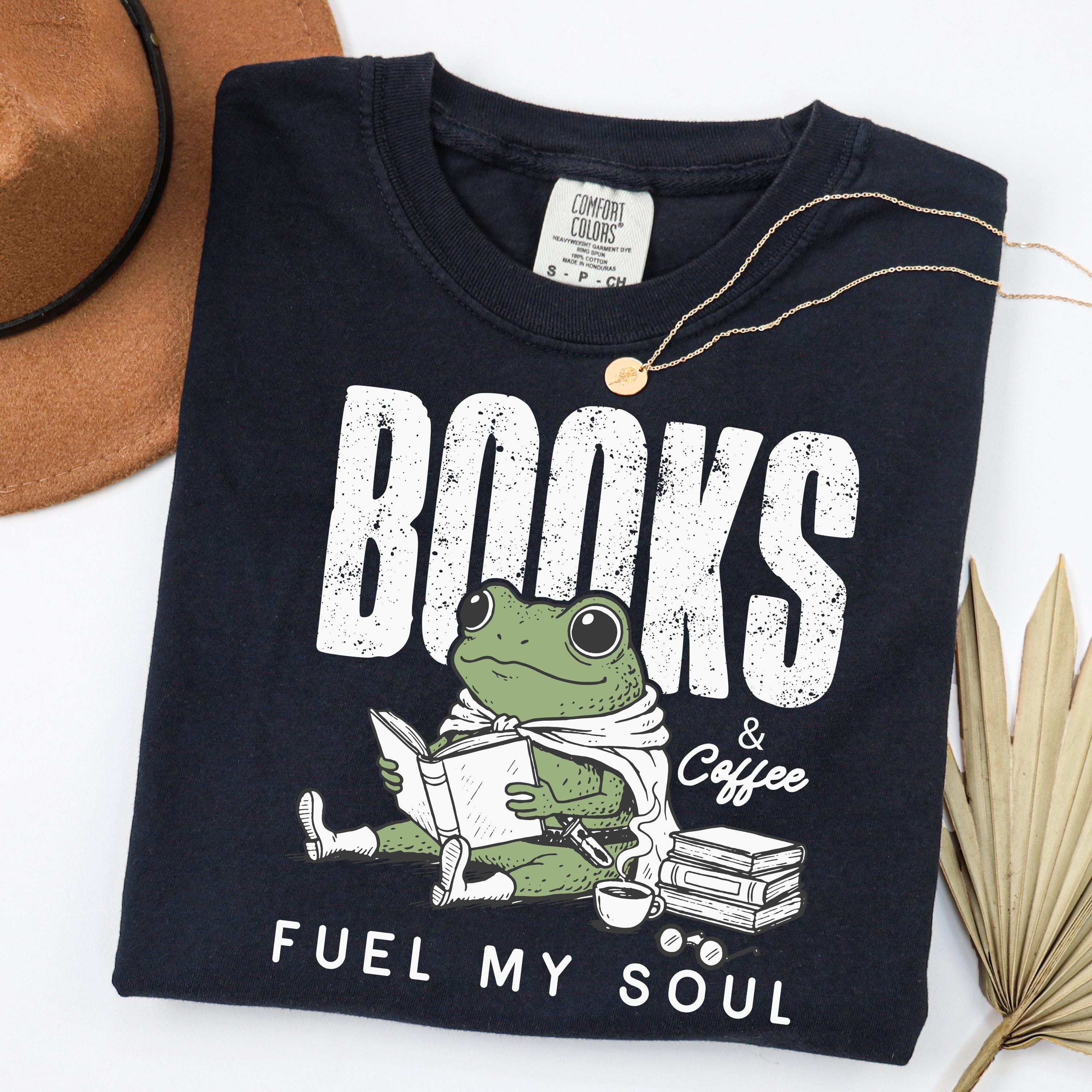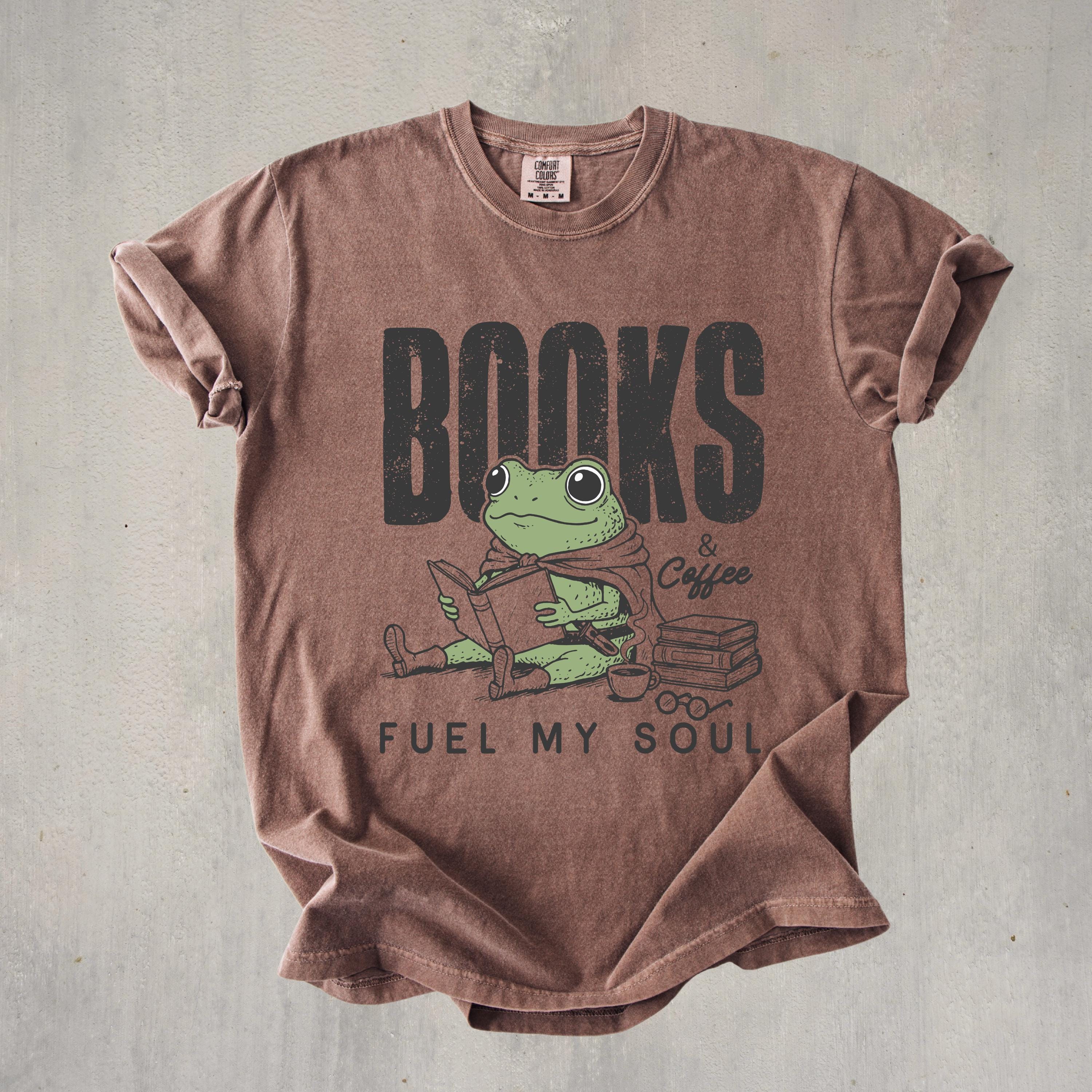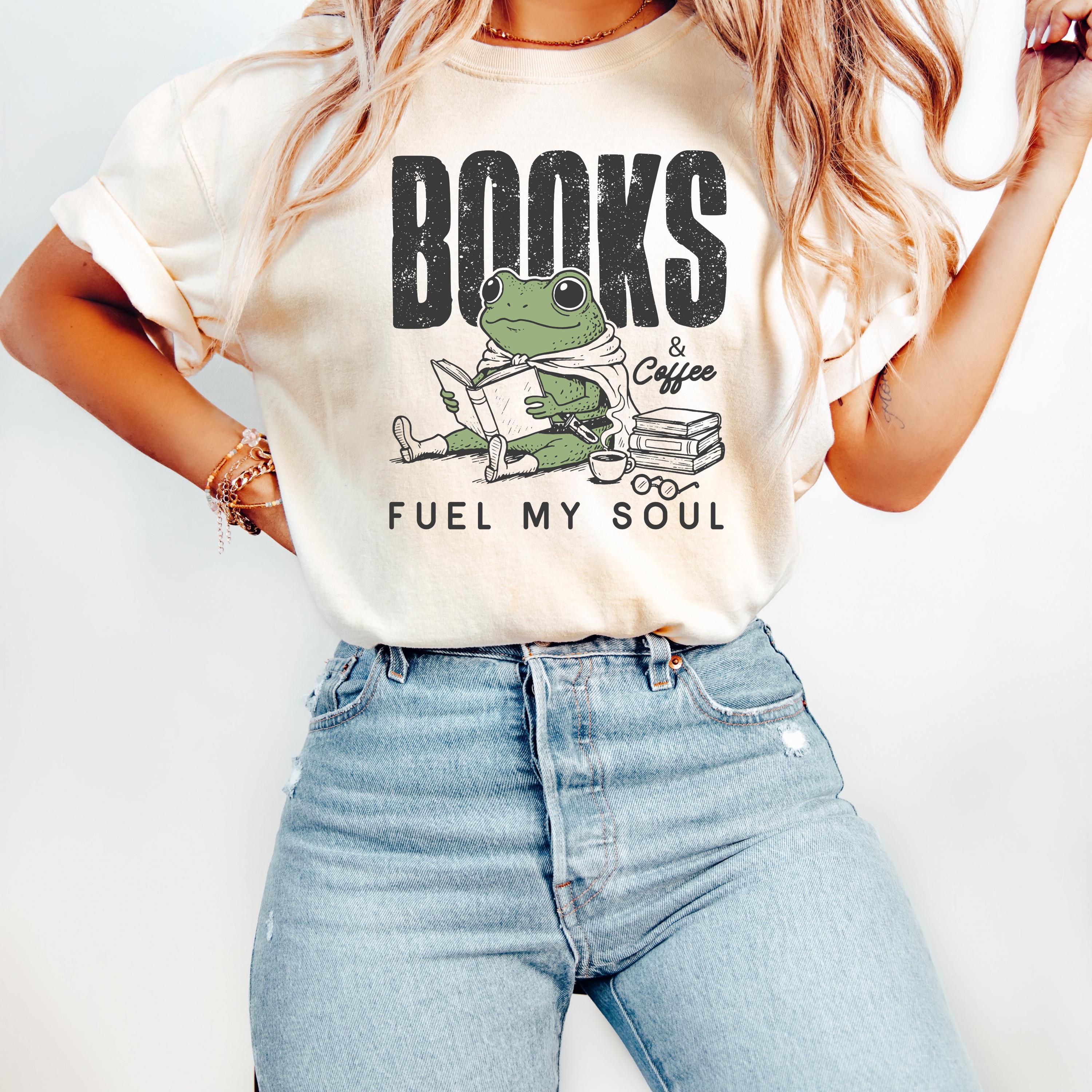 Cozy up with your favorite reads in this “Books & Coffee Fuel My Soul” t-shirt, featuring an adorable reading frog and a warm, bookish vibe. Perfect for book lovers, coffee enthusiasts, and anyone who enjoys relaxing with a good story and a comfy tee.👕 This shirt is made using Comfort Colors premium garments: • 1717 short sleeve – soft, garment-dyed cotton with a relaxed unisex fit and vintage look • 6014 long sleeve – heavyweight fabric with ribbed cuffs for a cozy feel and classic style
