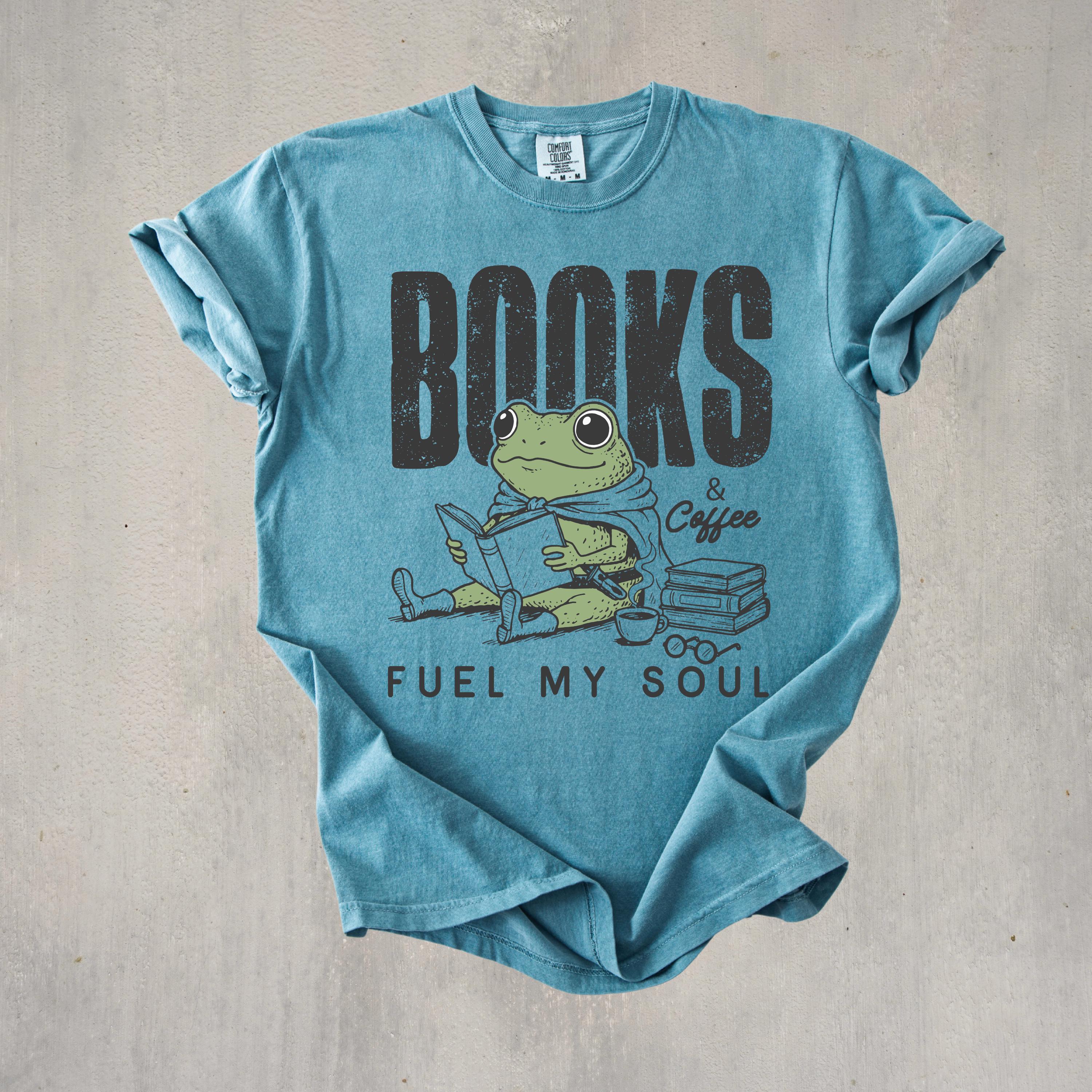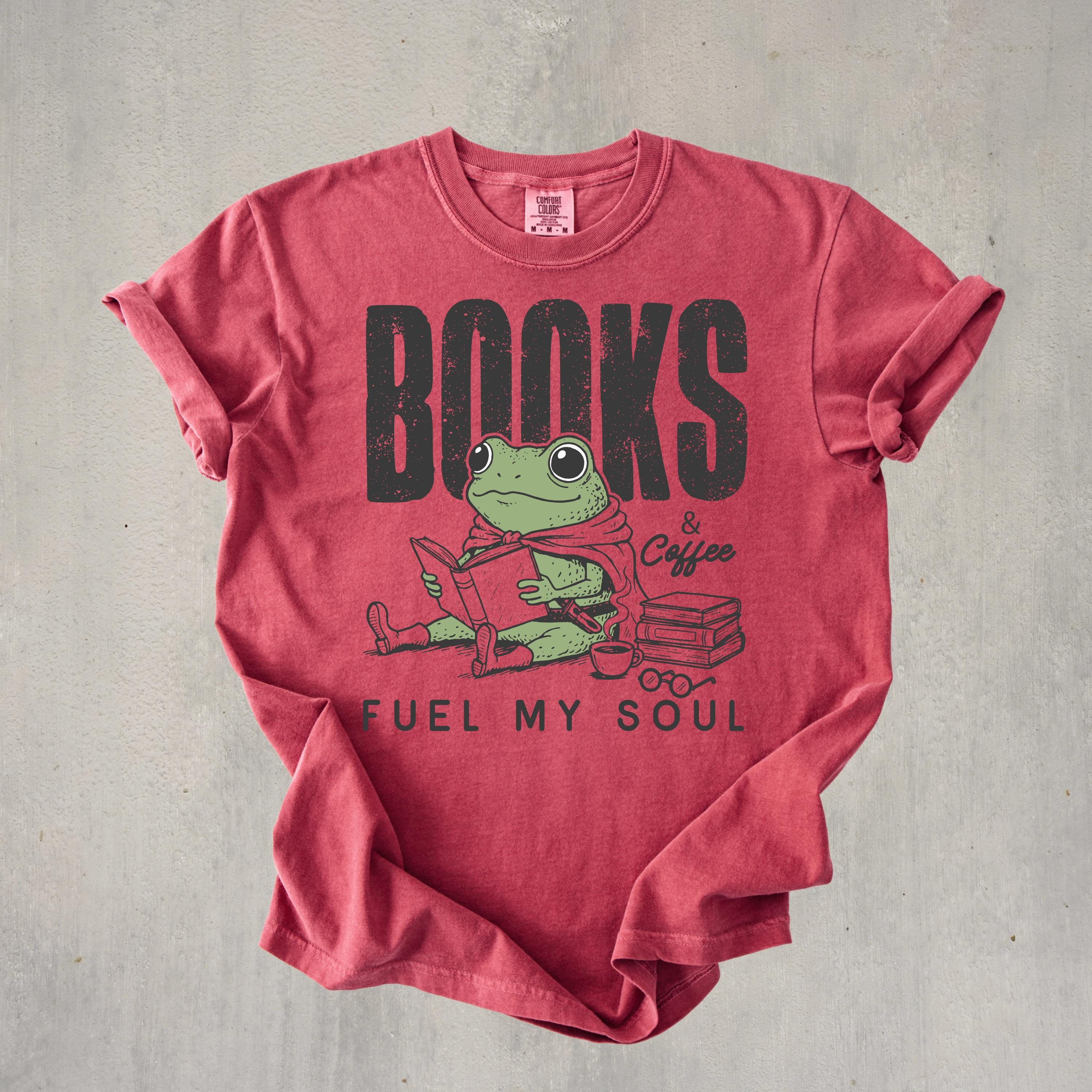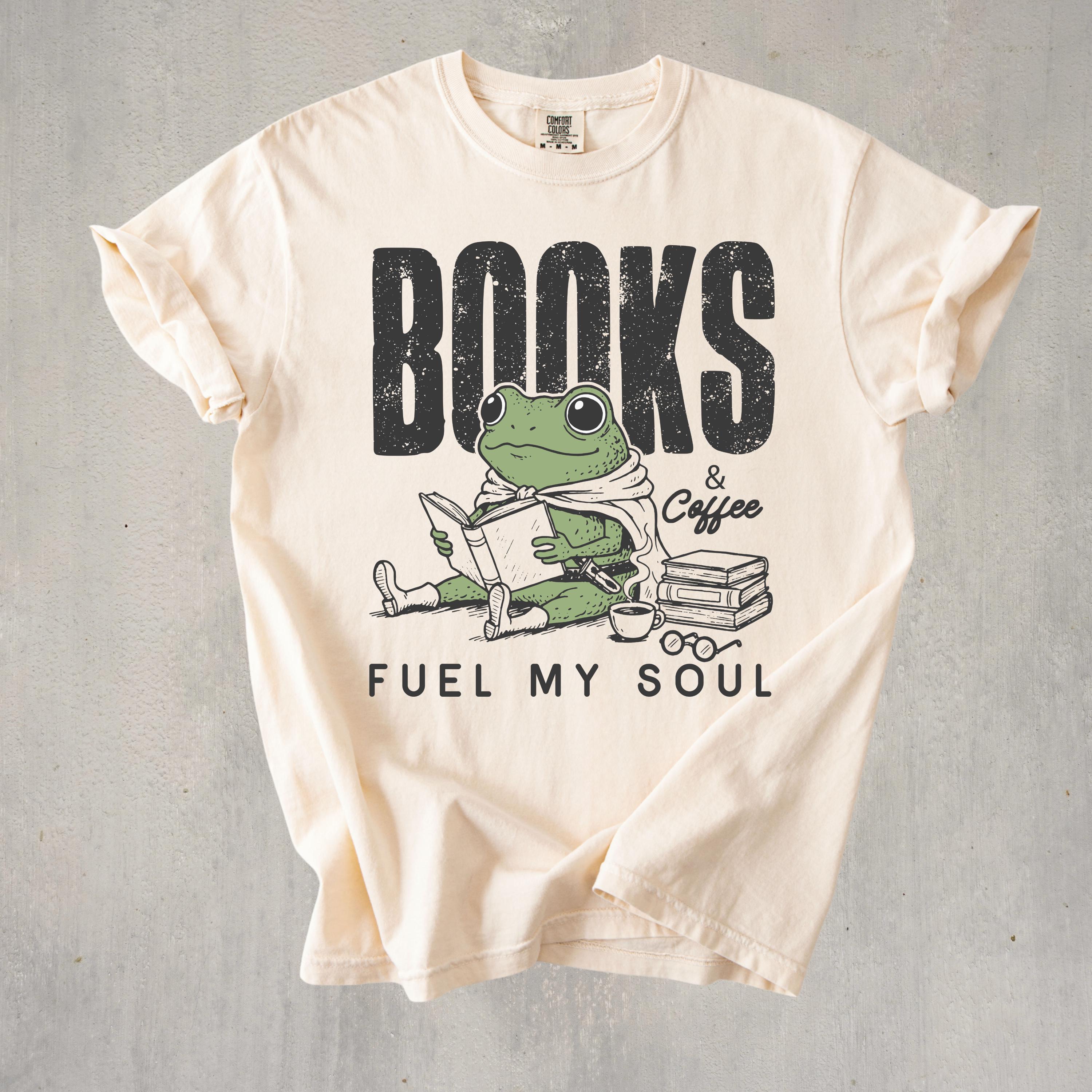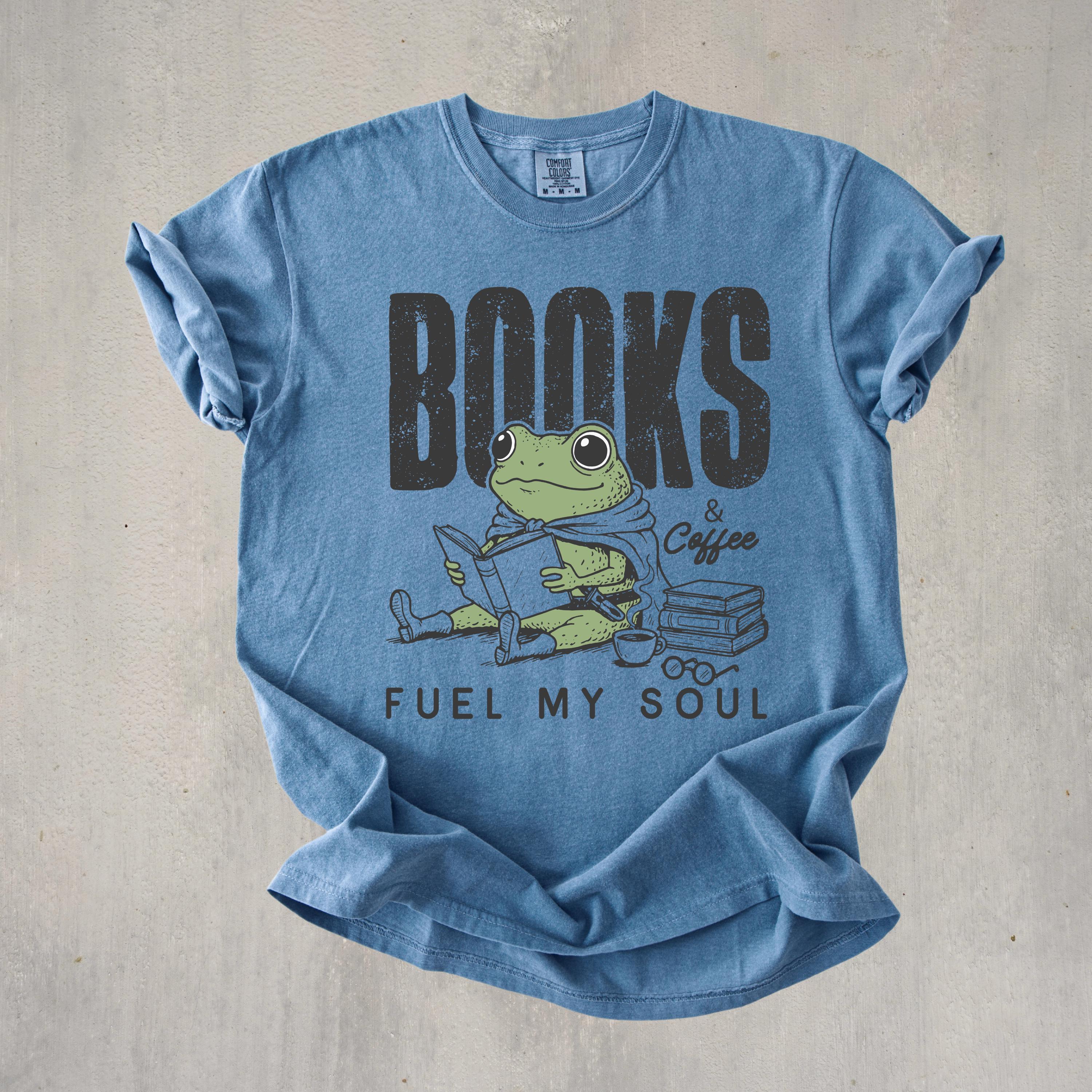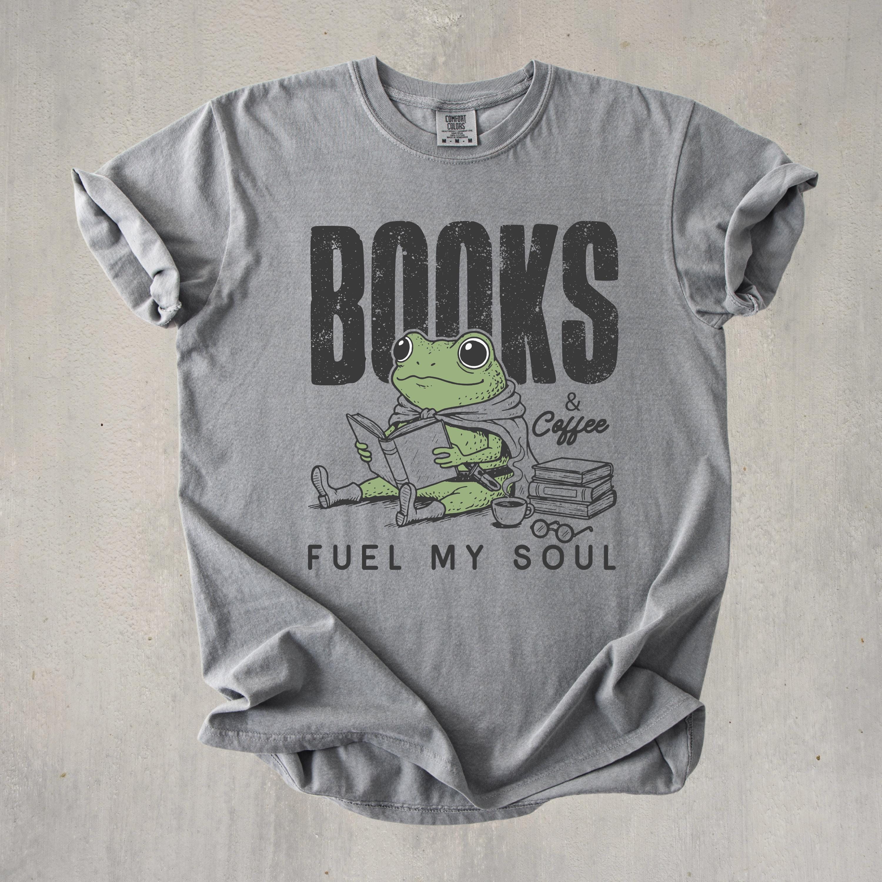 Cozy up with your favorite reads in this “Books & Coffee Fuel My Soul” t-shirt, featuring an adorable reading frog and a warm, bookish vibe. Perfect for book lovers, coffee enthusiasts, and anyone who enjoys relaxing with a good story and a comfy tee.👕 This shirt is made using Comfort Colors premium garments: • 1717 short sleeve – soft, garment-dyed cotton with a relaxed unisex fit and vintage look • 6014 long sleeve – heavyweight fabric with ribbed cuffs for a cozy feel and classic style