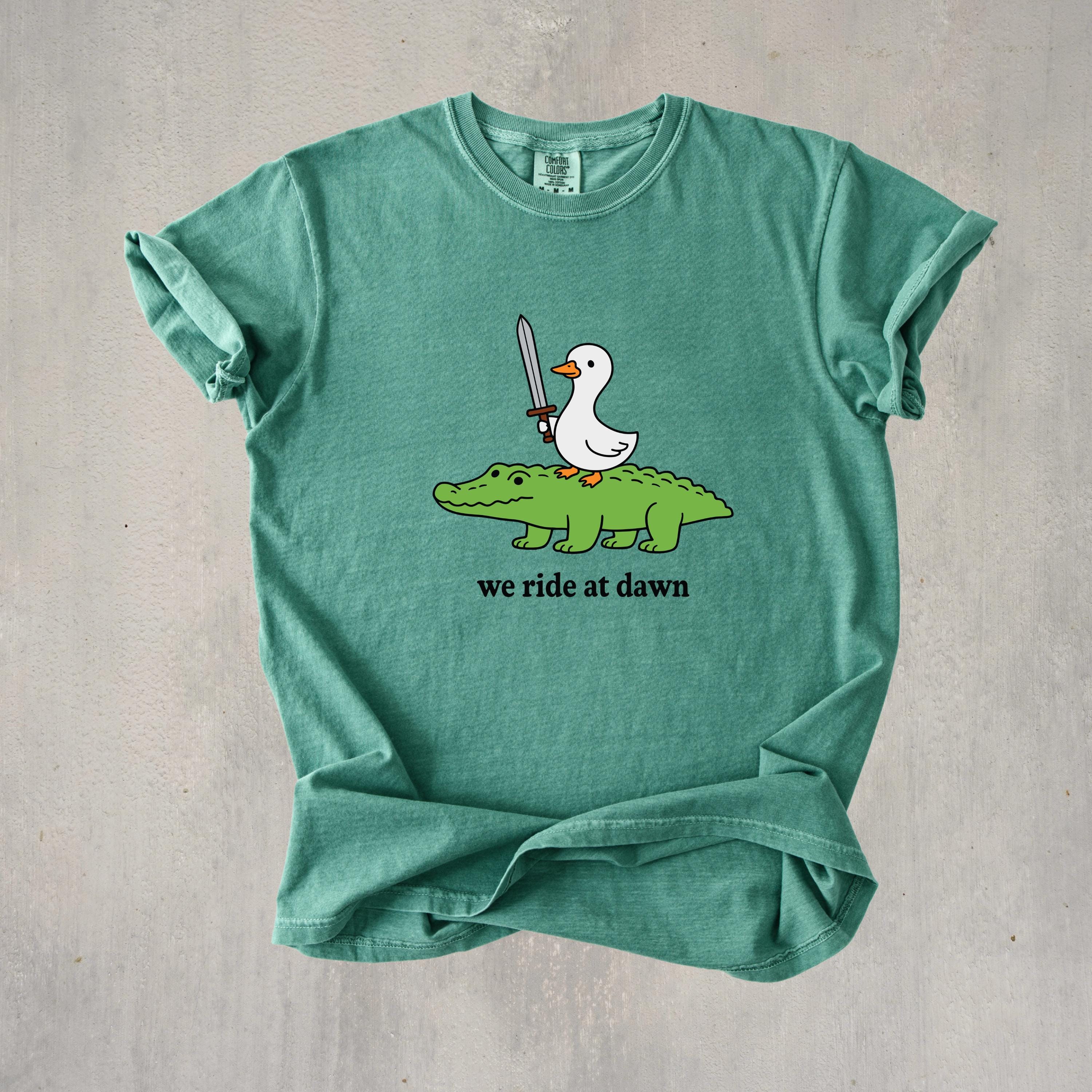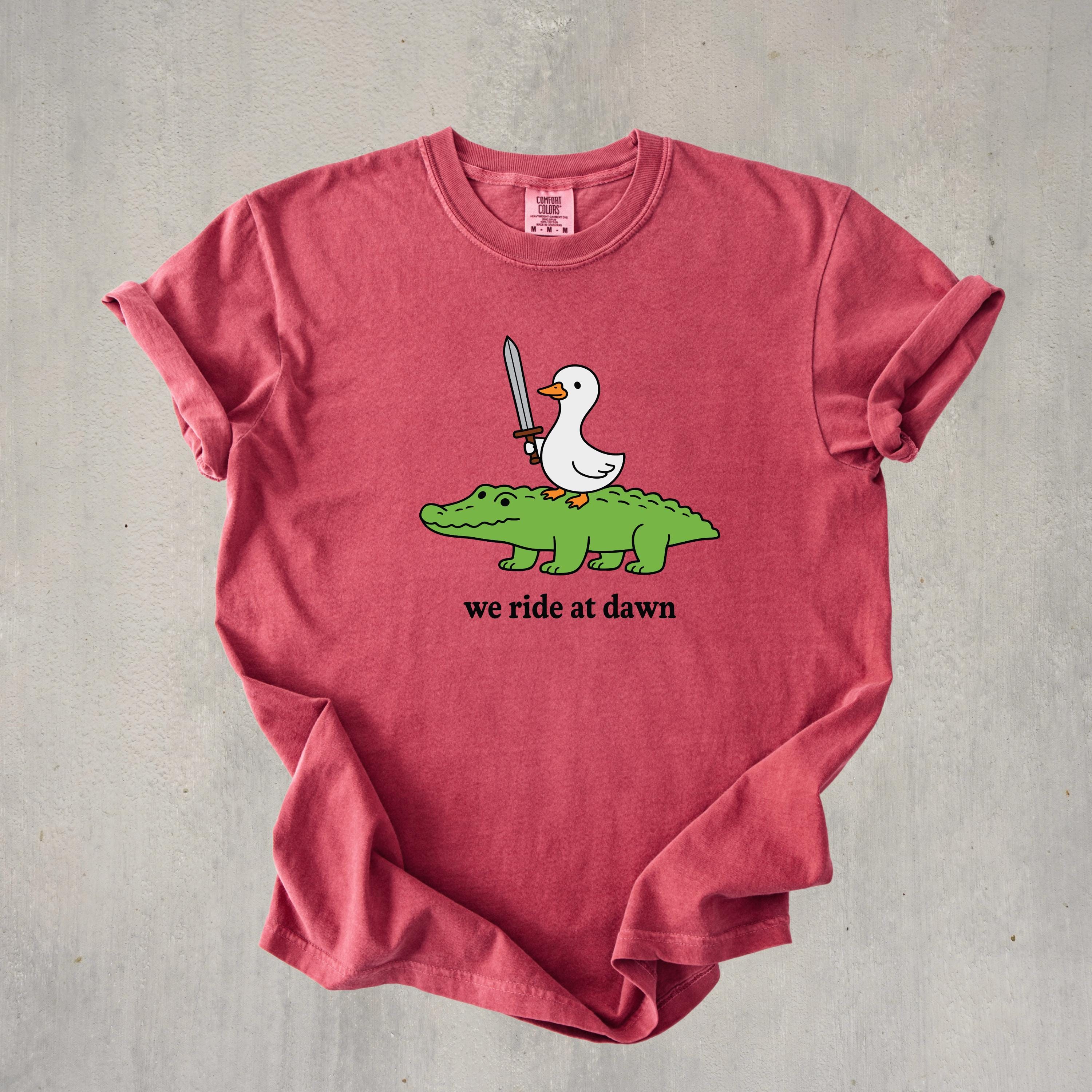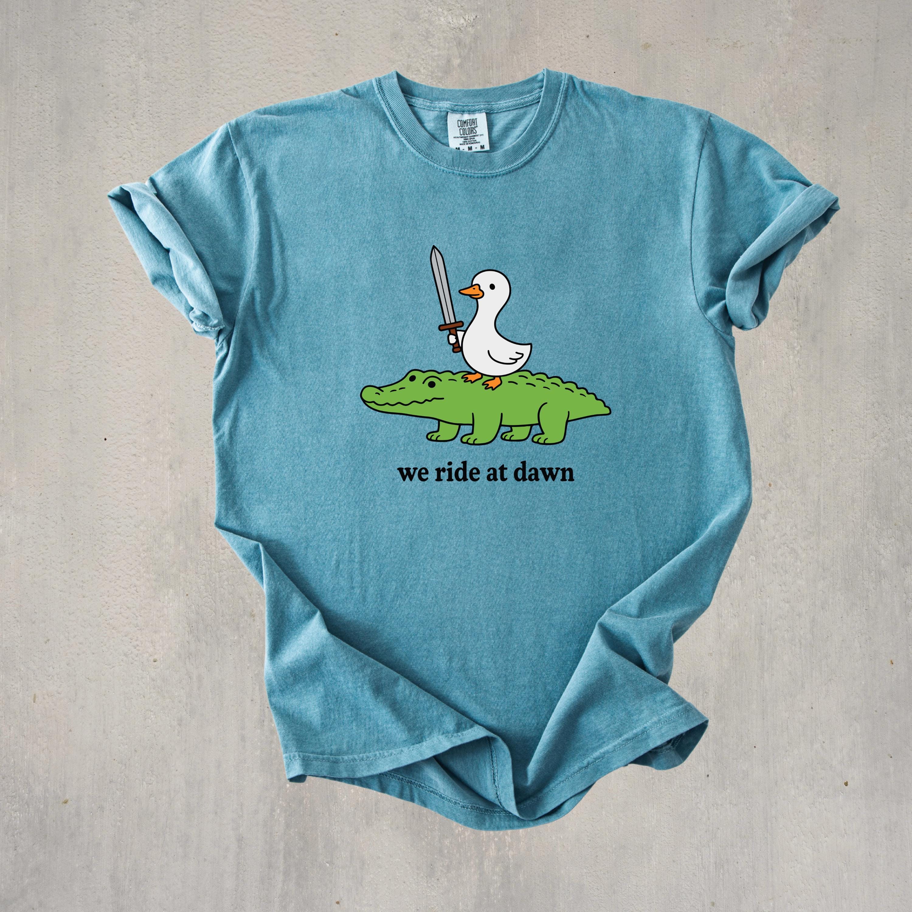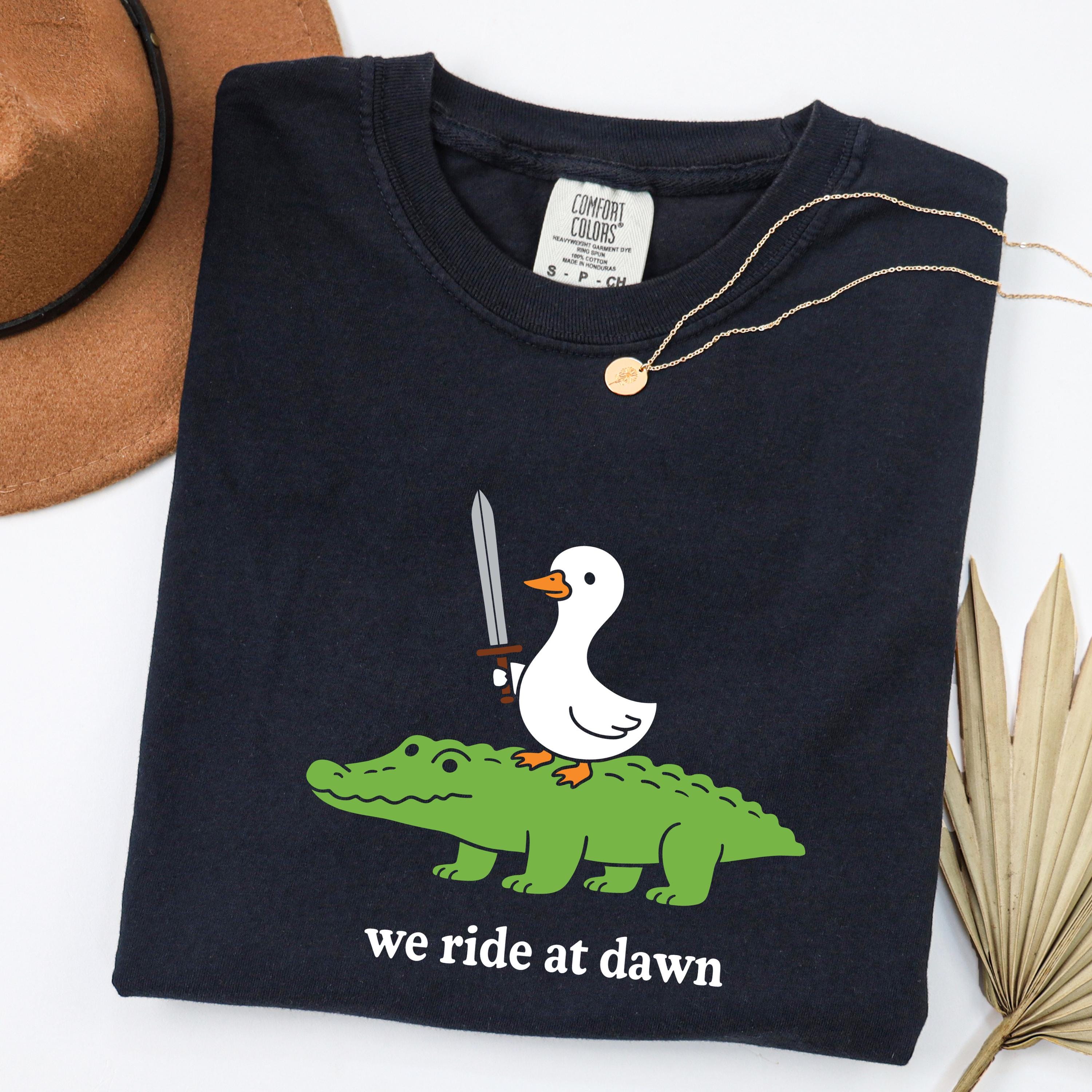 Add a playful and quirky touch to your style with this “We Ride at Dawn” t-shirt featuring a hilarious duck riding an alligator with a sword. Perfect for meme lovers, animal humor fans, and anyone who enjoys unique and funny graphic tees.👕 This shirt is made using Comfort Colors premium garments: • 1717 short sleeve – soft, garment-dyed cotton with a relaxed unisex fit and vintage look • 6014 long sleeve – heavyweight fabric with ribbed cuffs for a cozy feel and classic style