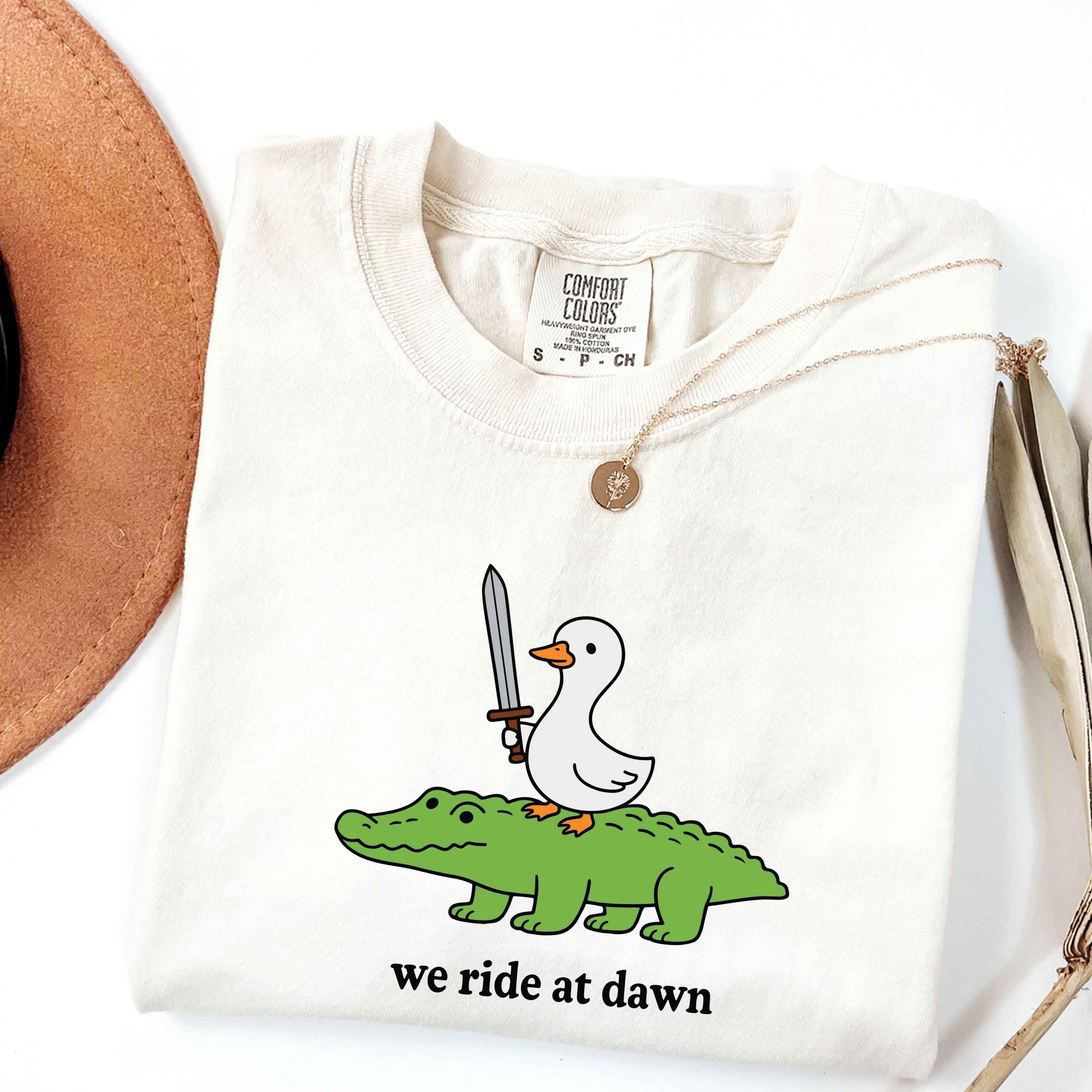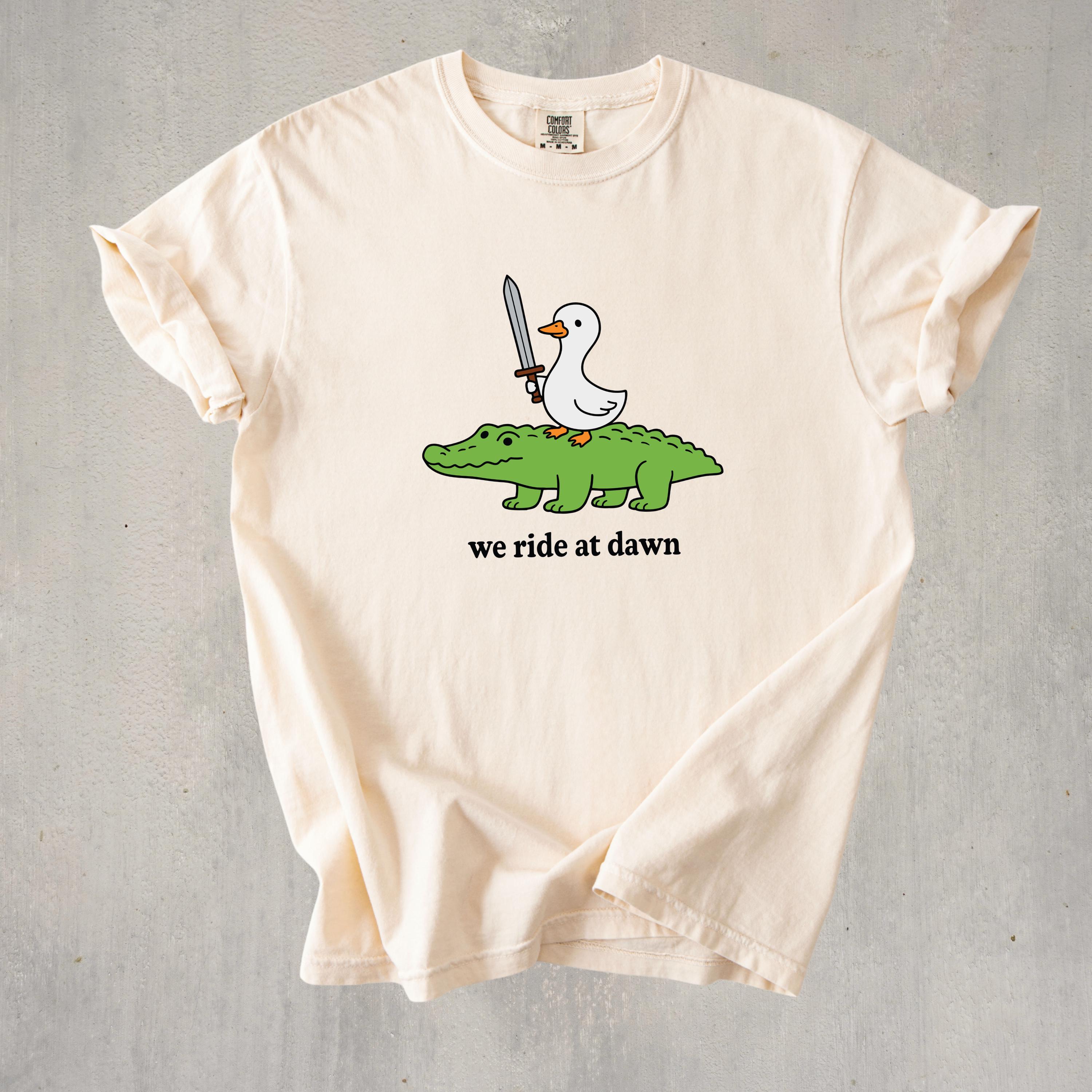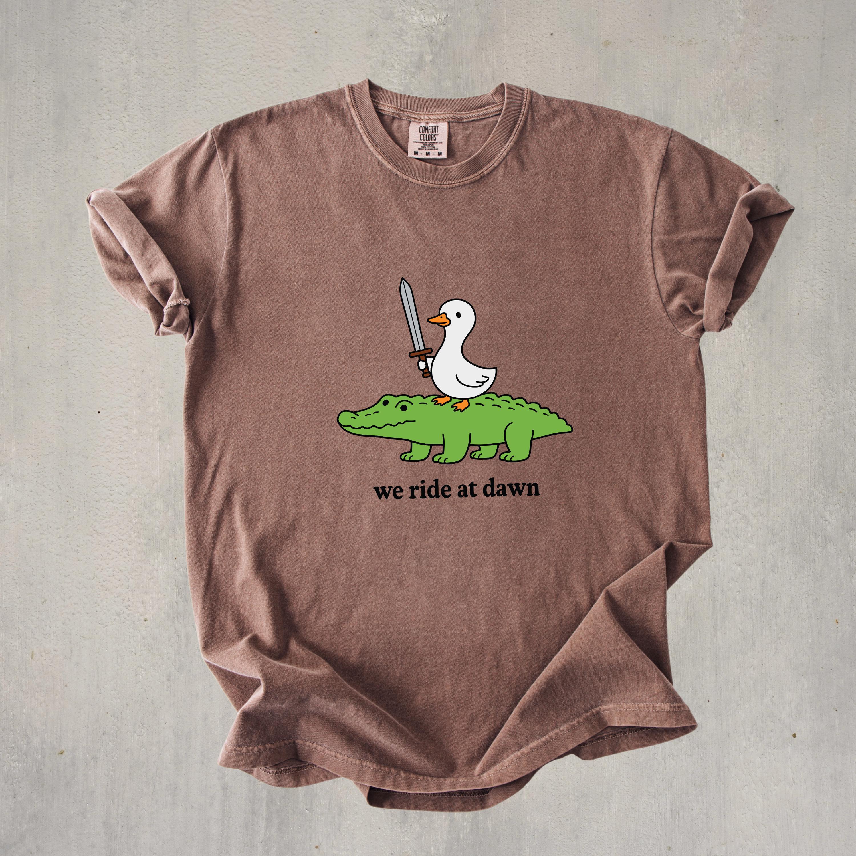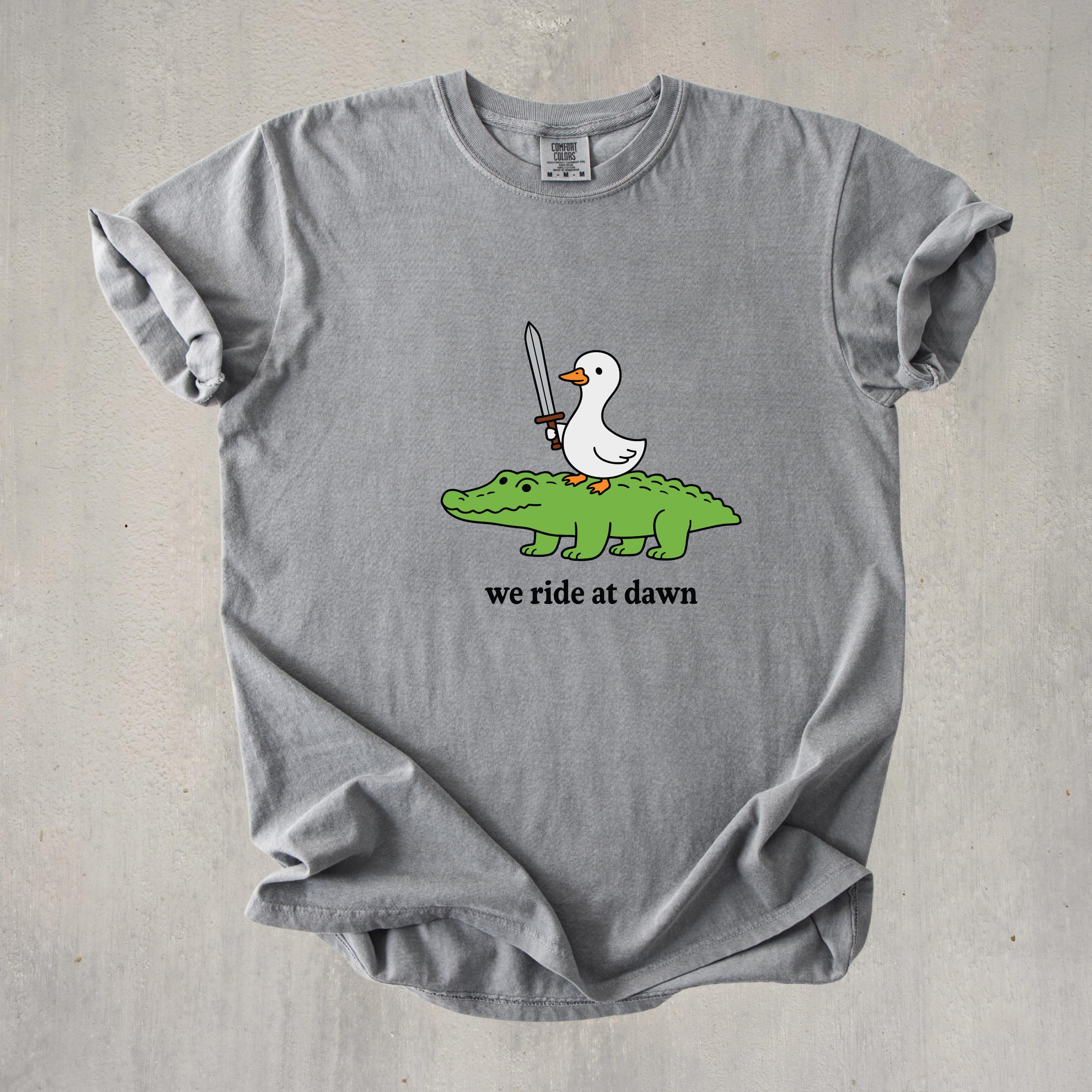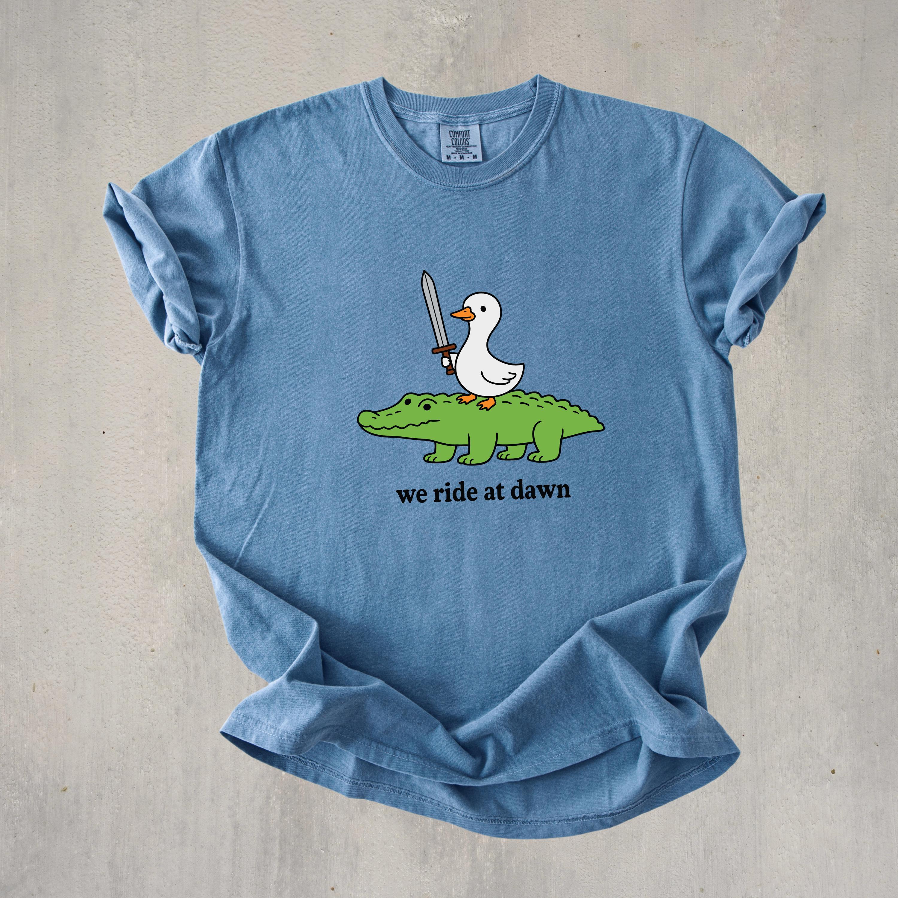 Add a playful and quirky touch to your style with this “We Ride at Dawn” t-shirt featuring a hilarious duck riding an alligator with a sword. Perfect for meme lovers, animal humor fans, and anyone who enjoys unique and funny graphic tees.👕 This shirt is made using Comfort Colors premium garments: • 1717 short sleeve – soft, garment-dyed cotton with a relaxed unisex fit and vintage look • 6014 long sleeve – heavyweight fabric with ribbed cuffs for a cozy feel and classic style