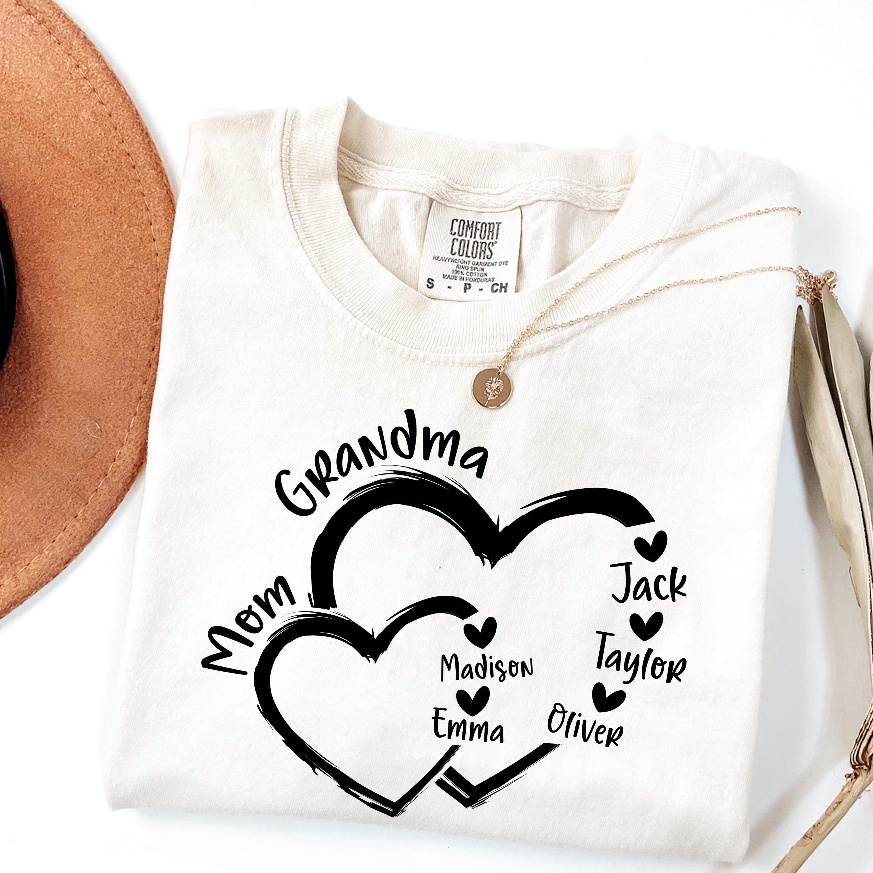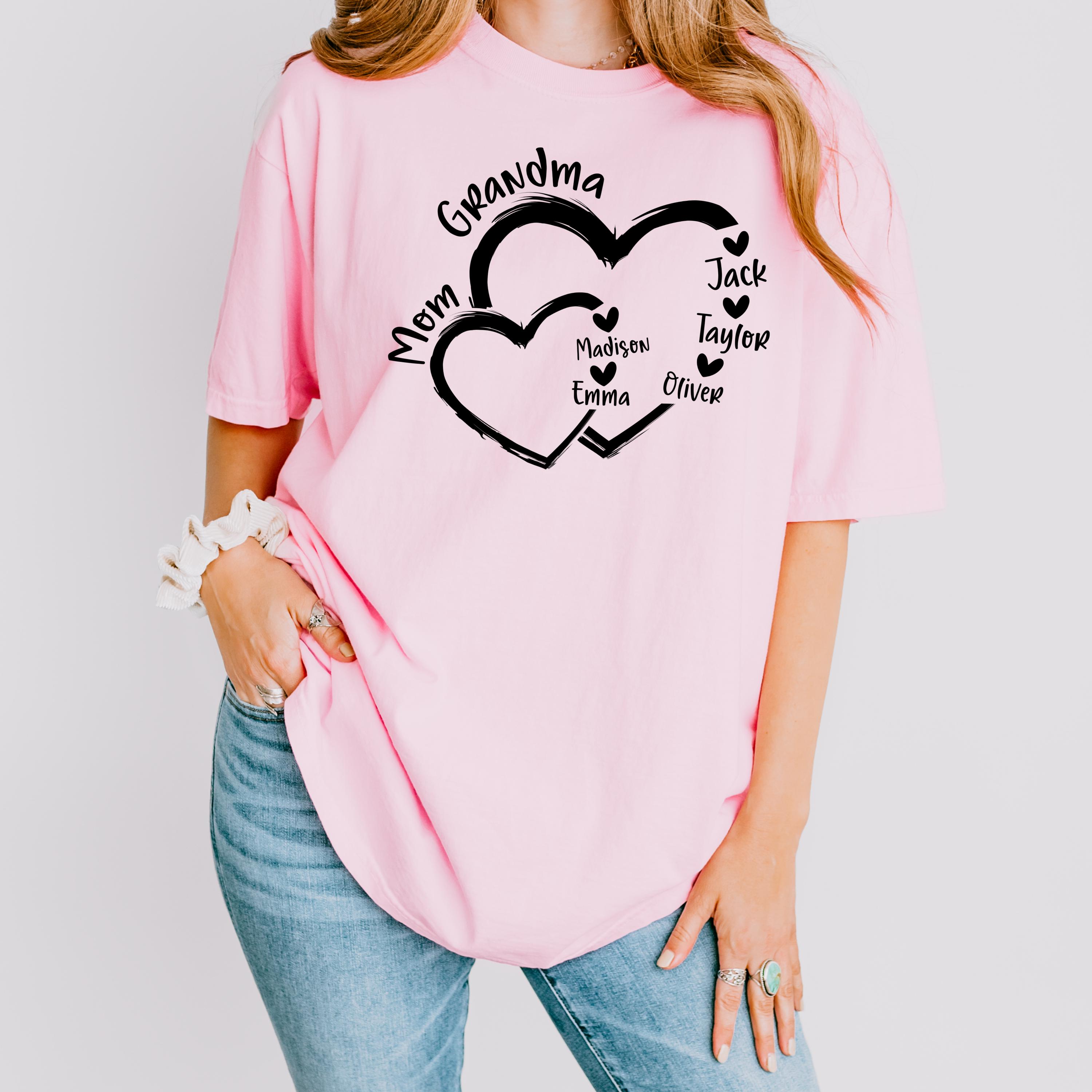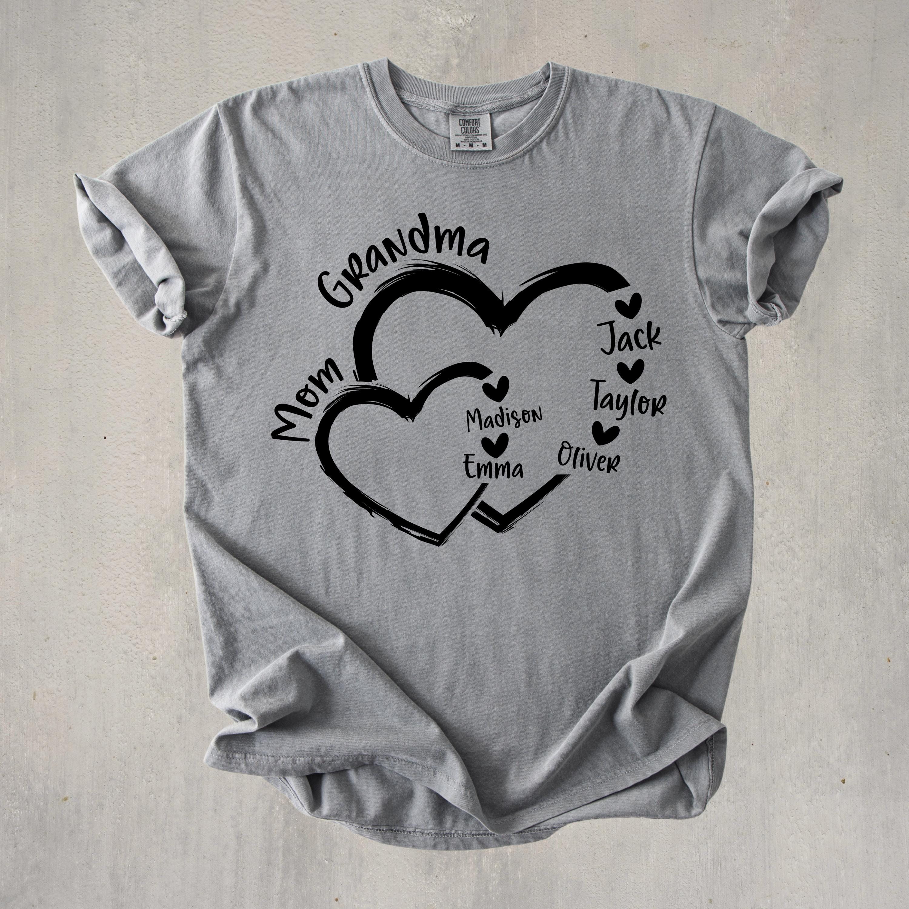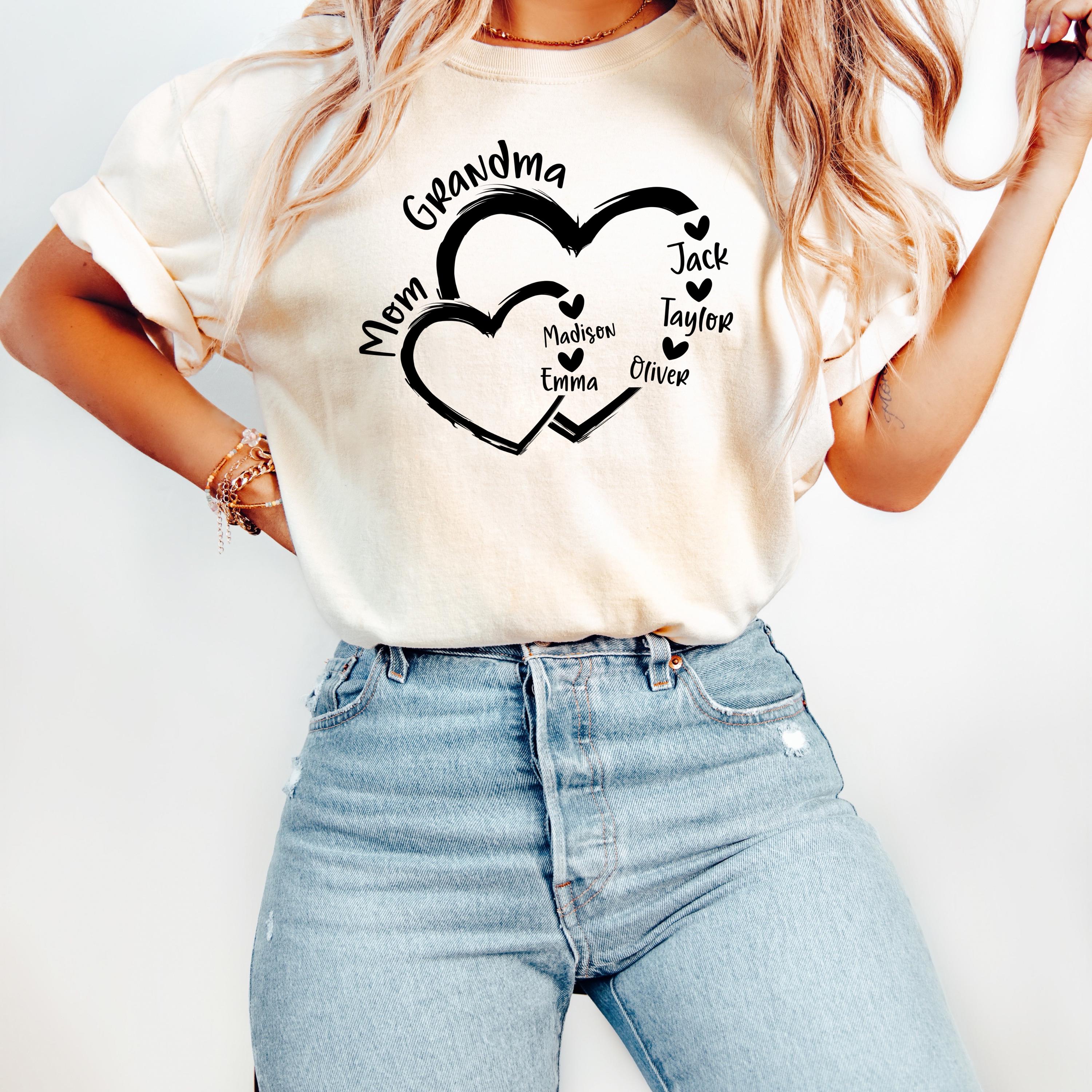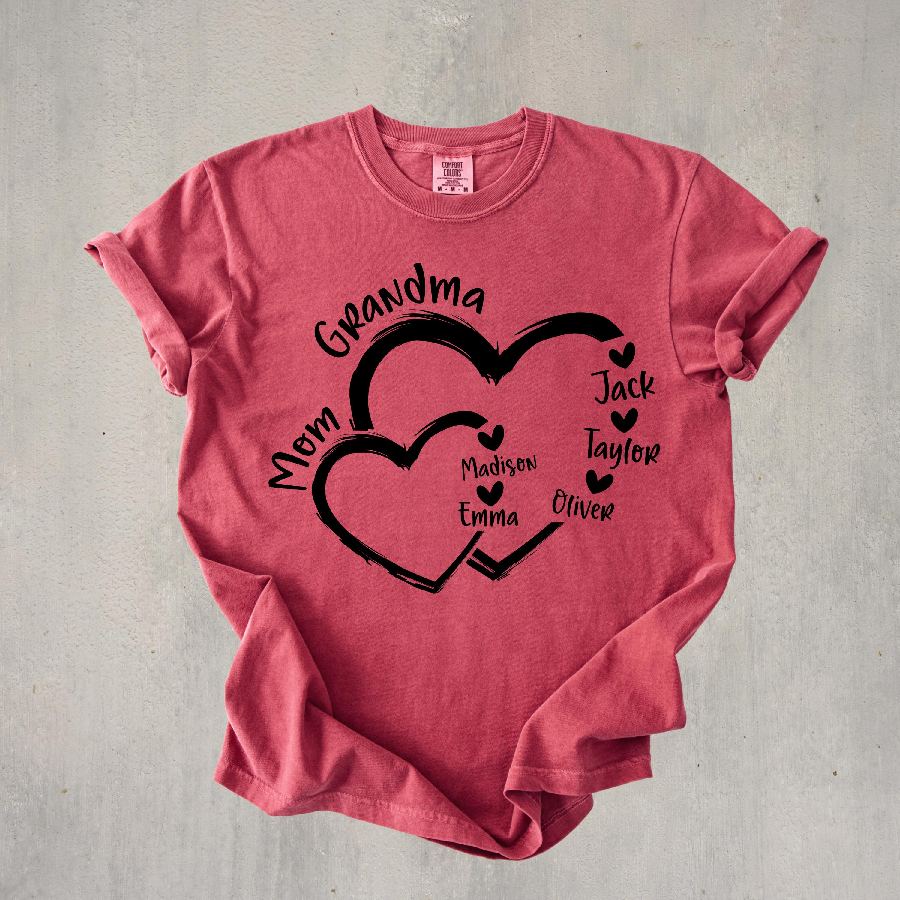 Celebrate the love between mom and grandma with this personalized heart design t-shirt, featuring custom names inside a beautiful layered heart illustration. A meaningful and stylish gift, perfect for Mother’s Day, birthdays, or everyday wear for moms and grandmas.