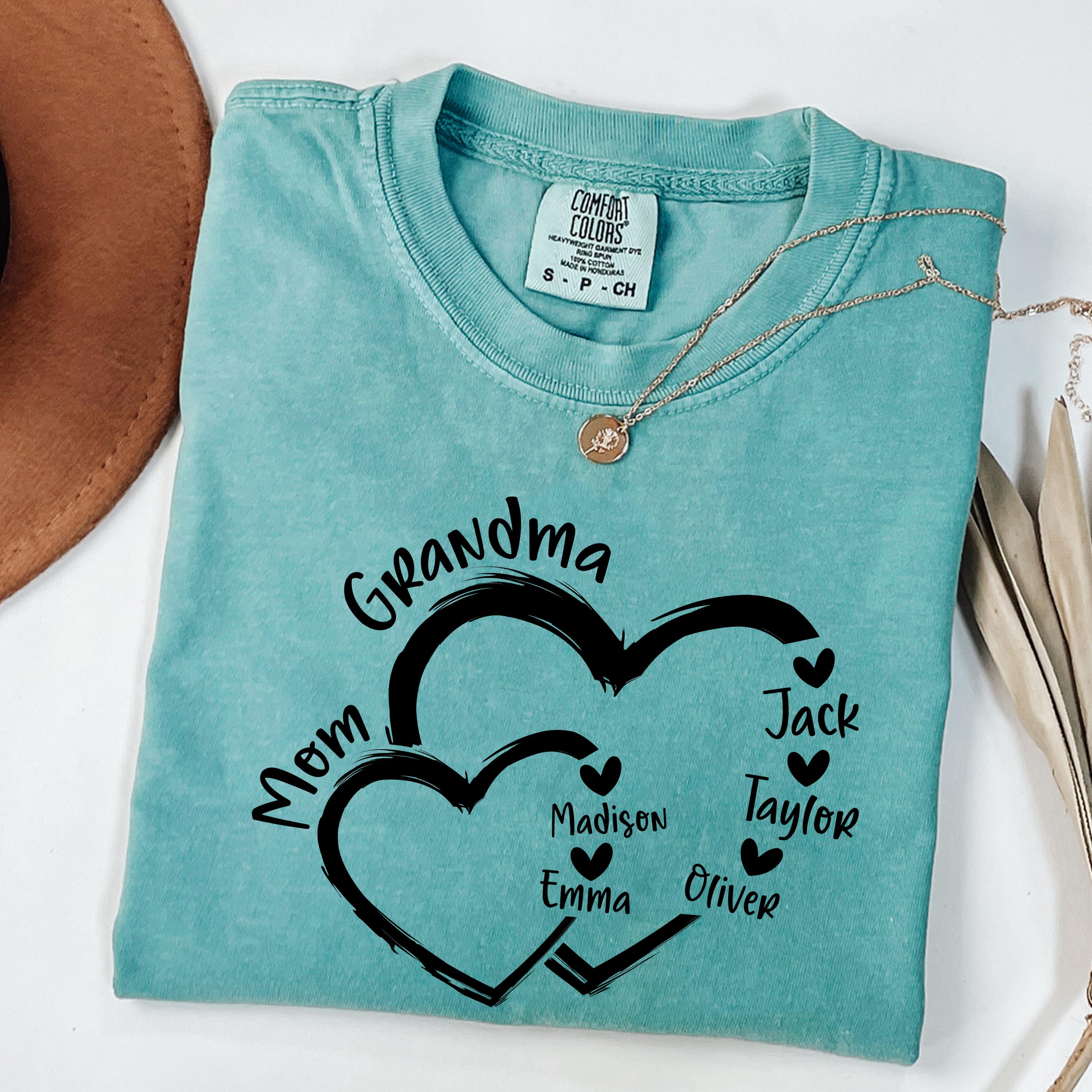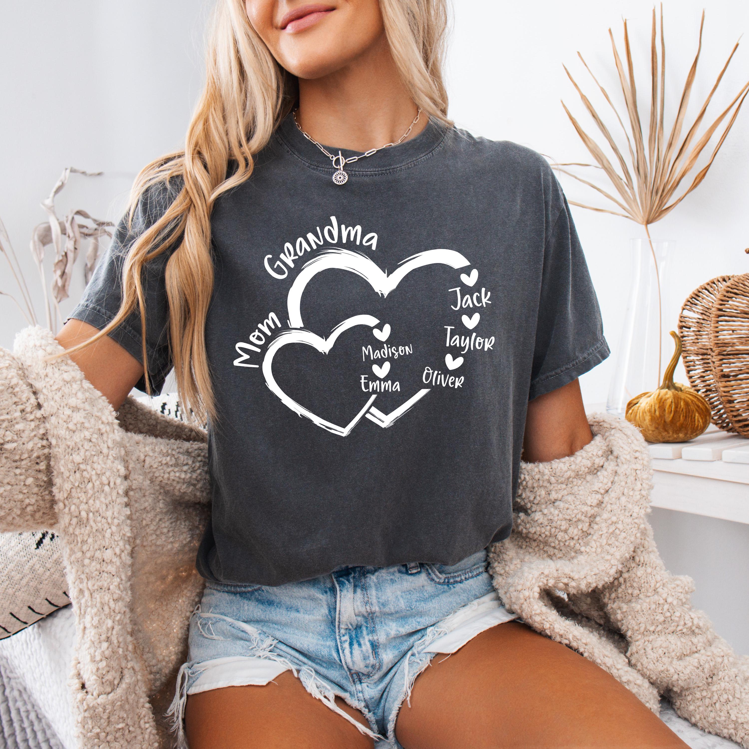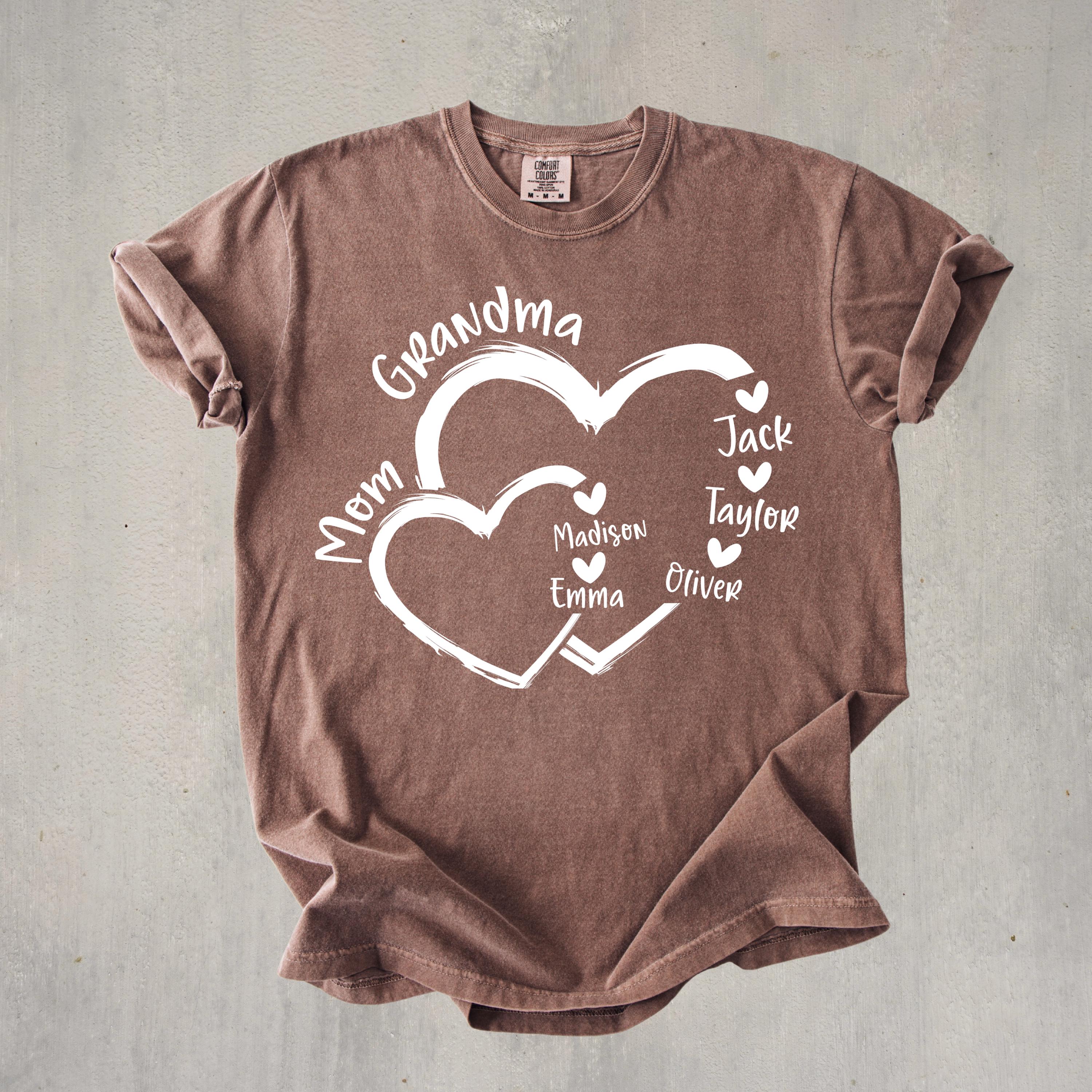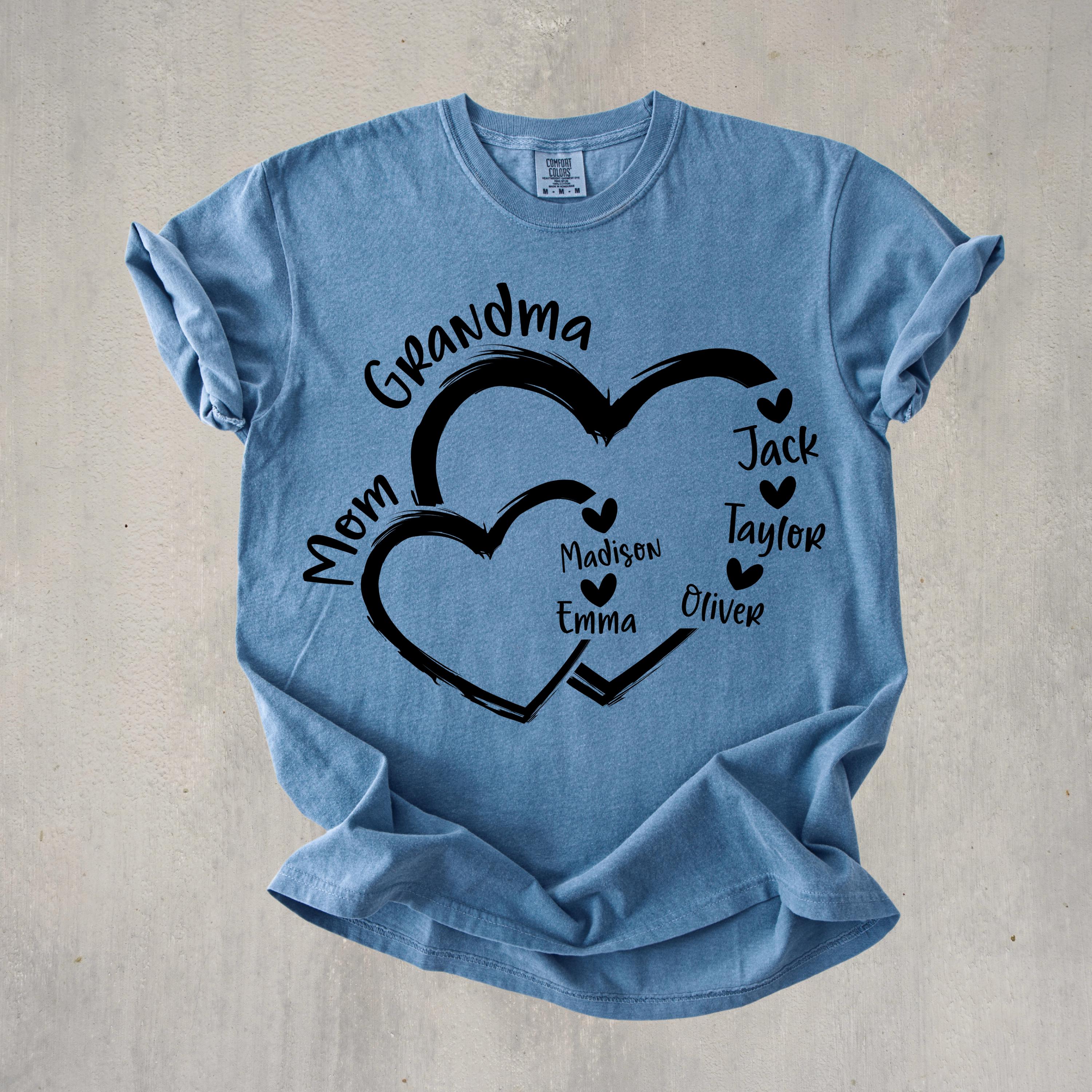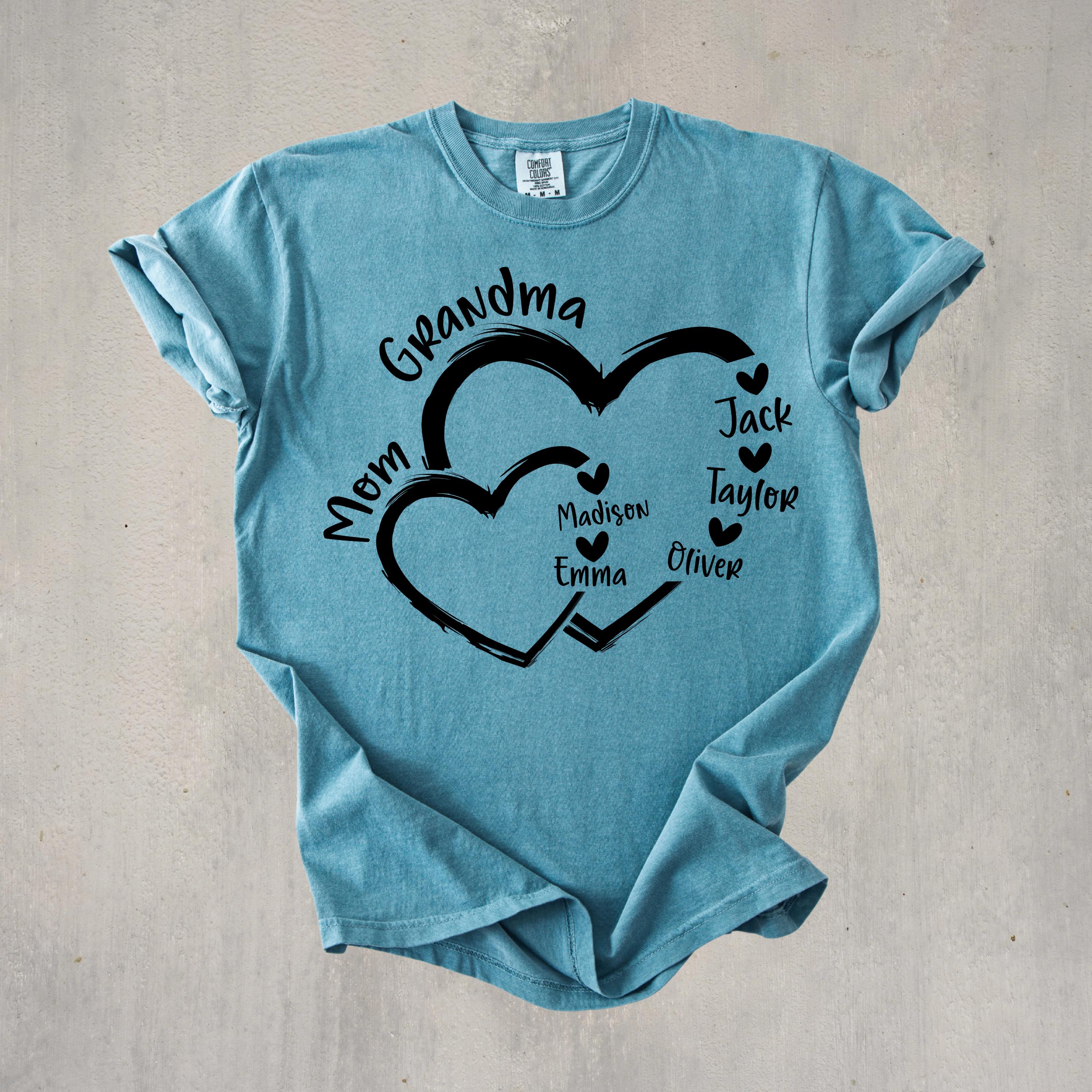 Celebrate the love between mom and grandma with this personalized heart design t-shirt, featuring custom names inside a beautiful layered heart illustration. A meaningful and stylish gift, perfect for Mother’s Day, birthdays, or everyday wear for moms and grandmas.