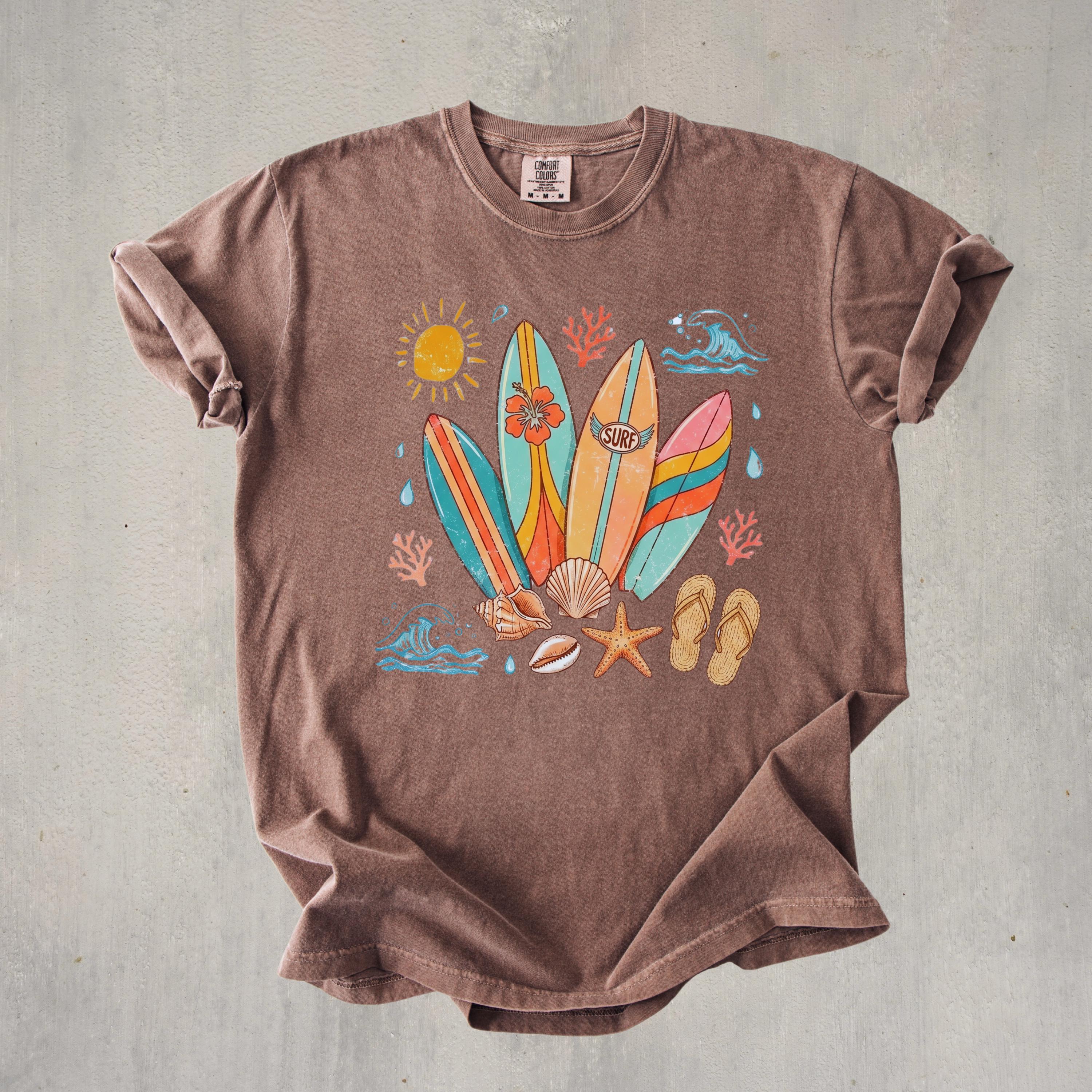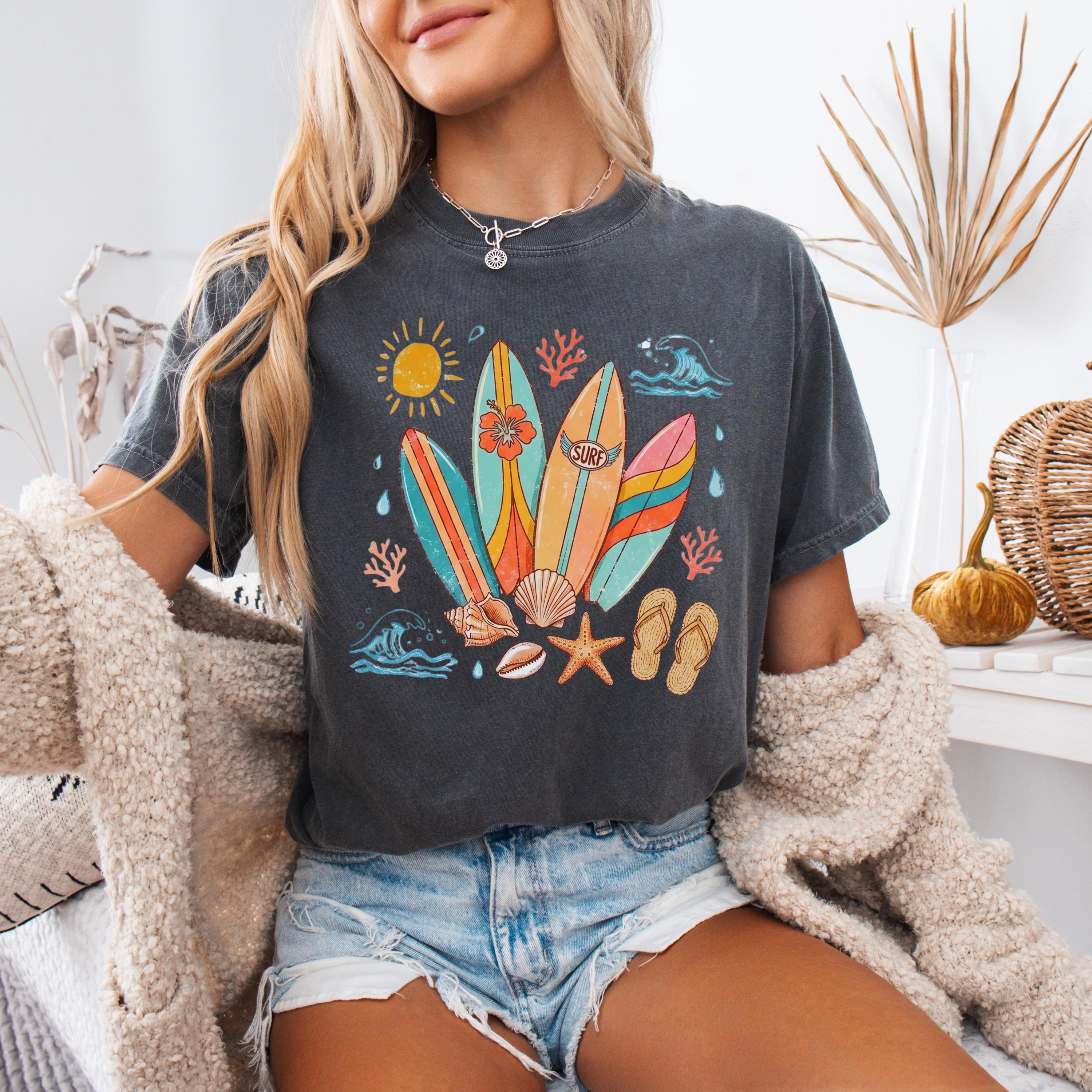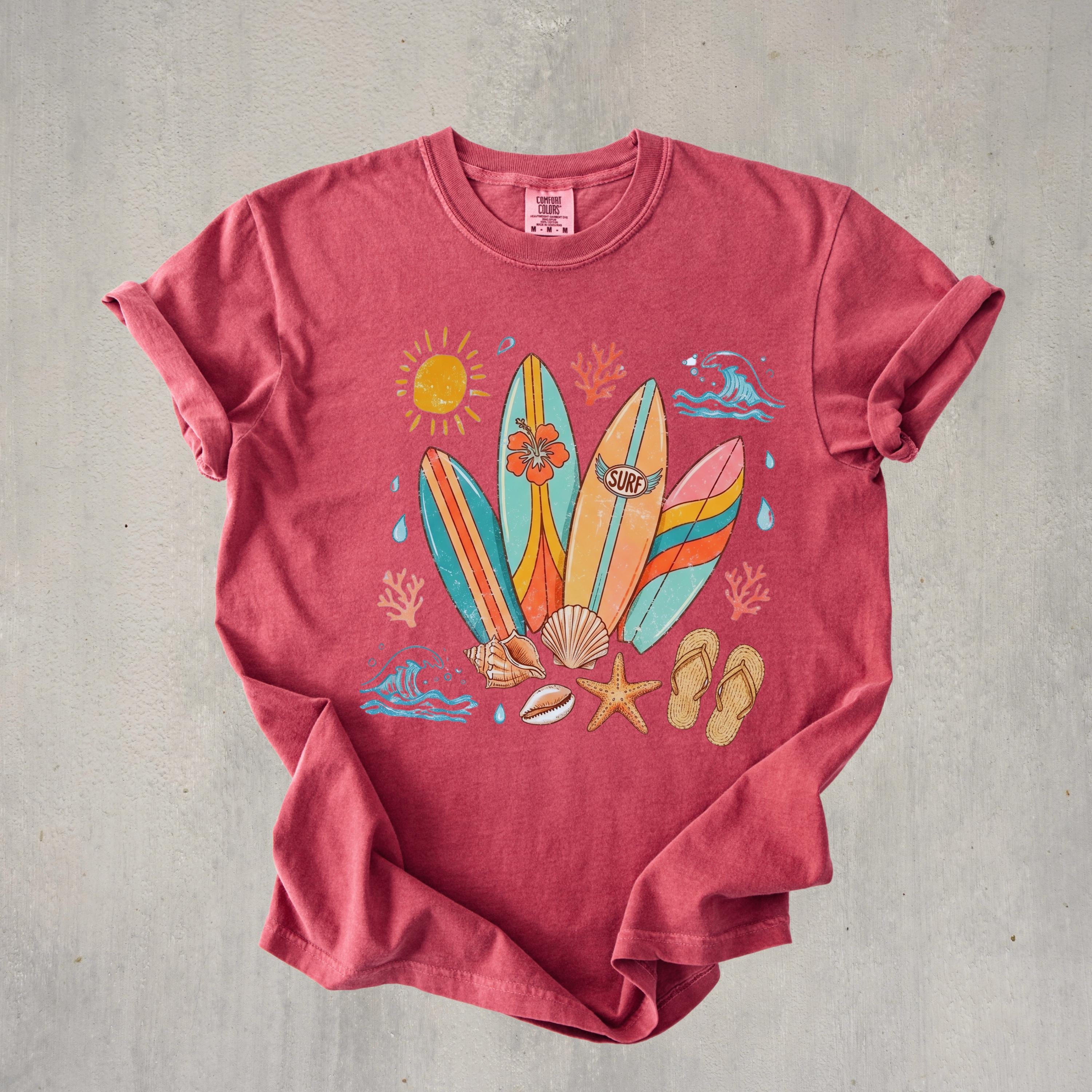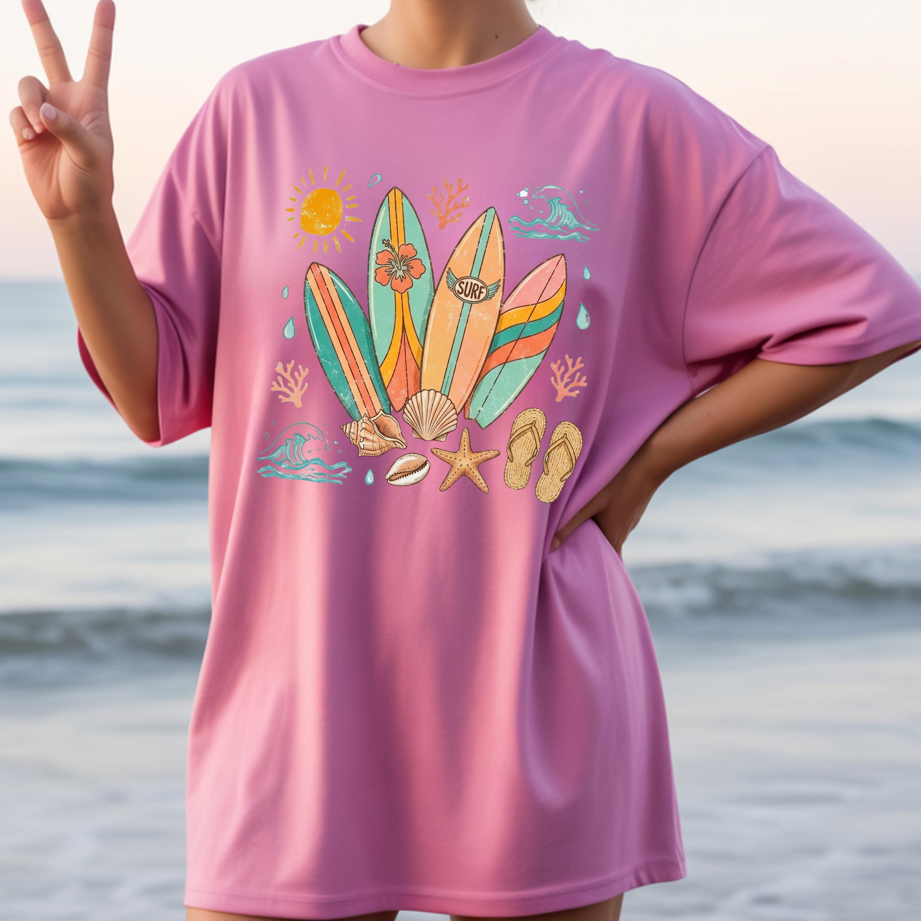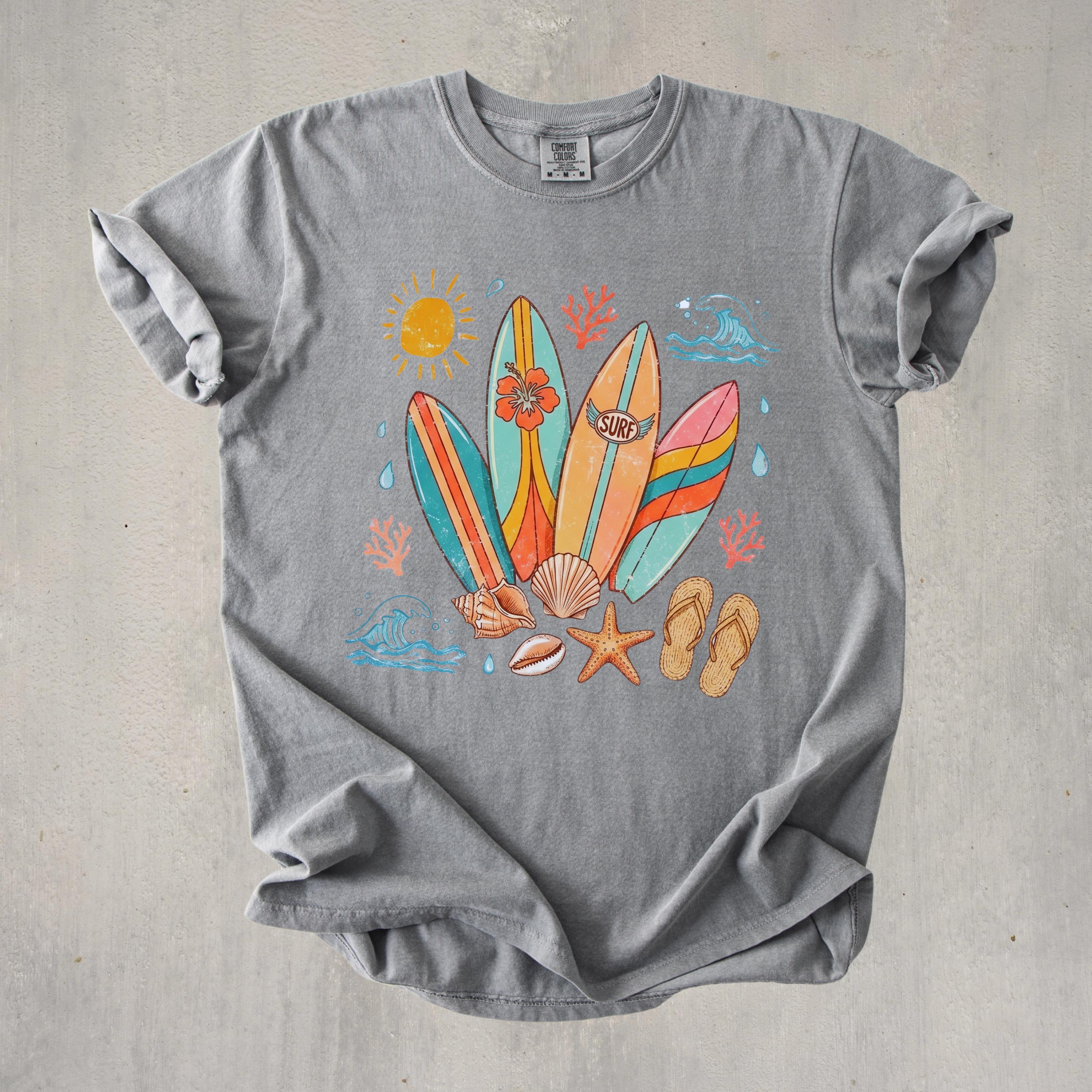 Bring sunny beach vibes everywhere you go with this colorful surfboard graphic t-shirt, featuring retro-inspired boards, seashells, waves, and summer details. Perfect for beach lovers, surfers, vacation outfits, and anyone who loves a fun coastal aesthetic with a relaxed summer feel.π This shirt is made using Comfort Colors premium garments: β’ 1717 short sleeve β soft, garment-dyed cotton with a relaxed unisex fit and vintage look β’ 6014 long sleeve β heavyweight fabric with ribbed cuffs for a cozy feel and classic style