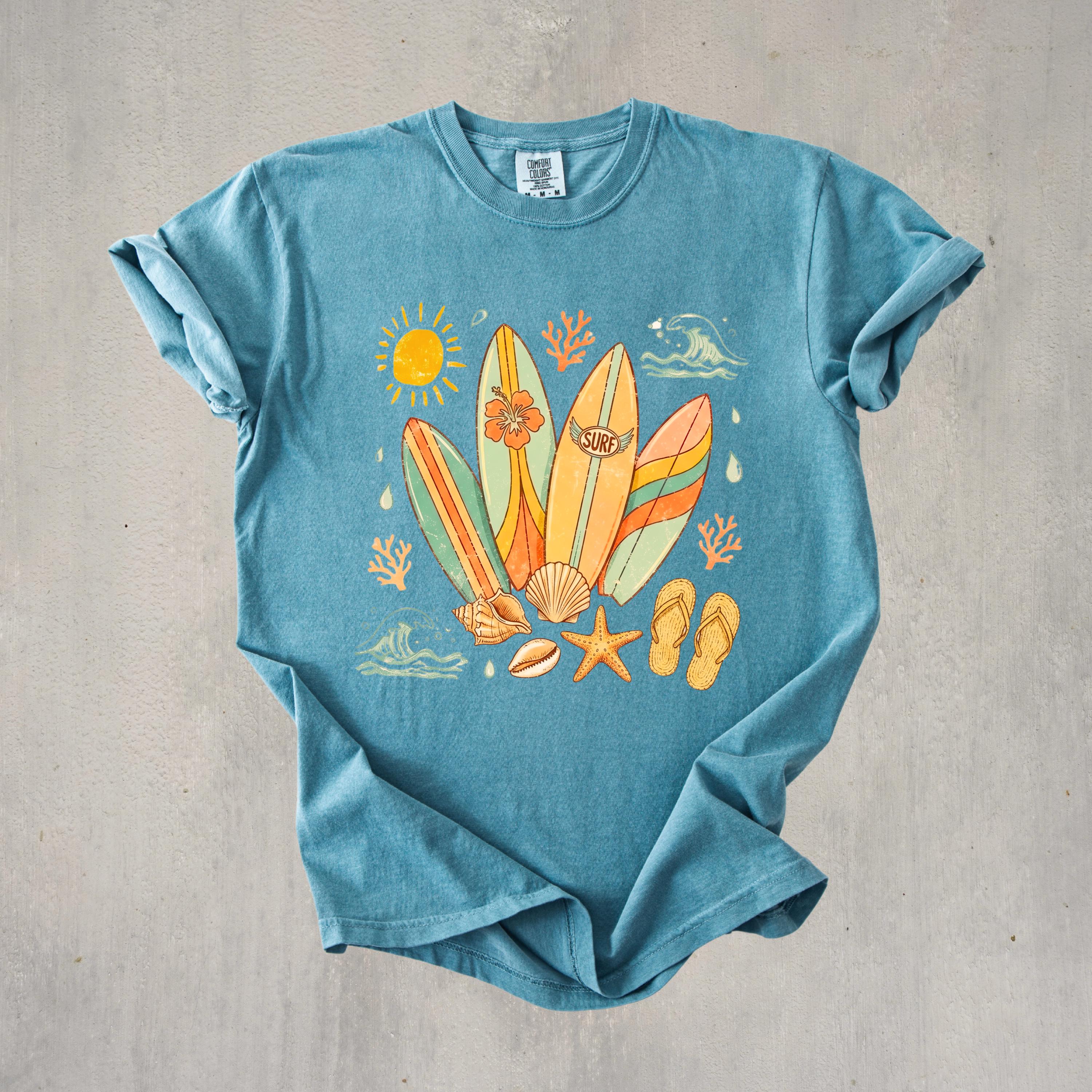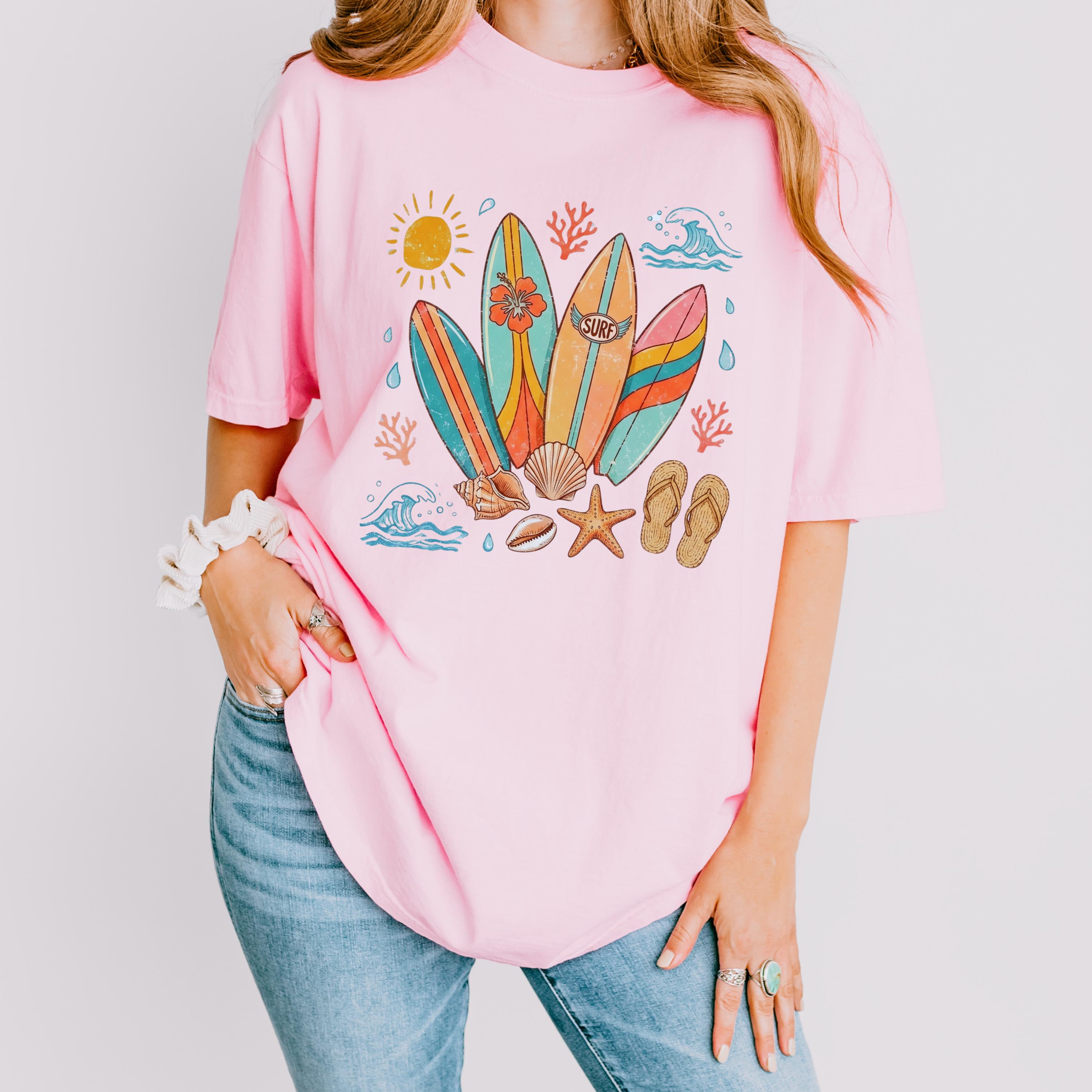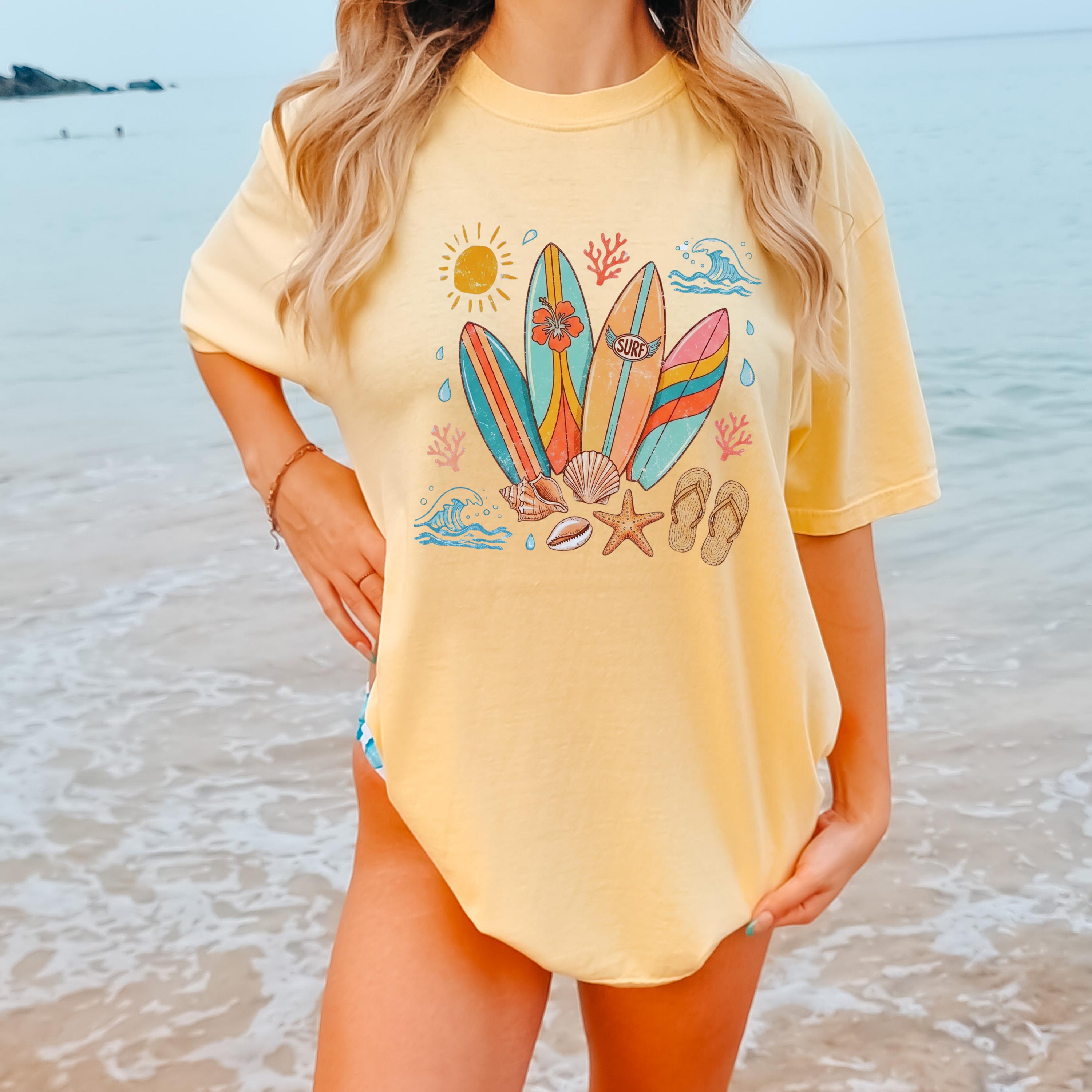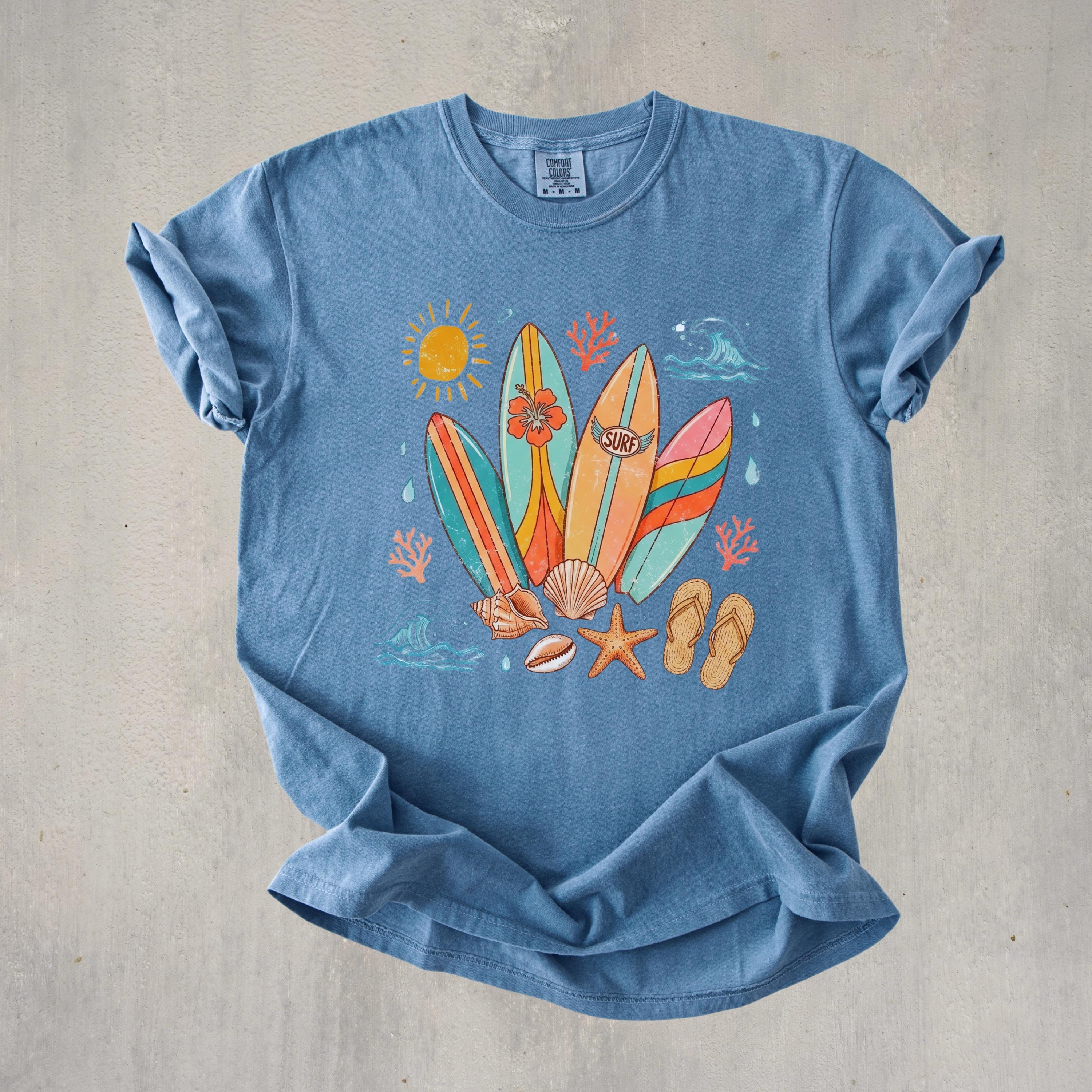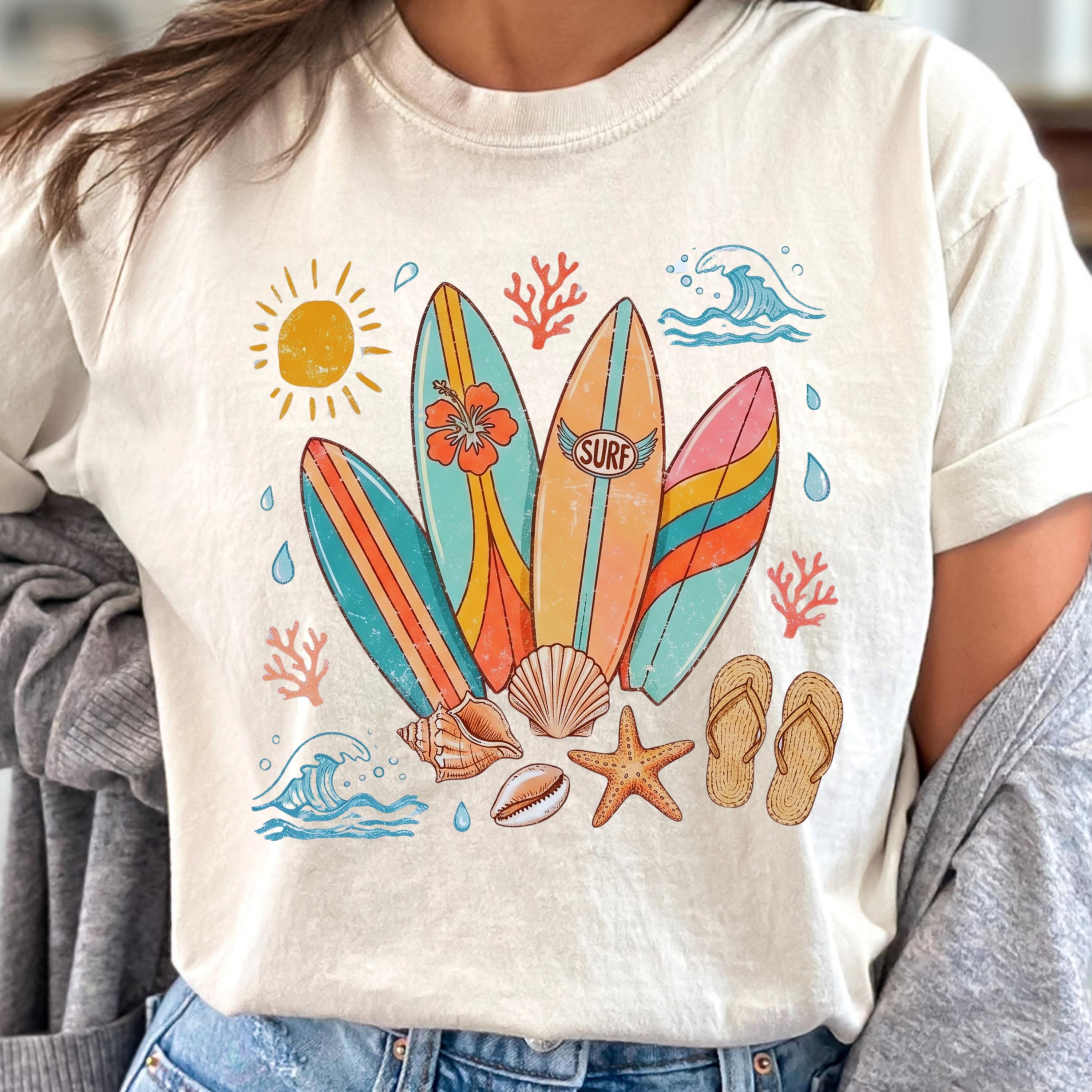 Bring sunny beach vibes everywhere you go with this colorful surfboard graphic t-shirt, featuring retro-inspired boards, seashells, waves, and summer details. Perfect for beach lovers, surfers, vacation outfits, and anyone who loves a fun coastal aesthetic with a relaxed summer feel.π This shirt is made using Comfort Colors premium garments: β’ 1717 short sleeve β soft, garment-dyed cotton with a relaxed unisex fit and vintage look β’ 6014 long sleeve β heavyweight fabric with ribbed cuffs for a cozy feel and classic style