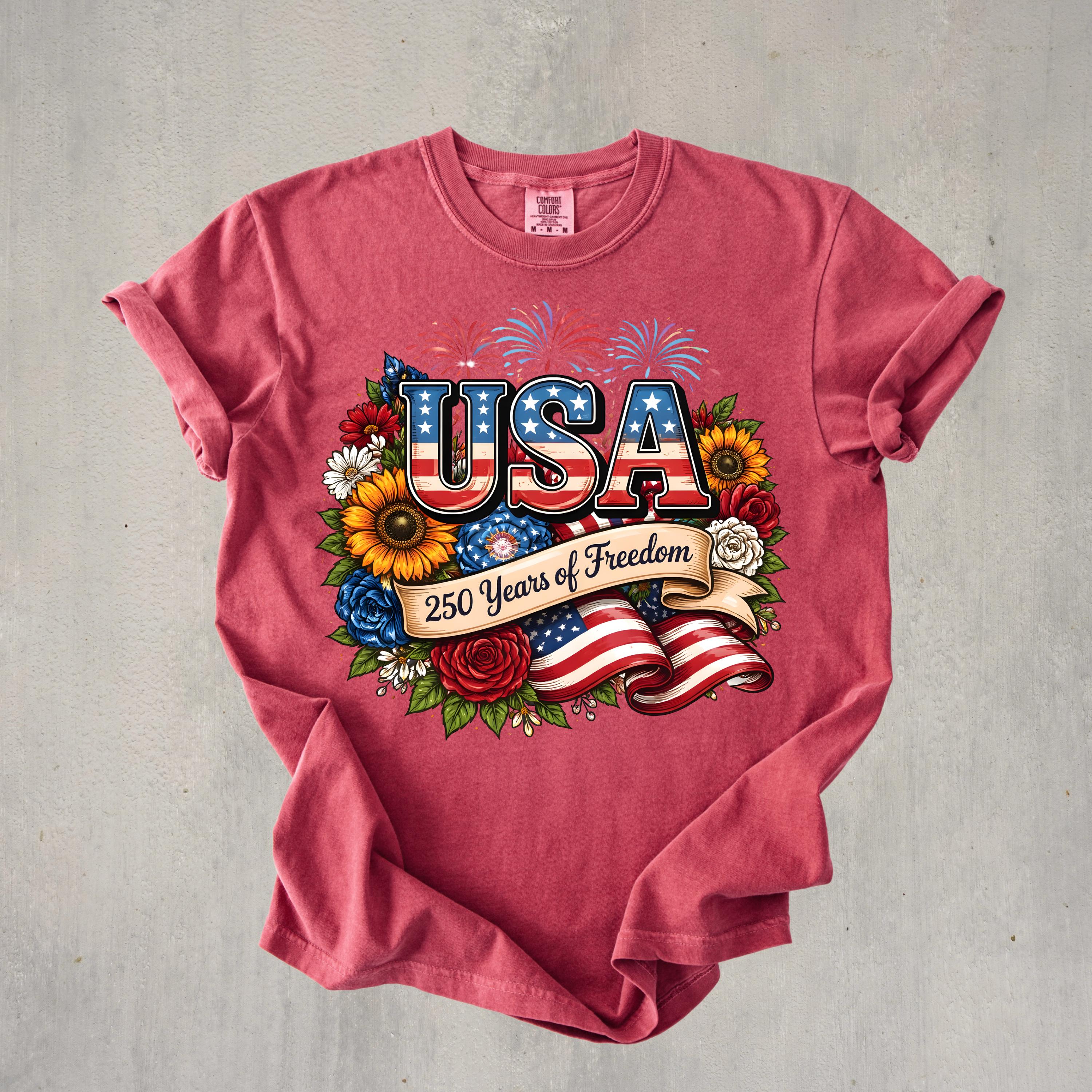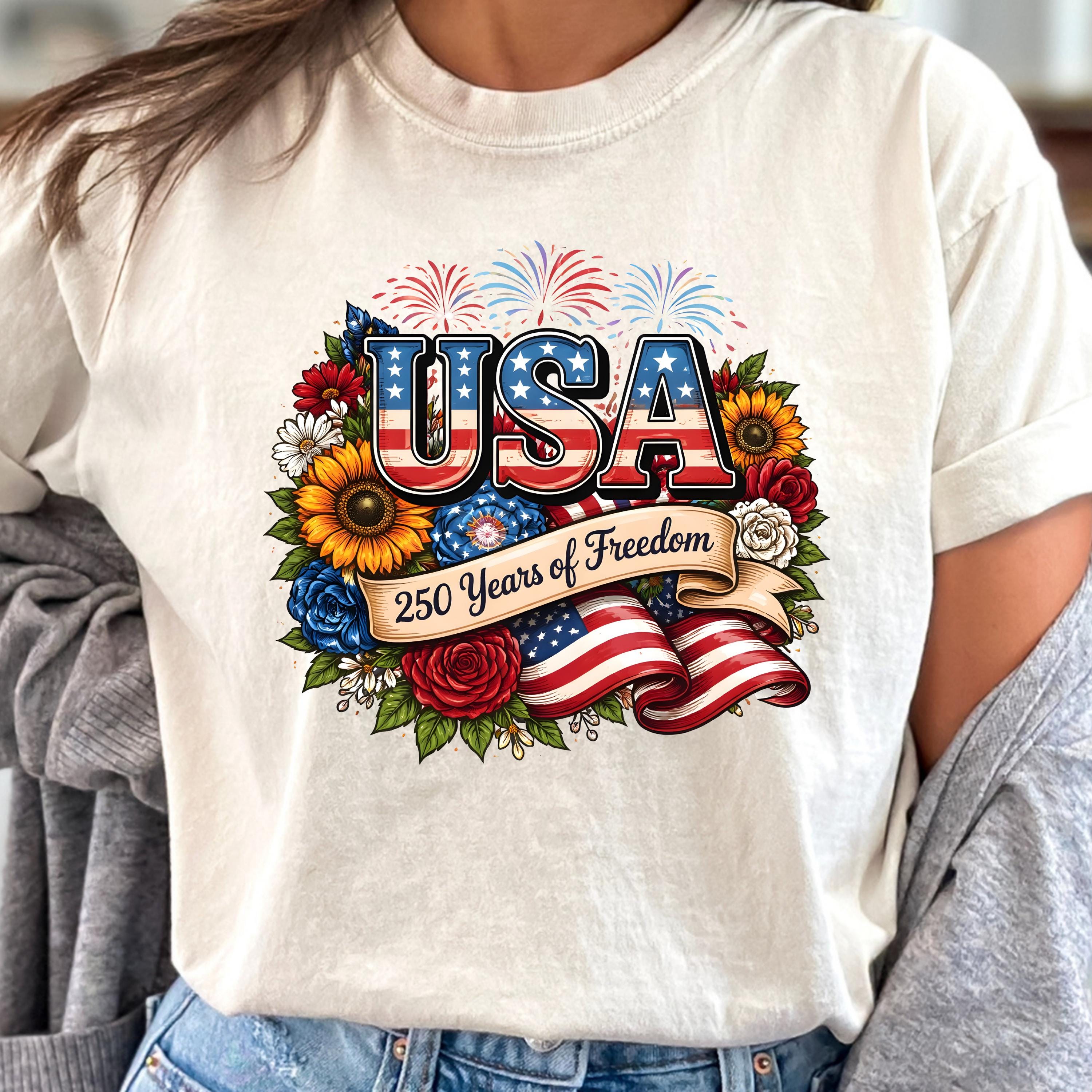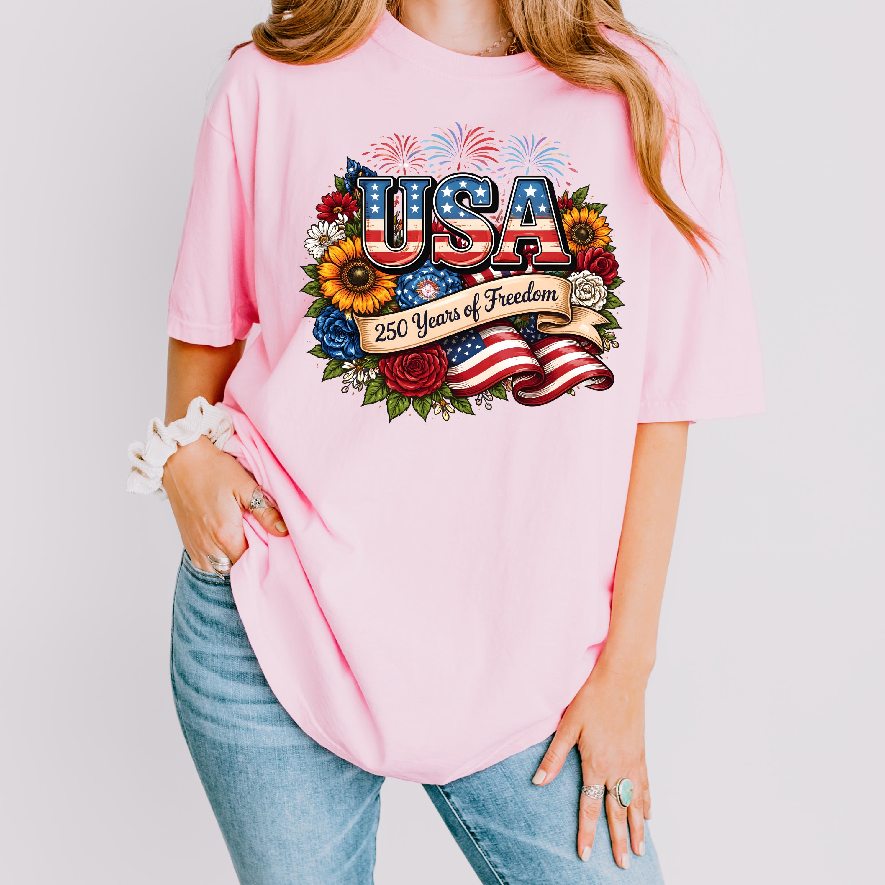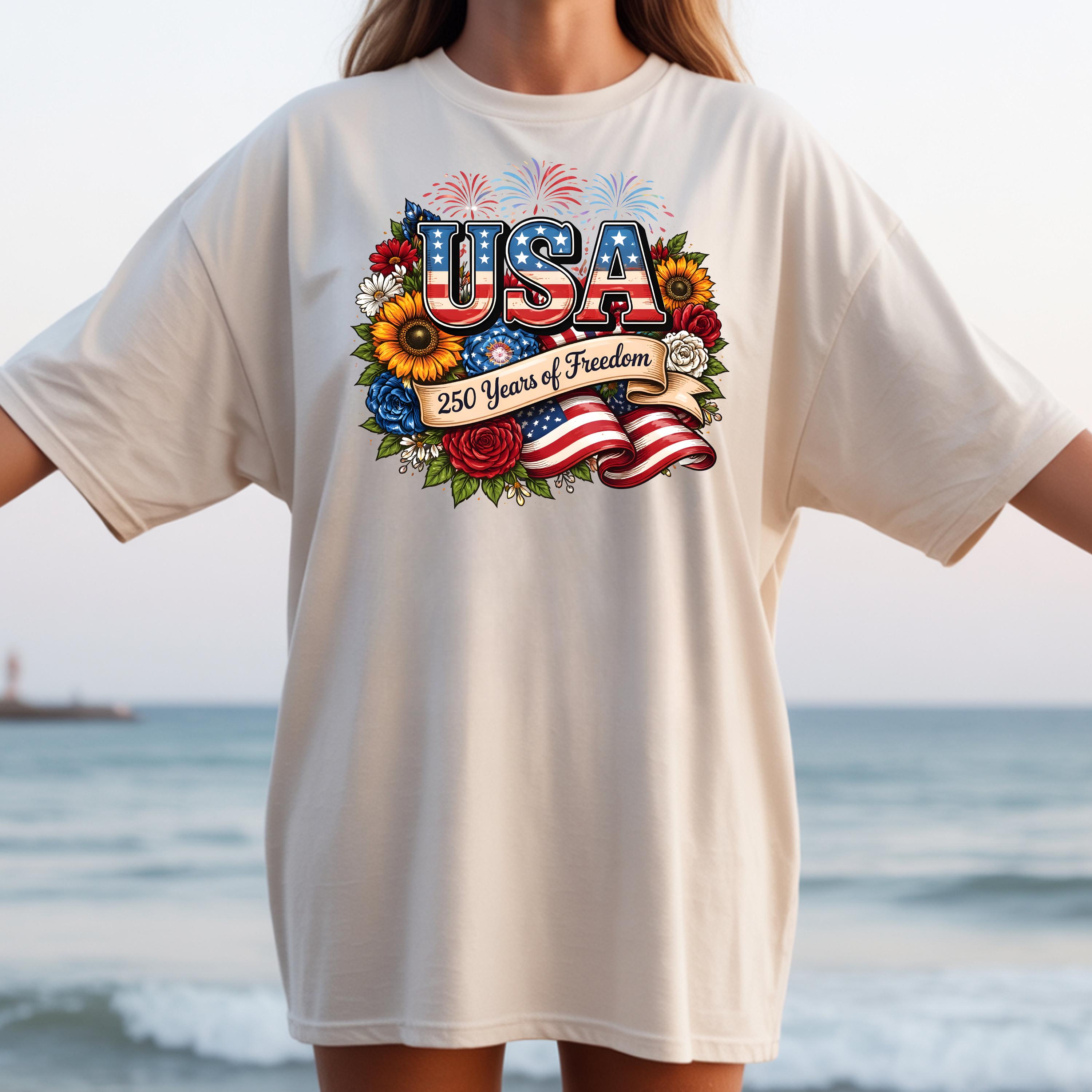 Celebrate freedom in style with this beautifully designed USA 250 Years of Freedom t-shirt. Featuring bold patriotic lettering, vibrant flowers, fireworks, and an American flag ribbon, this design blends elegance with strong American pride.