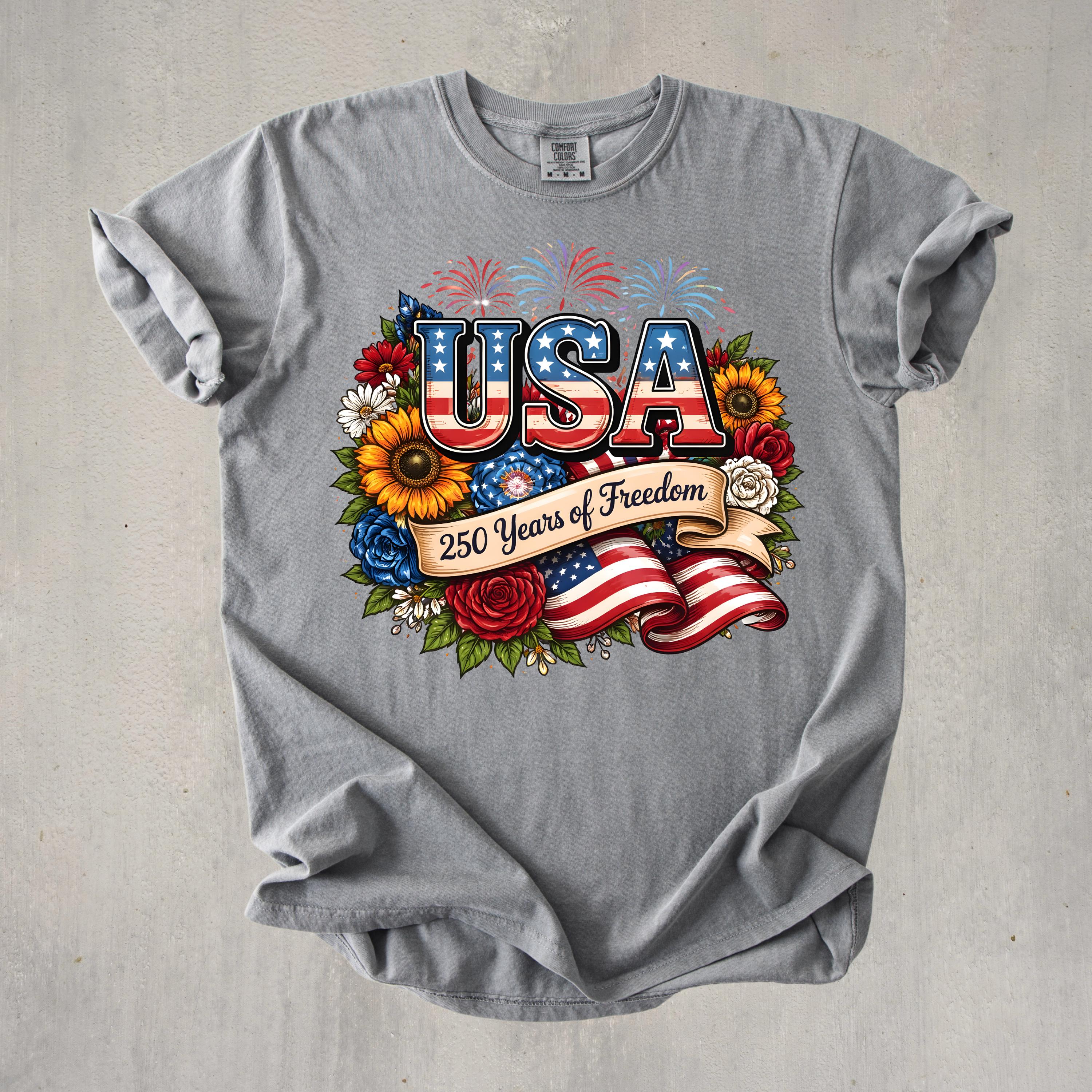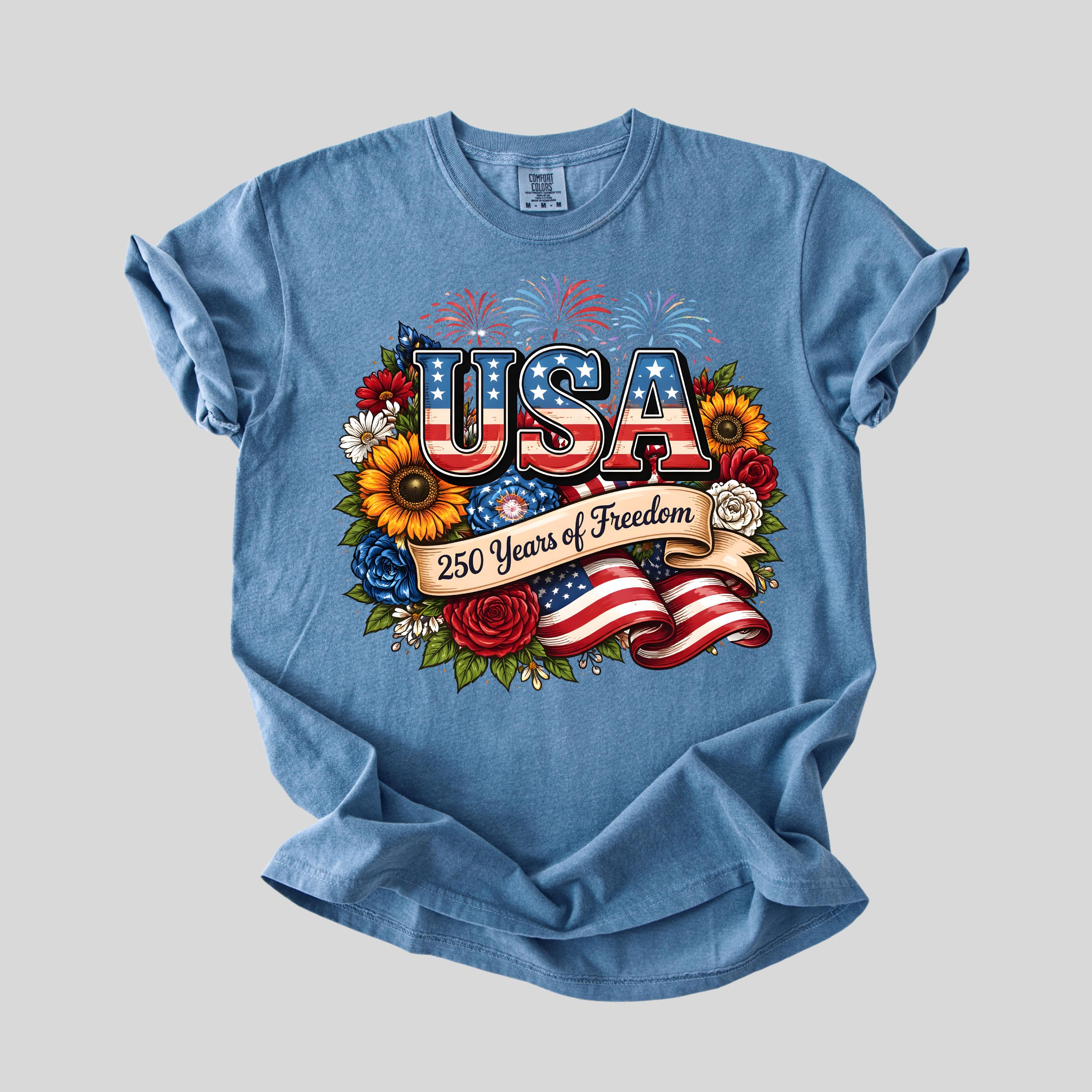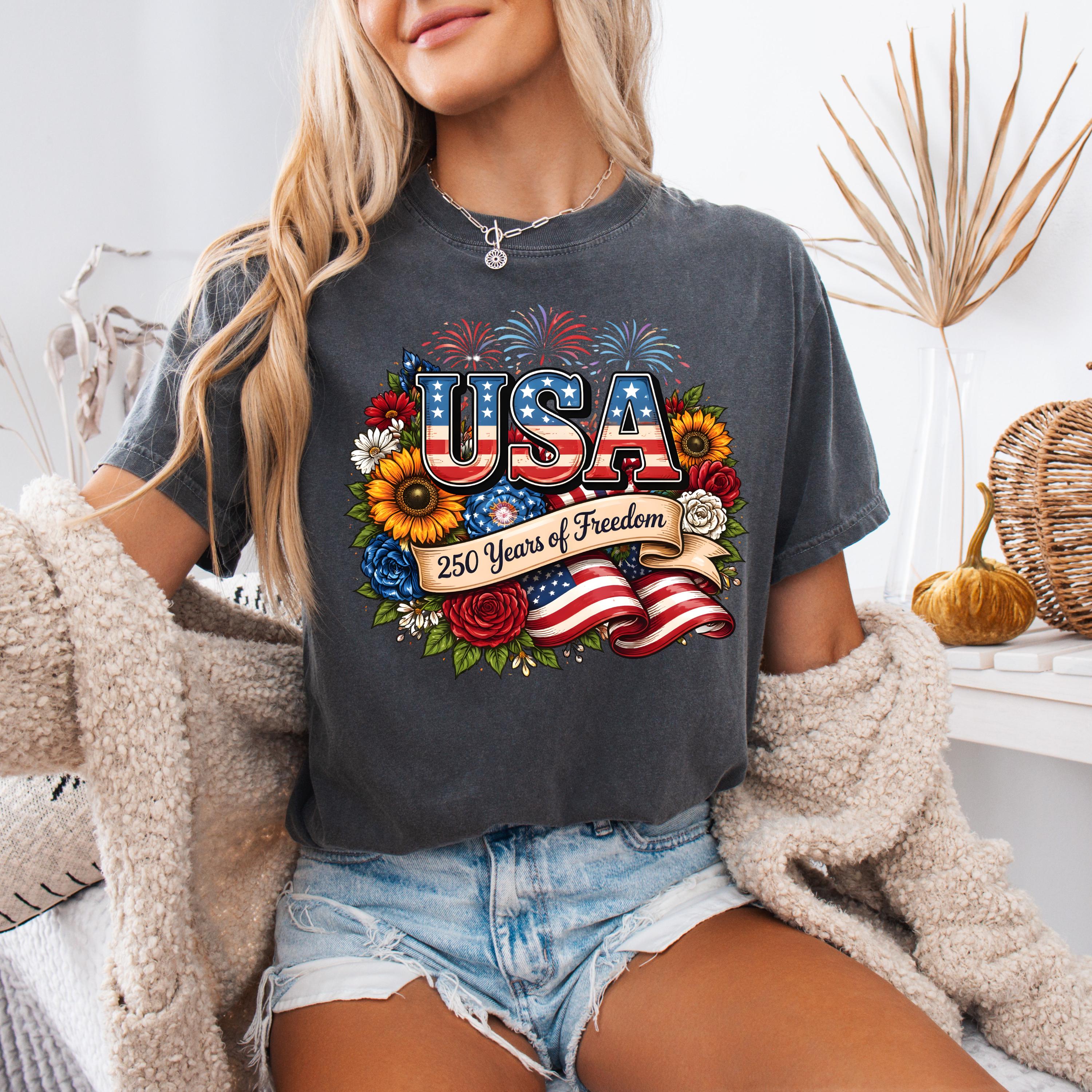 Celebrate freedom in style with this beautifully designed USA 250 Years of Freedom t-shirt. Featuring bold patriotic lettering, vibrant flowers, fireworks, and an American flag ribbon, this design blends elegance with strong American pride.