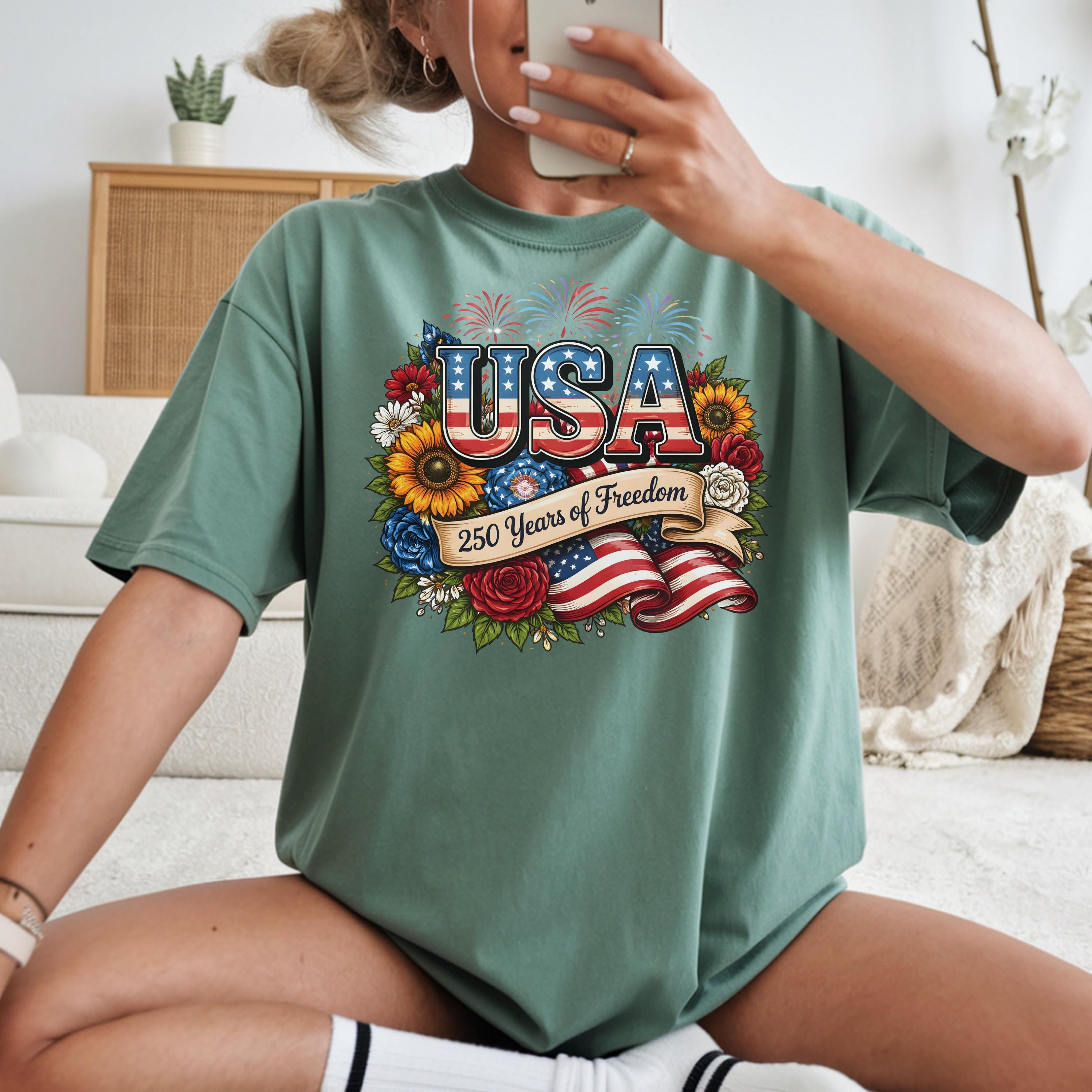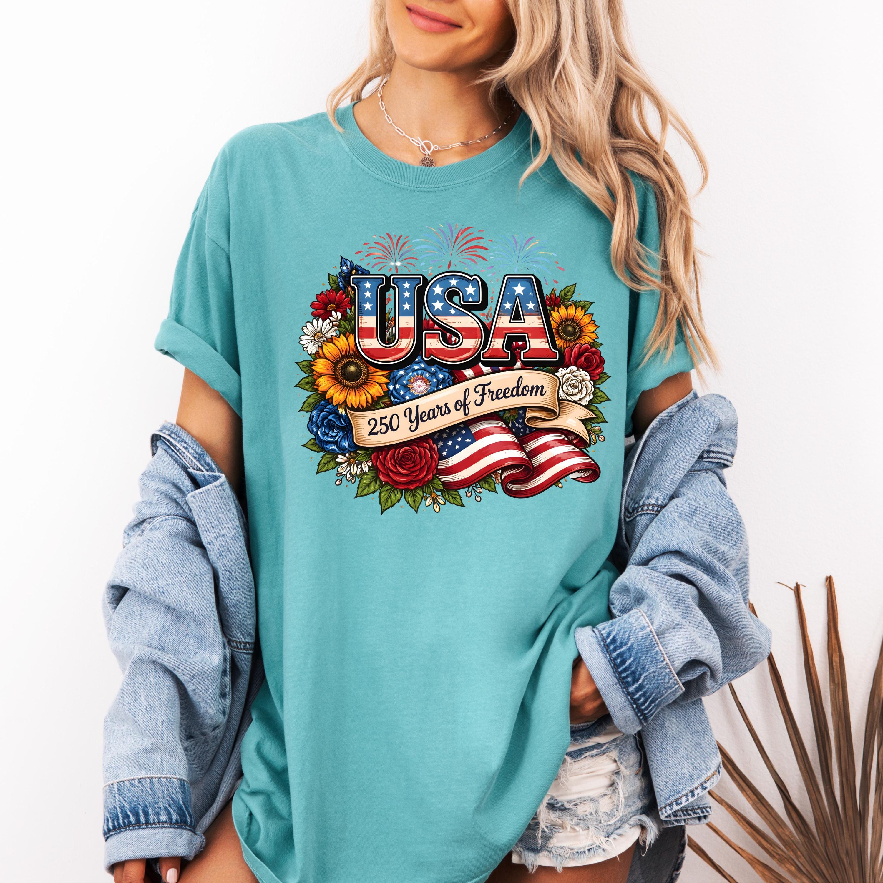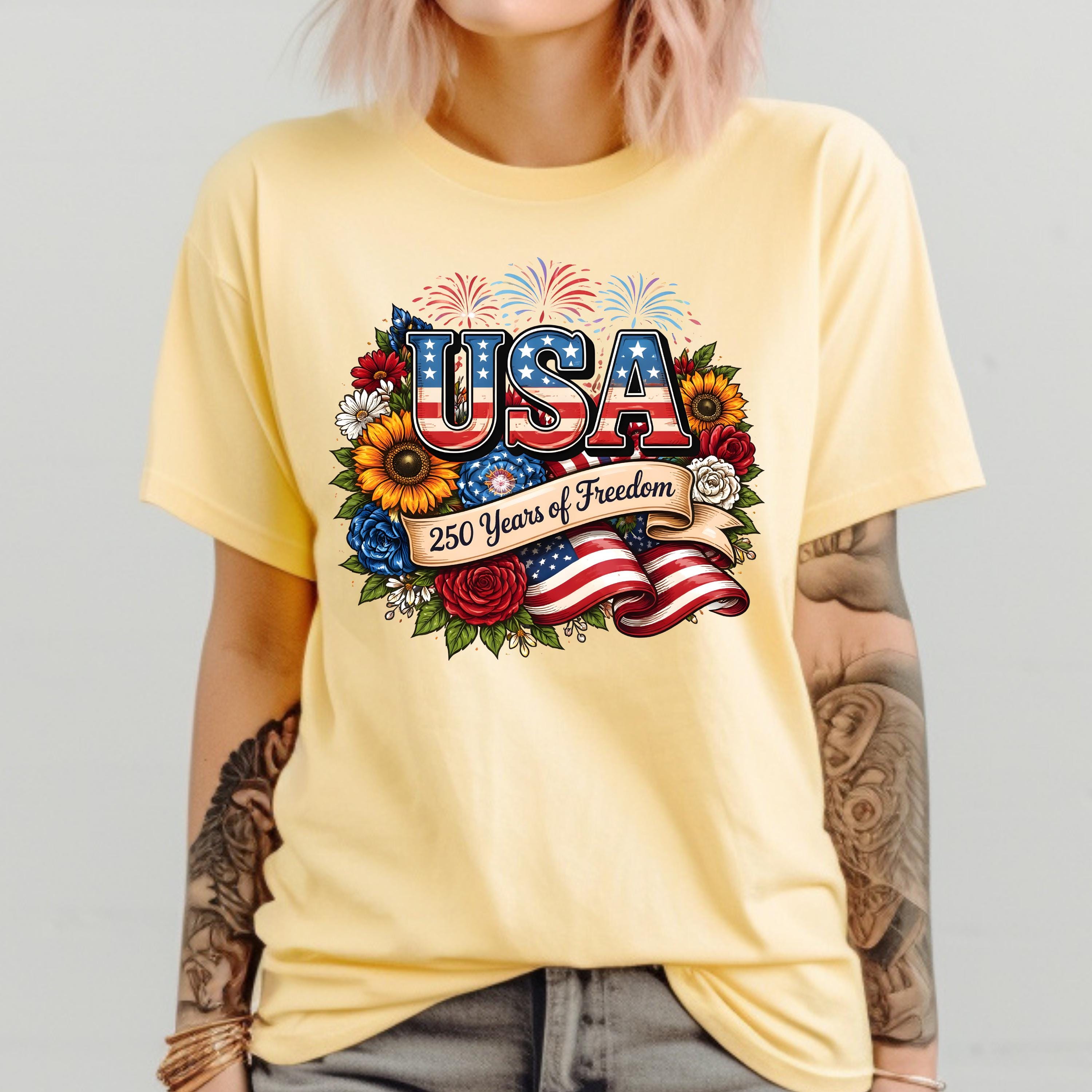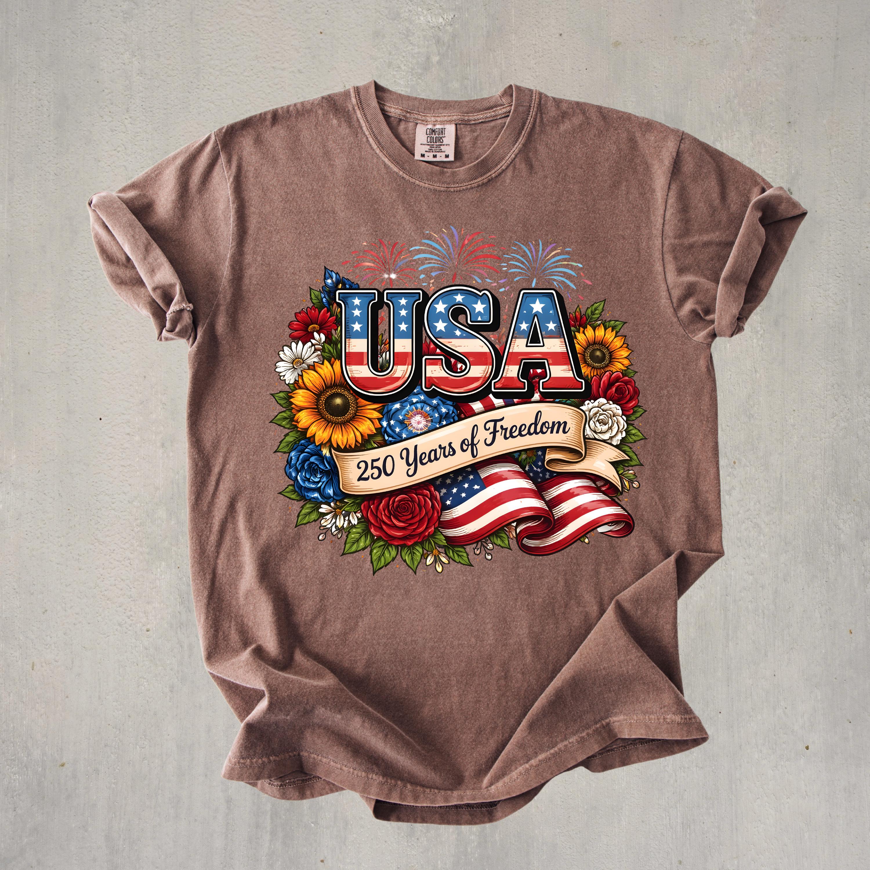 Celebrate freedom in style with this beautifully designed USA 250 Years of Freedom t-shirt. Featuring bold patriotic lettering, vibrant flowers, fireworks, and an American flag ribbon, this design blends elegance with strong American pride.