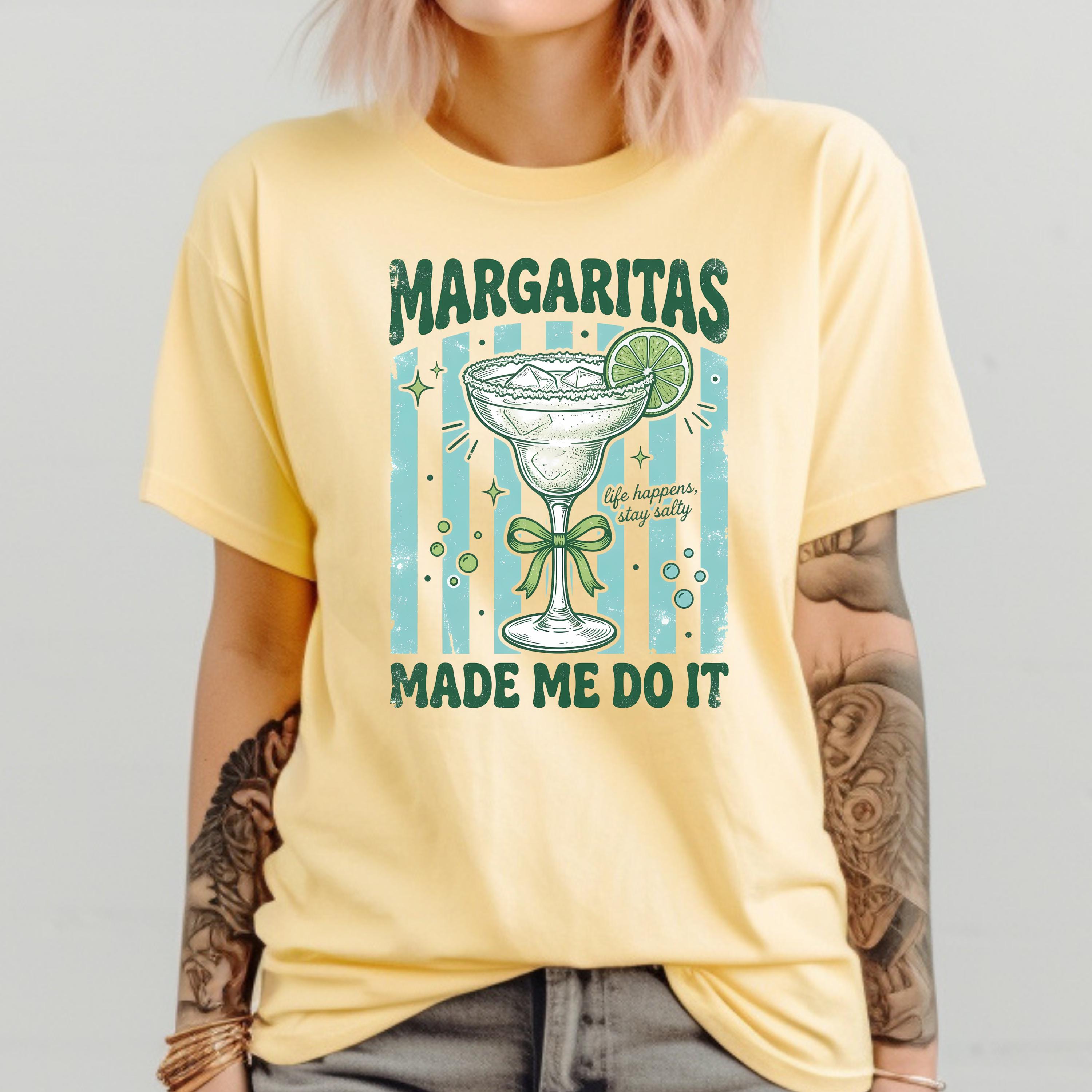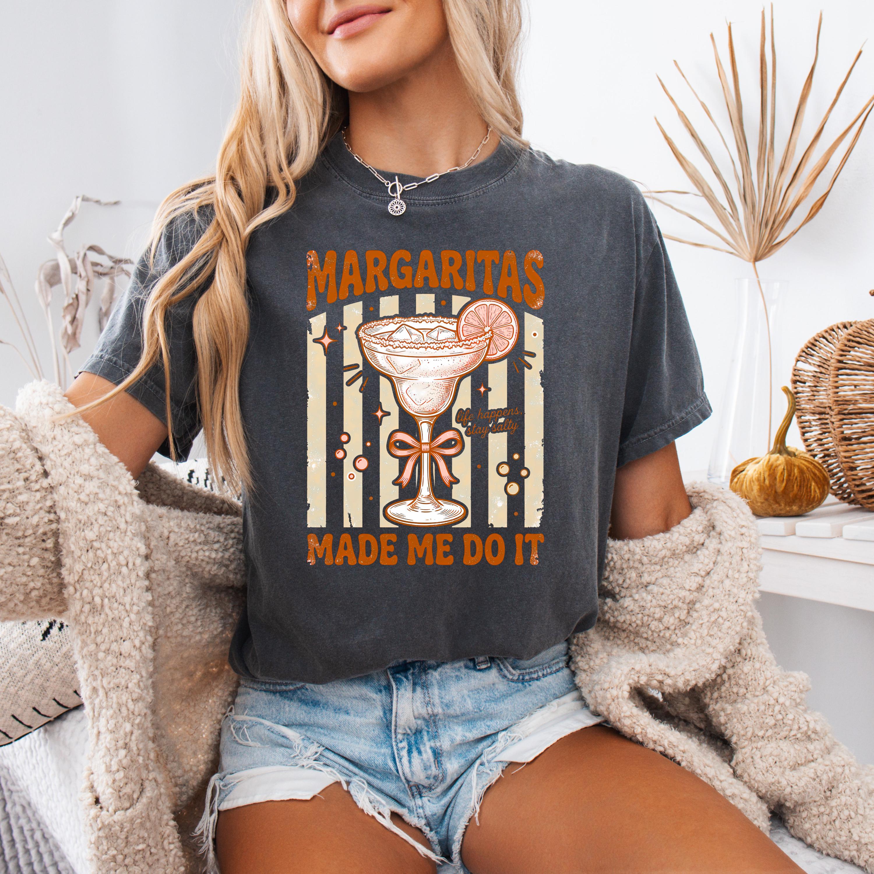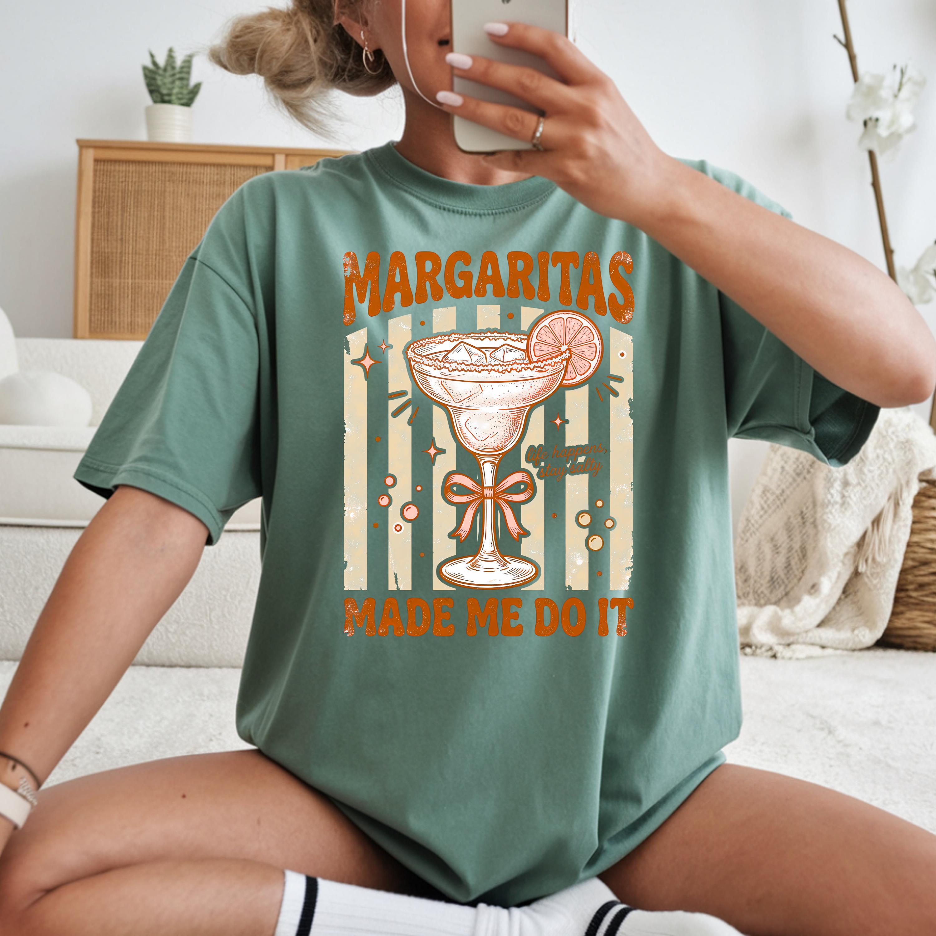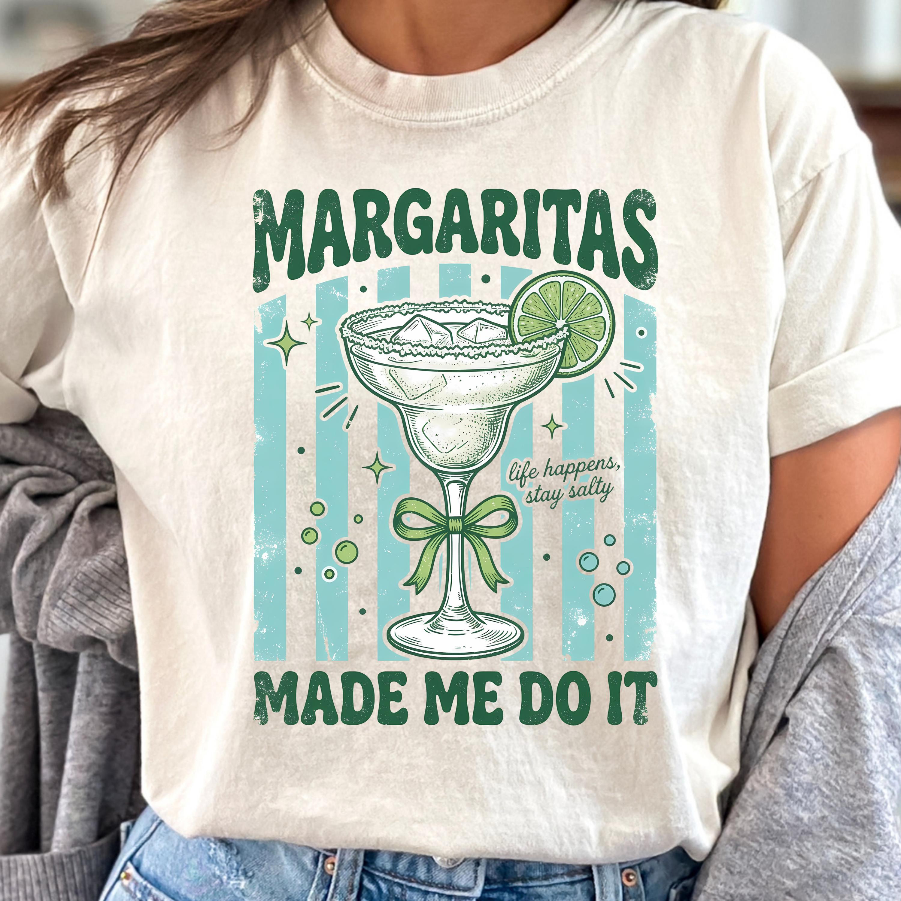 Add some fun and sass to your wardrobe with this “Margaritas Made Me Do It” t-shirt! Featuring a vintage-style margarita glass, lime detail, and playful typography, this design is perfect for anyone who loves good vibes and great drinks.