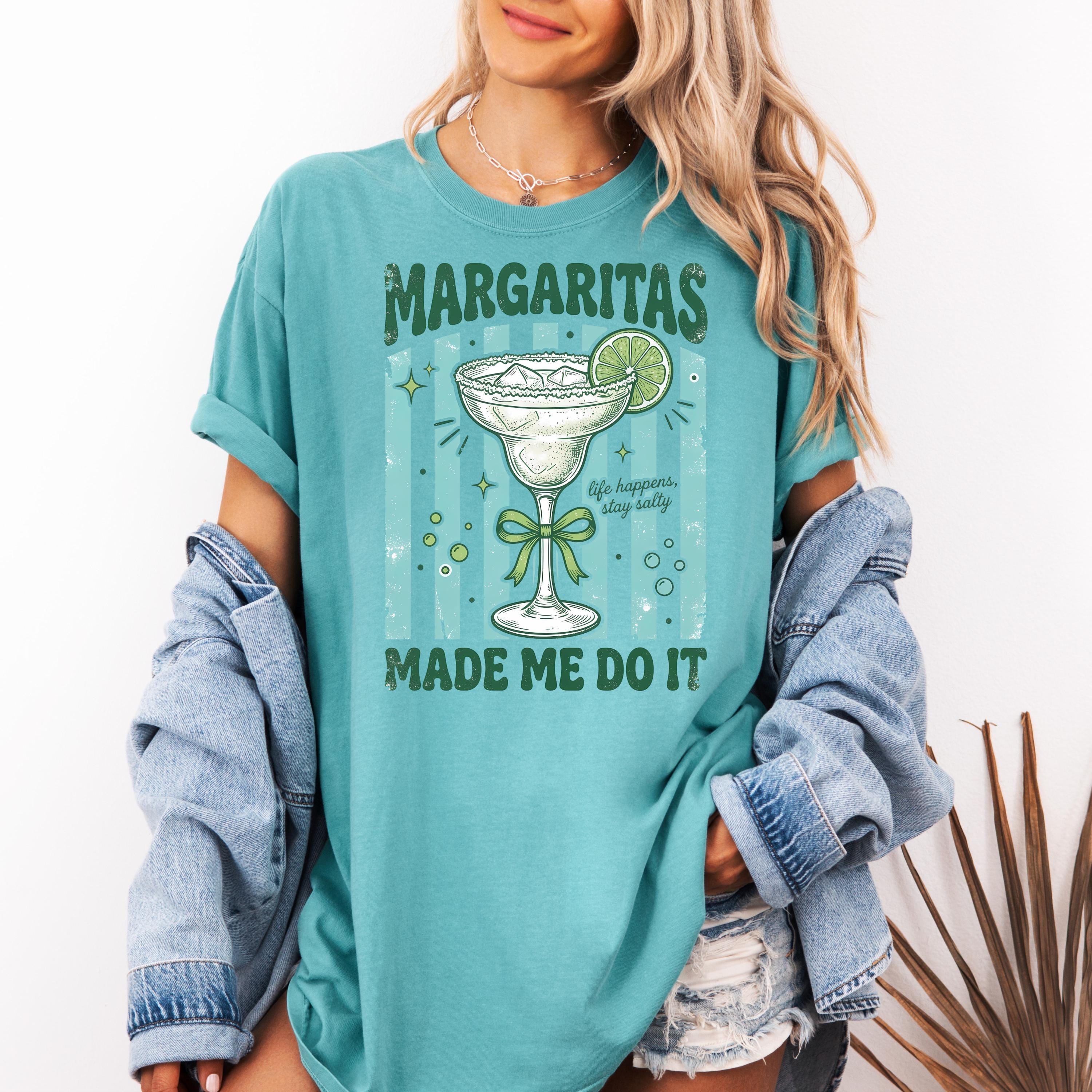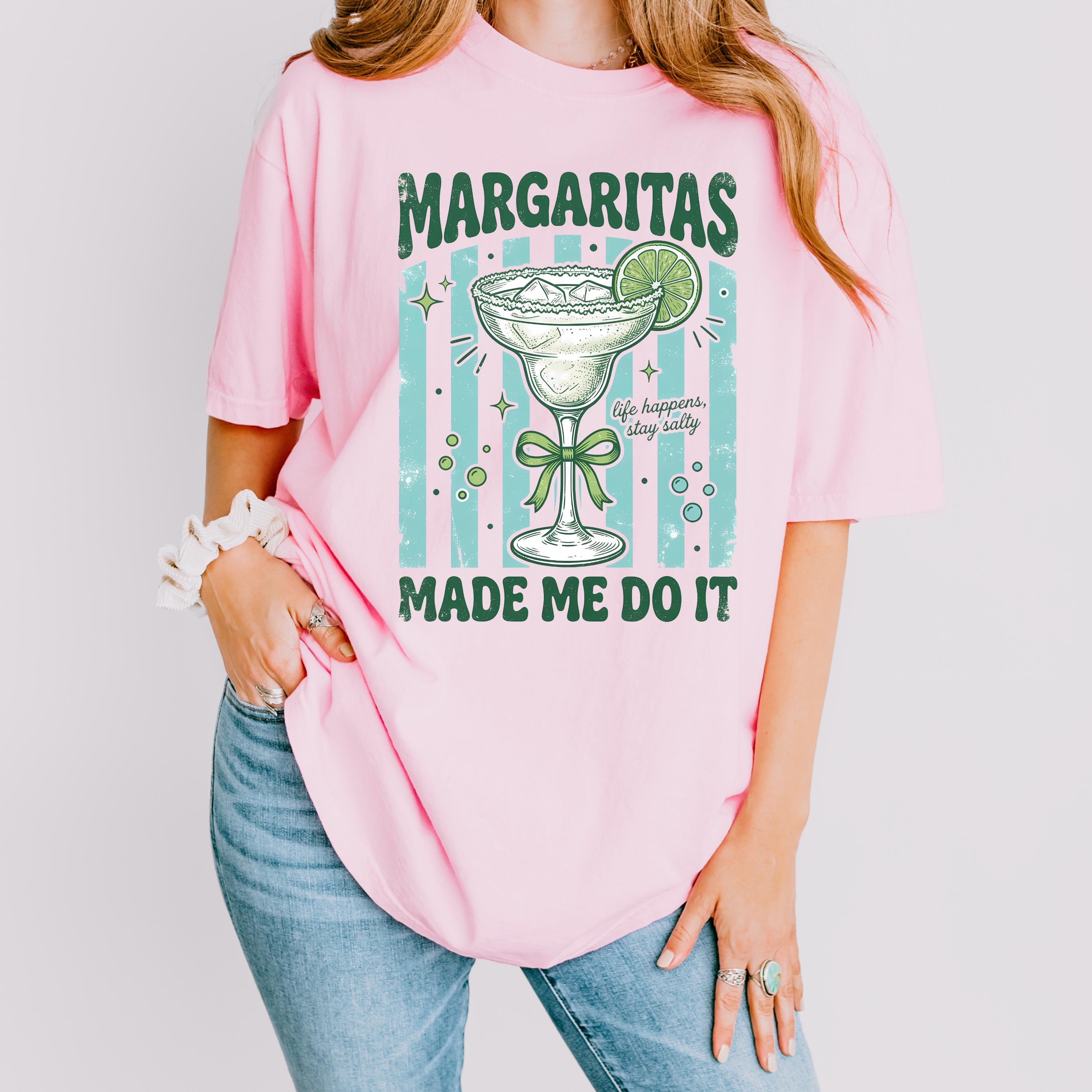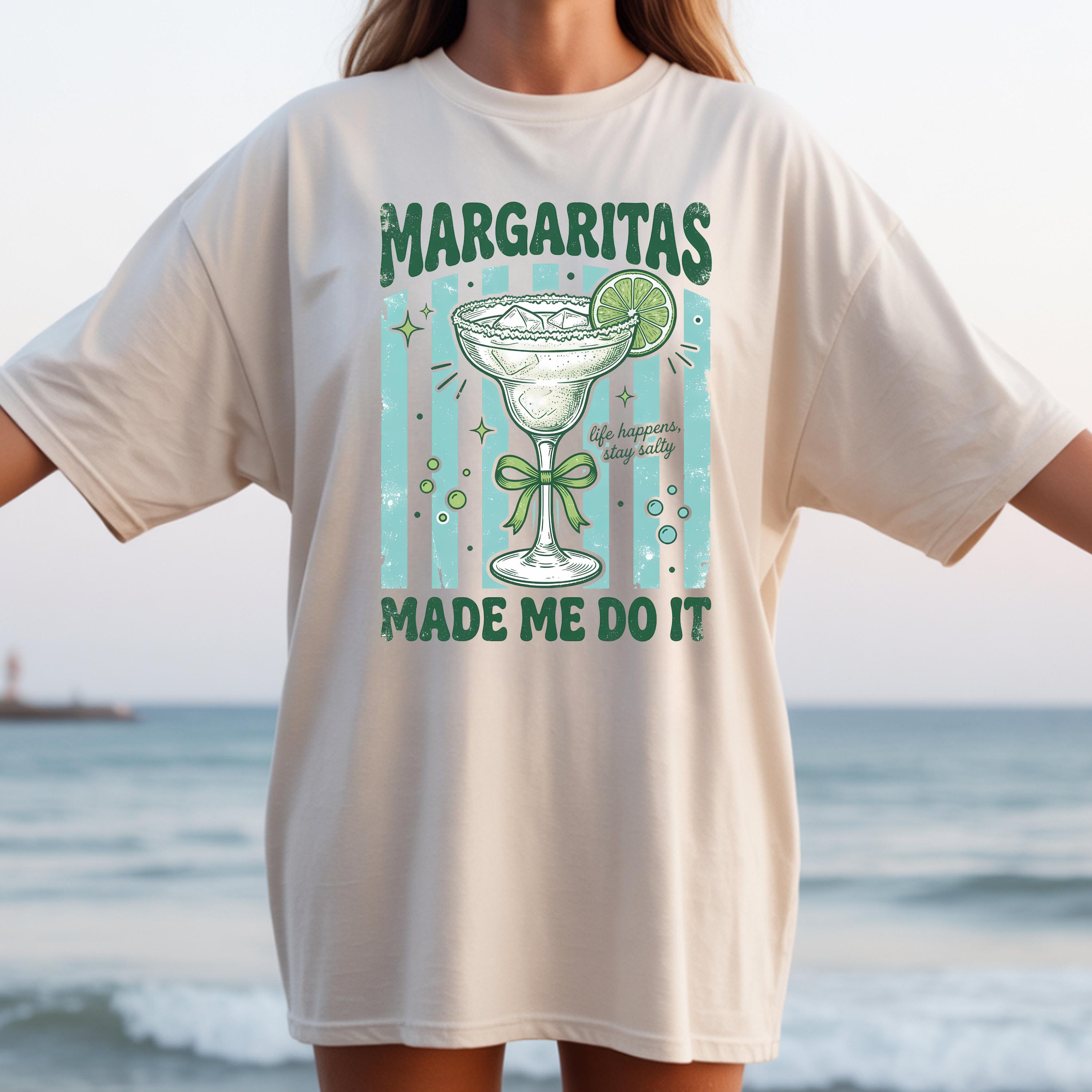 Add some fun and sass to your wardrobe with this “Margaritas Made Me Do It” t-shirt! Featuring a vintage-style margarita glass, lime detail, and playful typography, this design is perfect for anyone who loves good vibes and great drinks.