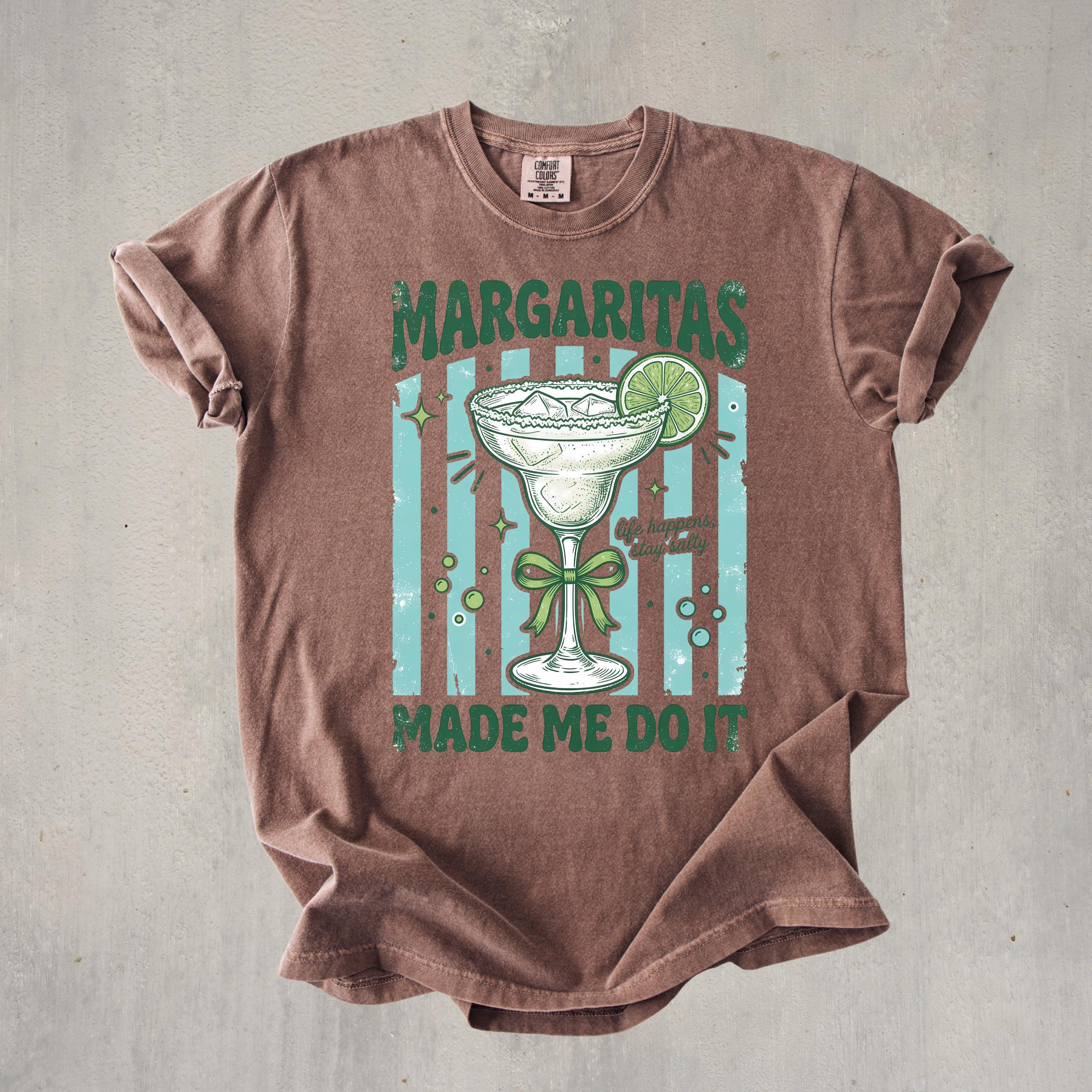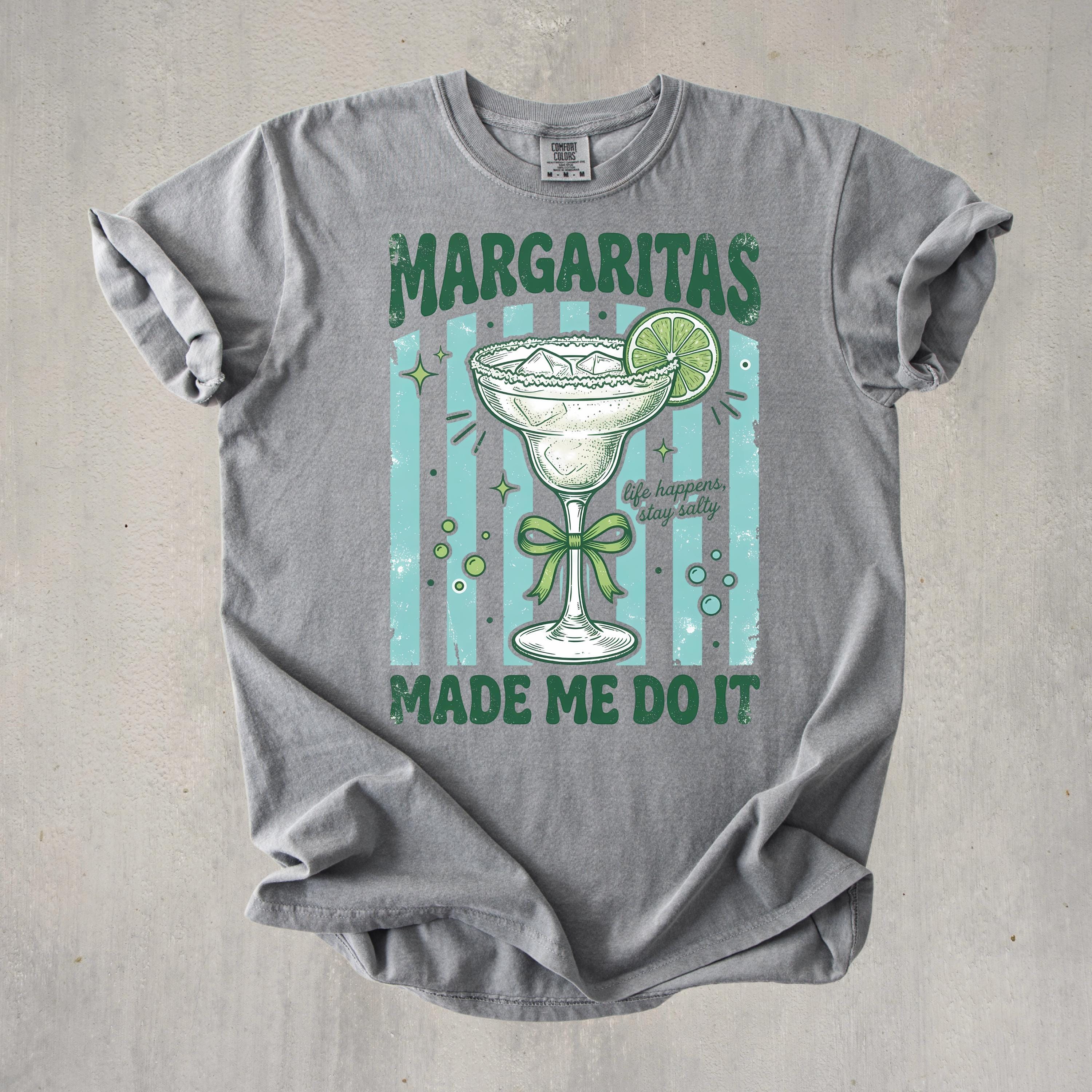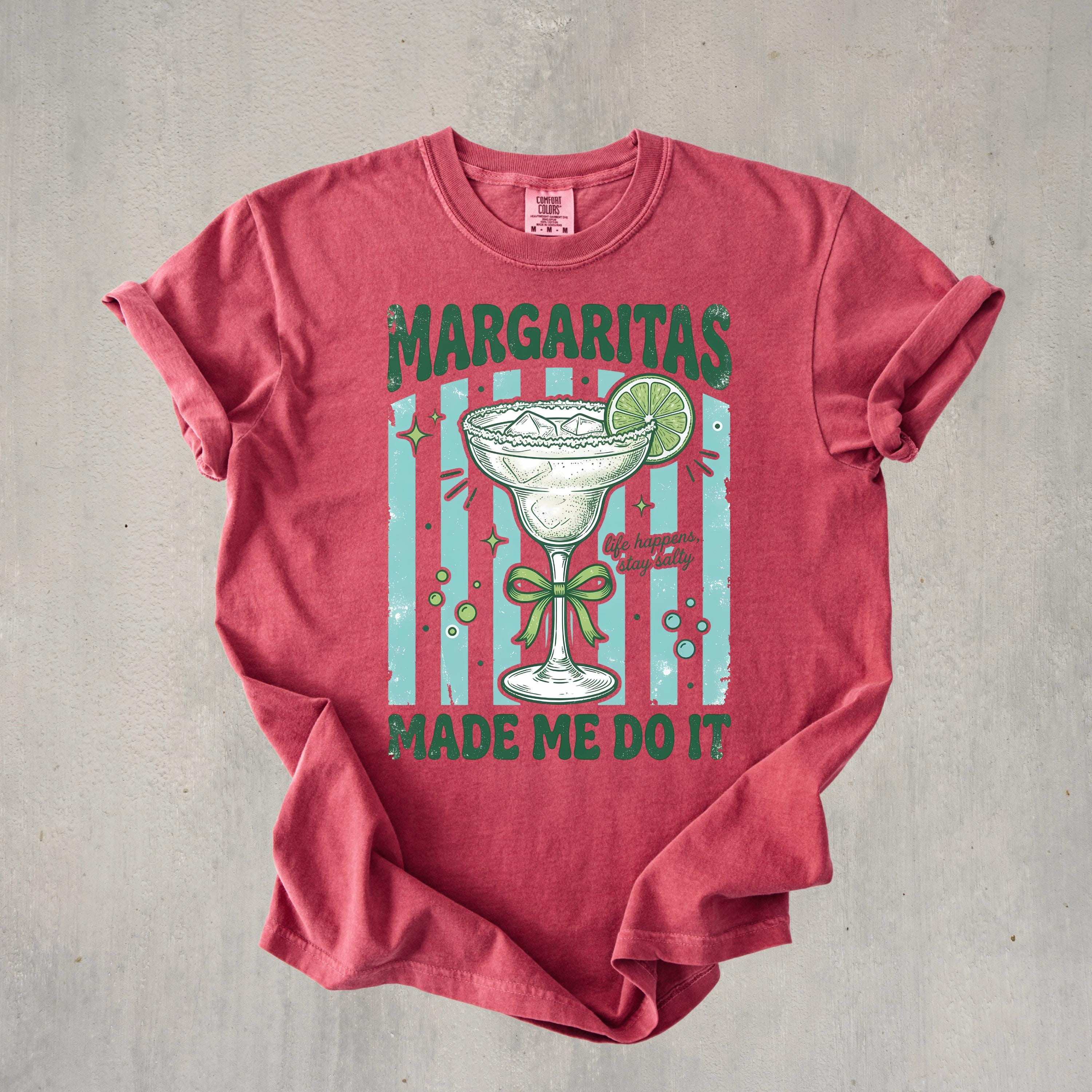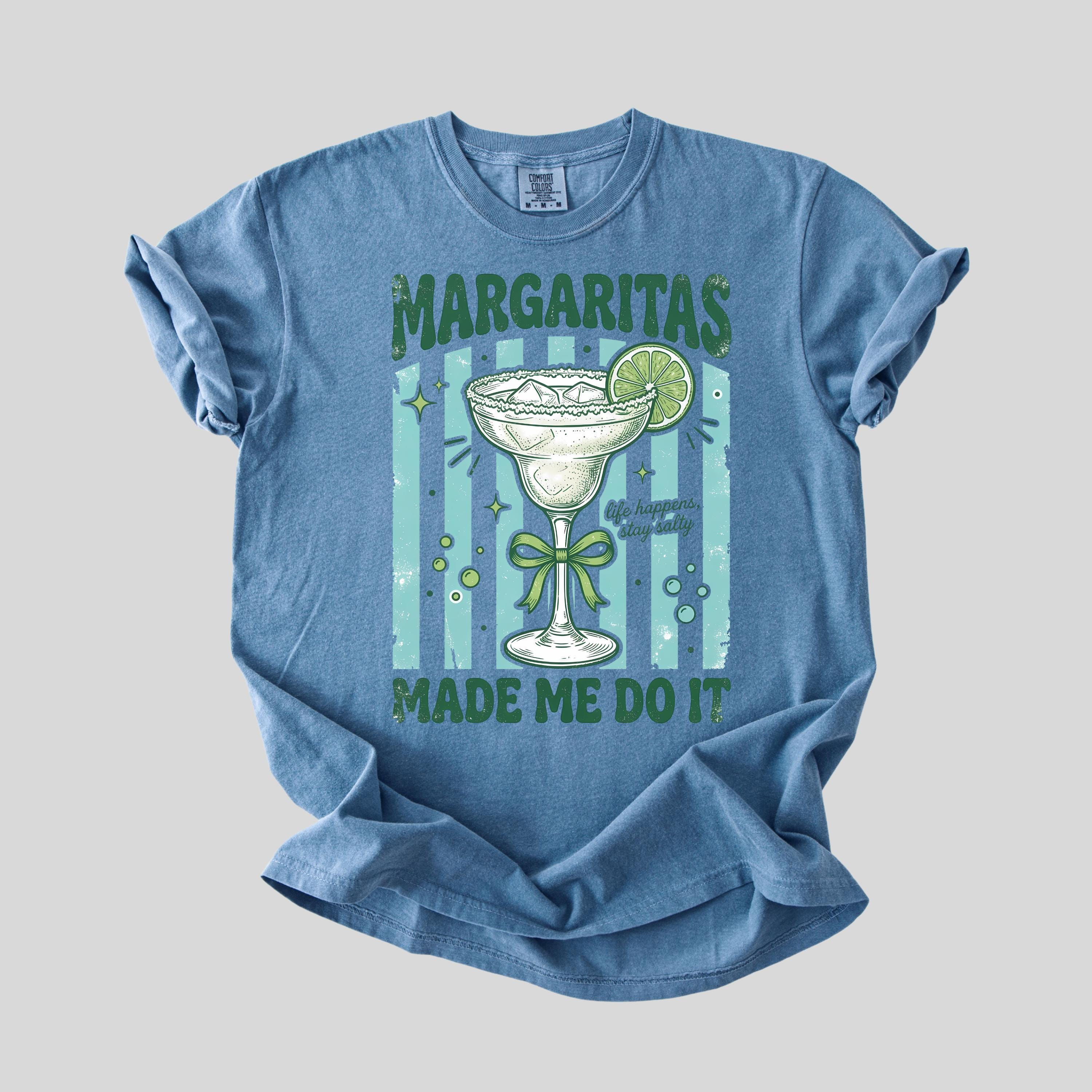 Add some fun and sass to your wardrobe with this “Margaritas Made Me Do It” t-shirt! Featuring a vintage-style margarita glass, lime detail, and playful typography, this design is perfect for anyone who loves good vibes and great drinks.