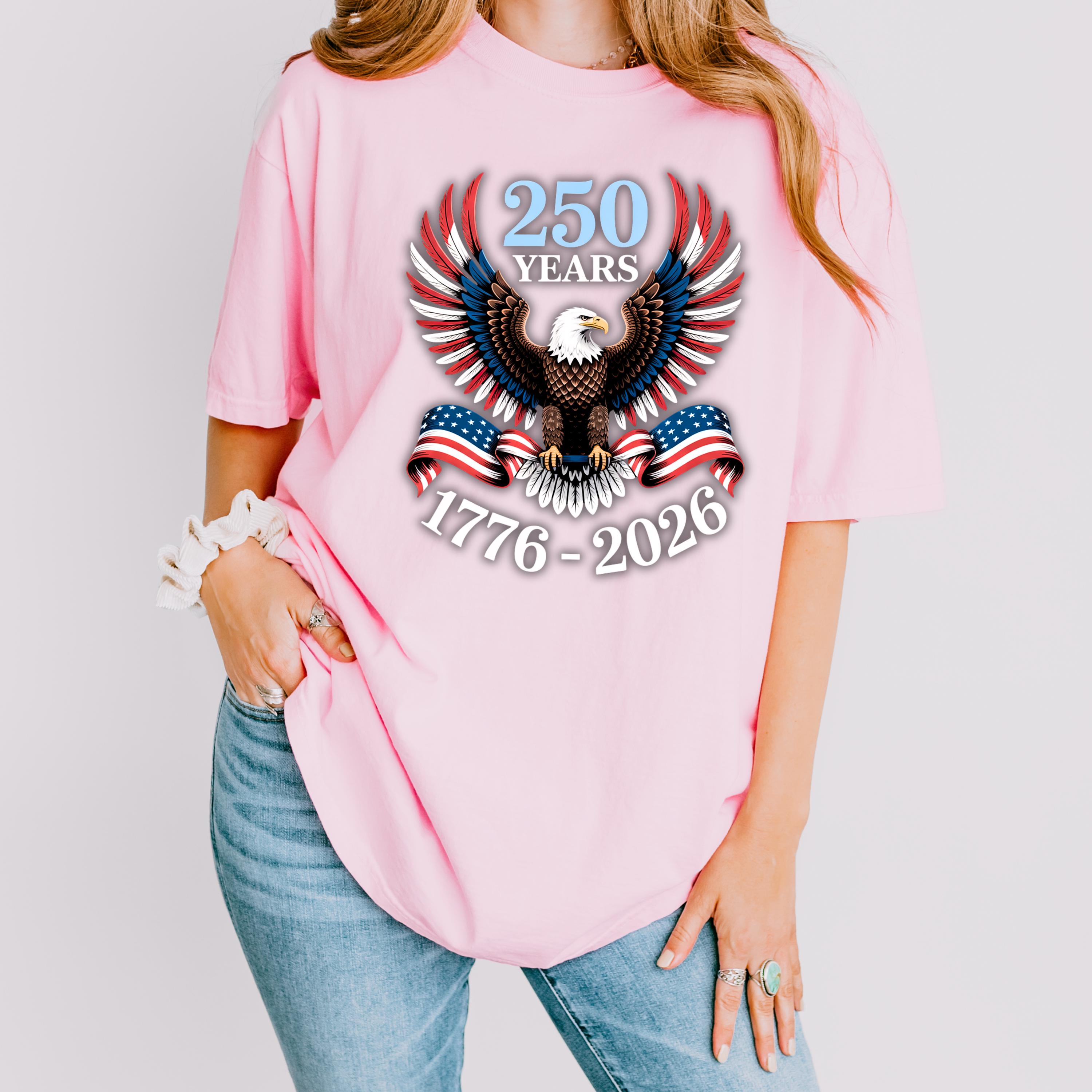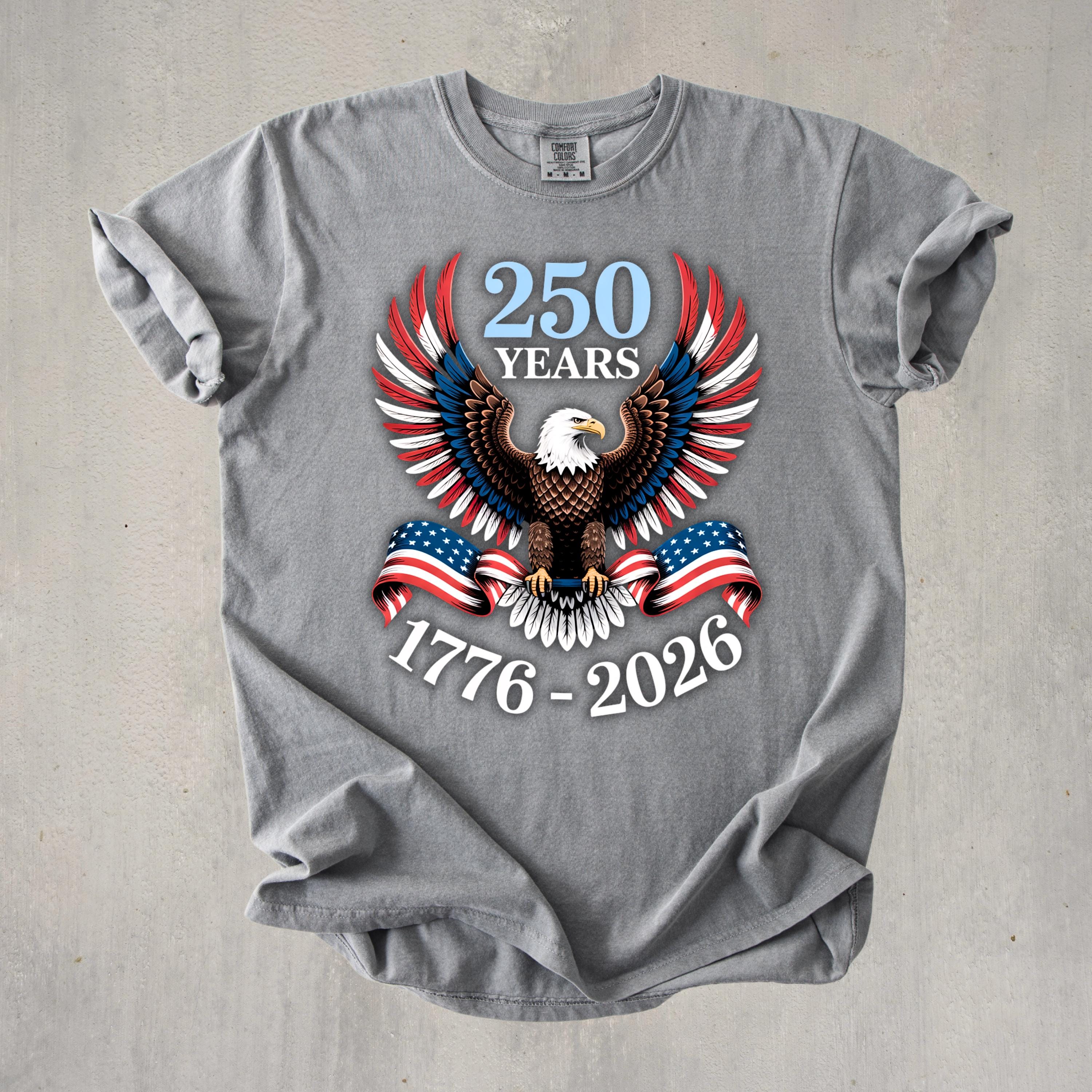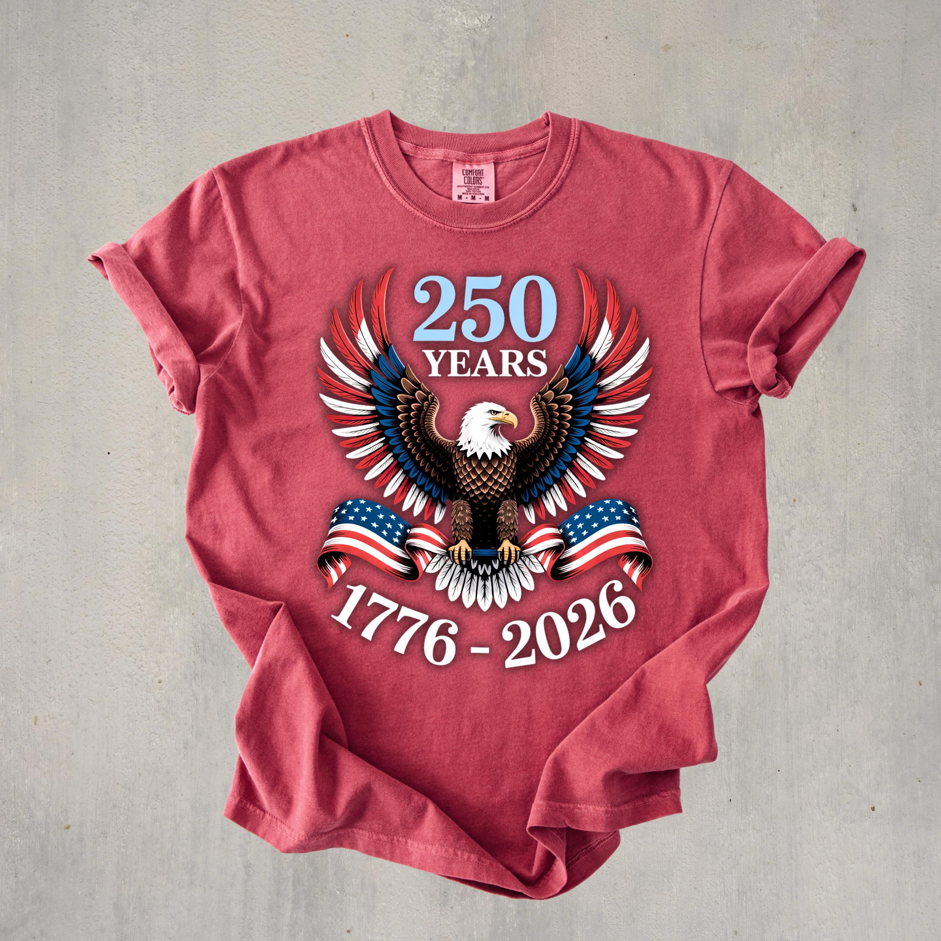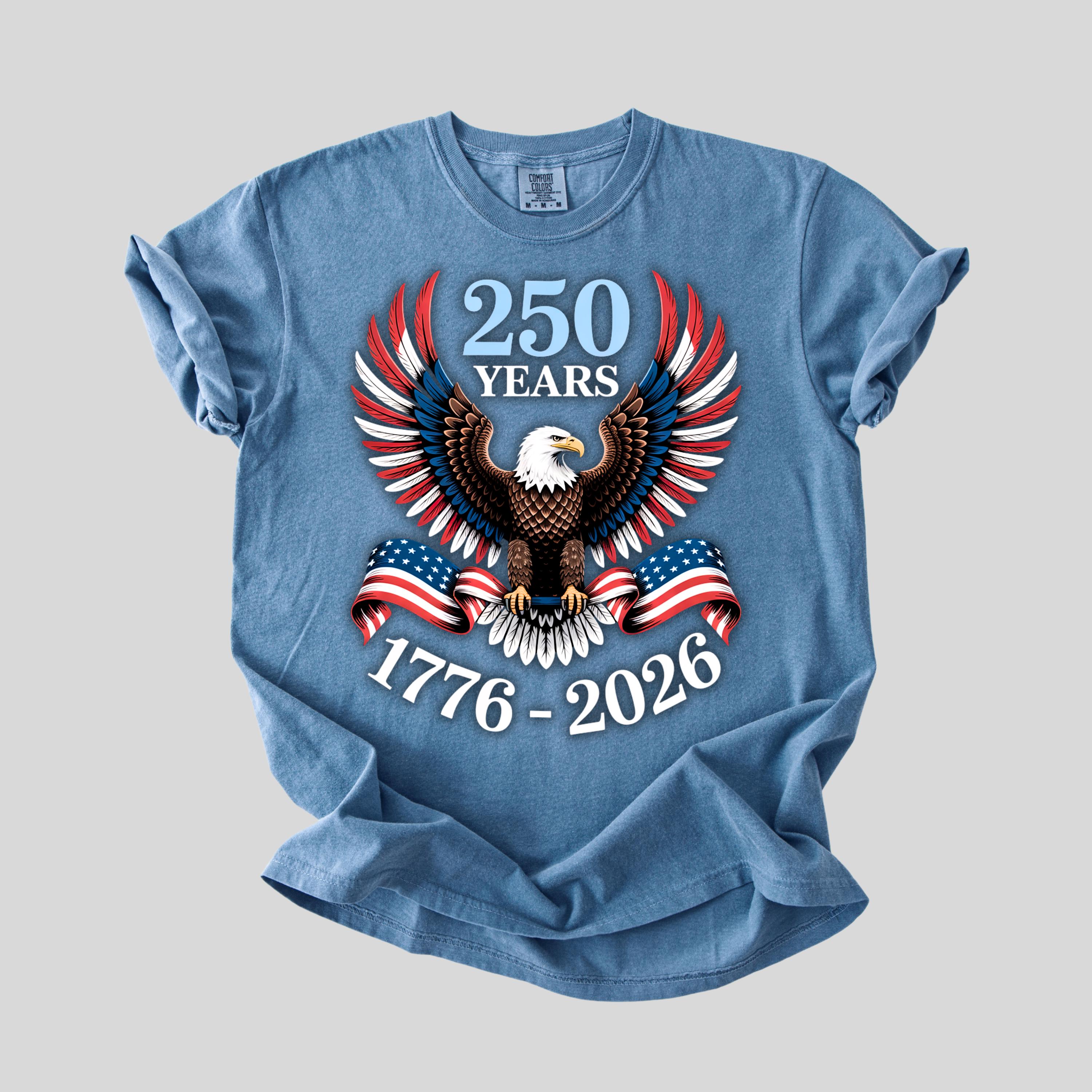 Celebrate 250 years of American pride with this bold and powerful eagle t-shirt. Featuring a detailed bald eagle with wings spread wide and wrapped in the American flag, this design represents strength, freedom, and unity.