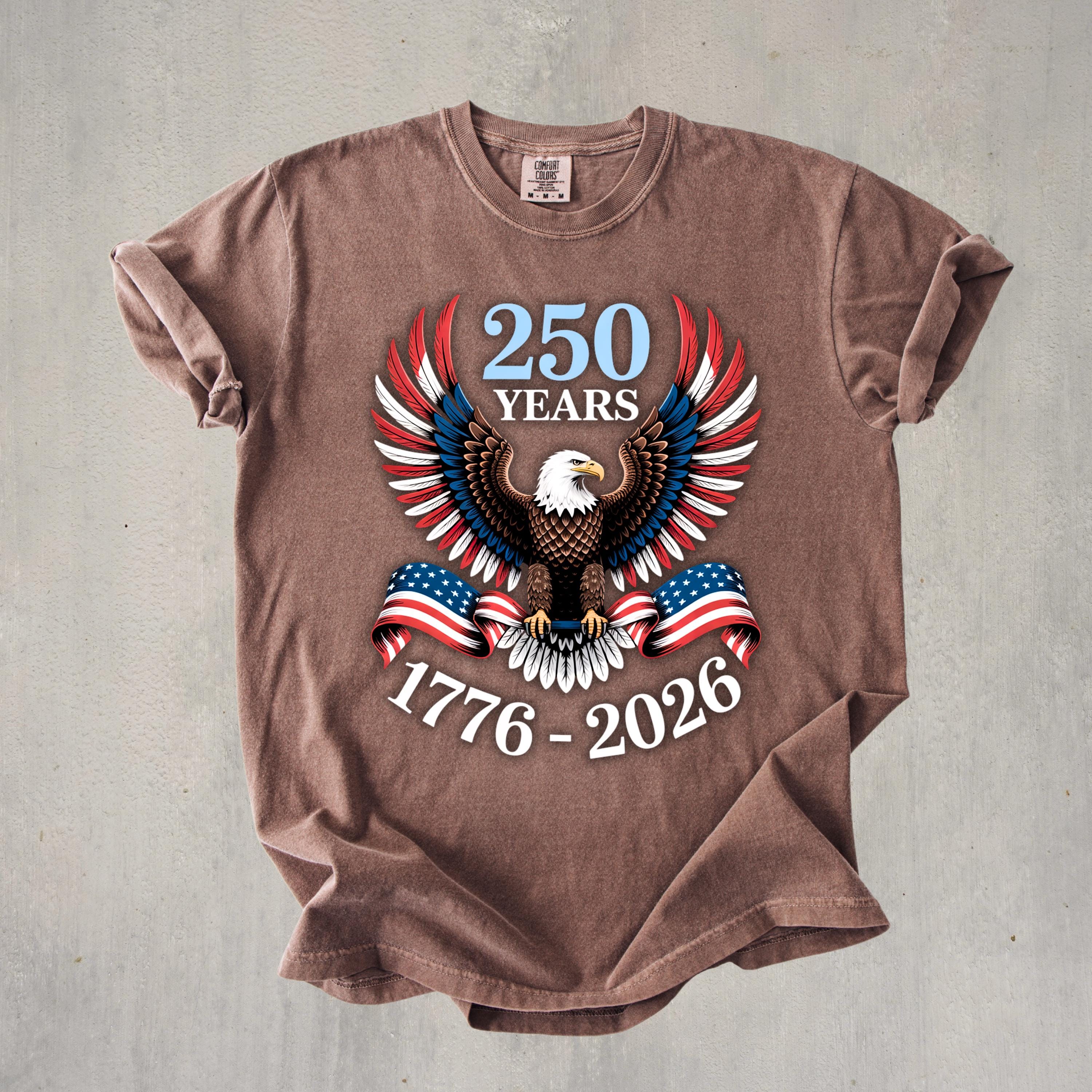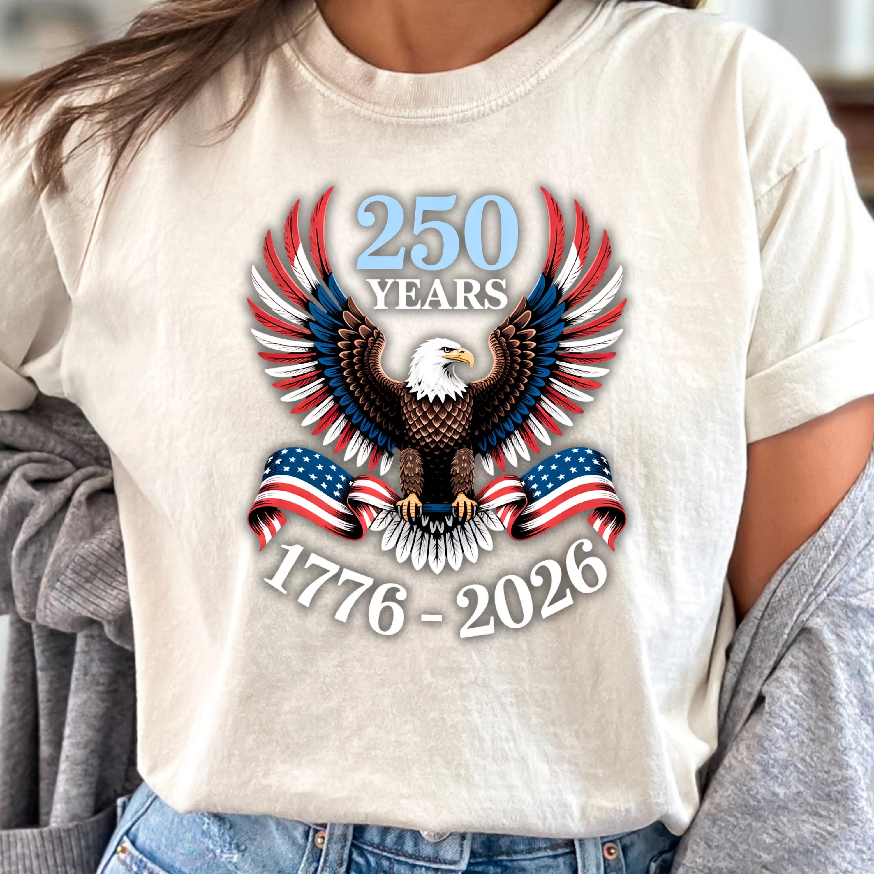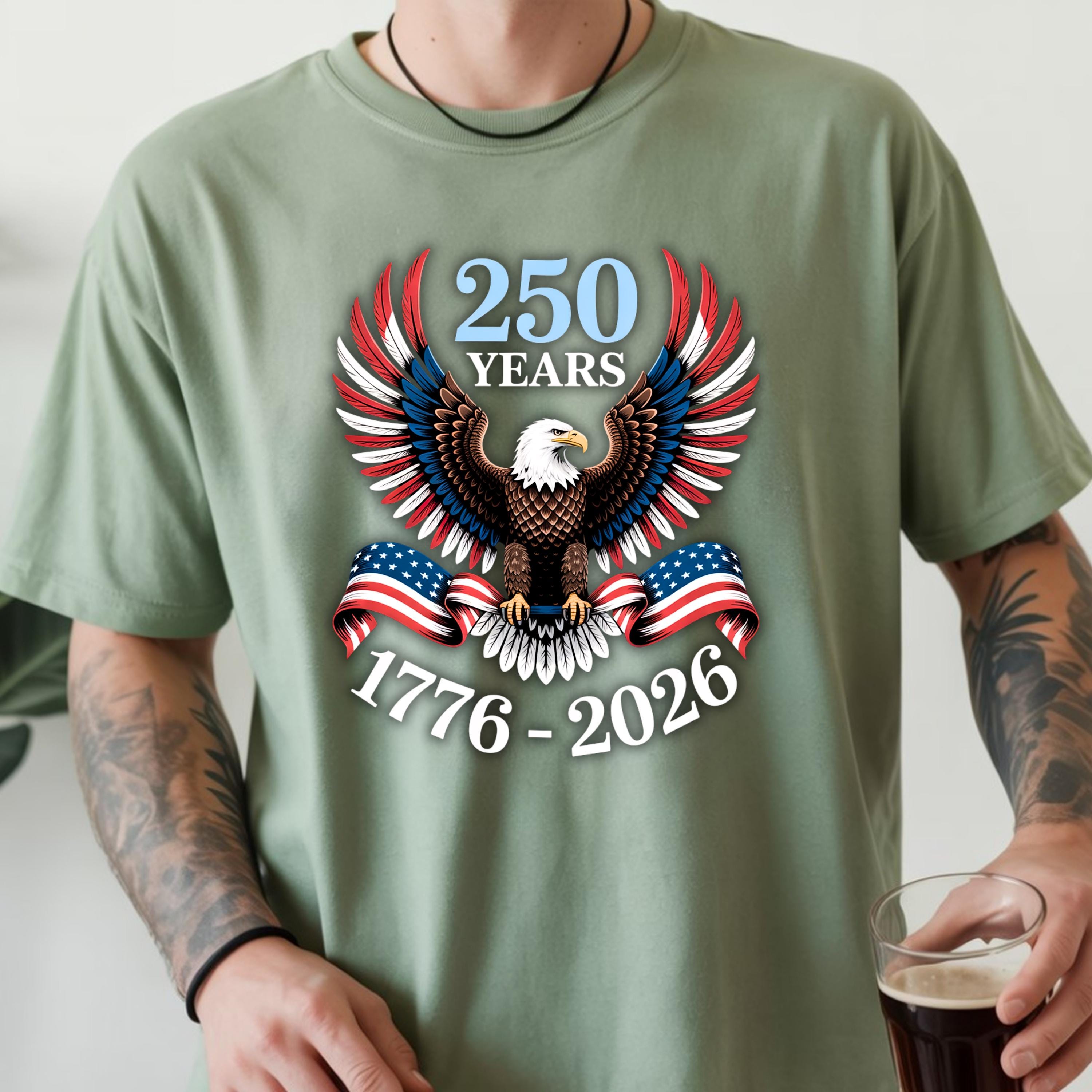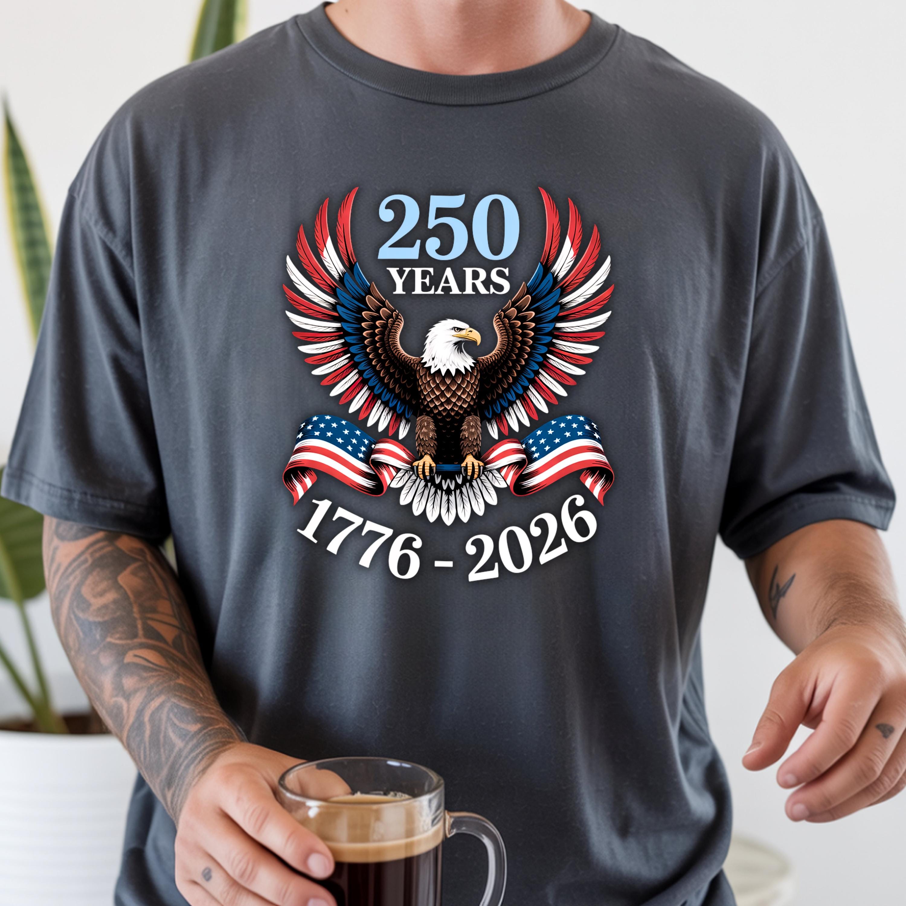 Celebrate 250 years of American pride with this bold and powerful eagle t-shirt. Featuring a detailed bald eagle with wings spread wide and wrapped in the American flag, this design represents strength, freedom, and unity.