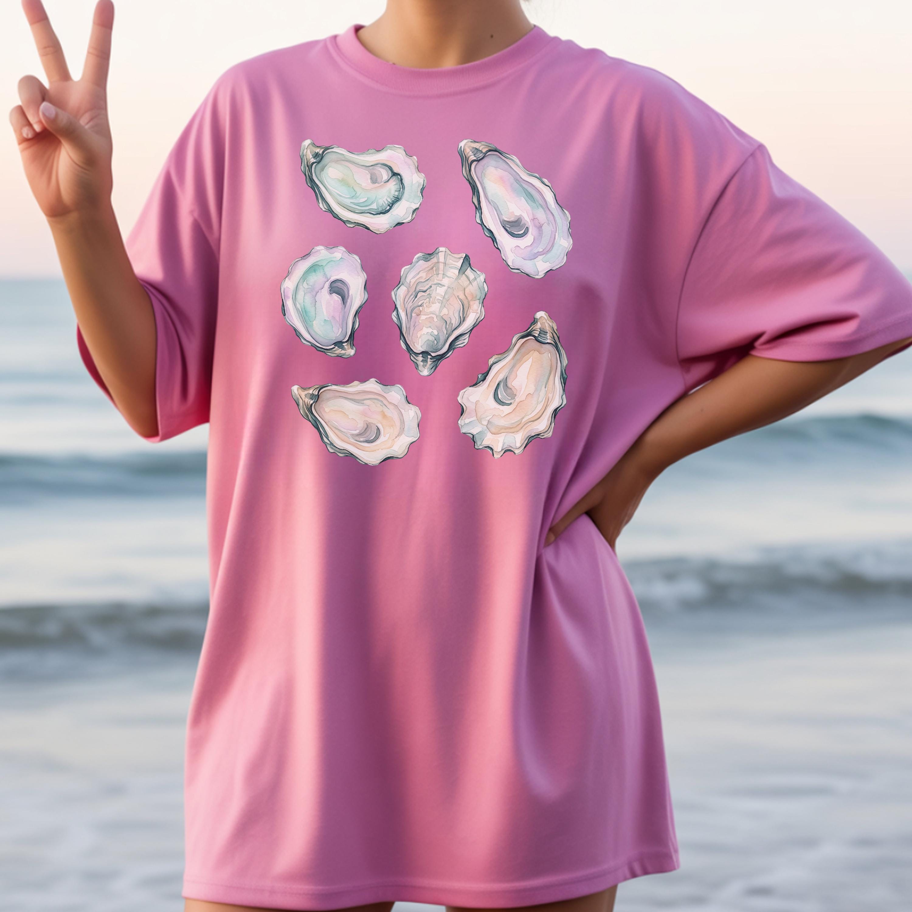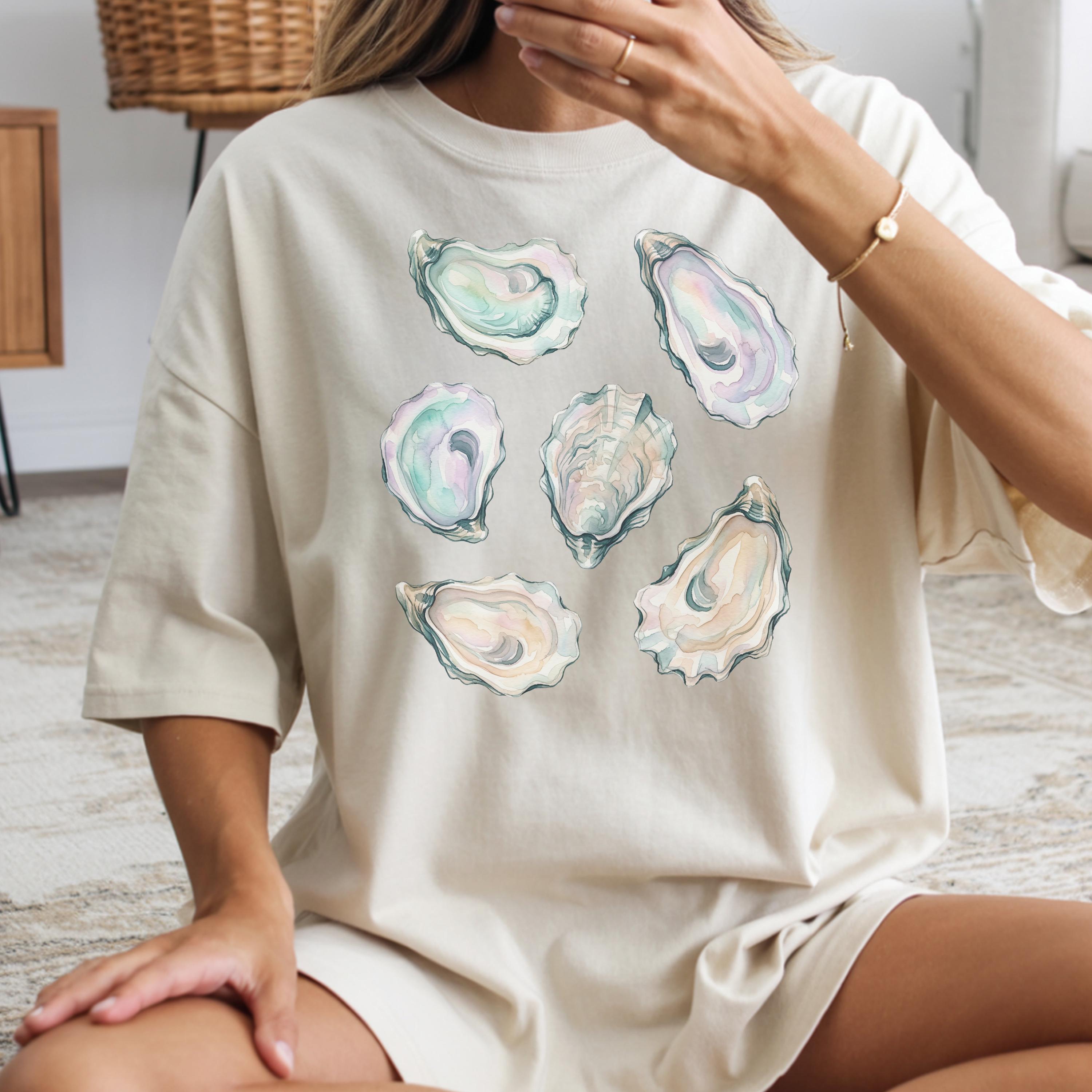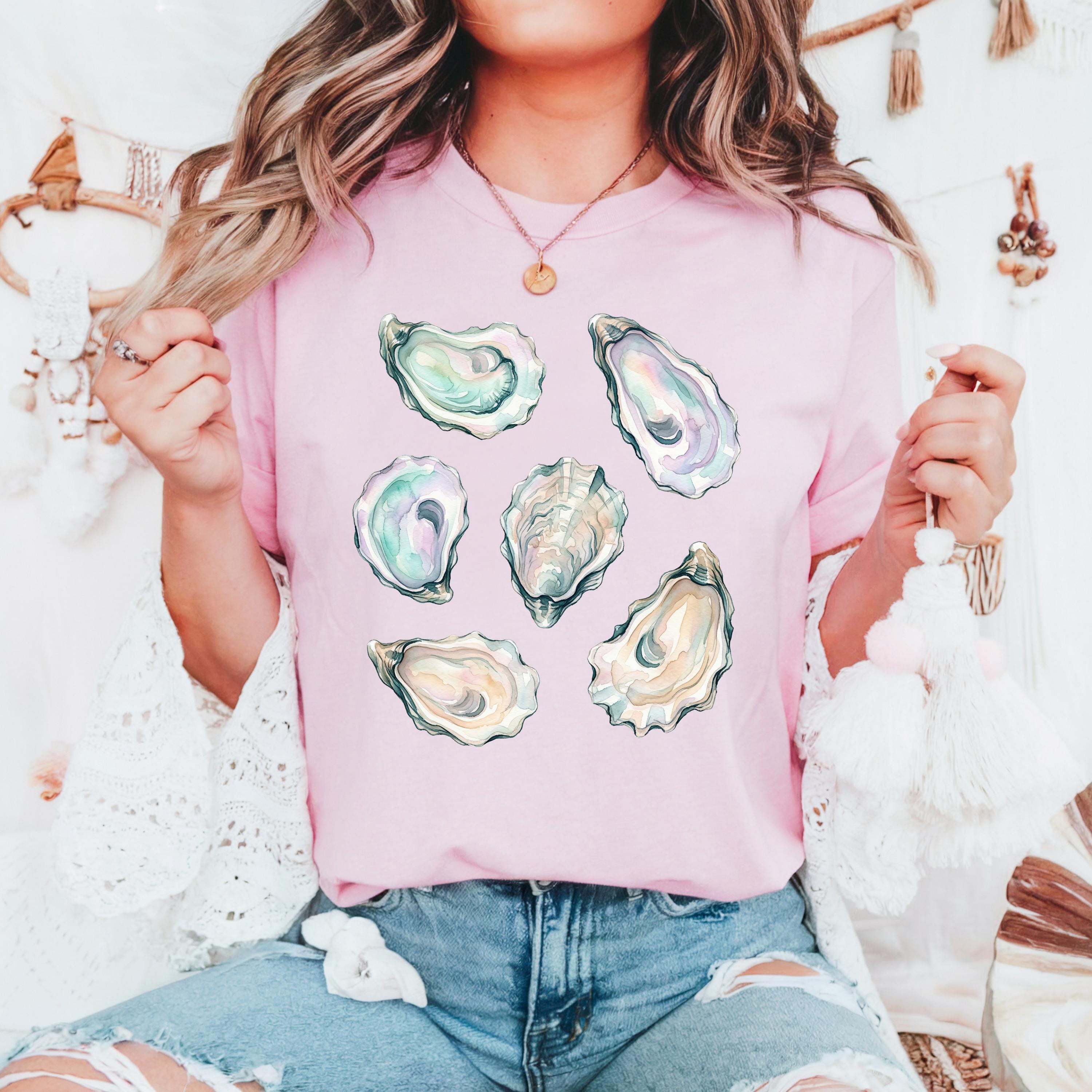 This beautiful Oyster Shell Shirt captures the essence of coastal aesthetic style with soft watercolor seashell artwork inspired by the ocean. Featuring delicate oyster shell illustrations in calming pastel tones, this coastal graphic tee is perfect for beach lovers and anyone who enjoys relaxed, seaside fashion.
