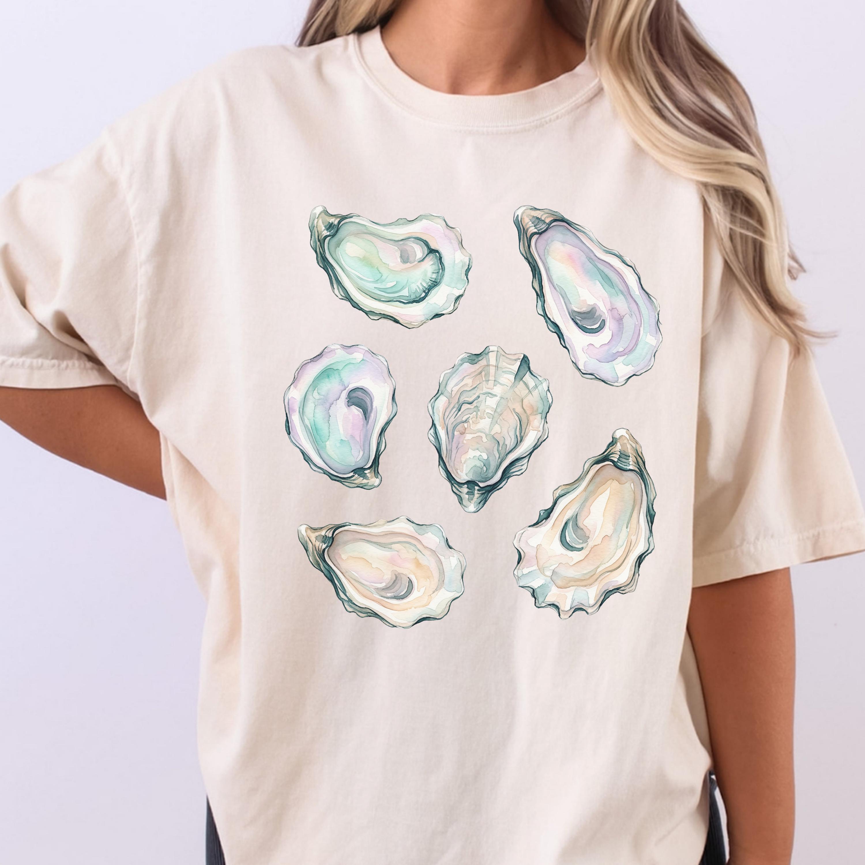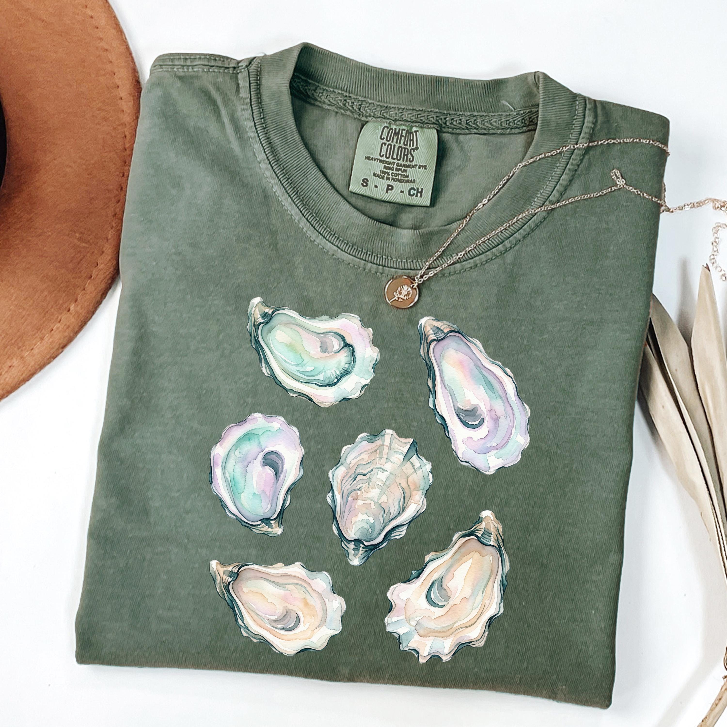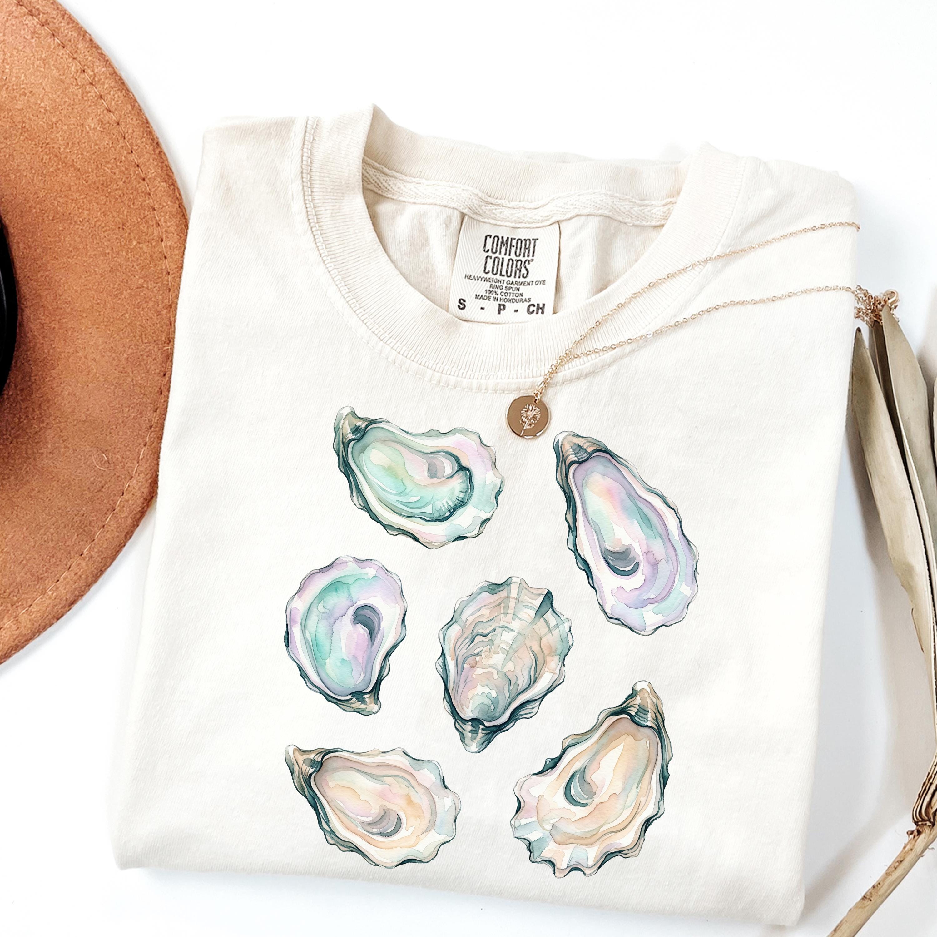 This beautiful Oyster Shell Shirt captures the essence of coastal aesthetic style with soft watercolor seashell artwork inspired by the ocean. Featuring delicate oyster shell illustrations in calming pastel tones, this coastal graphic tee is perfect for beach lovers and anyone who enjoys relaxed, seaside fashion.