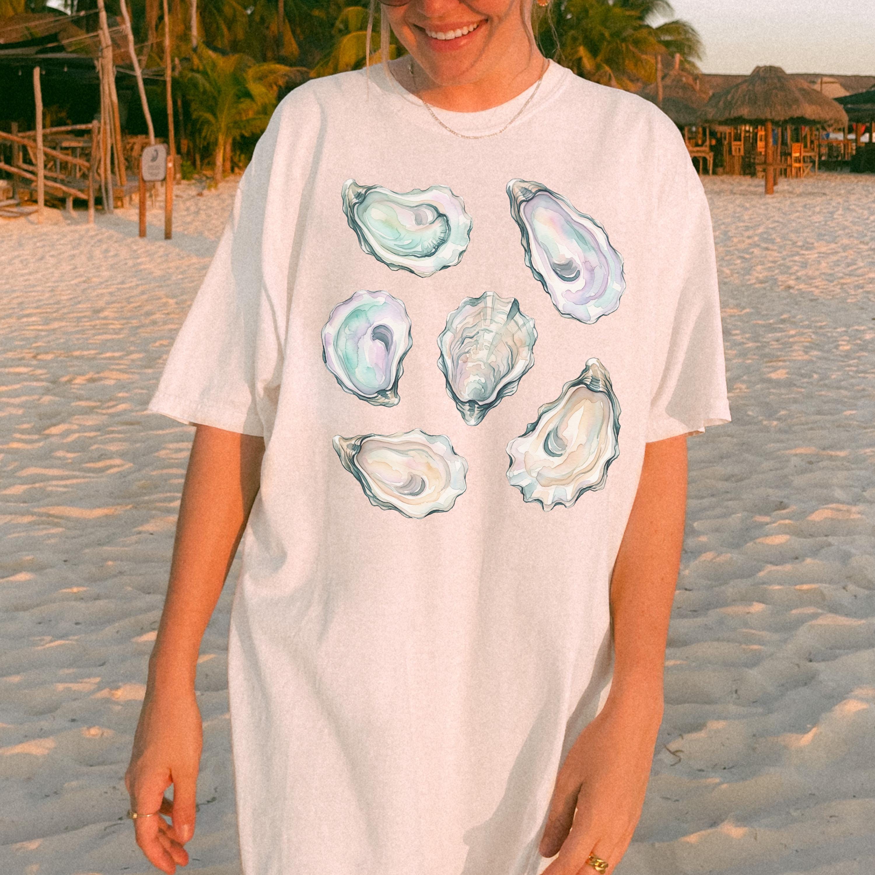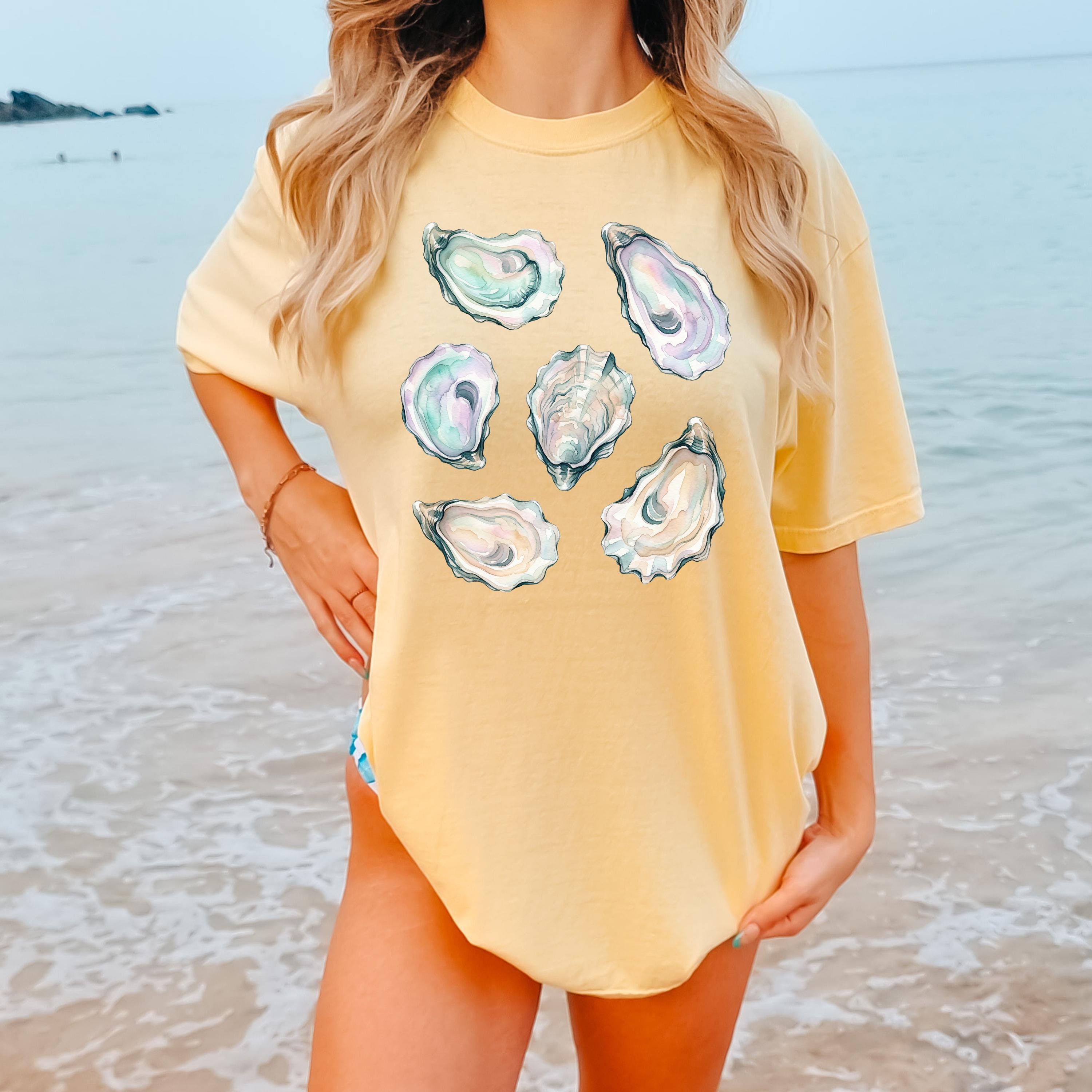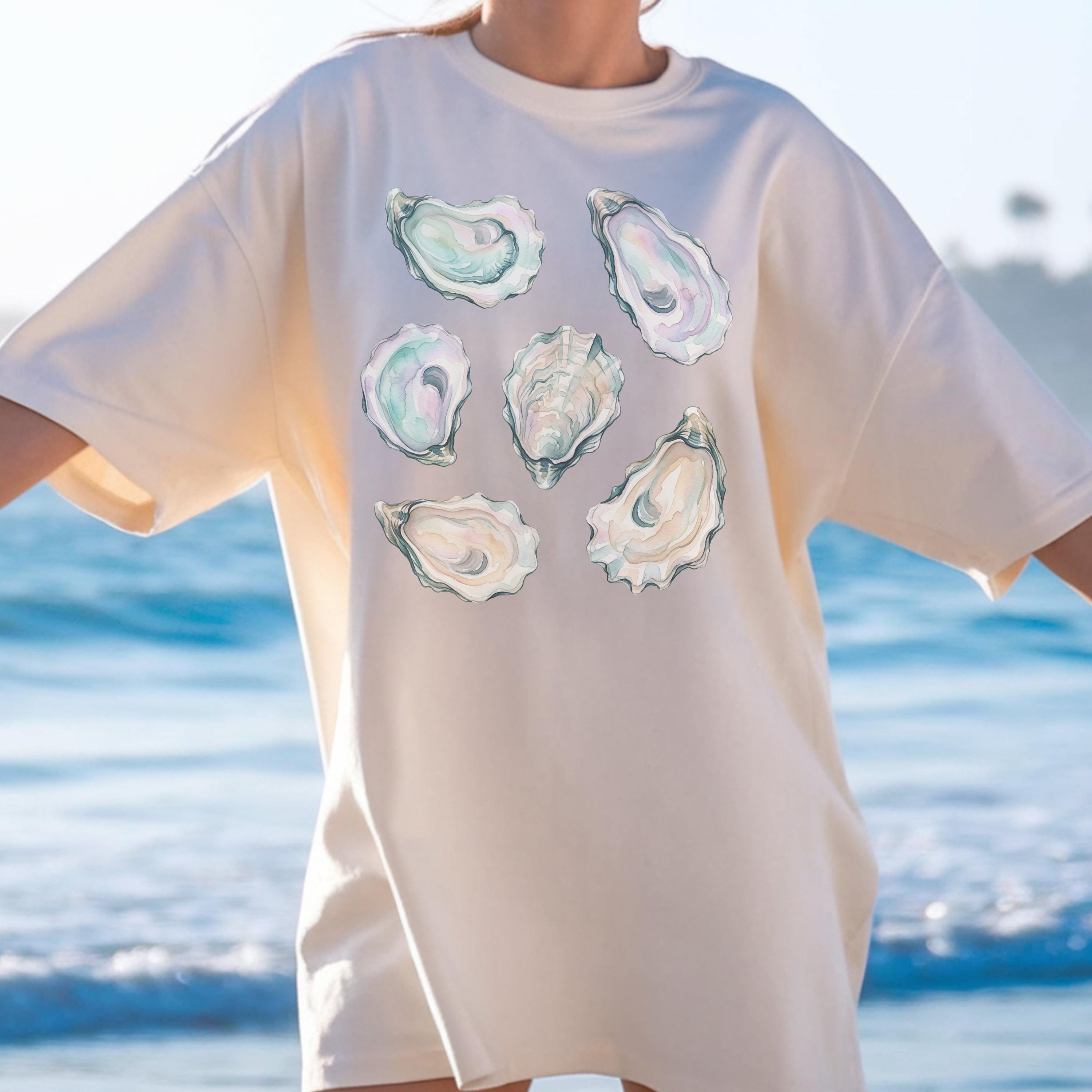 If you're searching for an oyster shirt, seashell graphic tee, coastal aesthetic shirt, beach vacation tee, or ocean lover gift, this design stands out with its soft color palette and modern artistic feel.