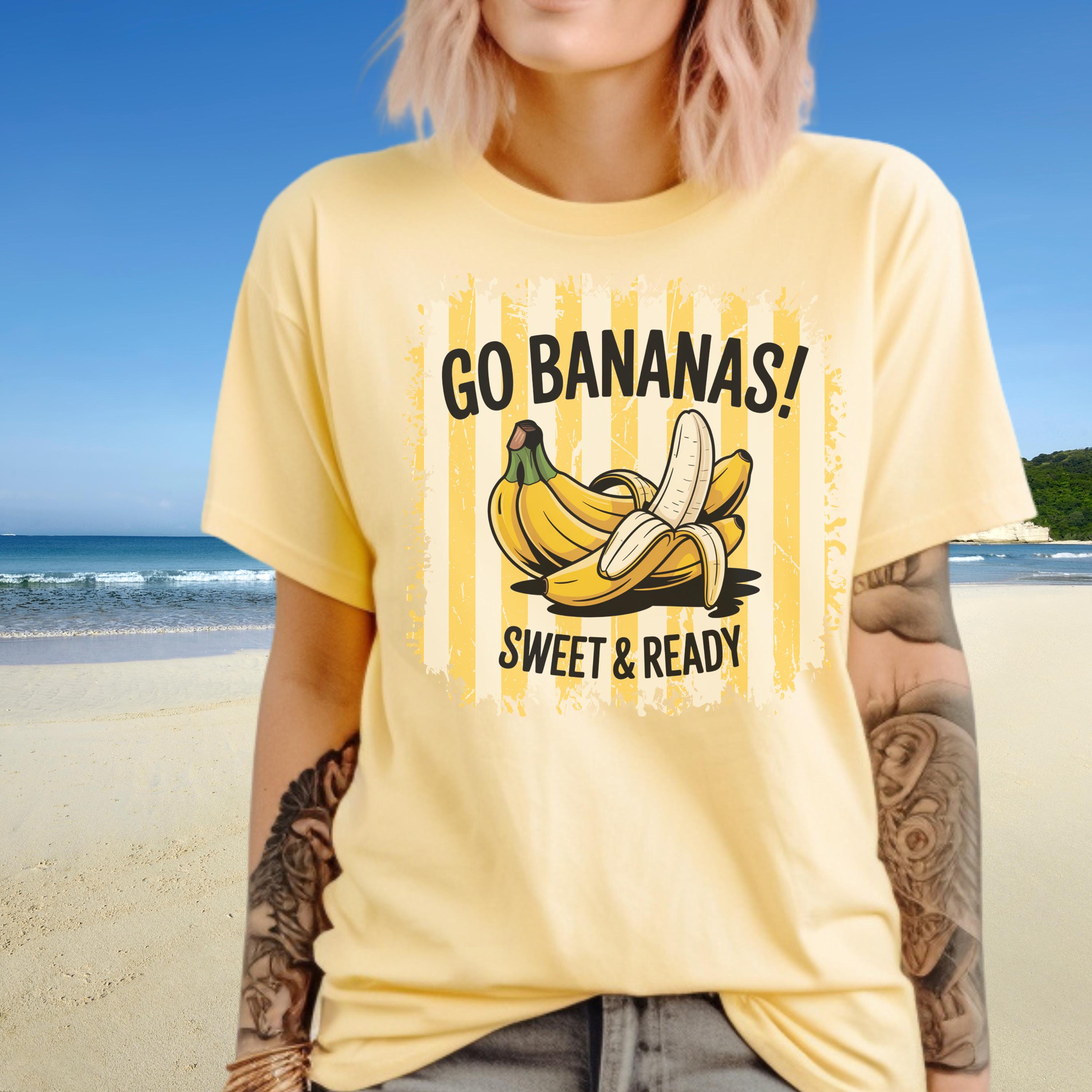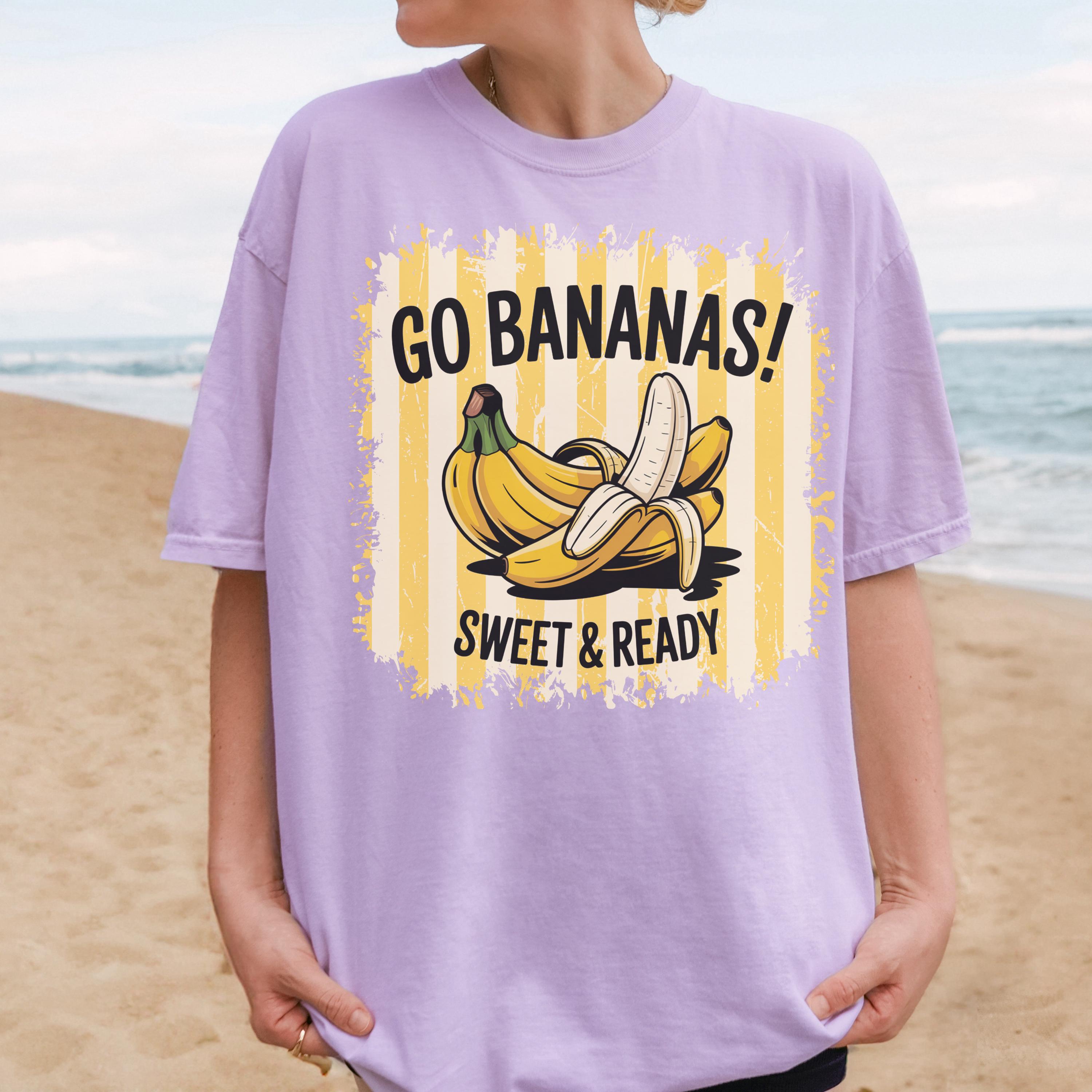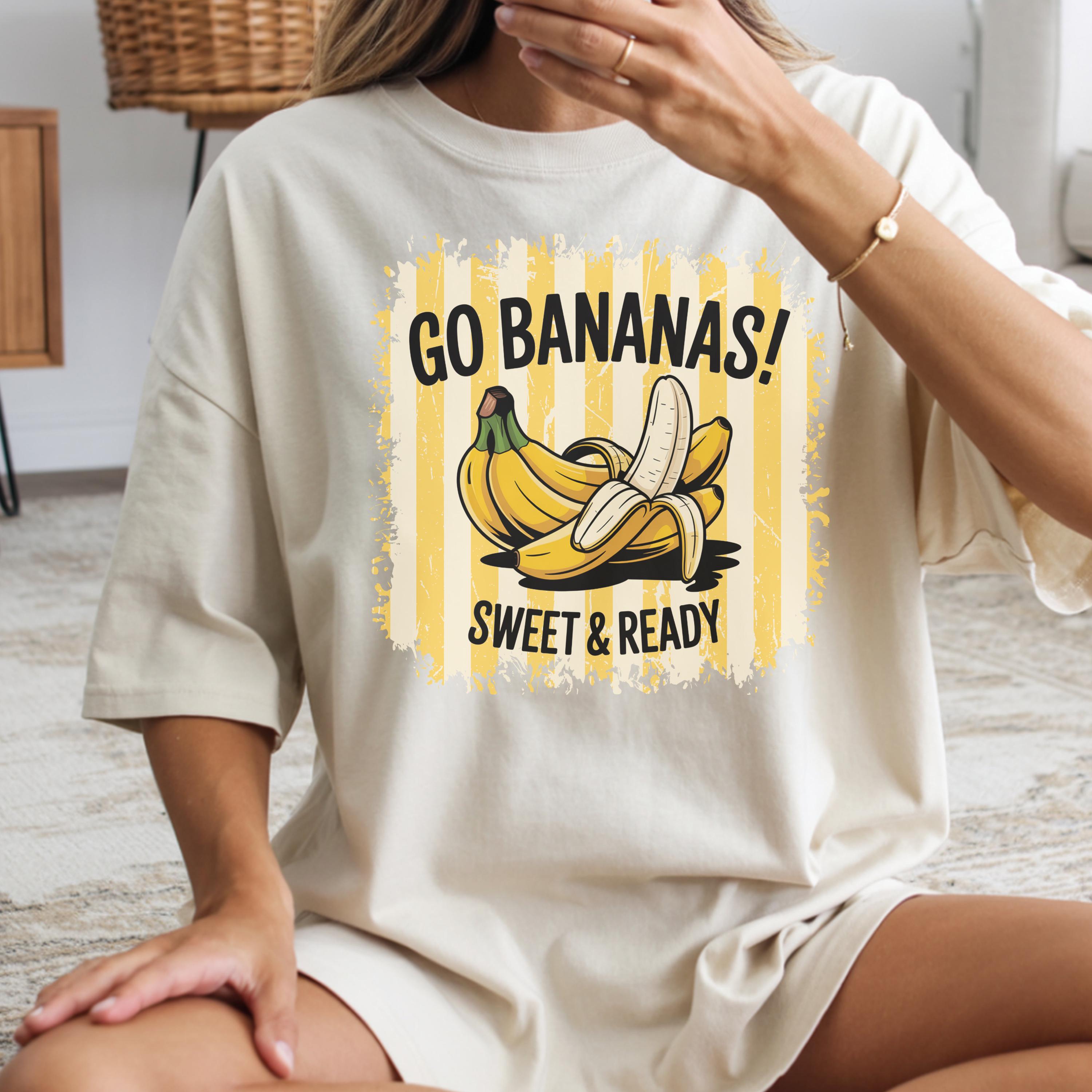 This fun and playful Go Bananas Shirt features a bold banana graphic with a retro distressed print look, making it the perfect mix of humor and vintage style. With the phrase “Go Bananas! Sweet & Ready,” this funny banana tee is designed to stand out and bring a lighthearted vibe to any outfit.