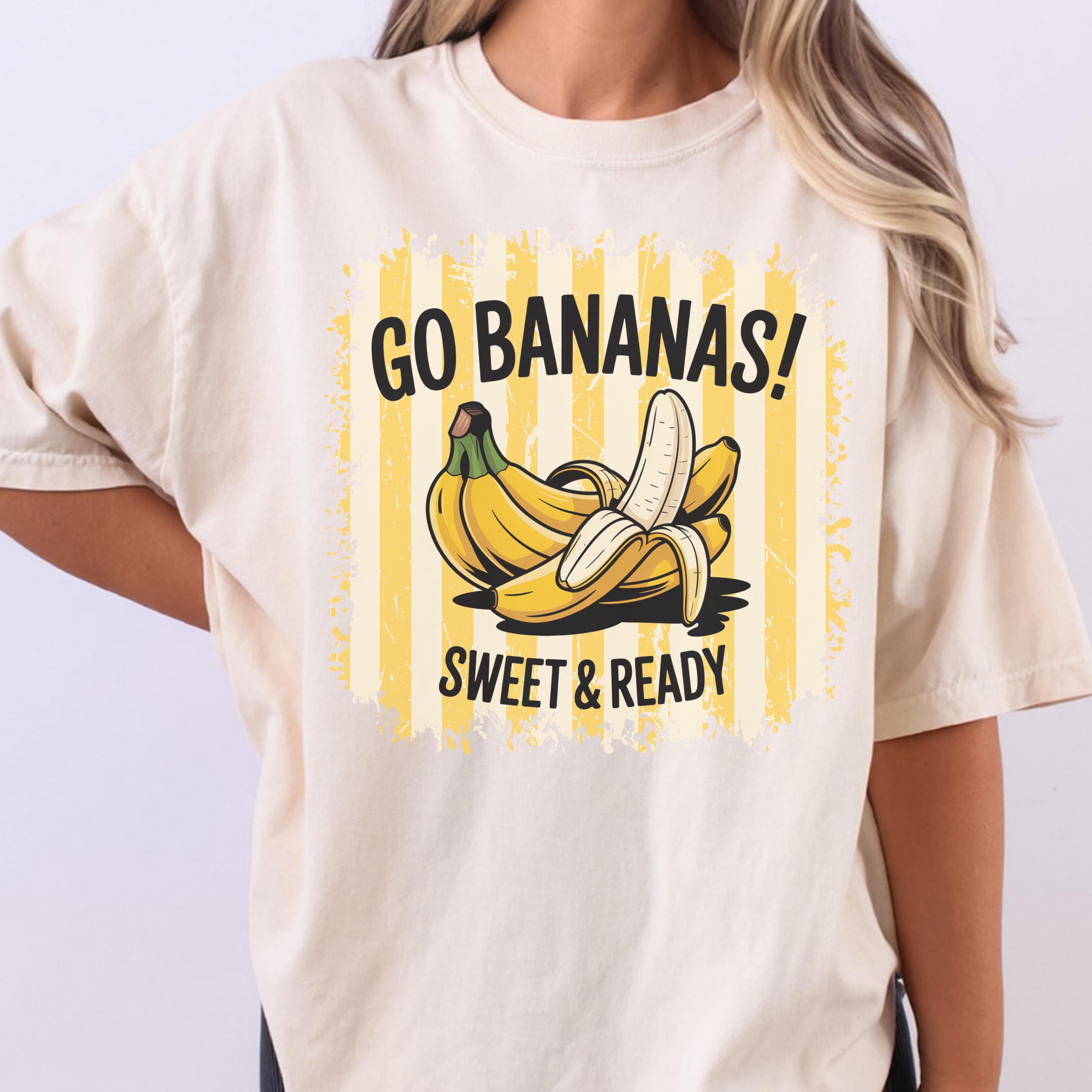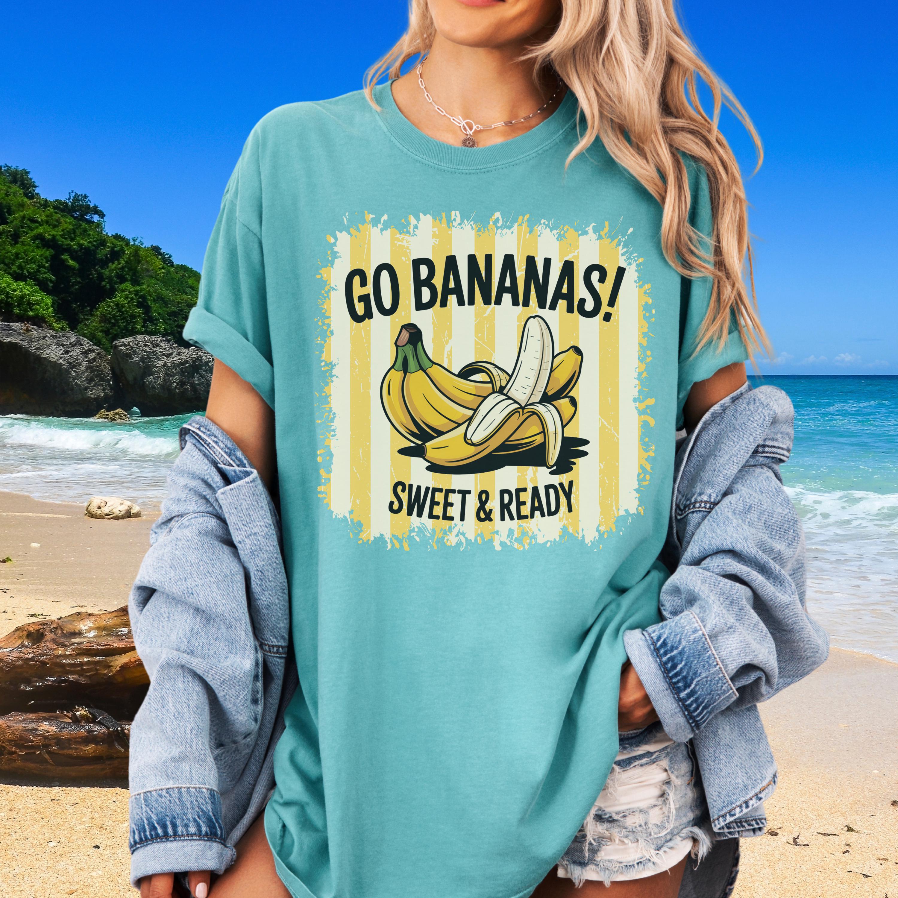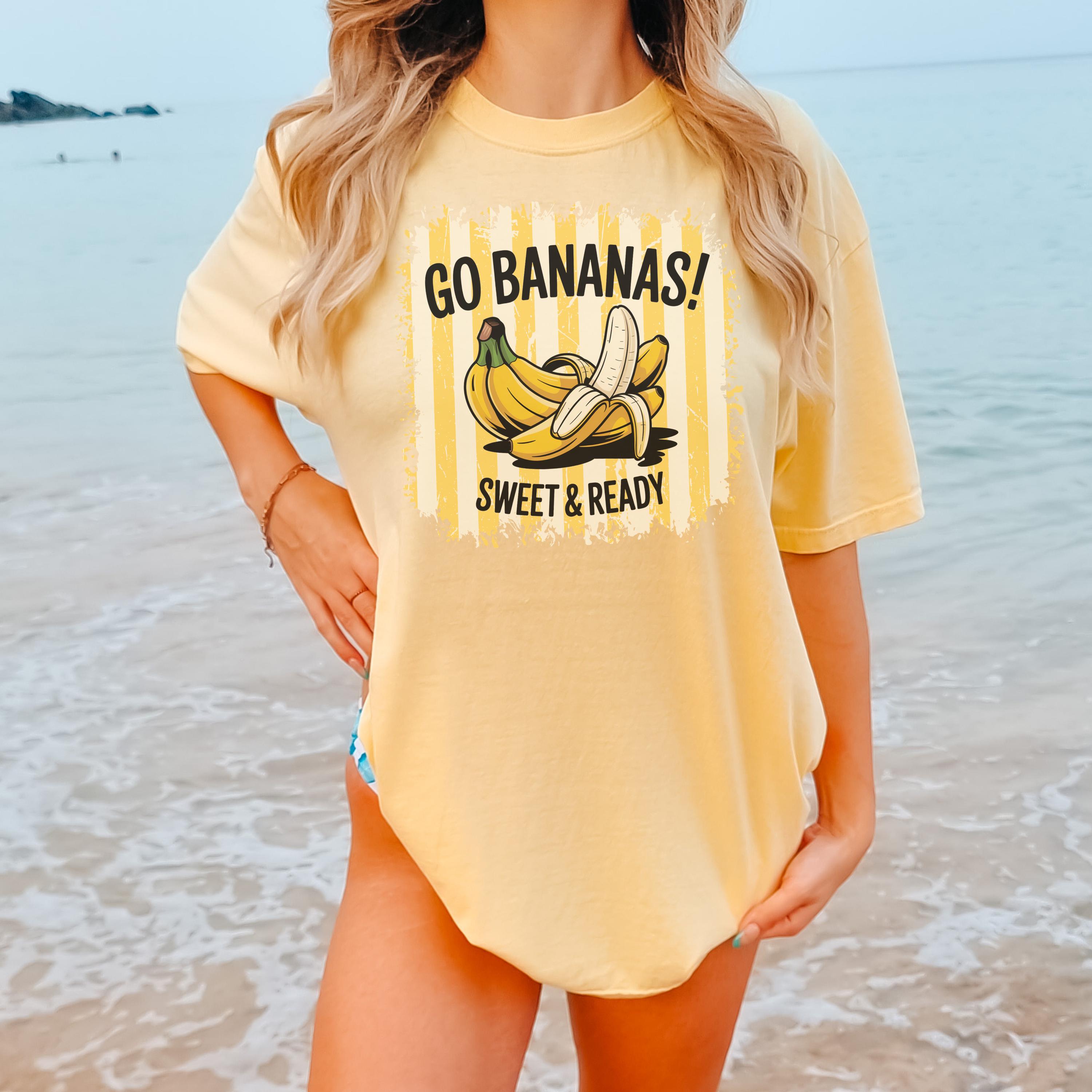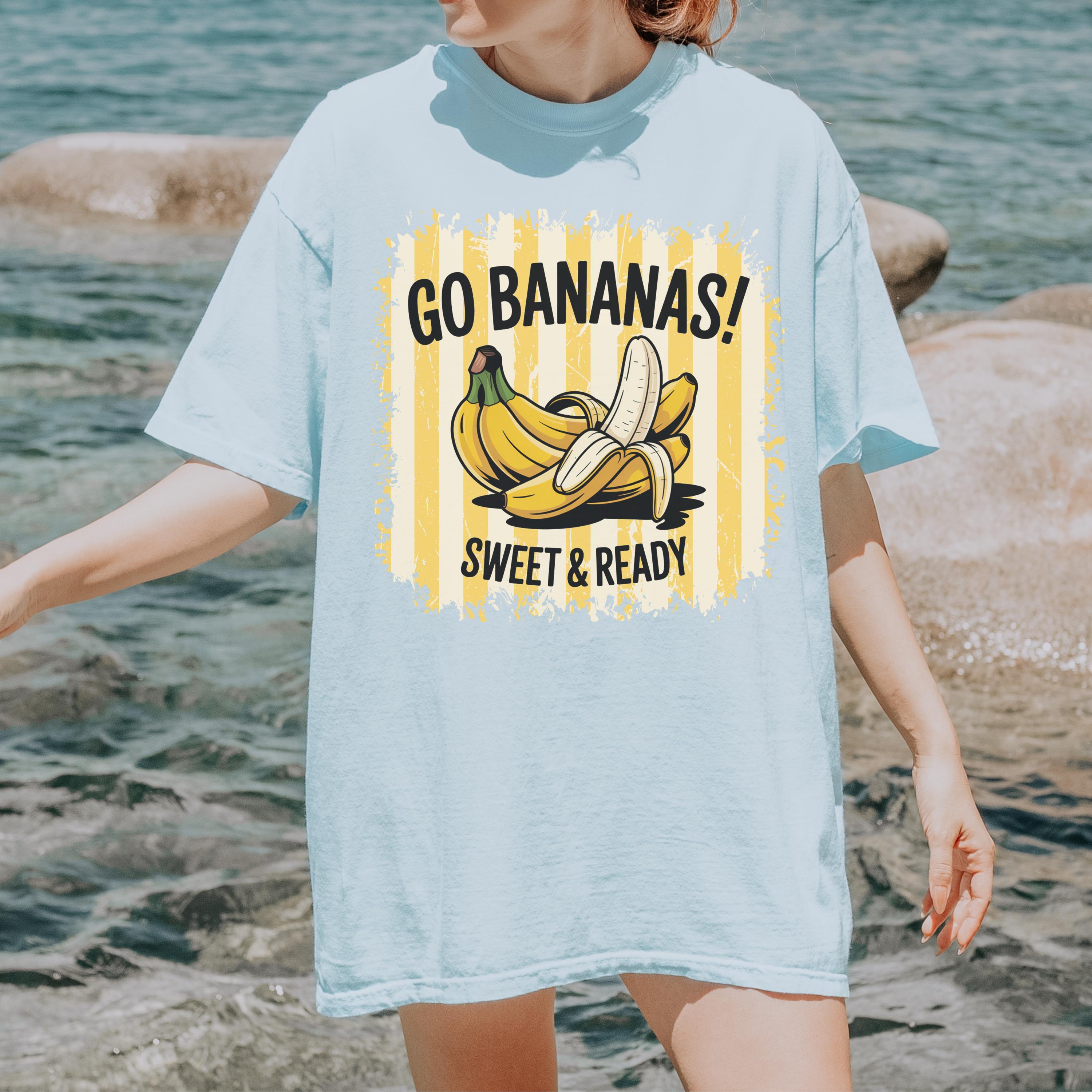 This fun and playful Go Bananas Shirt features a bold banana graphic with a retro distressed print look, making it the perfect mix of humor and vintage style. With the phrase “Go Bananas! Sweet & Ready,” this funny banana tee is designed to stand out and bring a lighthearted vibe to any outfit.