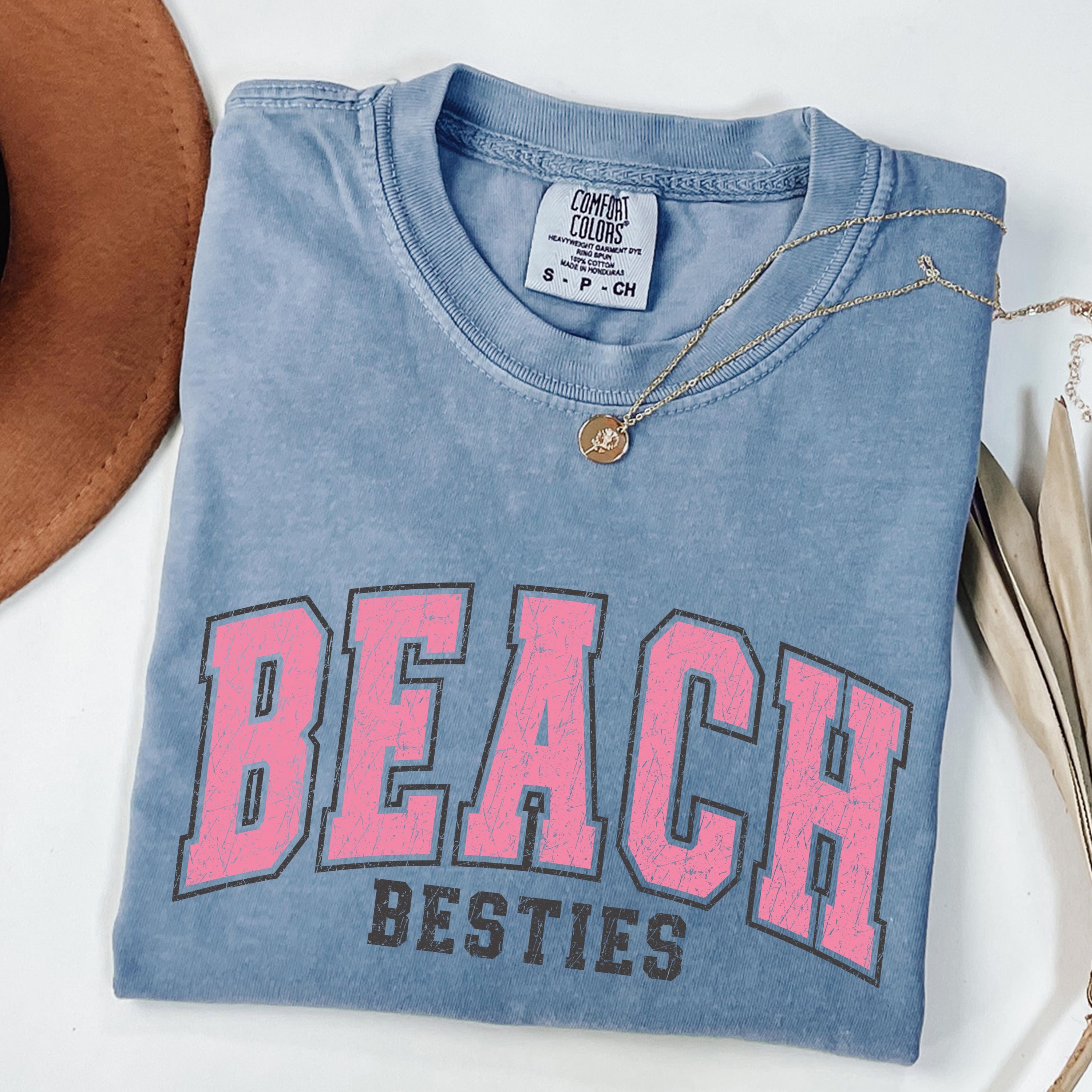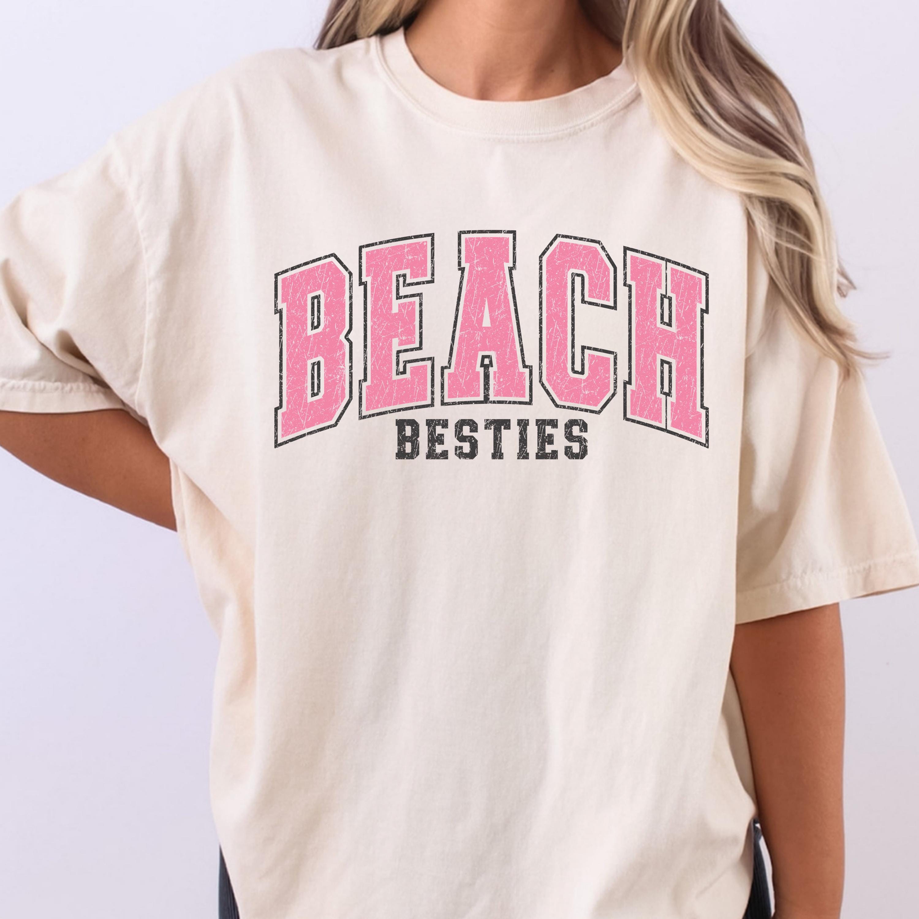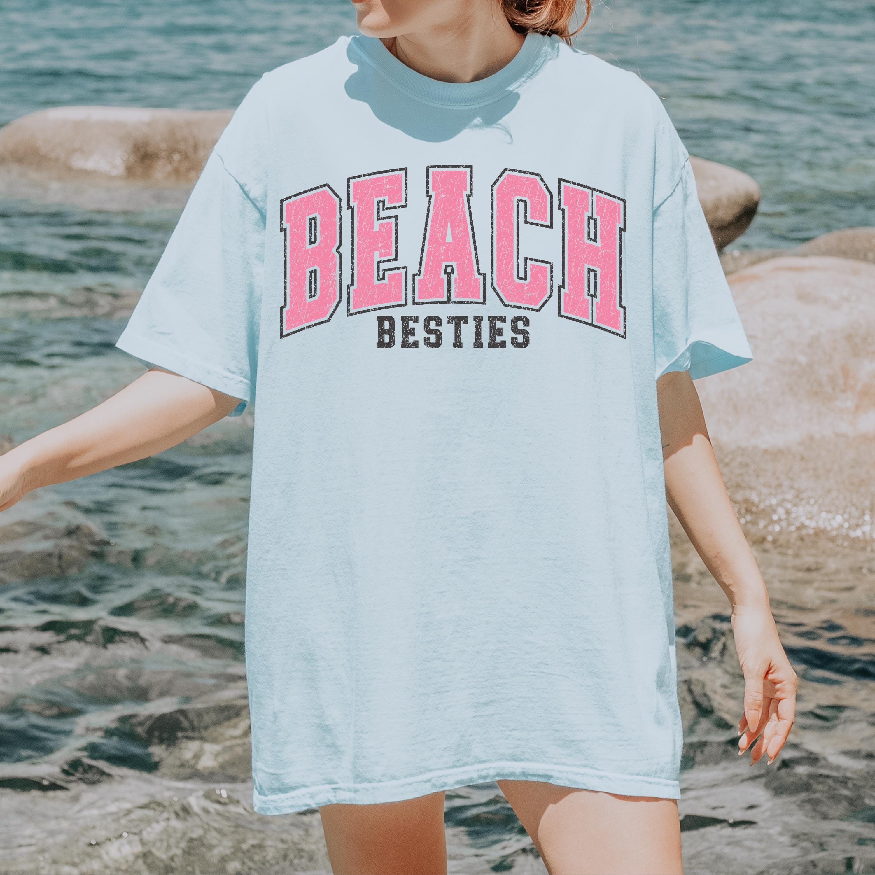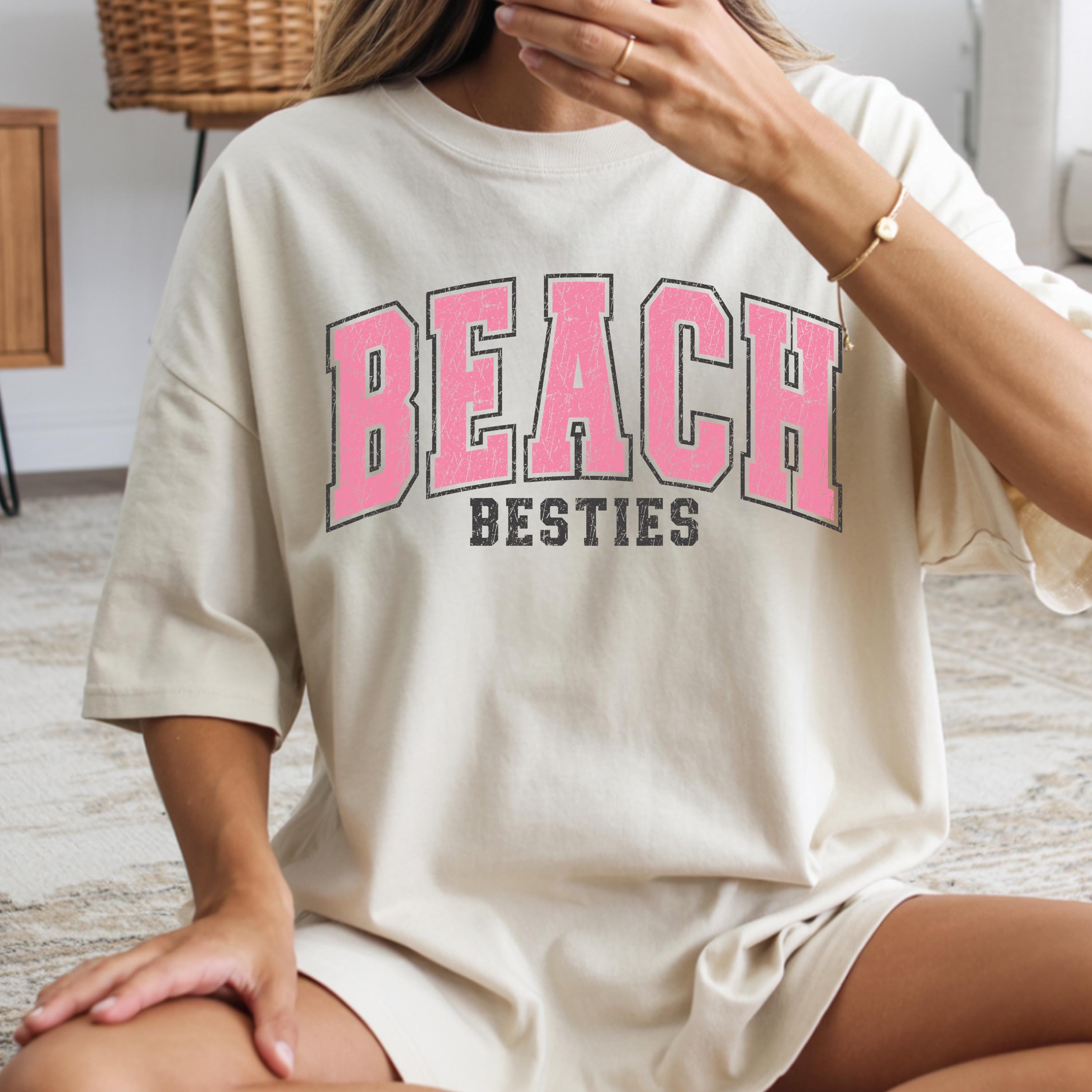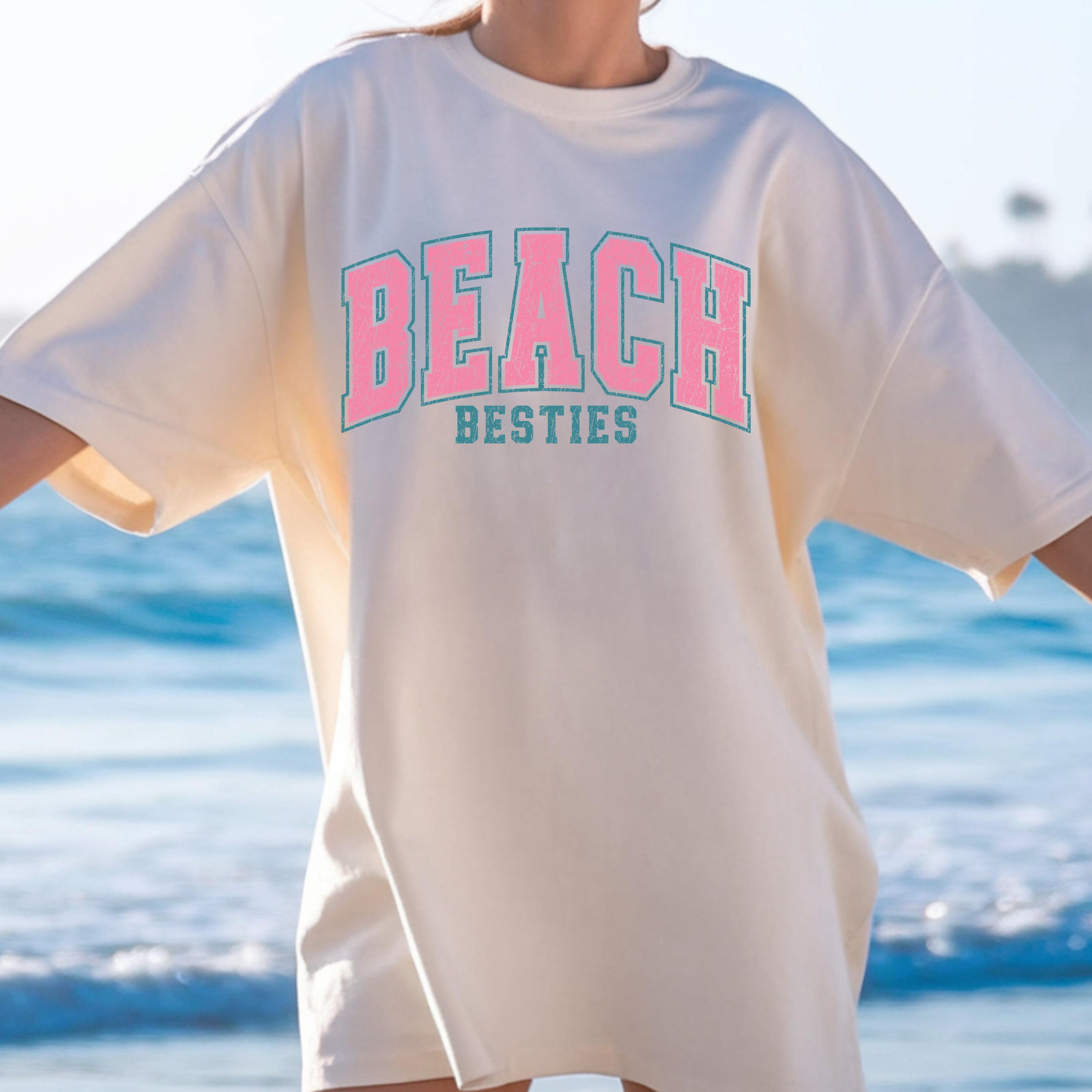 Perfect to pair with denim shorts, bikinis, or oversized layers, this beach besties tee is great for relaxed, trendy outfits.