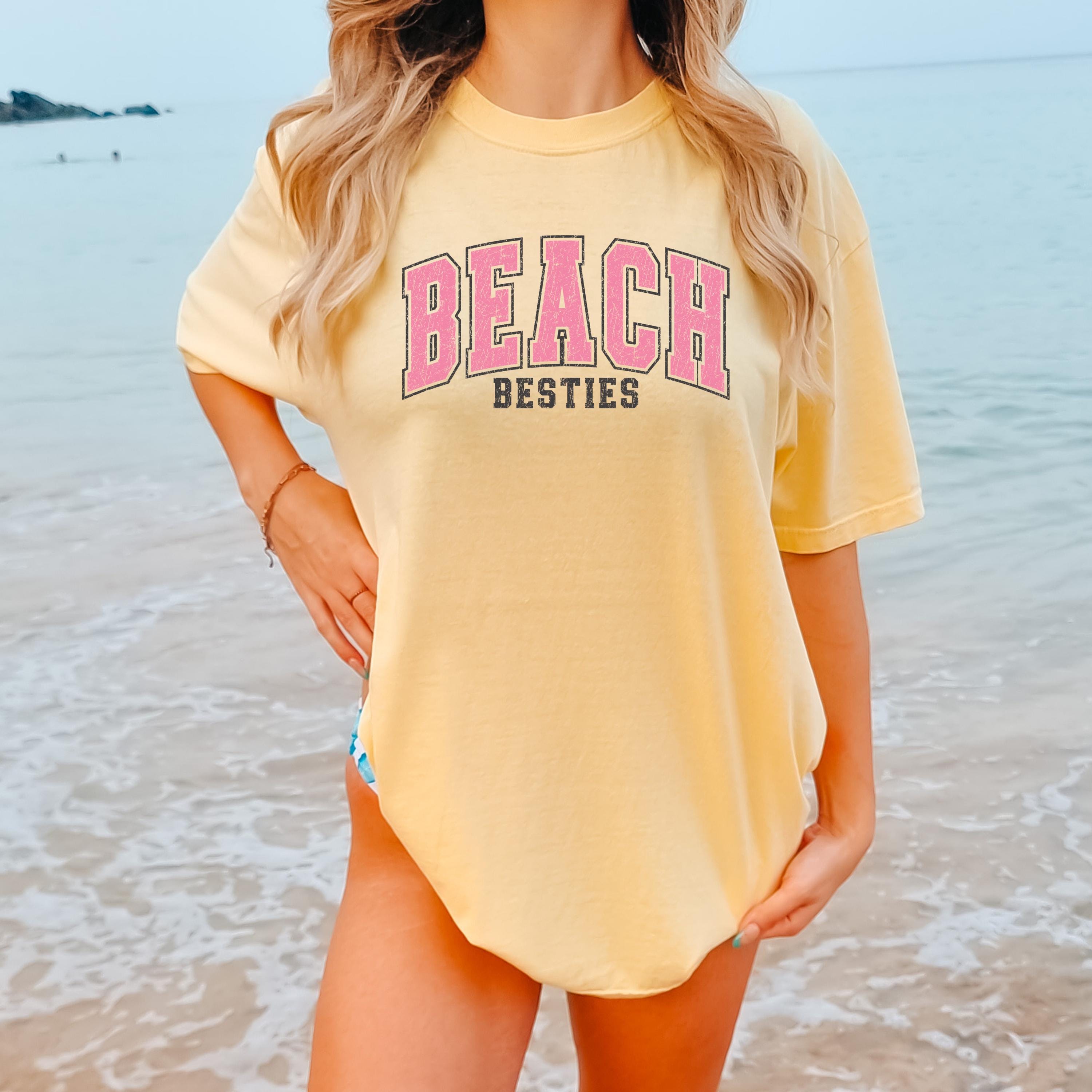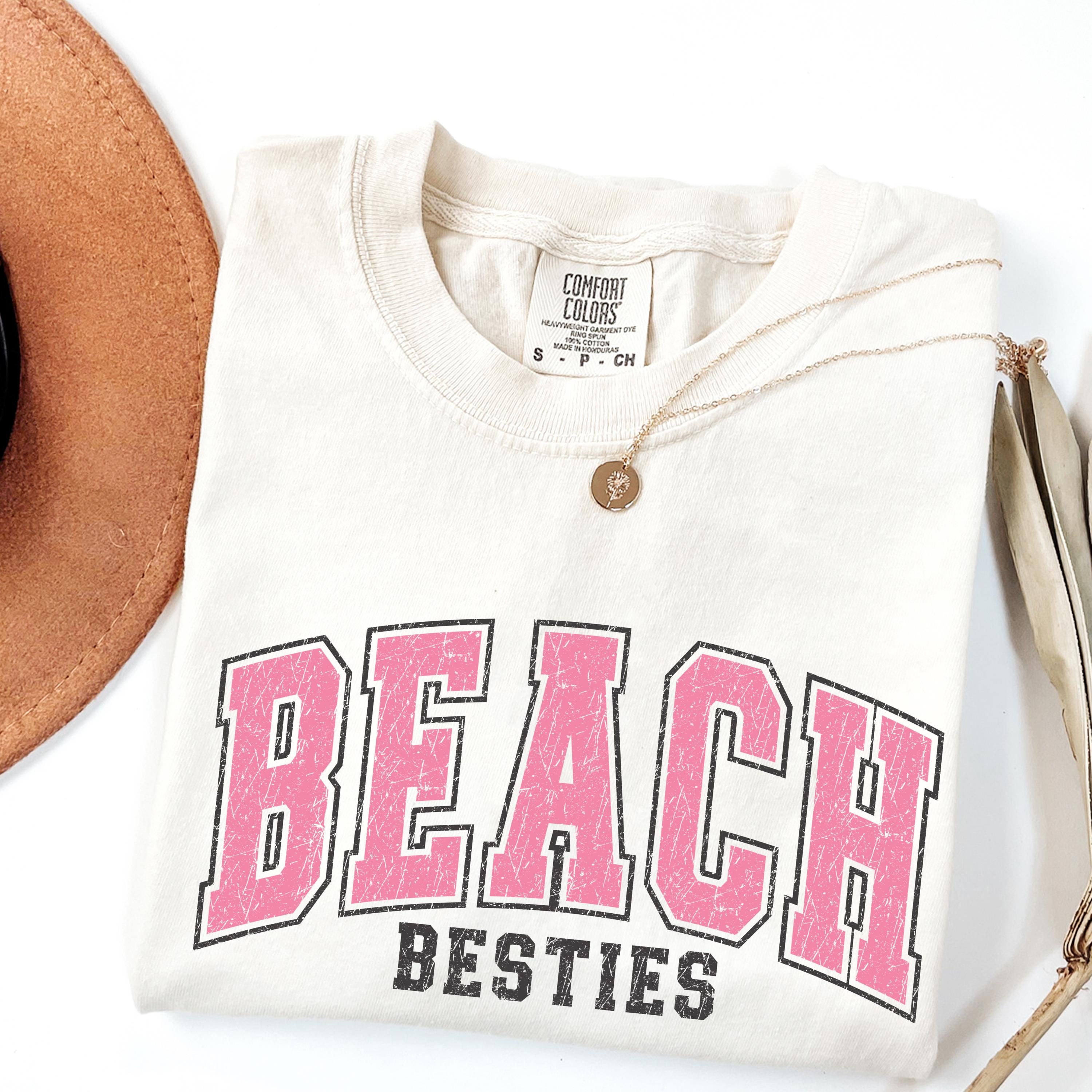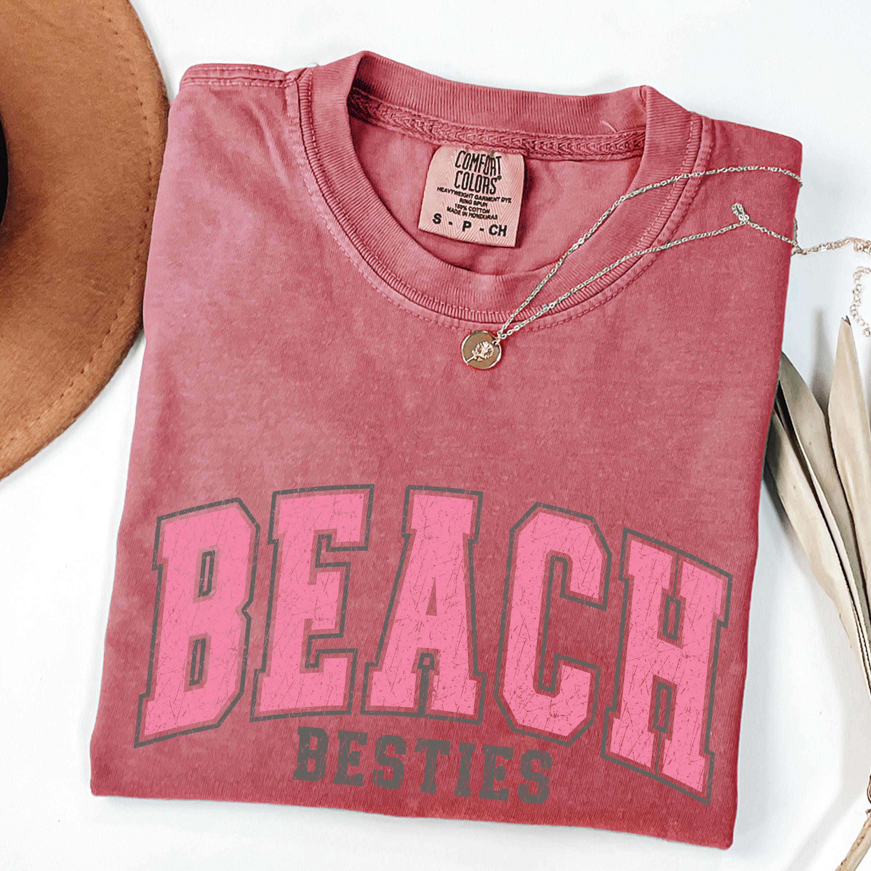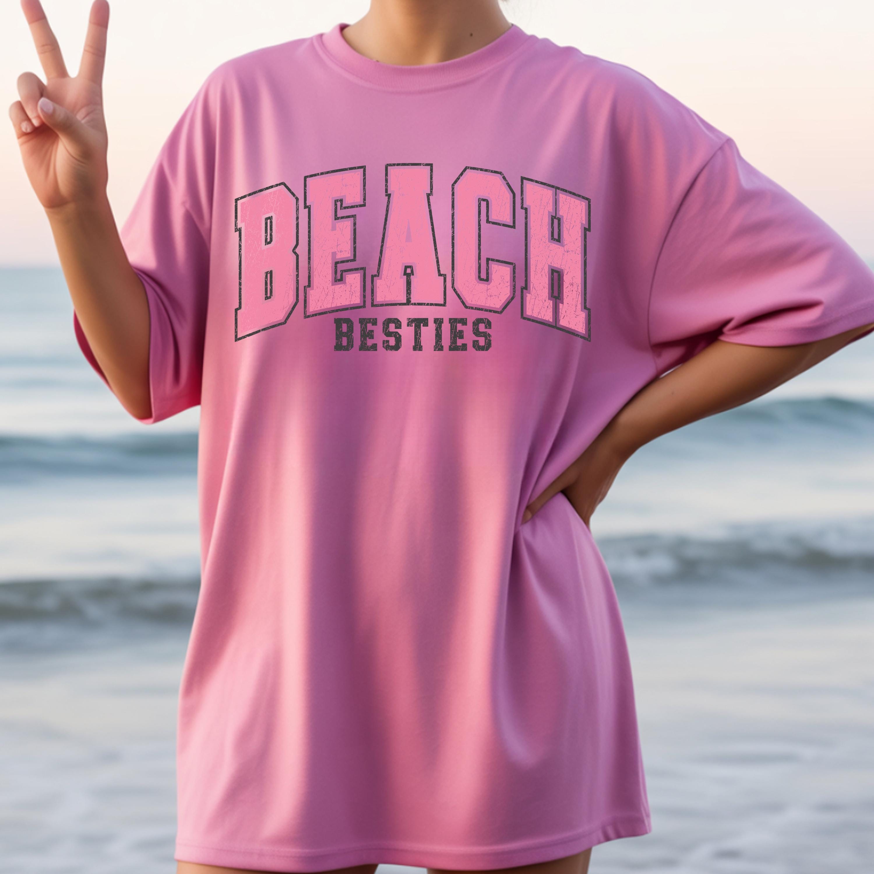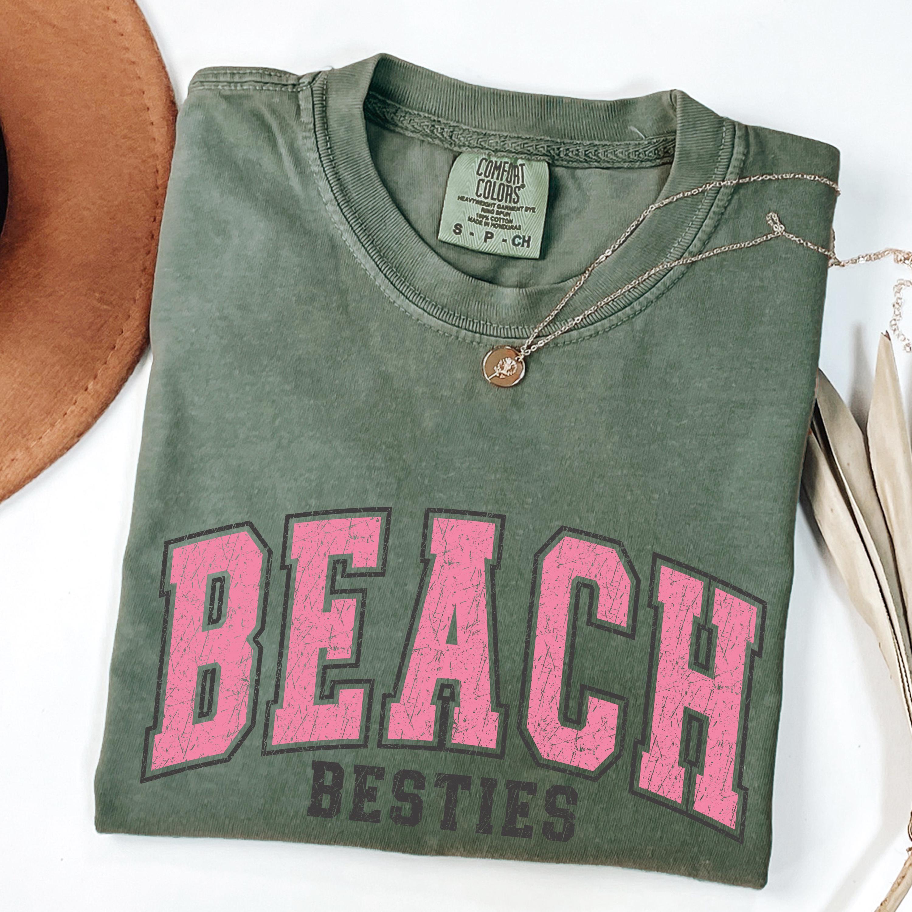 Perfect to pair with denim shorts, bikinis, or oversized layers, this beach besties tee is great for relaxed, trendy outfits.