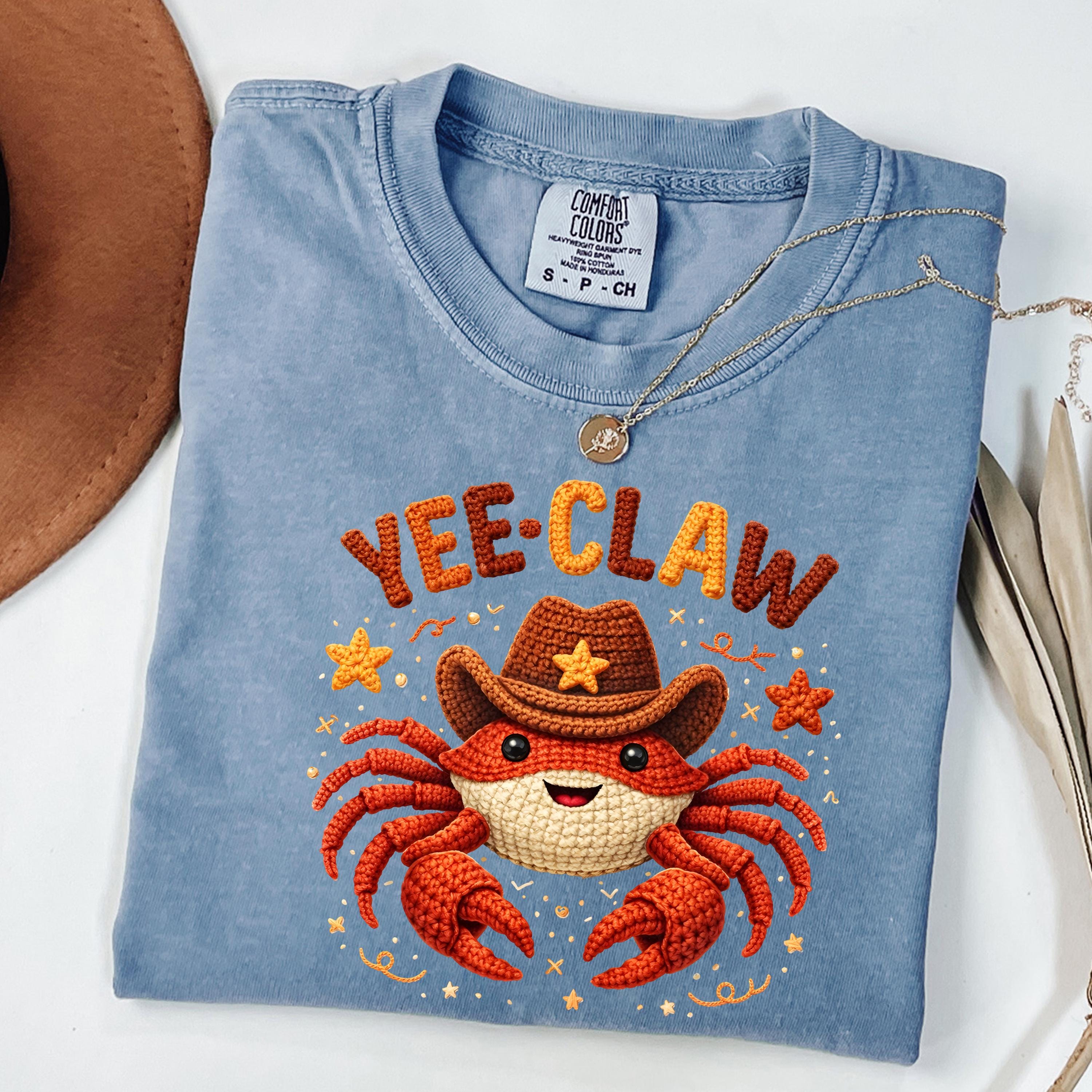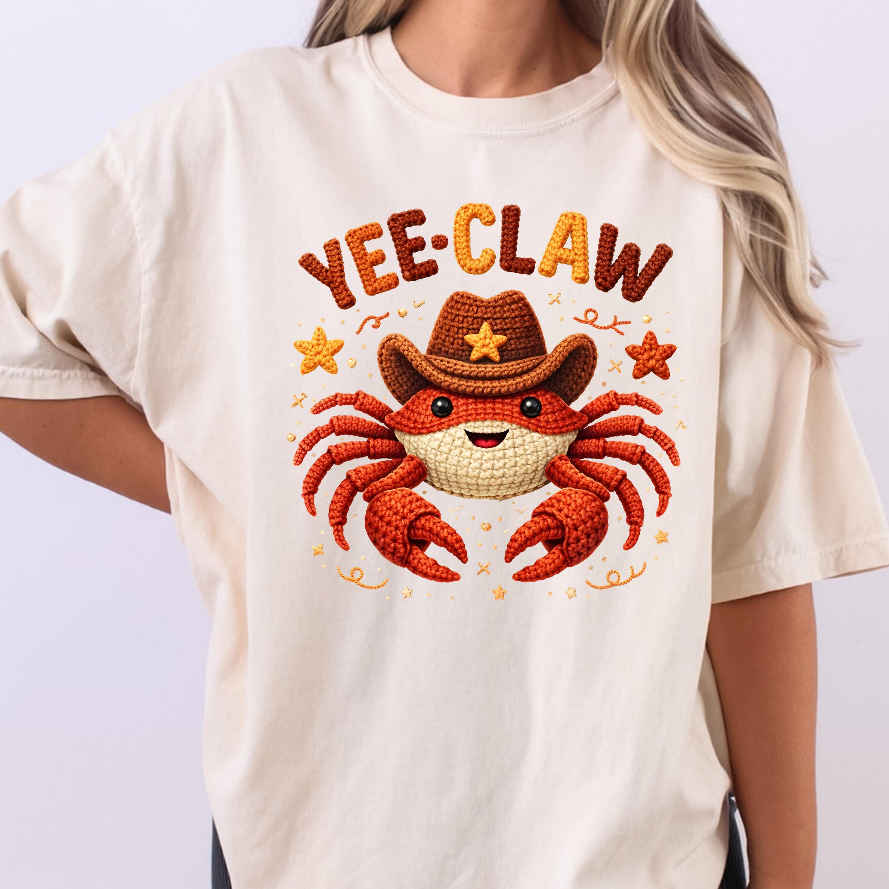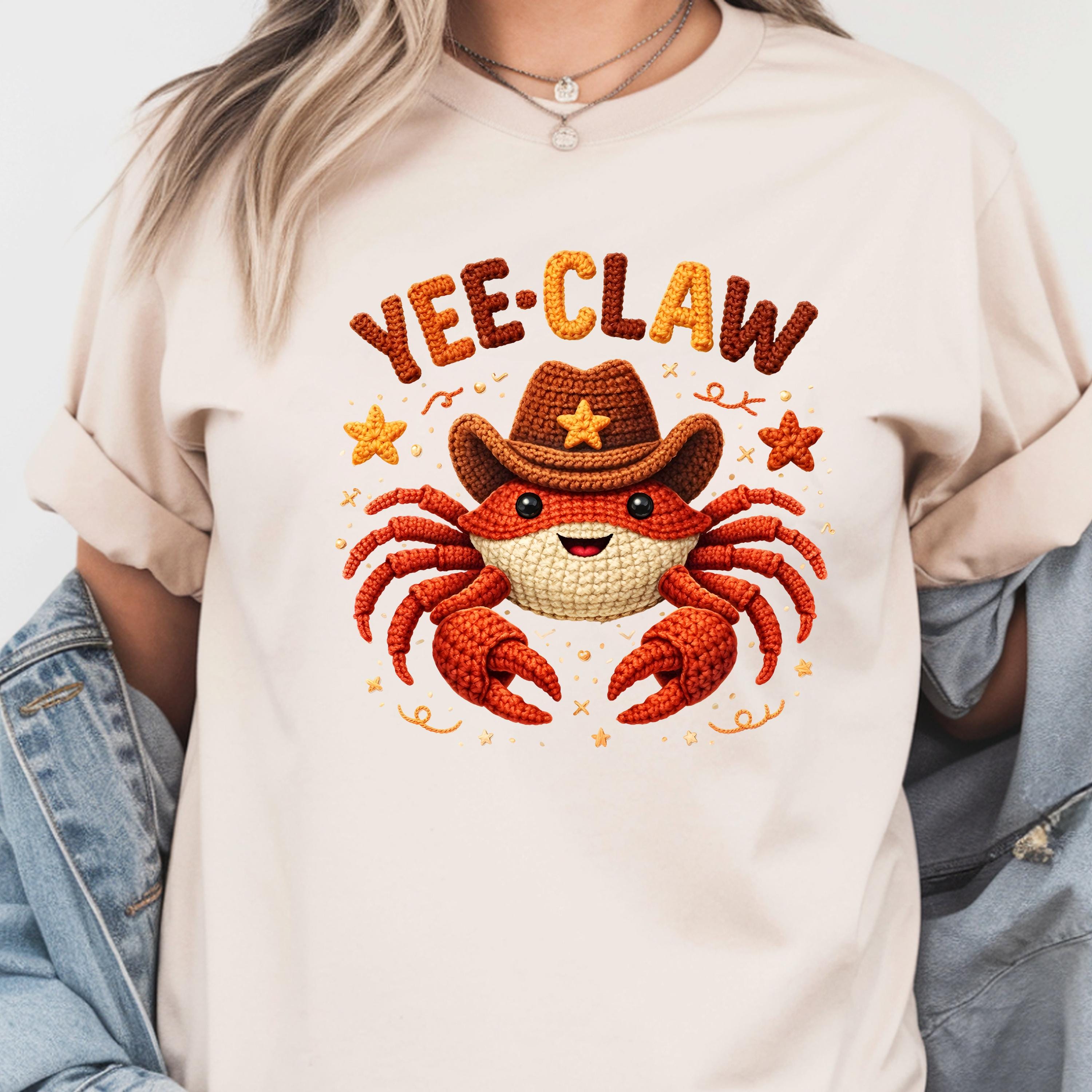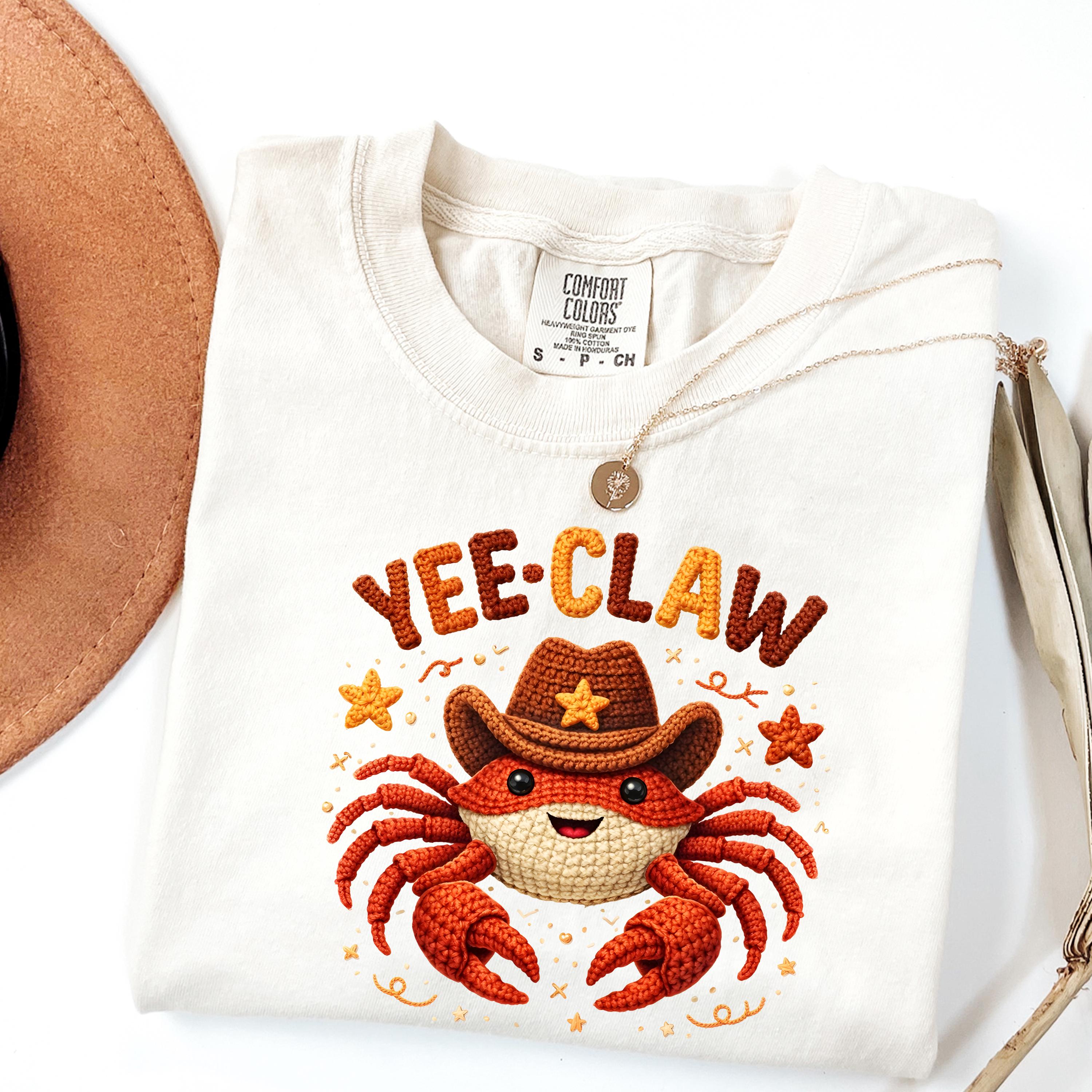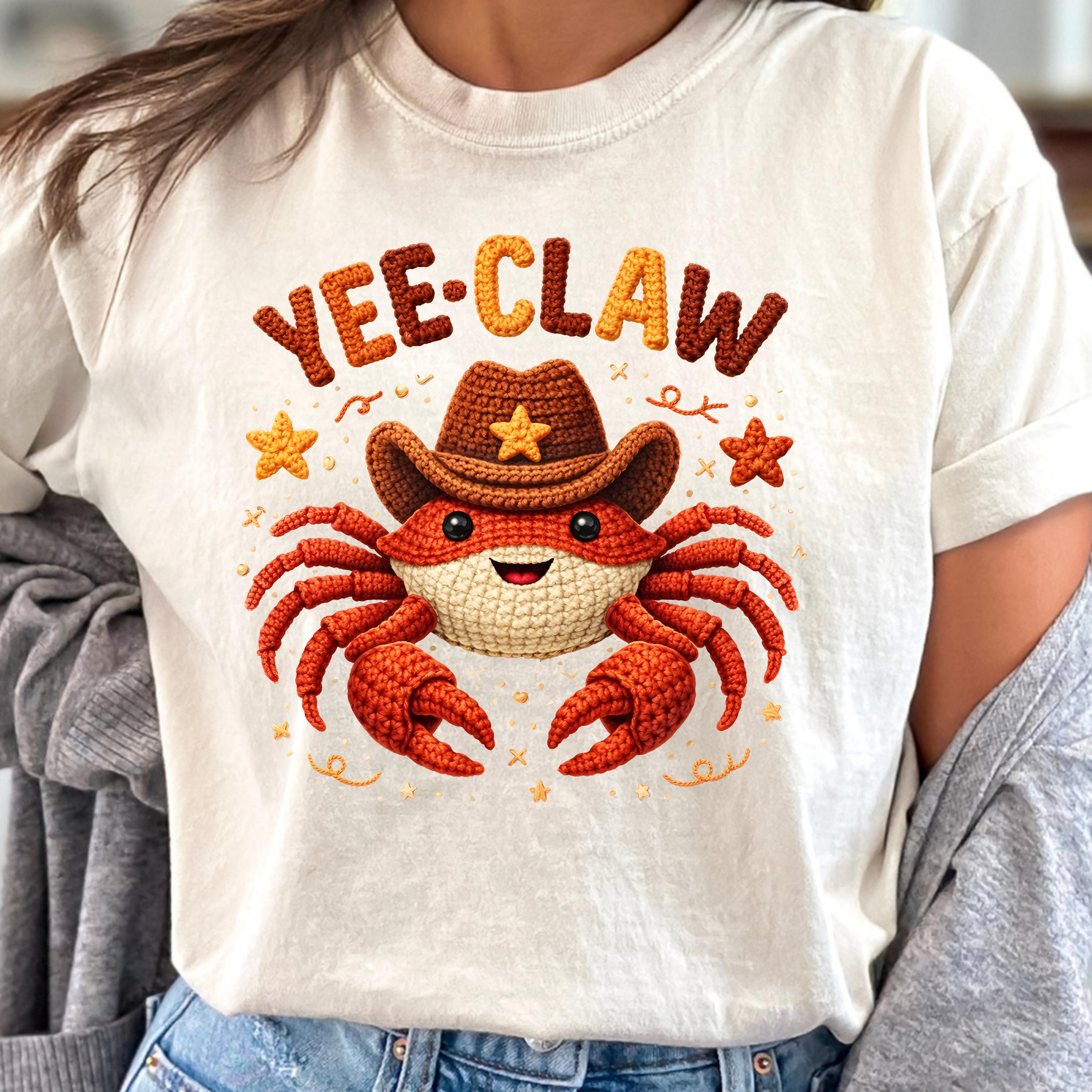 This adorable Yee Claw Crab Shirt combines western cowboy style with a cute and playful twist. Featuring a smiling crab wearing a cowboy hat, this design stands out with its detailed faux crochet look, giving the print a cozy, handmade appearance while remaining a lightweight graphic tee.