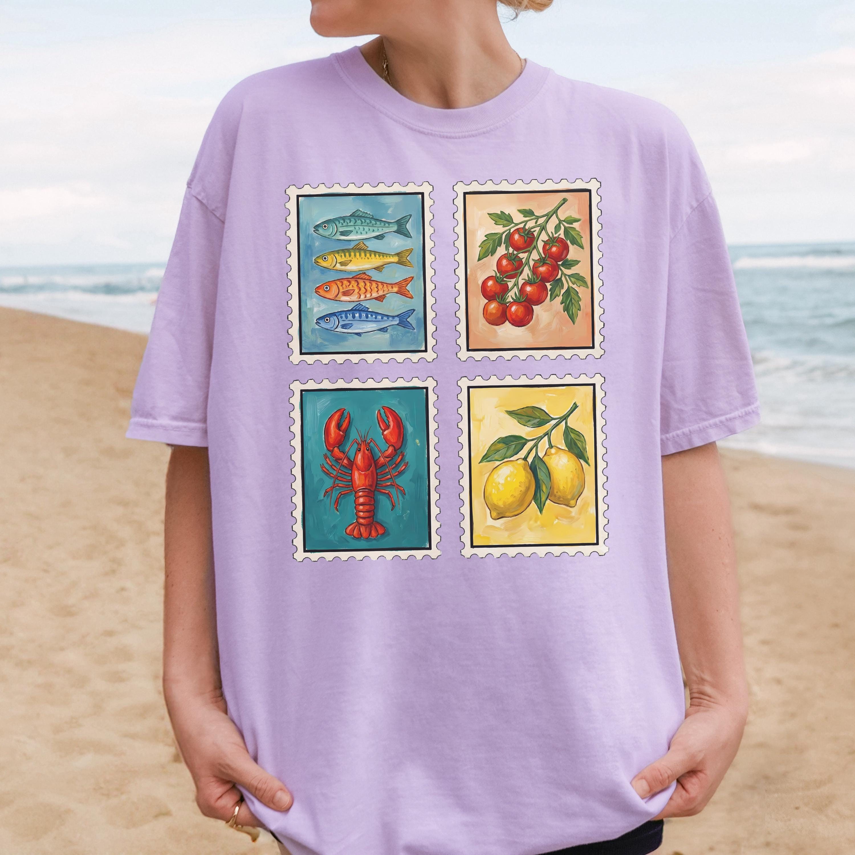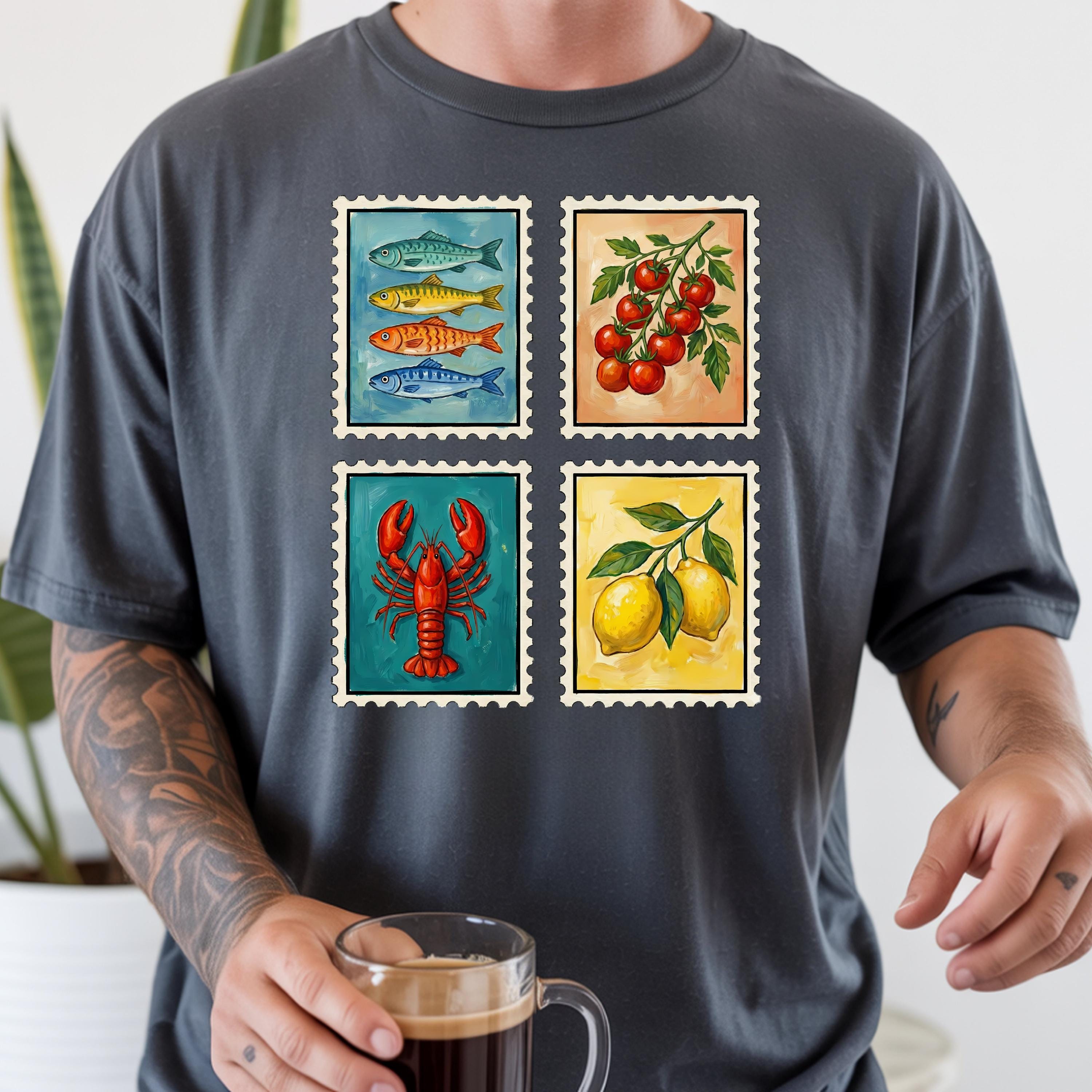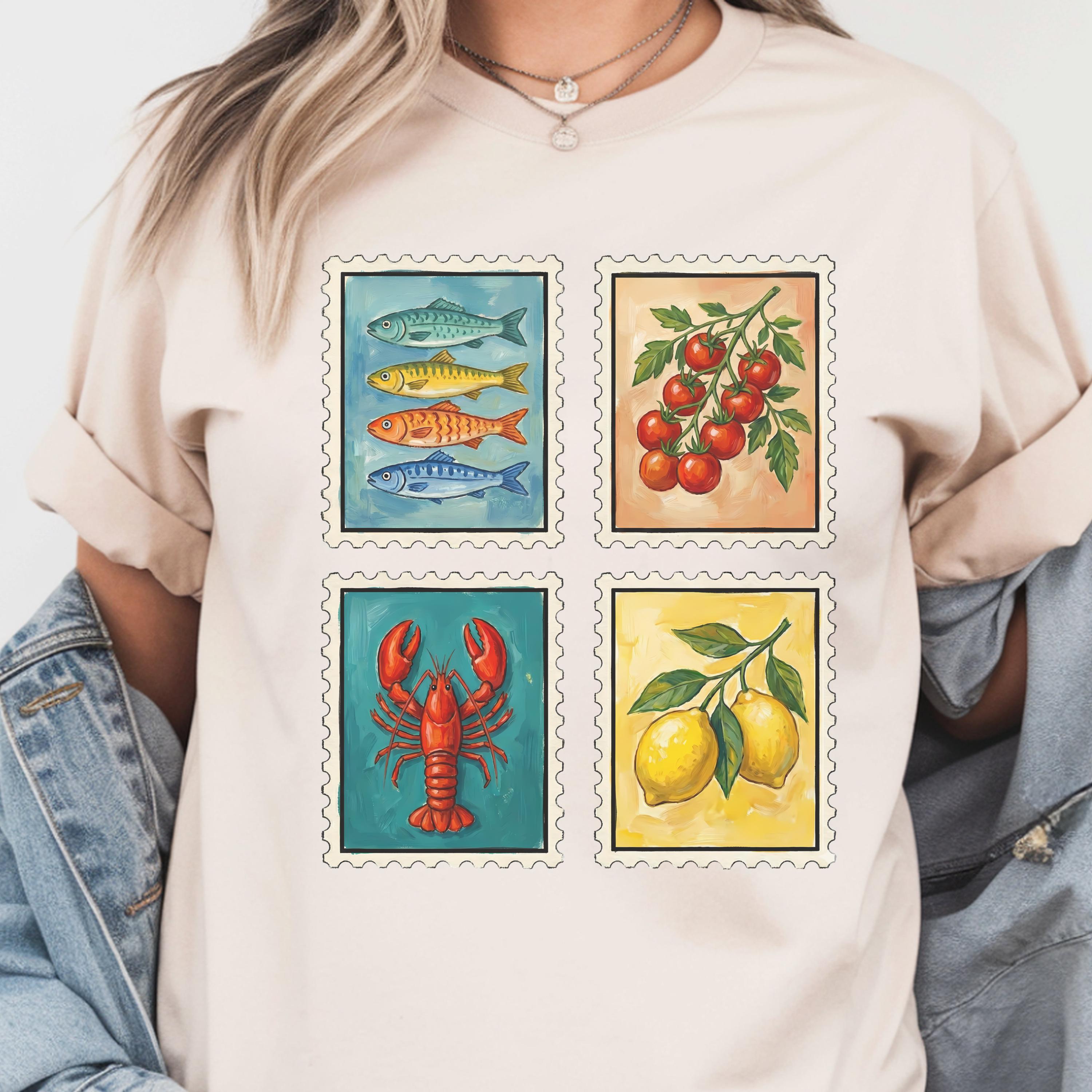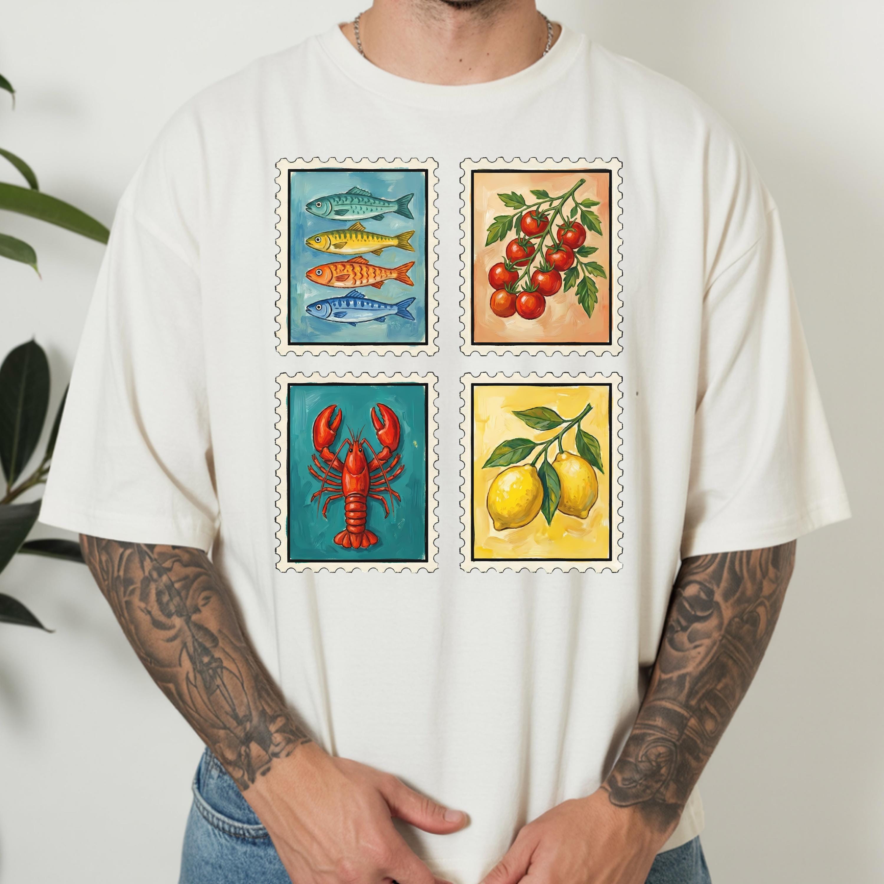 If you're searching for a Mediterranean shirt, Italian food tee, kitchen graphic shirt, lobster and fish shirt, or vintage stamp art tee, this design offers a stylish and unique option that fits both casual wear and statement outfits.