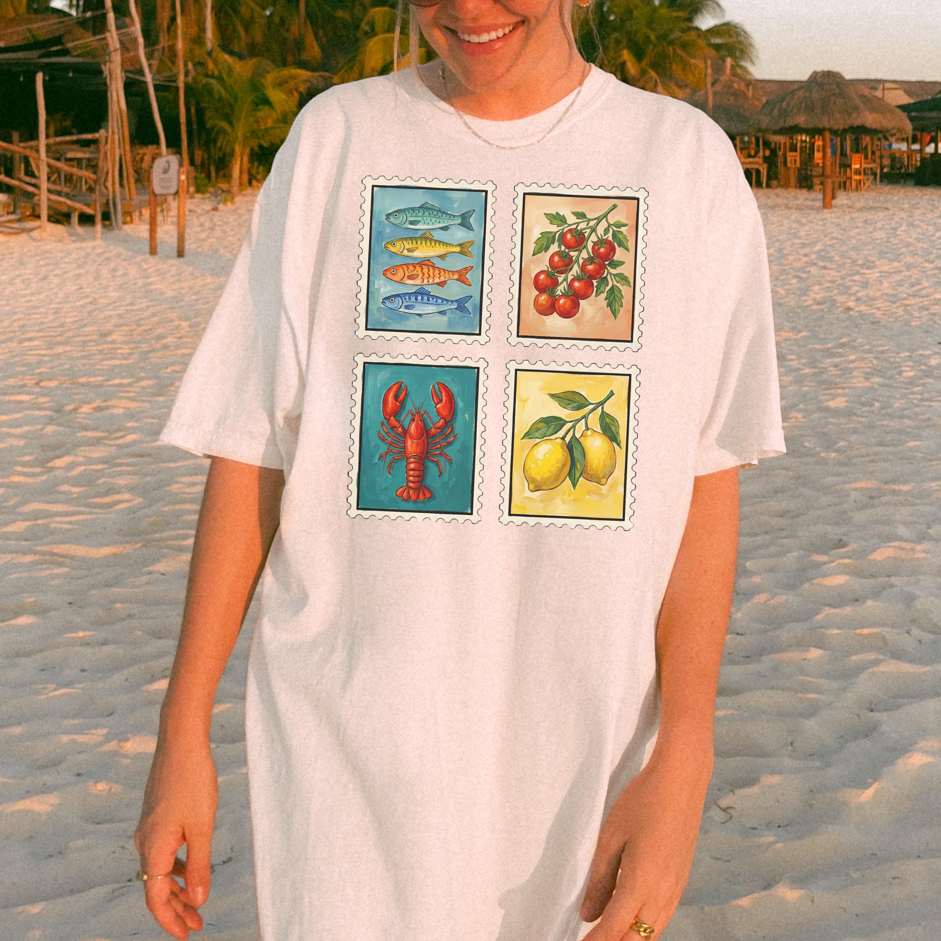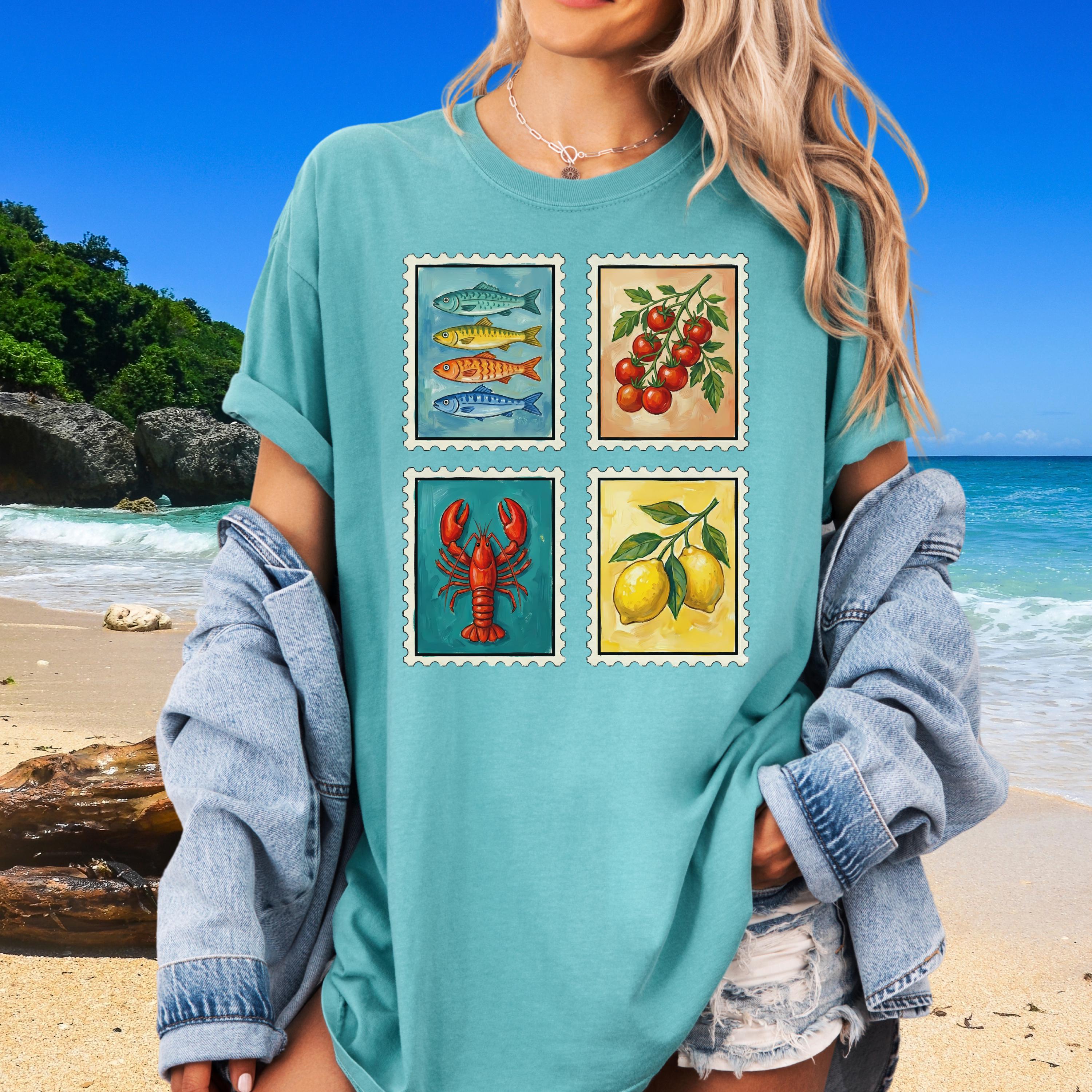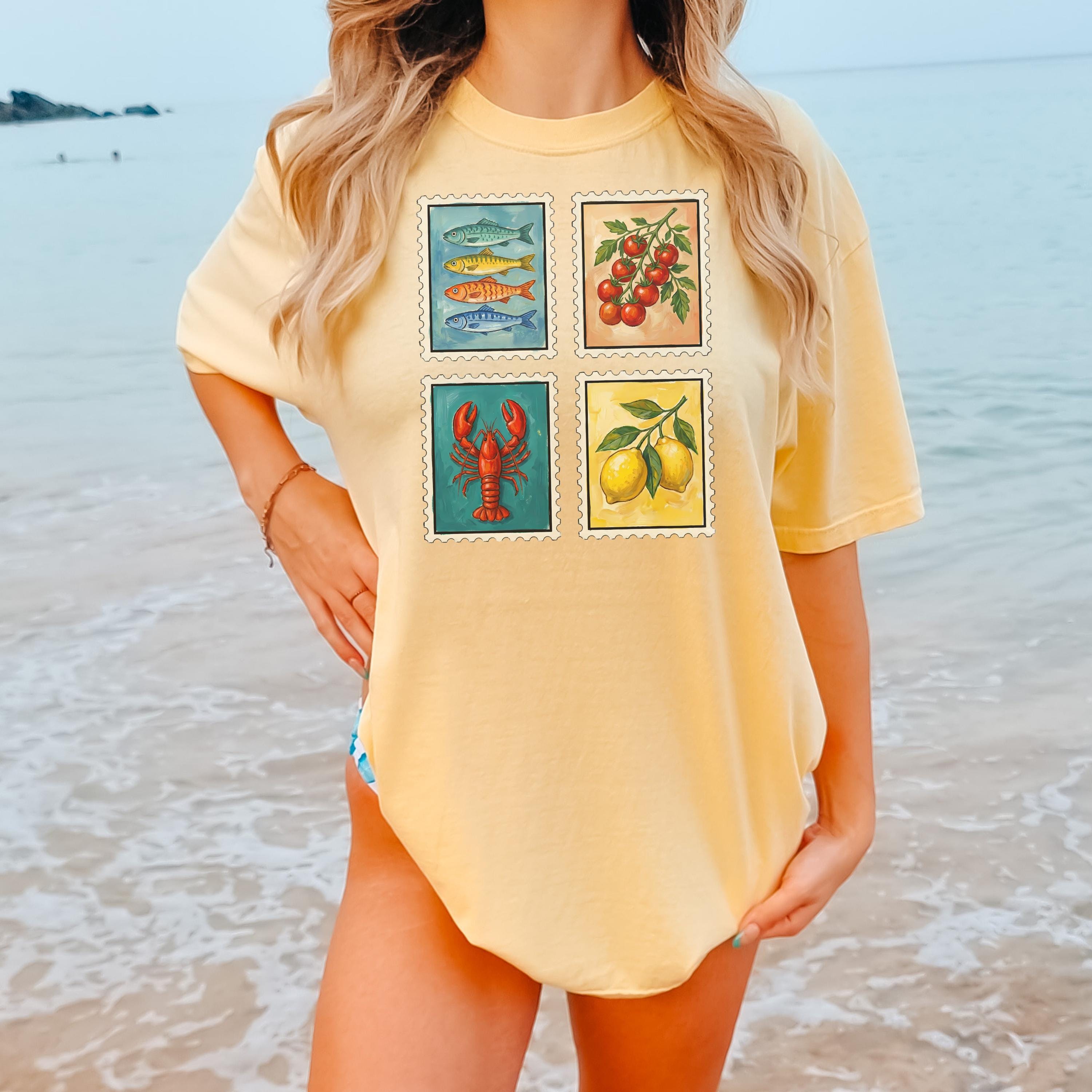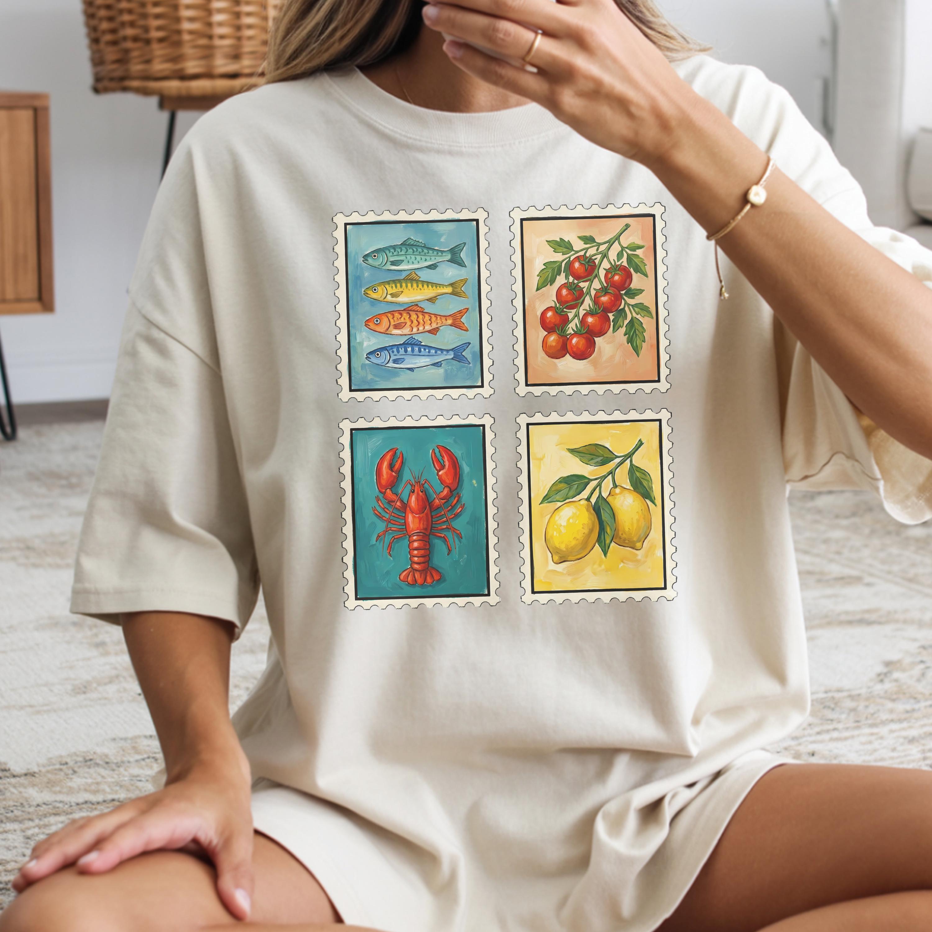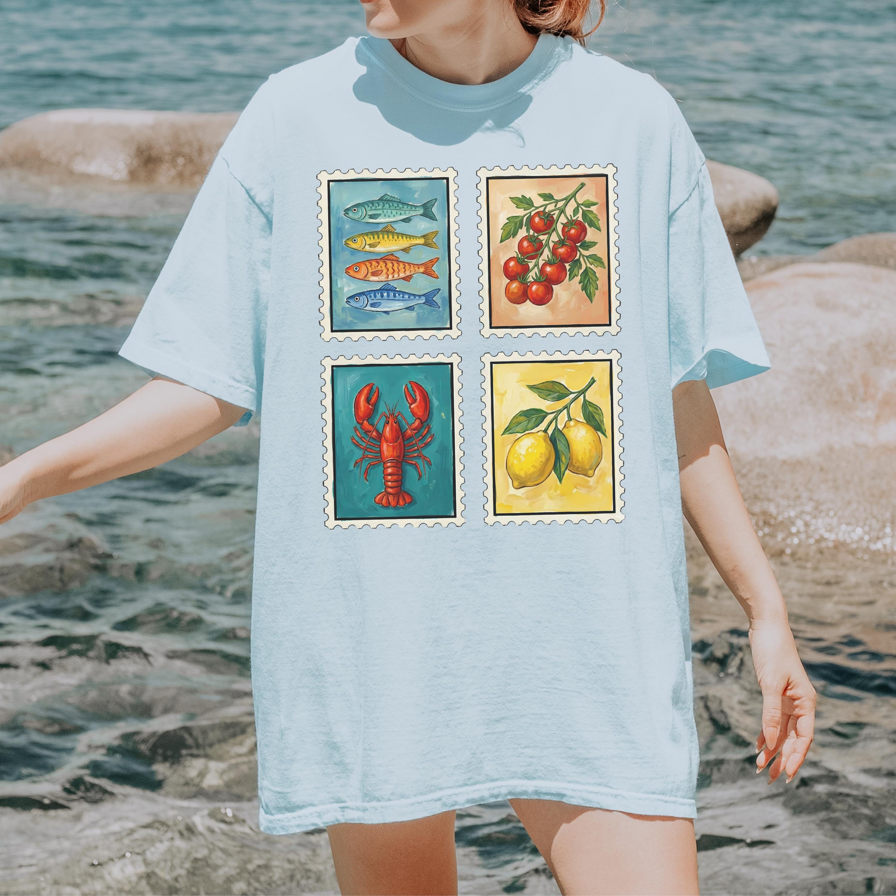 If you're searching for a Mediterranean shirt, Italian food tee, kitchen graphic shirt, lobster and fish shirt, or vintage stamp art tee, this design offers a stylish and unique option that fits both casual wear and statement outfits.