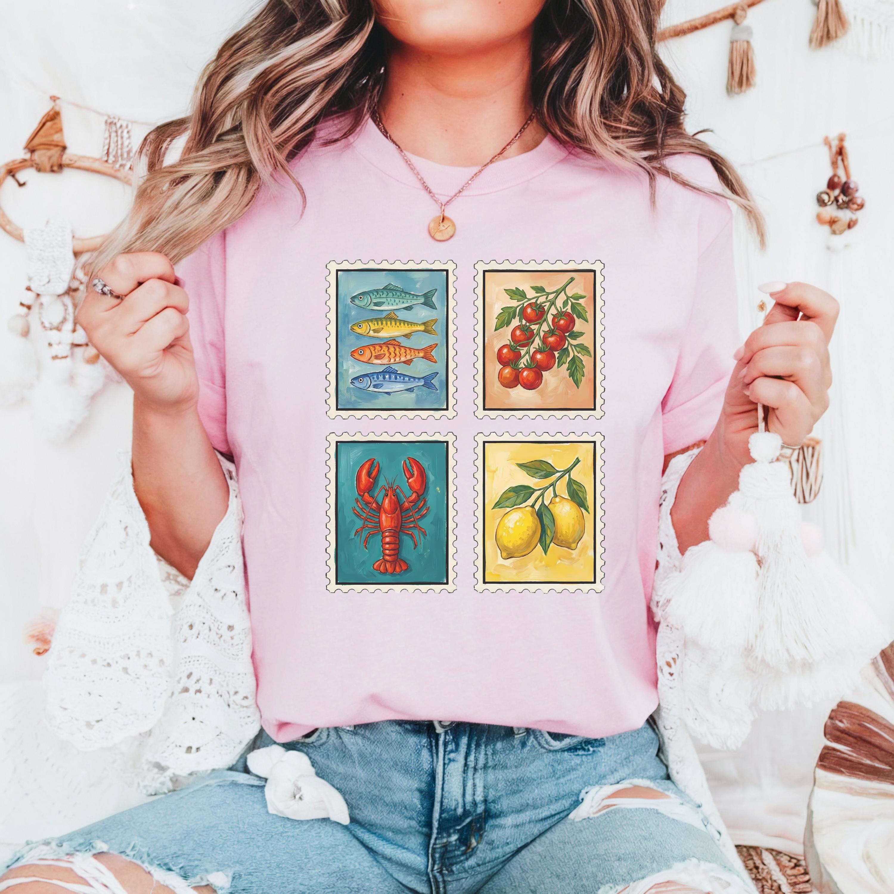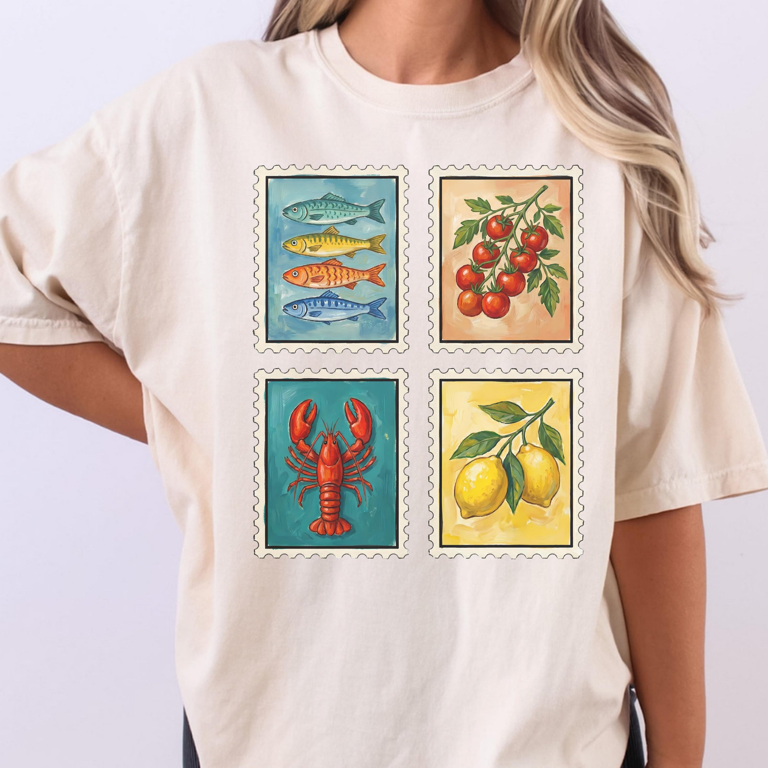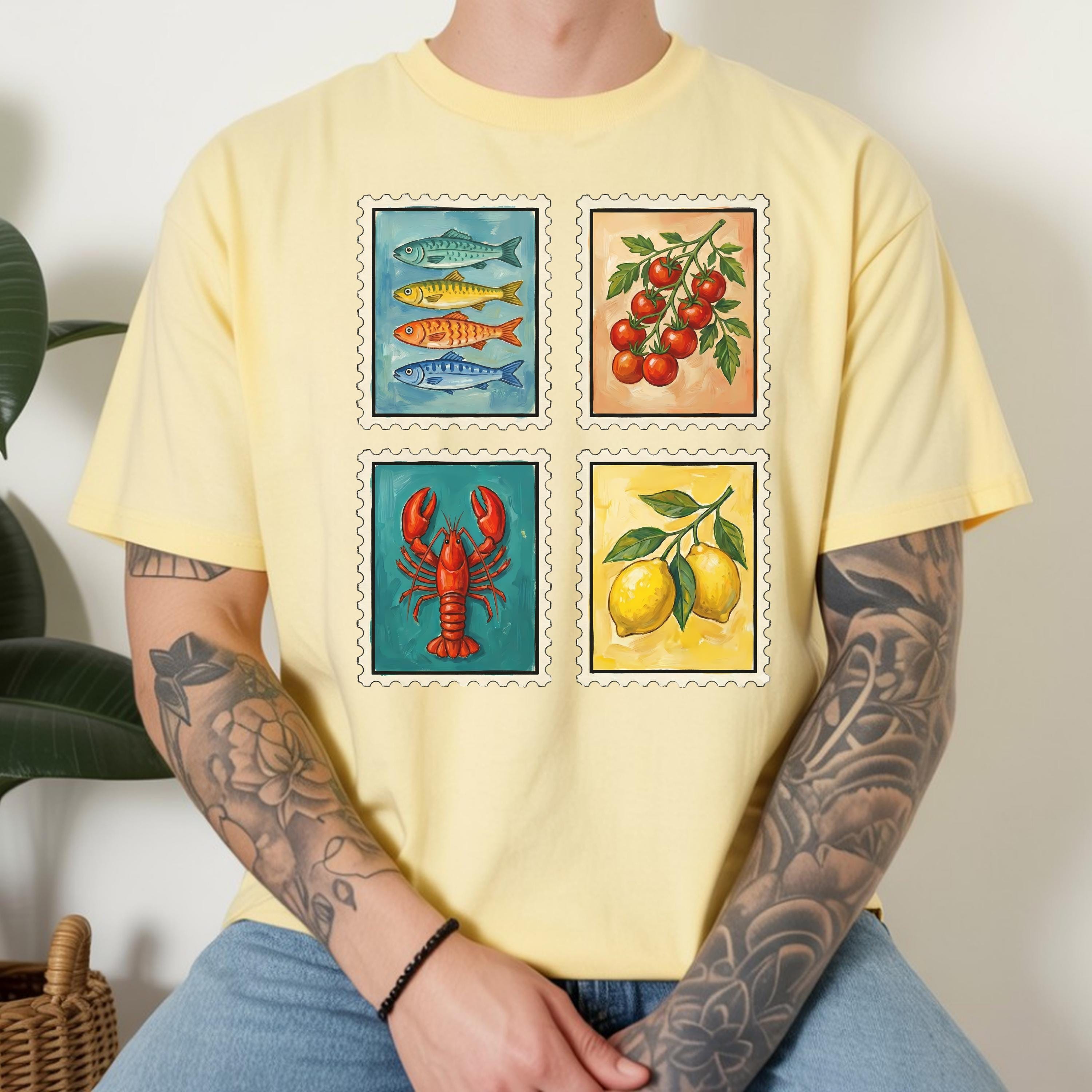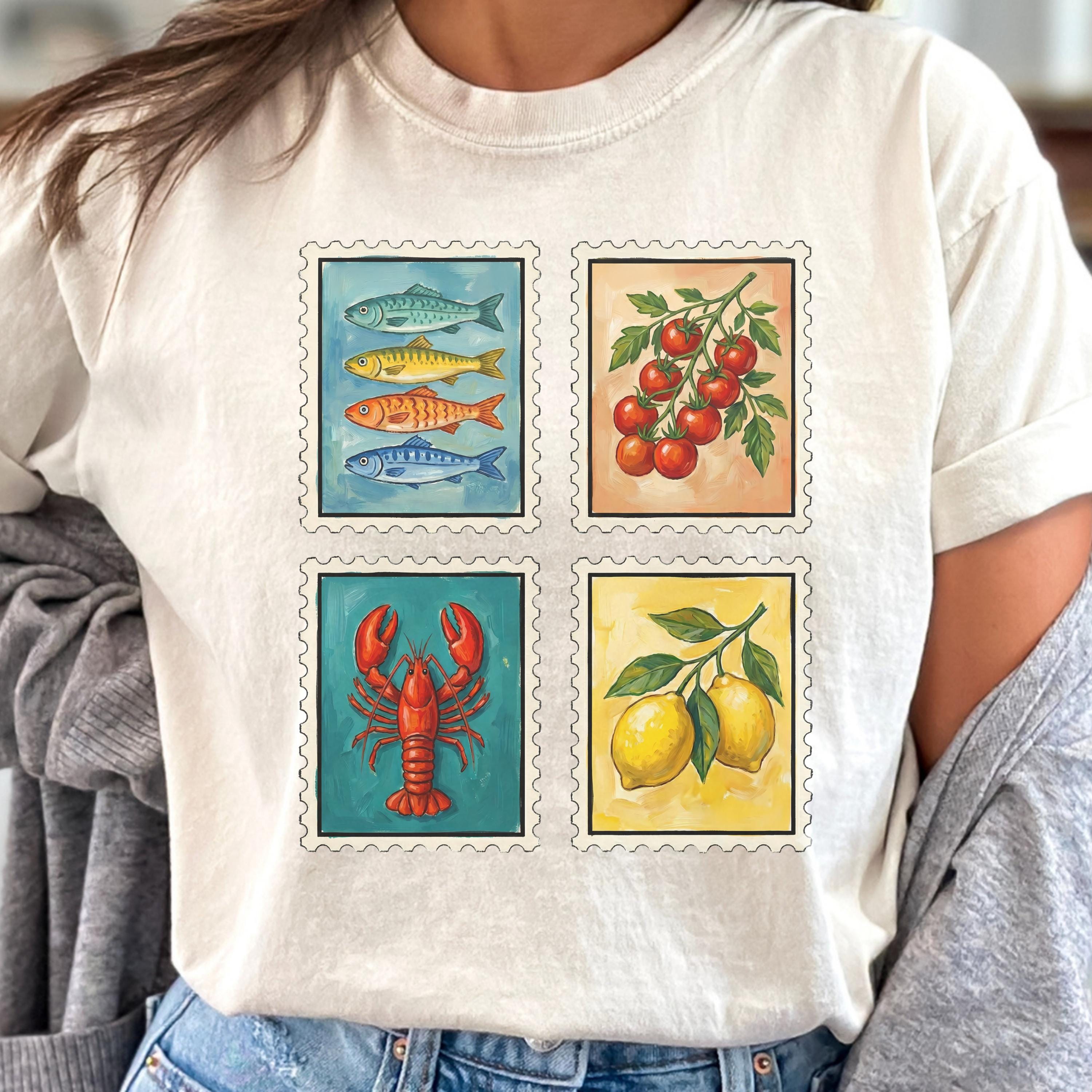 This unique Mediterranean Food Shirt features a beautifully illustrated postage stamp-style design with fish, lobster, tomatoes, and lemons, inspired by classic Italian kitchen and coastal cuisine aesthetics. Each element is designed like a vintage stamp, creating a charming artistic collage look that stands out.
