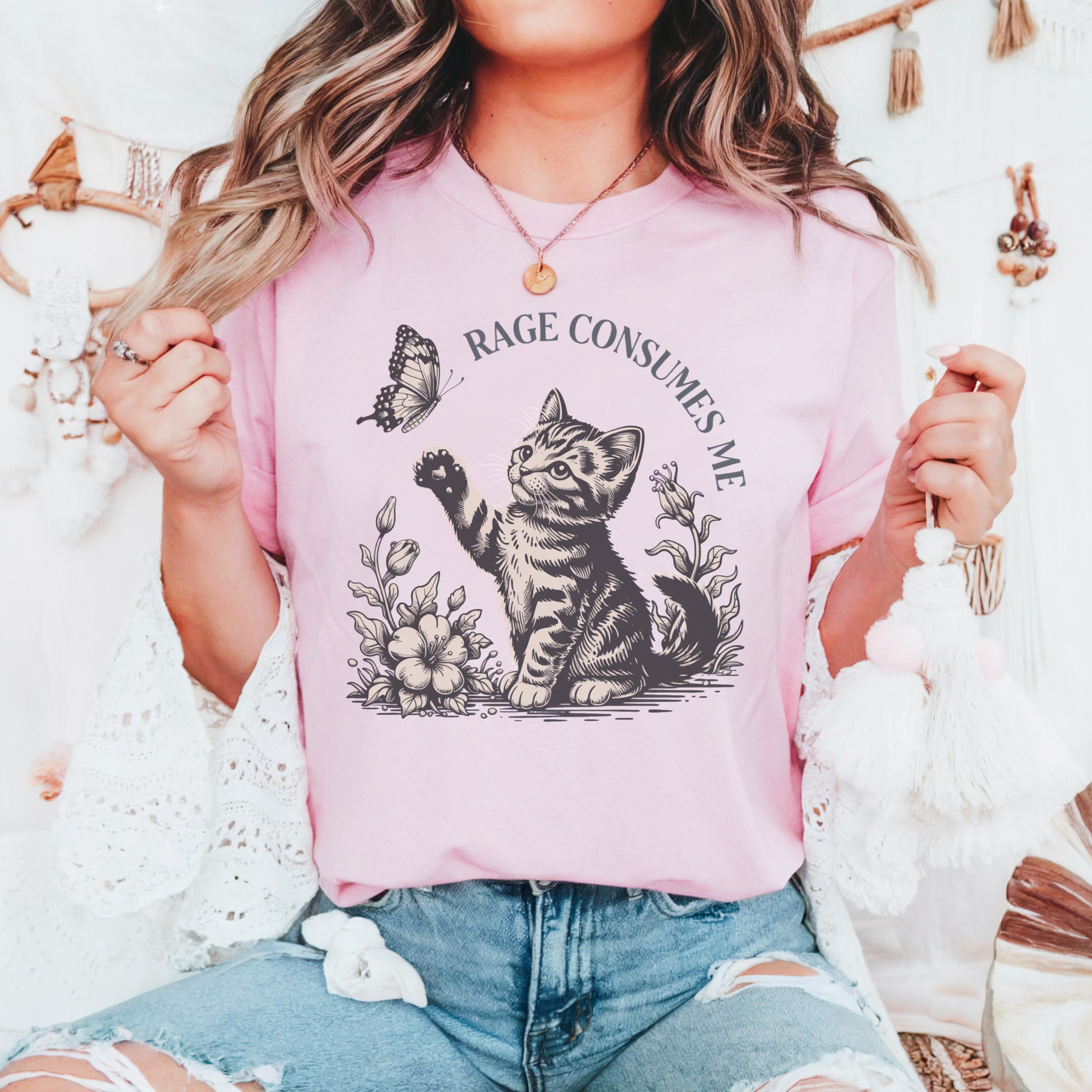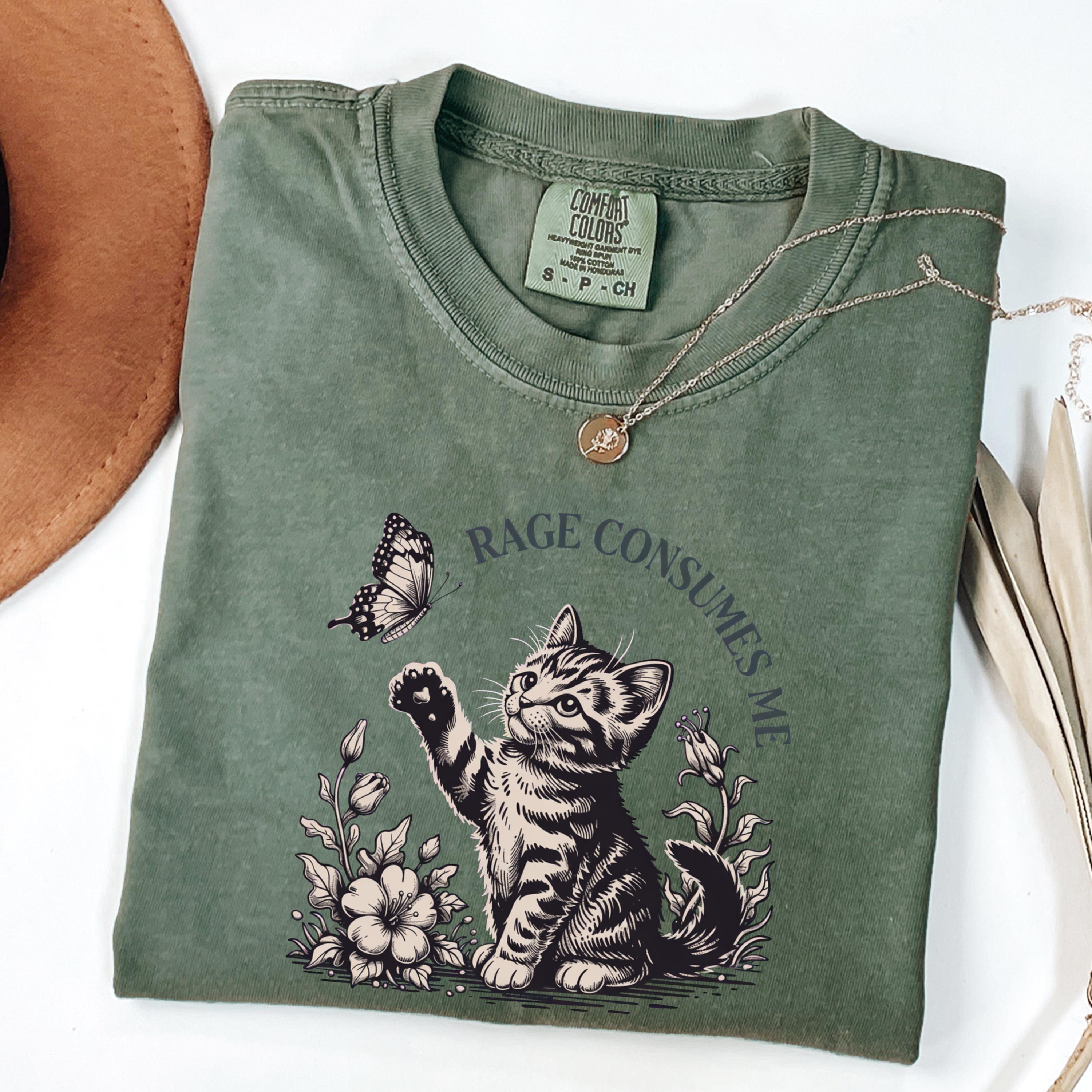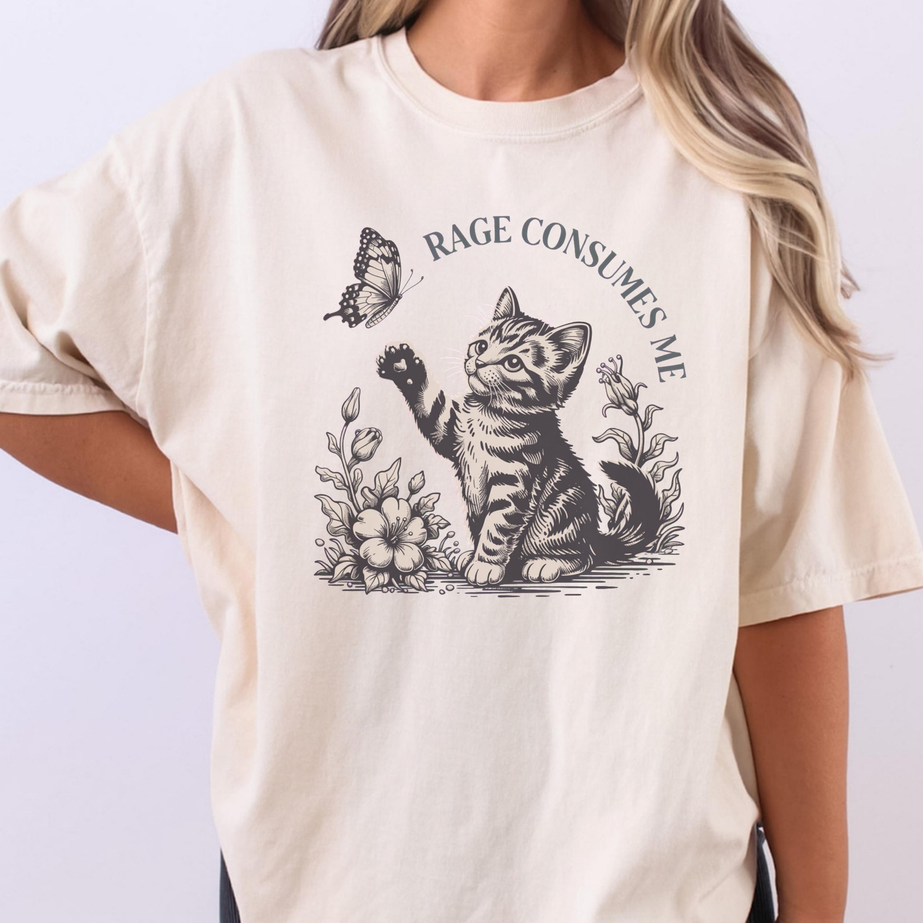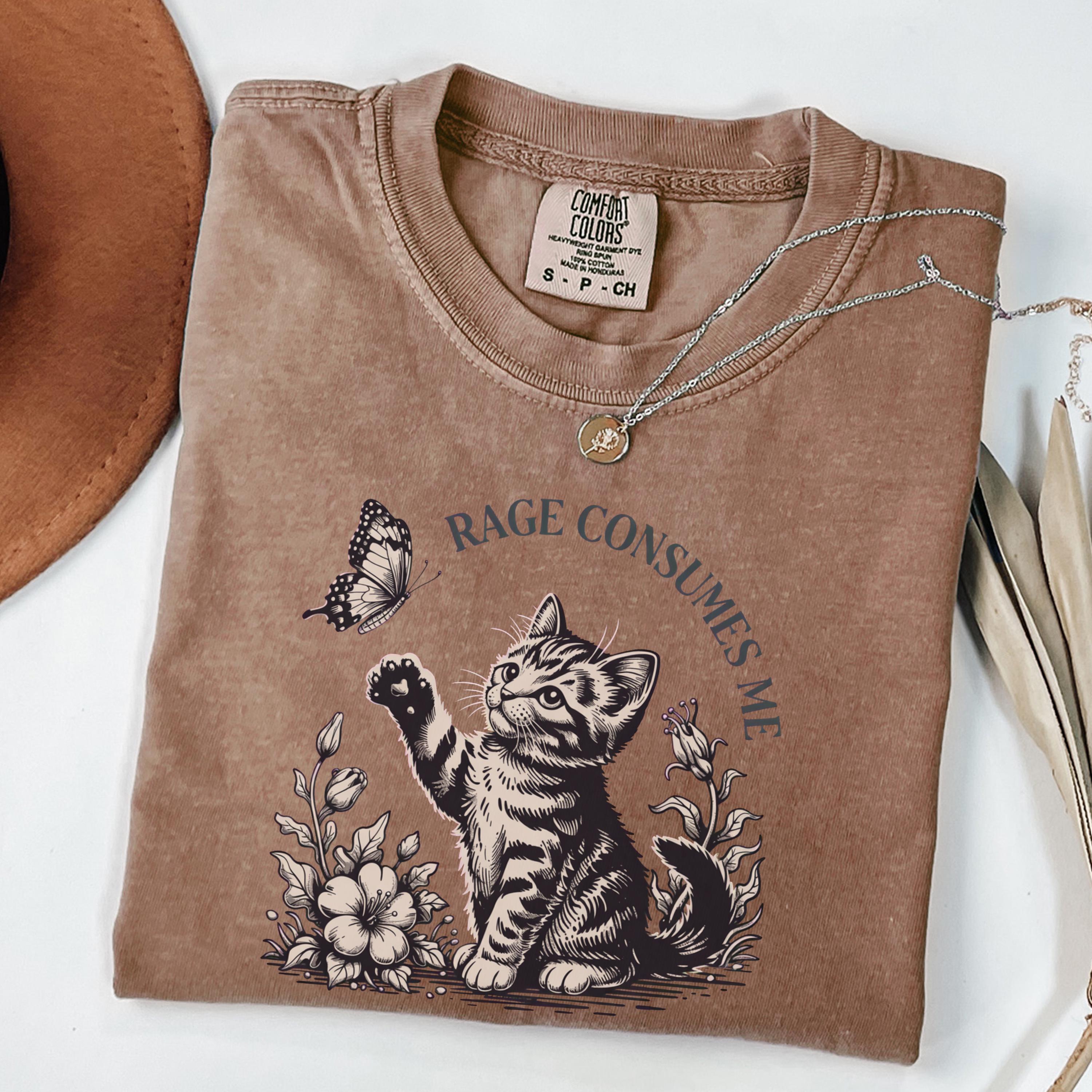 This beautifully illustrated comfort colors tee features a soft vintage-style kitten reaching toward a butterfly with the subtle phrase “Rage Consumes Me,” blending gentle aesthetics with hidden humor. The contrast between the sweet floral scene and ironic message makes this design unique, eye-catching, and highly shareable.