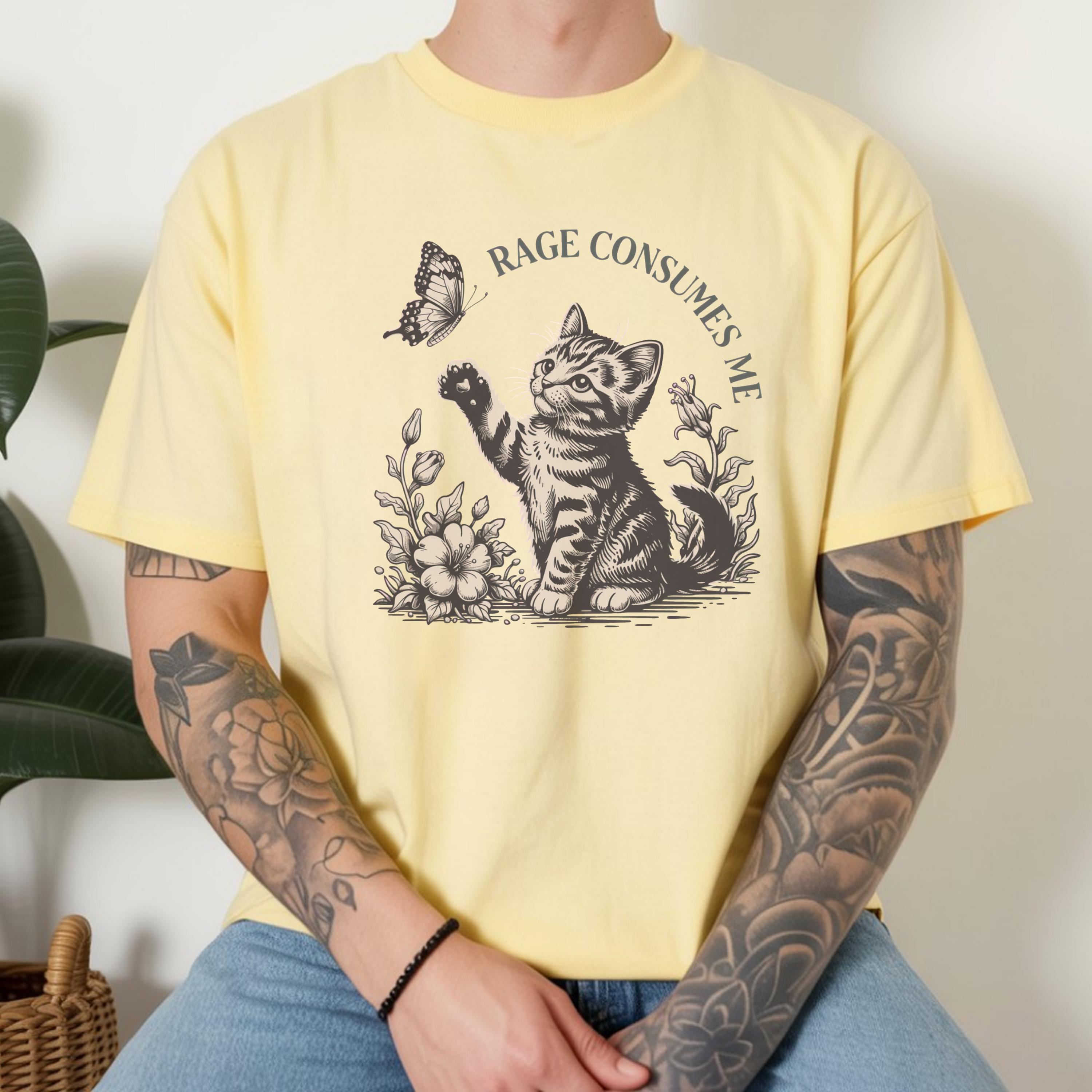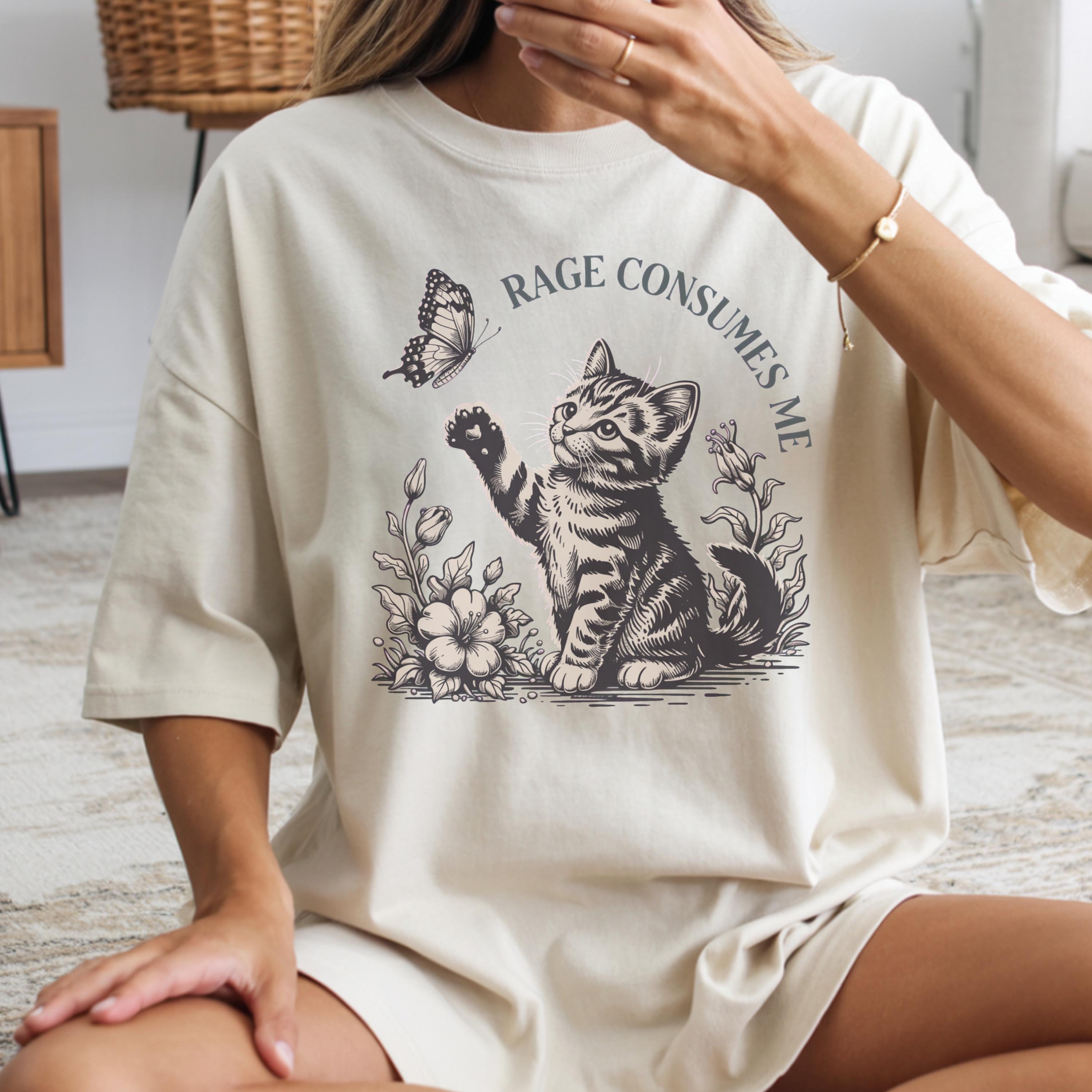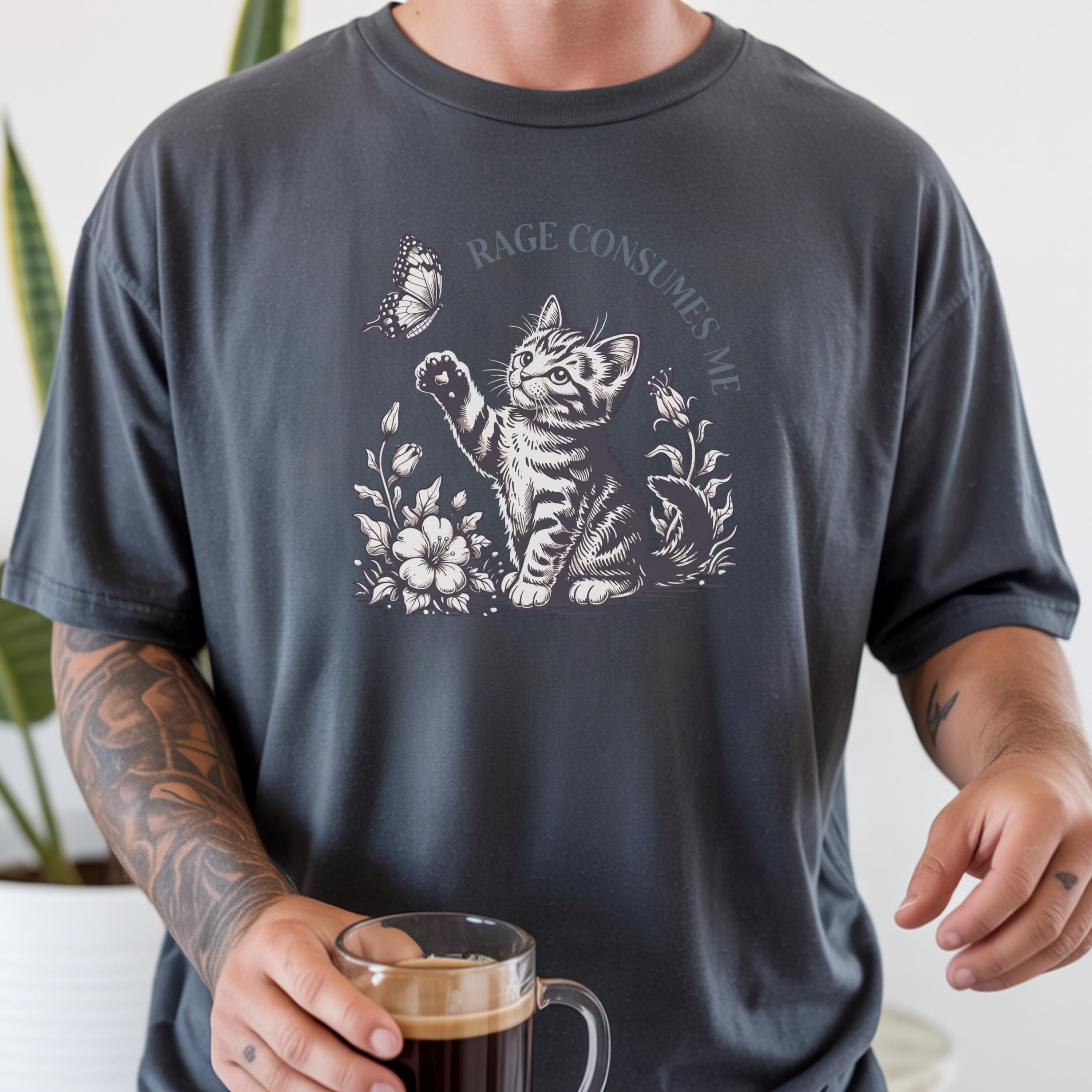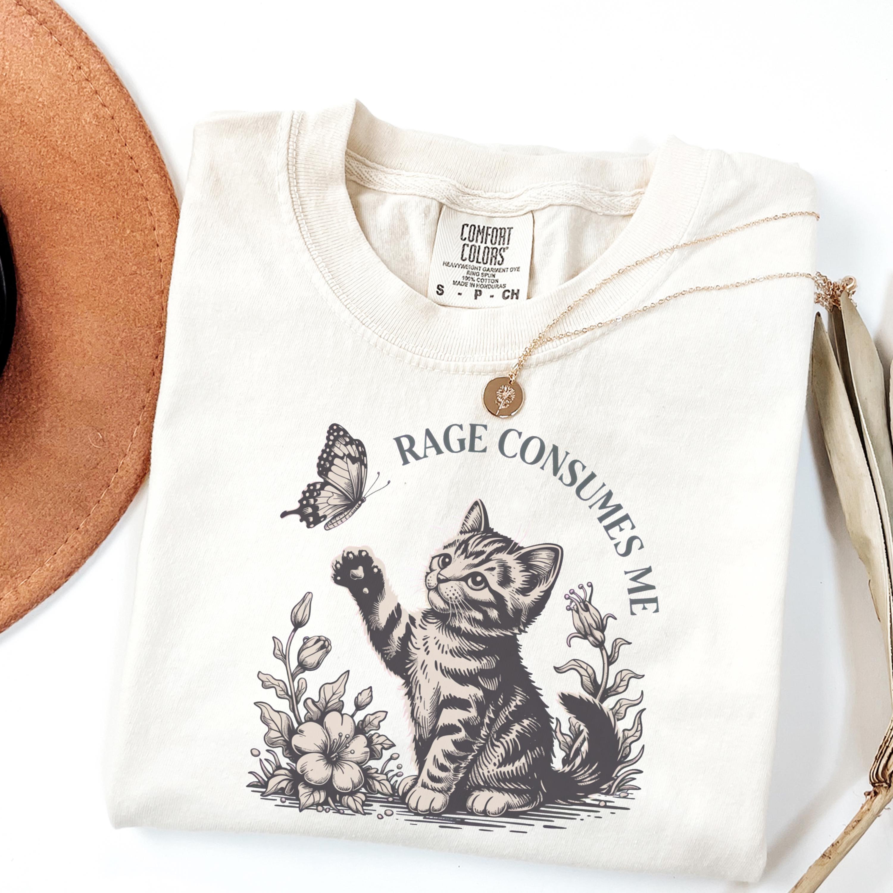 This beautifully illustrated comfort colors tee features a soft vintage-style kitten reaching toward a butterfly with the subtle phrase “Rage Consumes Me,” blending gentle aesthetics with hidden humor. The contrast between the sweet floral scene and ironic message makes this design unique, eye-catching, and highly shareable.