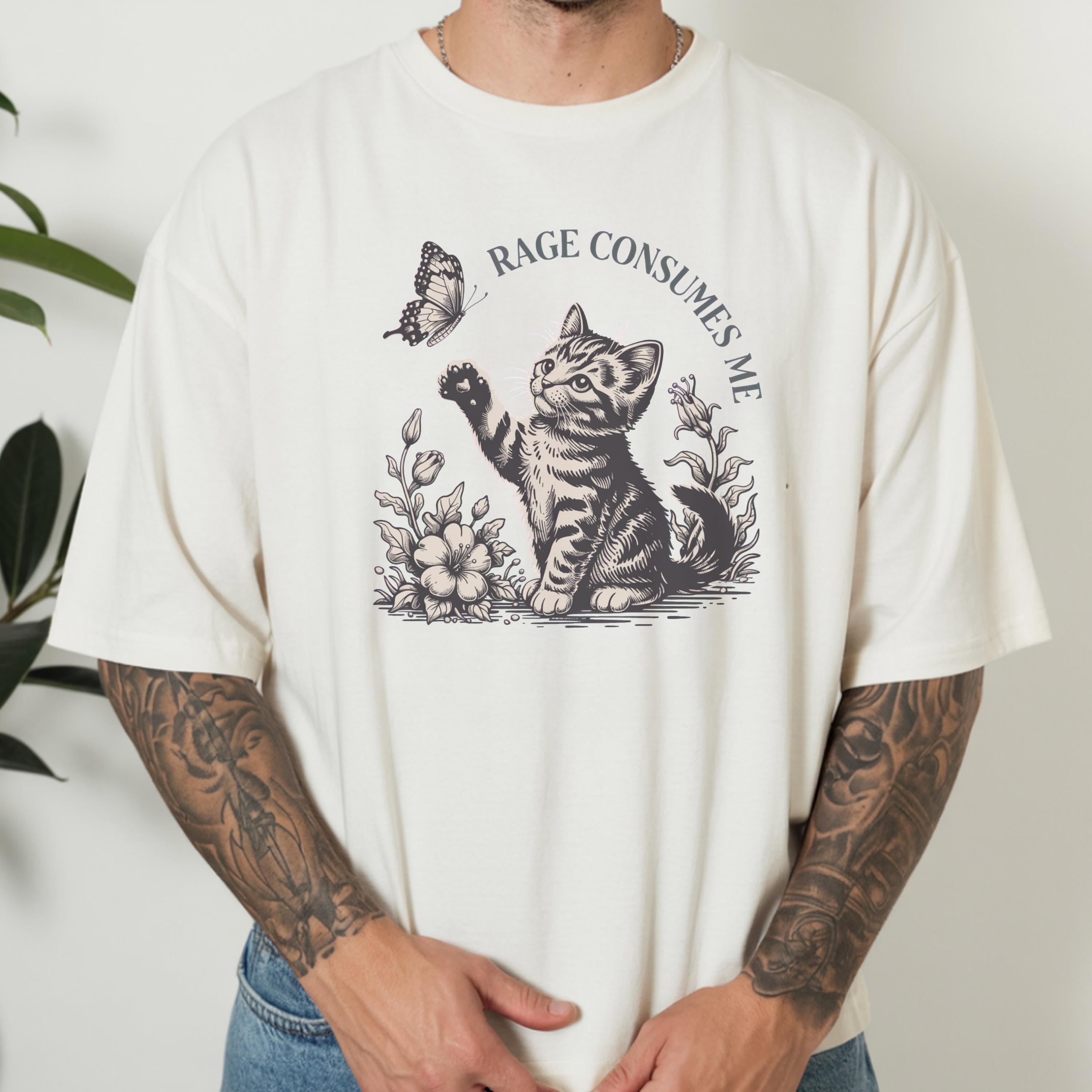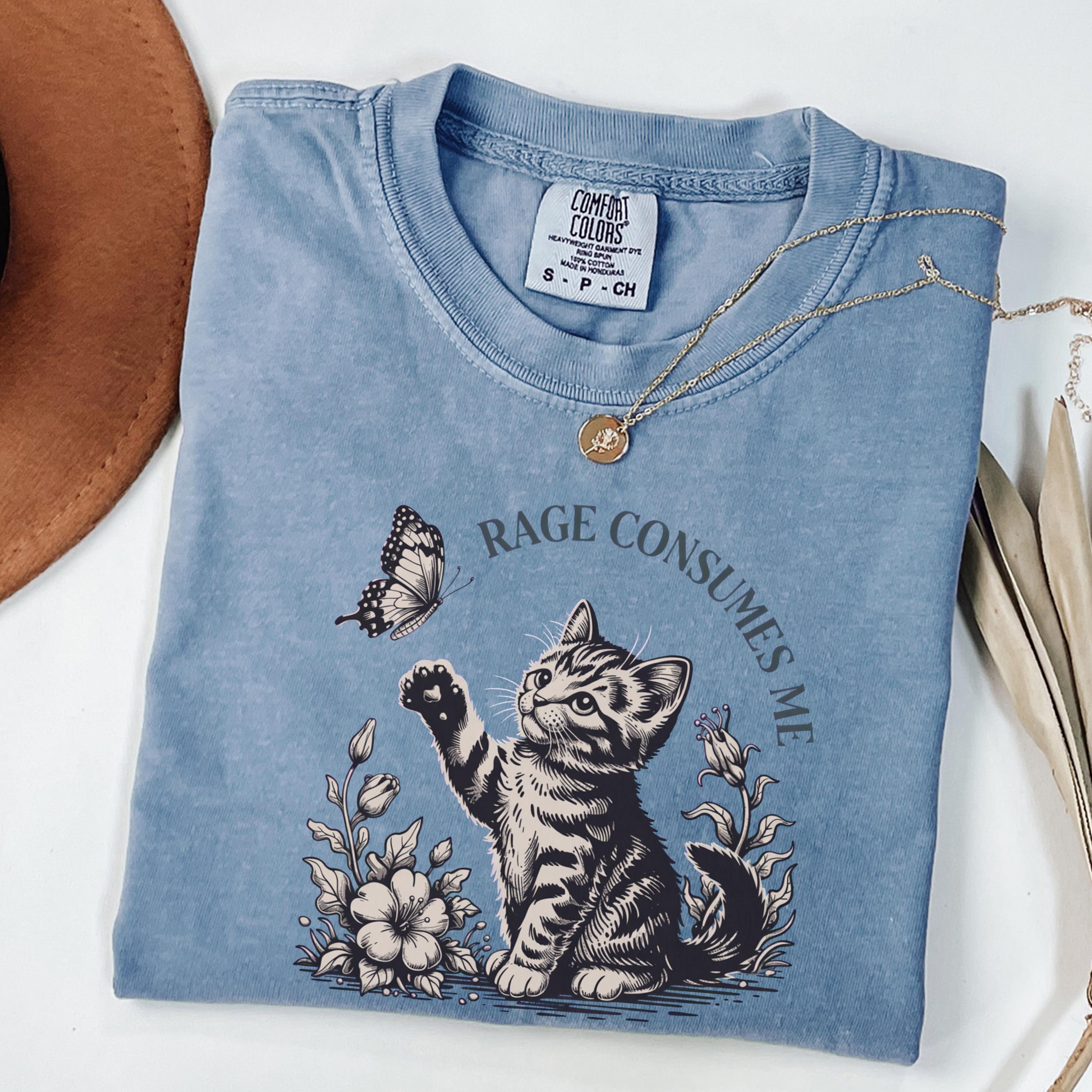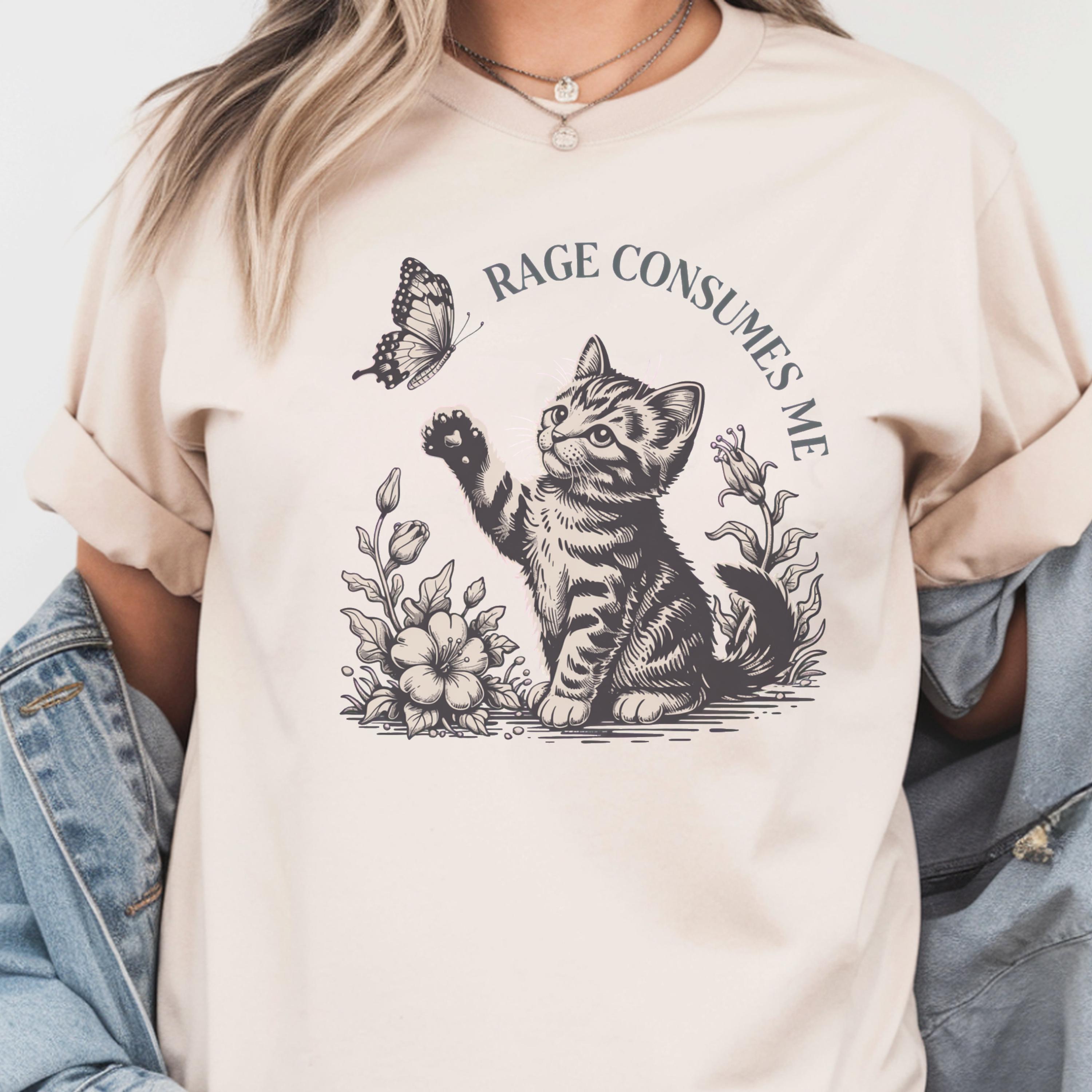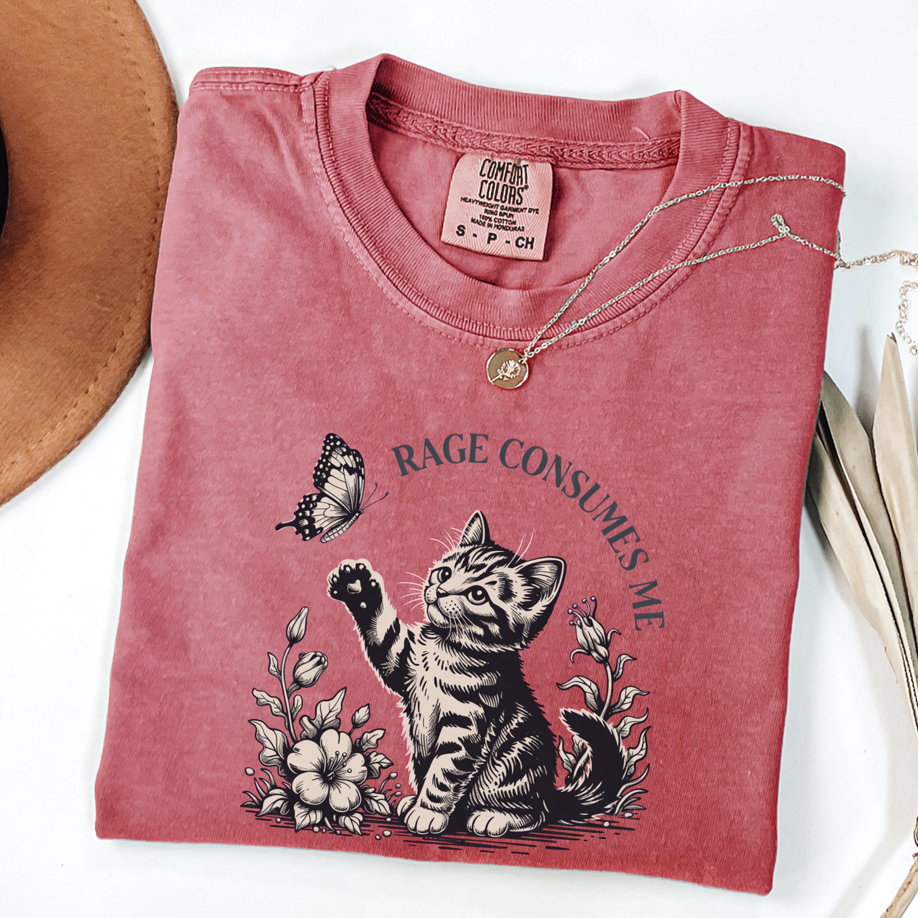 This beautifully illustrated comfort colors tee features a soft vintage-style kitten reaching toward a butterfly with the subtle phrase “Rage Consumes Me,” blending gentle aesthetics with hidden humor. The contrast between the sweet floral scene and ironic message makes this design unique, eye-catching, and highly shareable.
