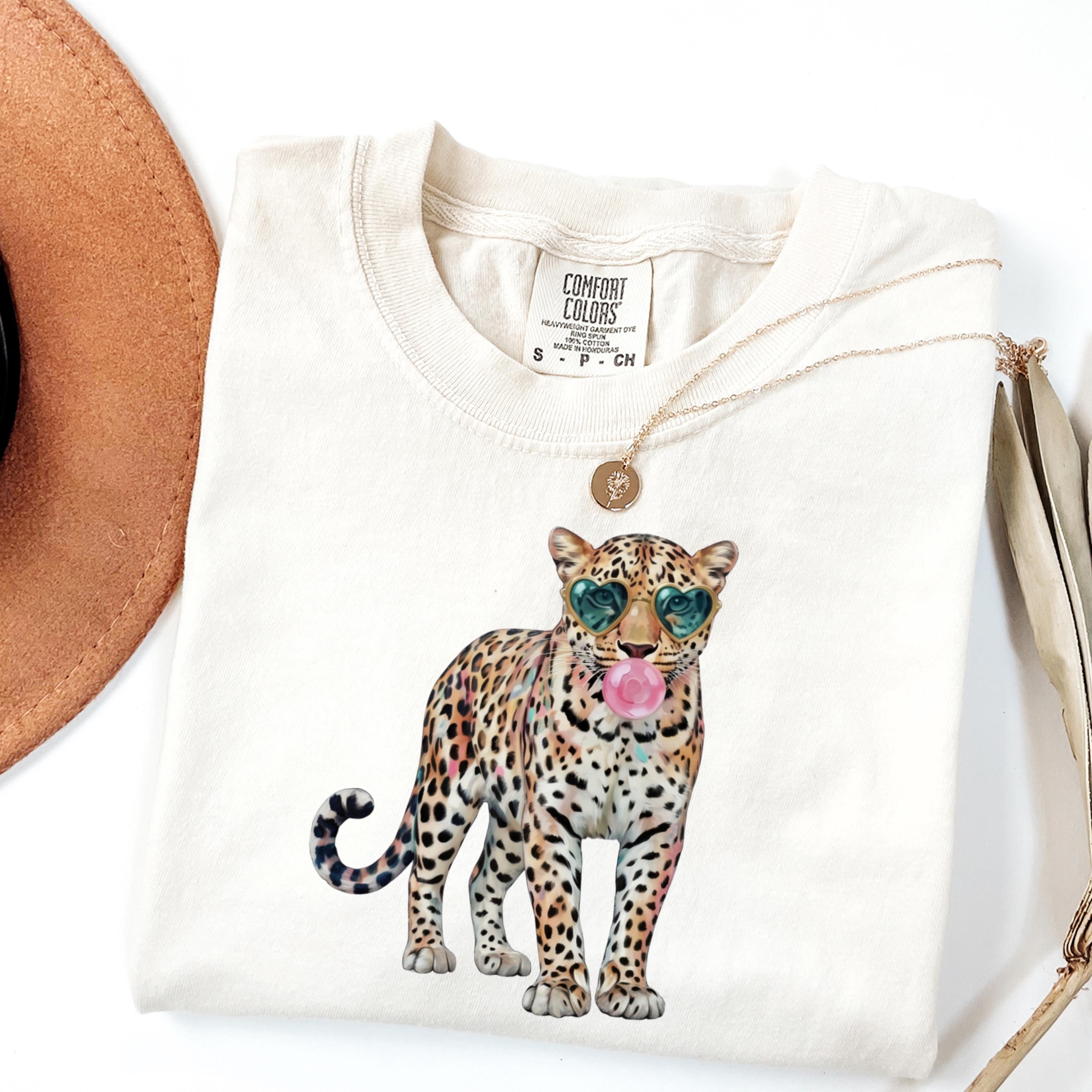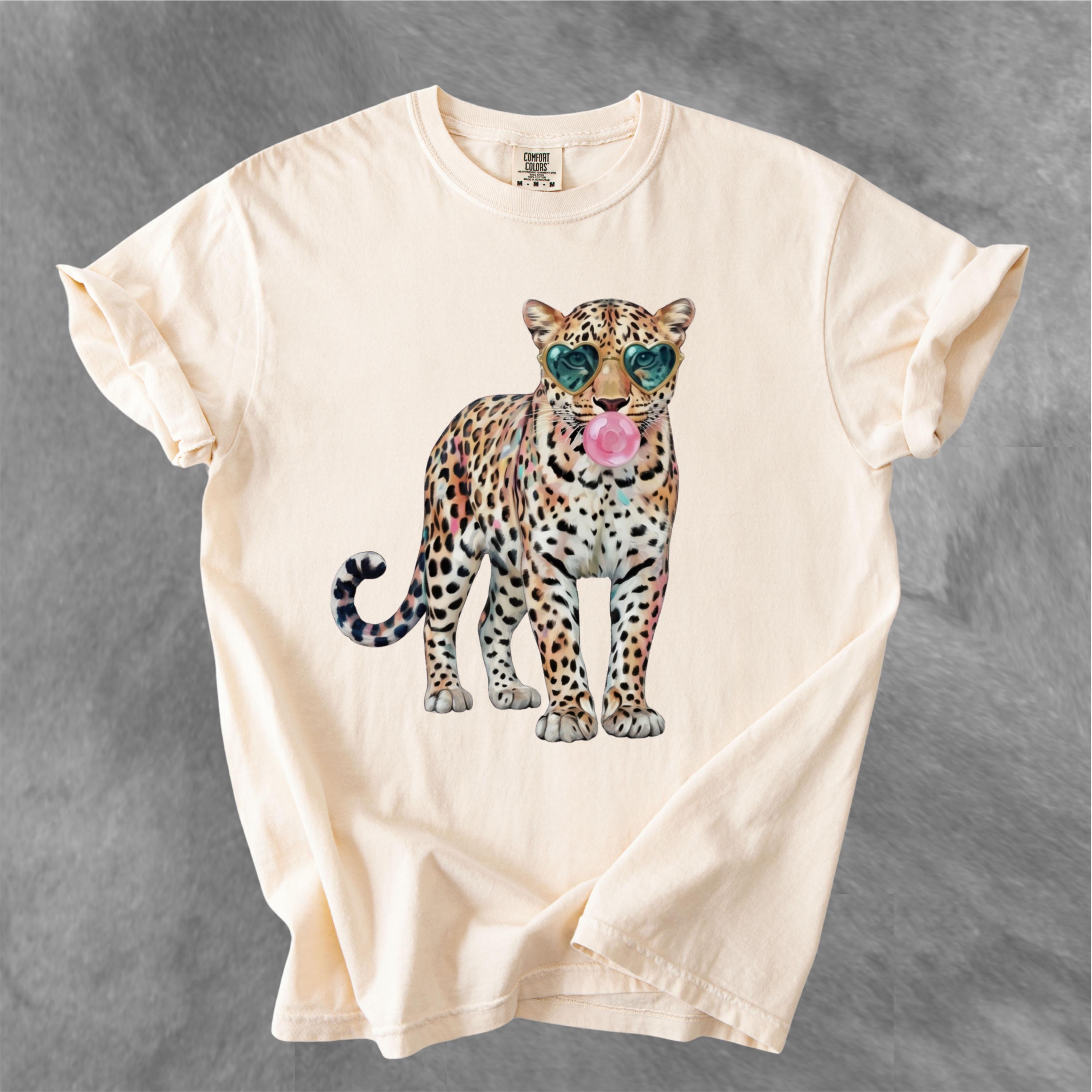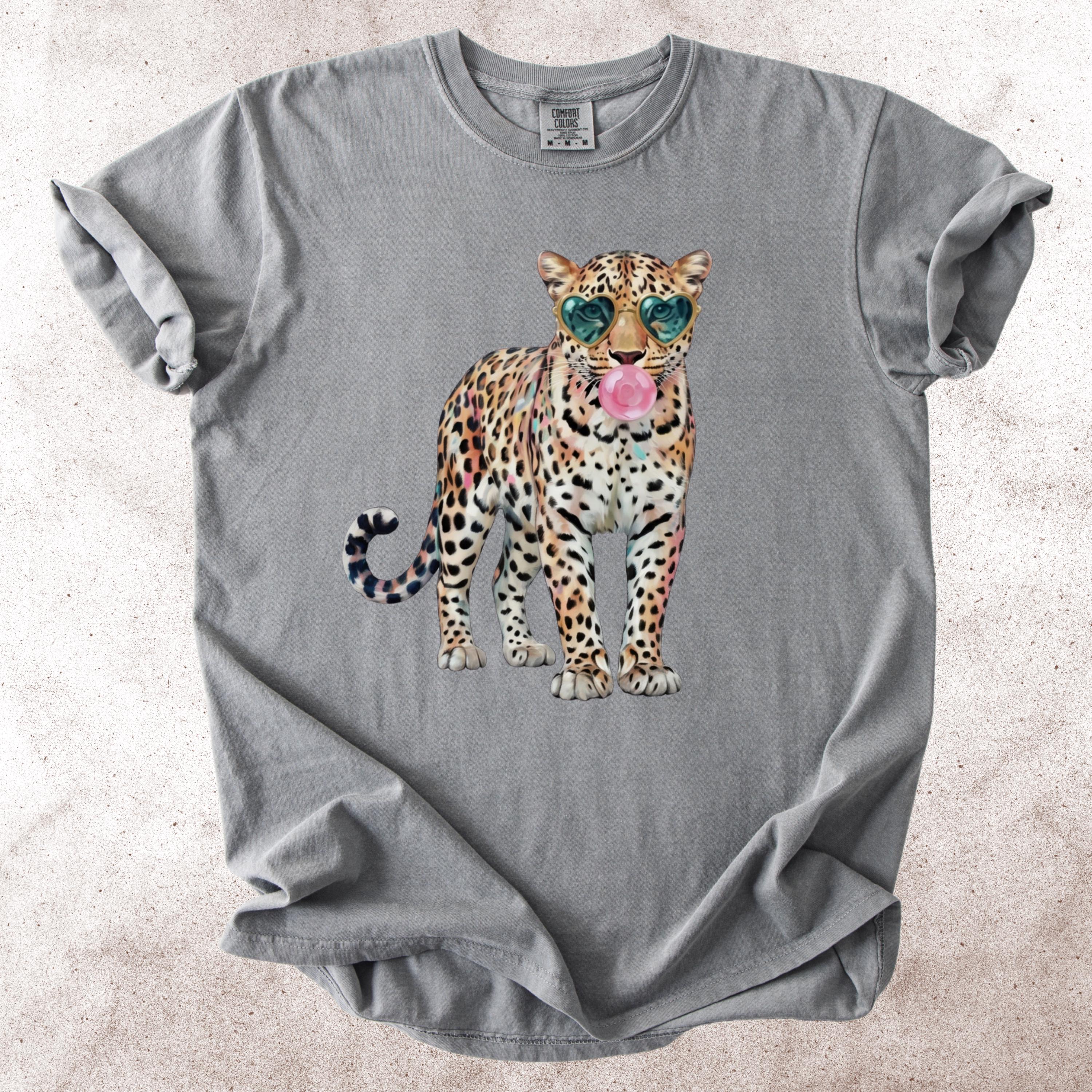 This eye-catching comfort colors tee features a stylish leopard wearing heart-shaped sunglasses and blowing a bubble gum bubble, combining wild energy with playful attitude. The vibrant, trendy design makes this shirt perfect for those who love bold fashion, animal prints, and aesthetic statement pieces.