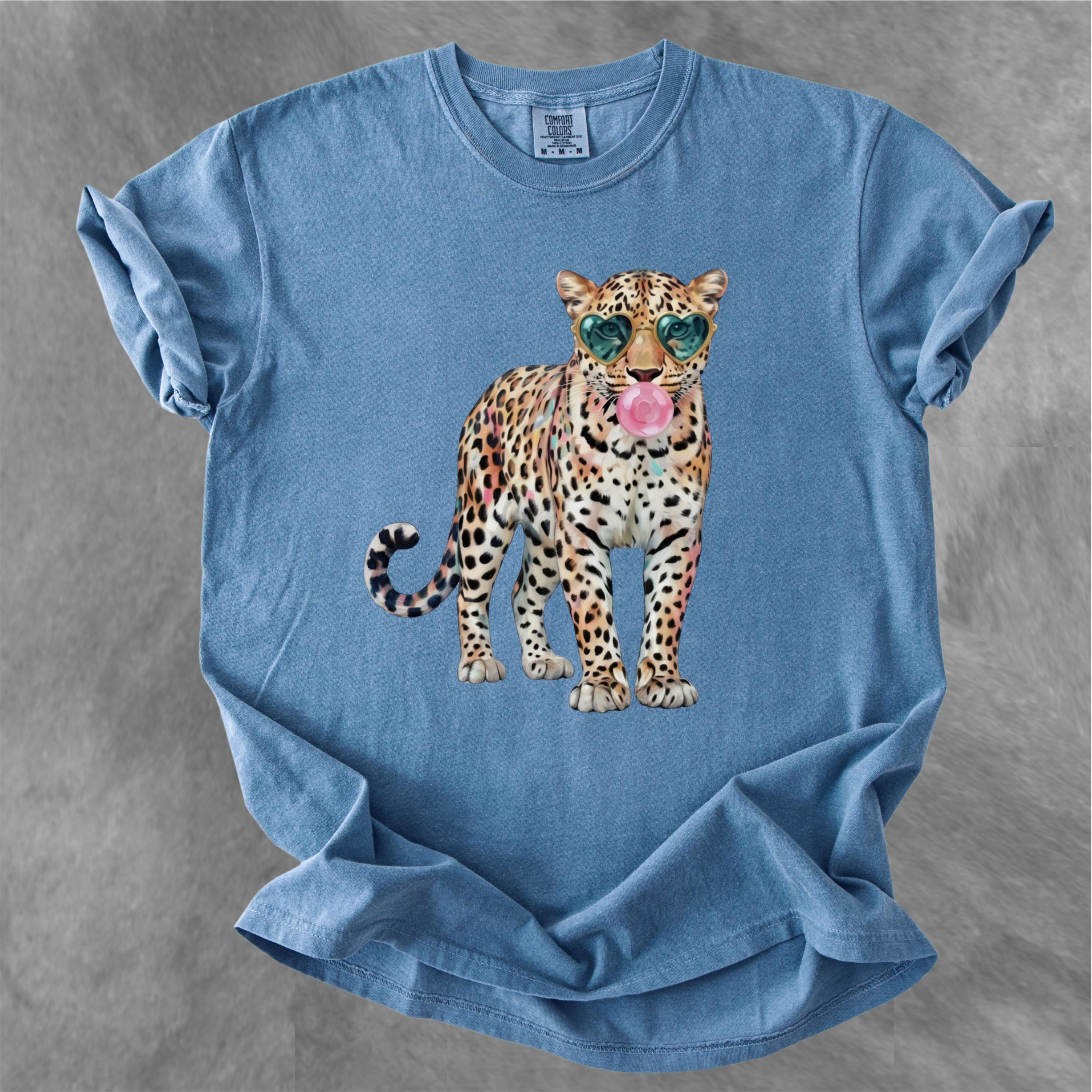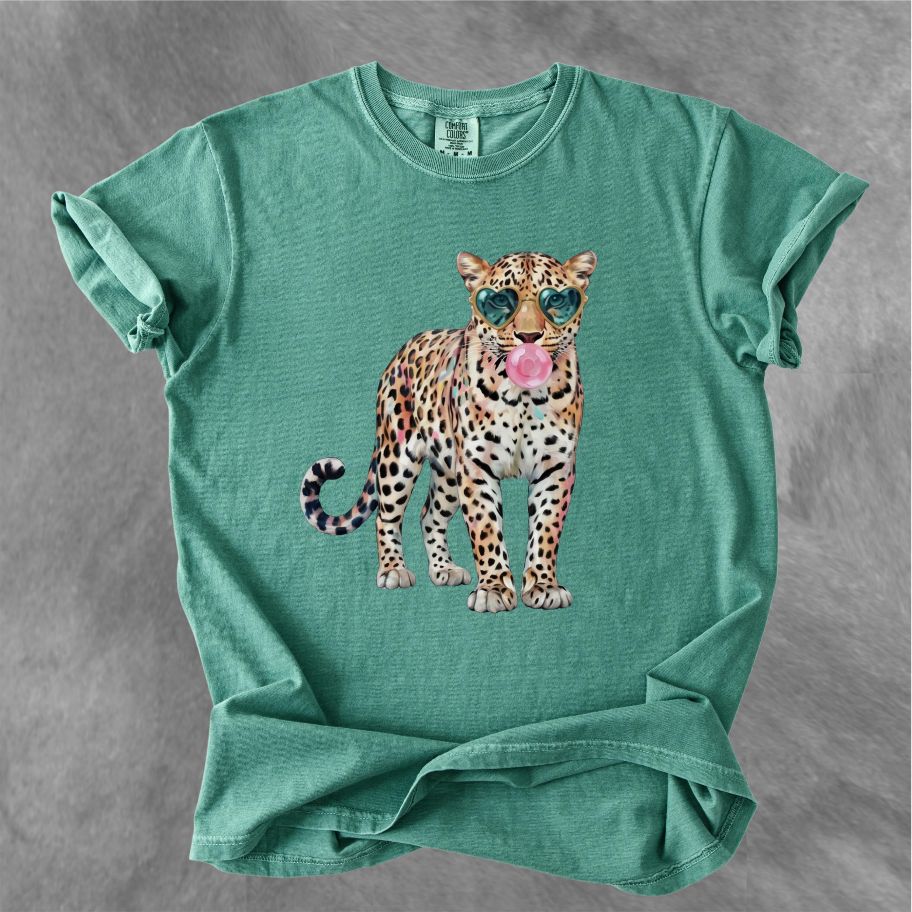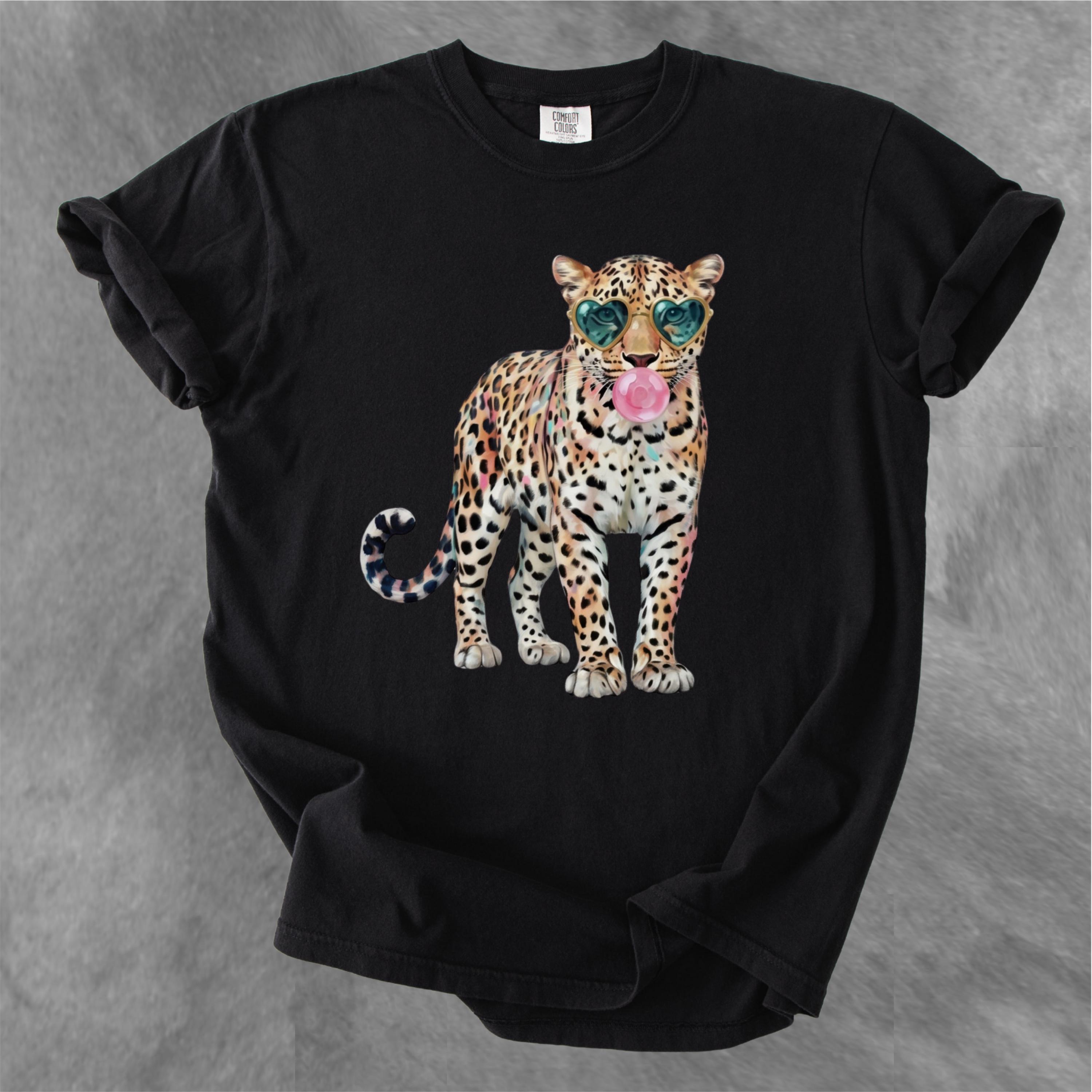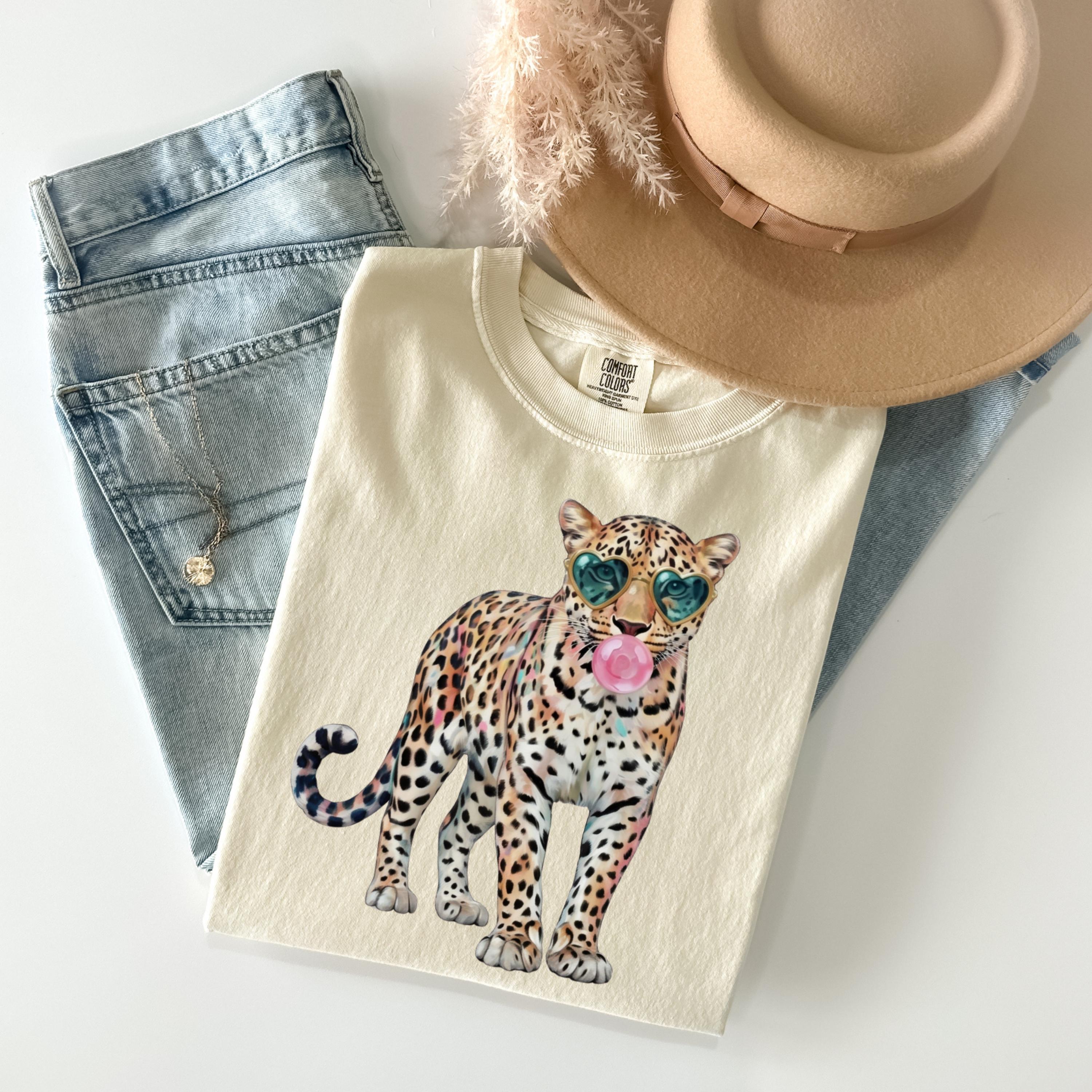 This eye-catching comfort colors tee features a stylish leopard wearing heart-shaped sunglasses and blowing a bubble gum bubble, combining wild energy with playful attitude. The vibrant, trendy design makes this shirt perfect for those who love bold fashion, animal prints, and aesthetic statement pieces.