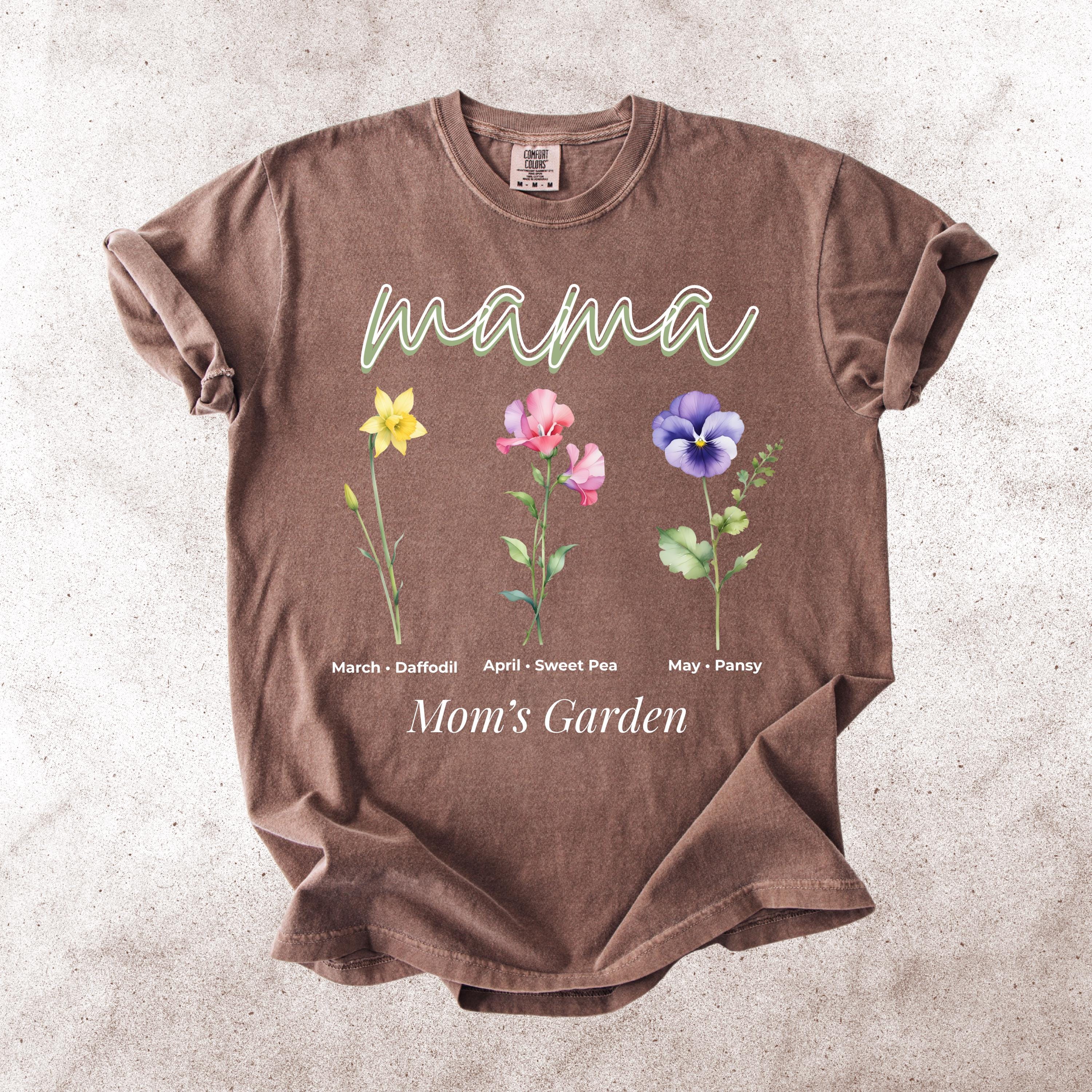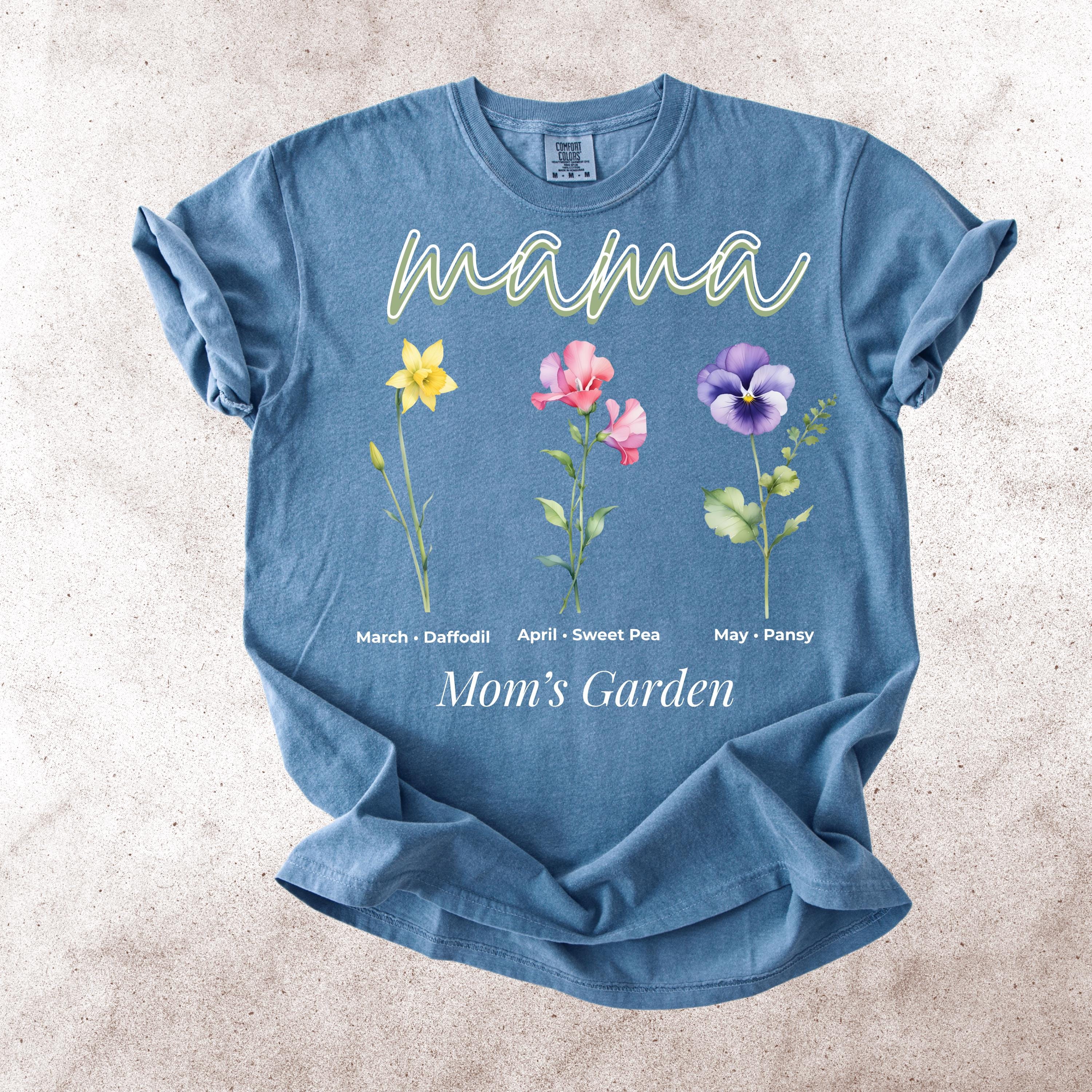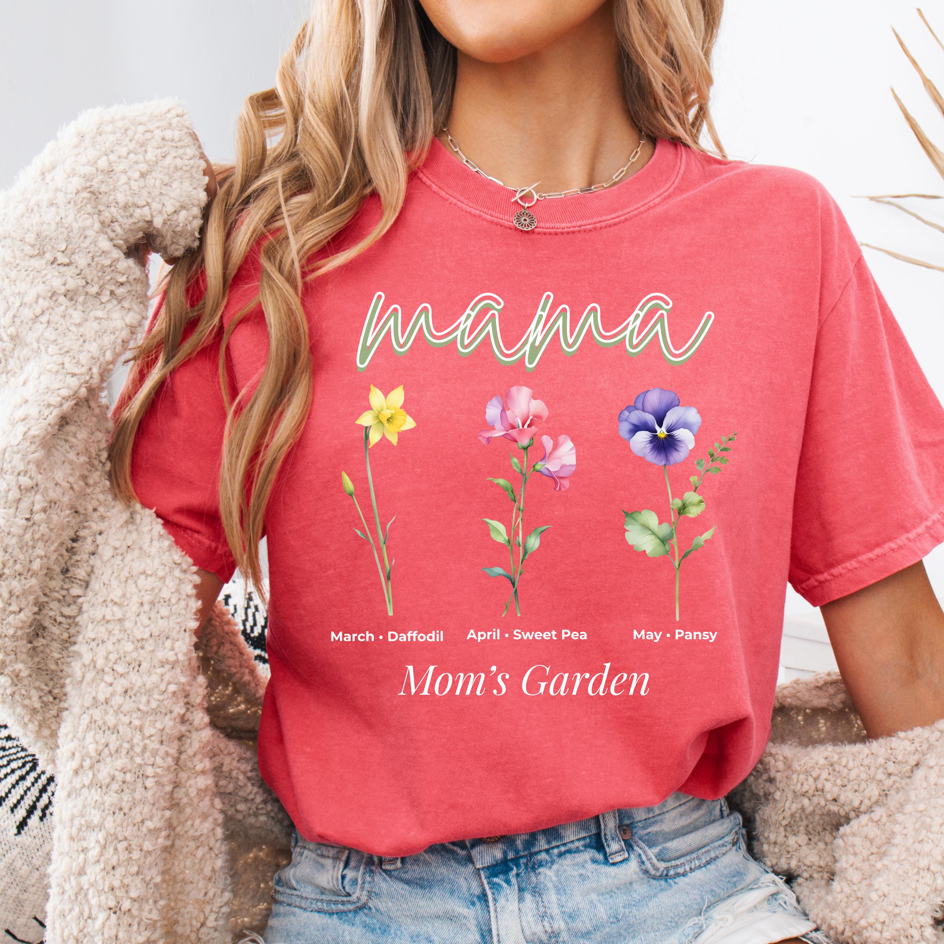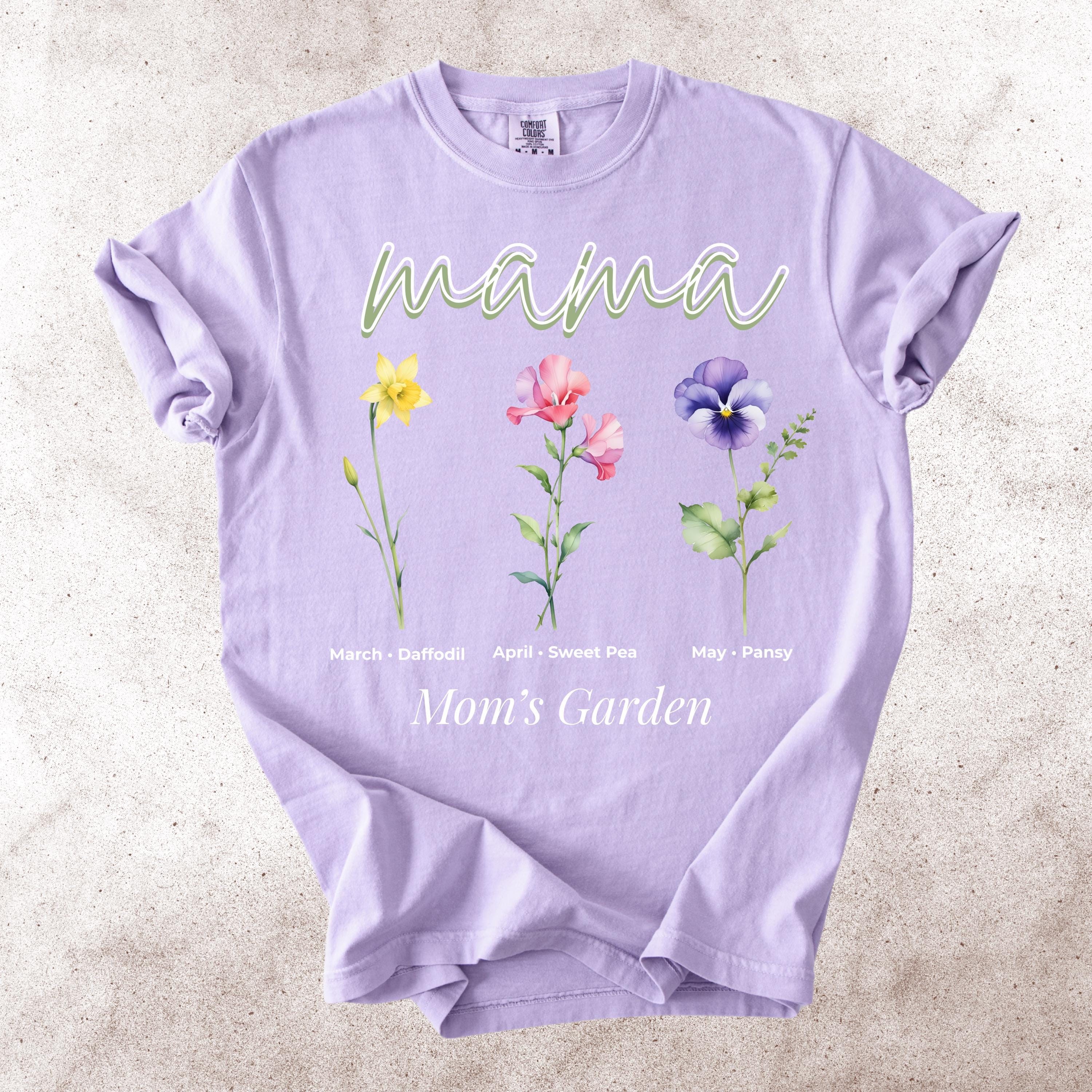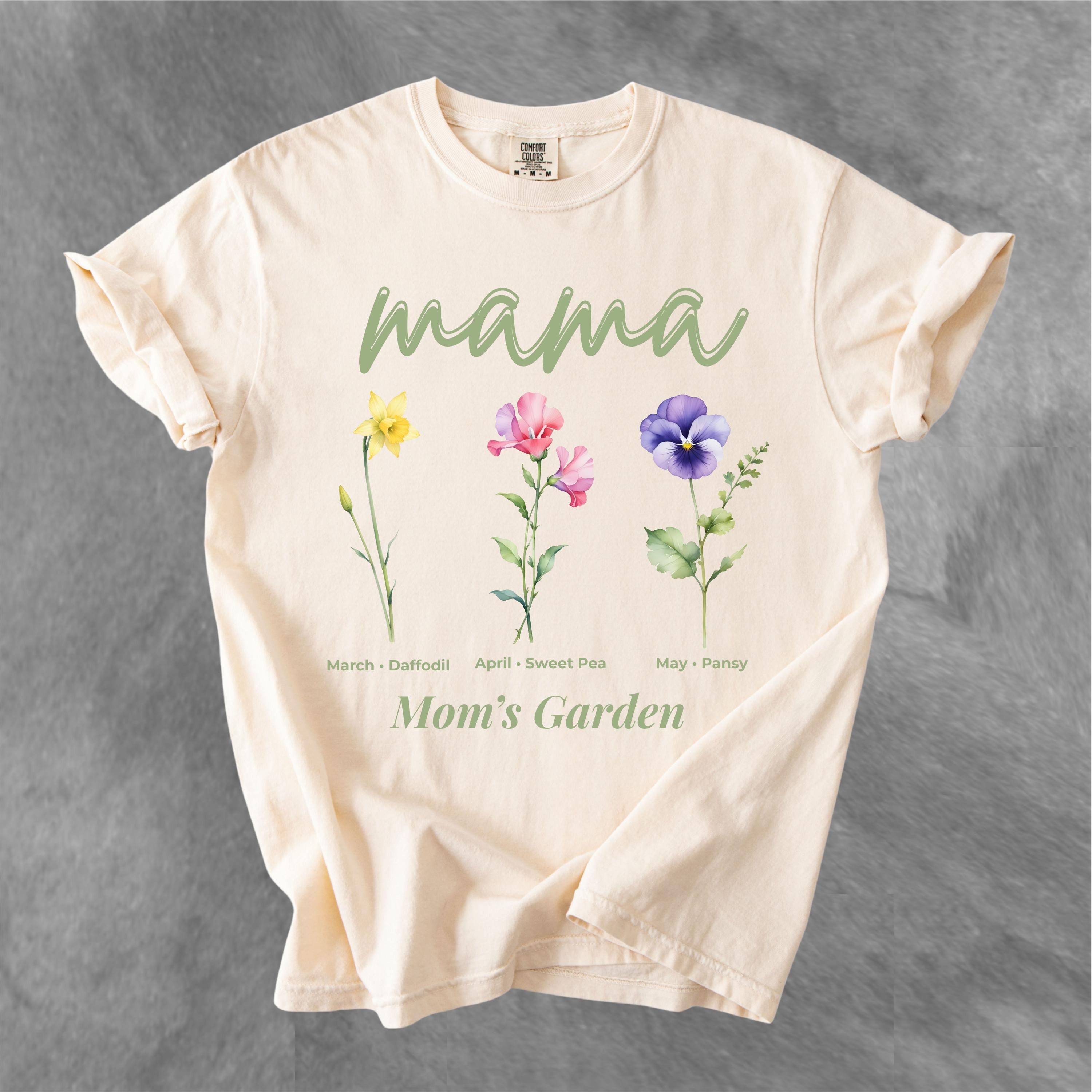 This Mama’s Garden Comfort Colors tee features a soft floral design with March daffodil, April sweet pea, and May pansy birth flowers. Designed with elegant “mama” lettering and a delicate botanical layout, this shirt is perfect for moms who love meaningful floral graphics and soft aesthetic style.