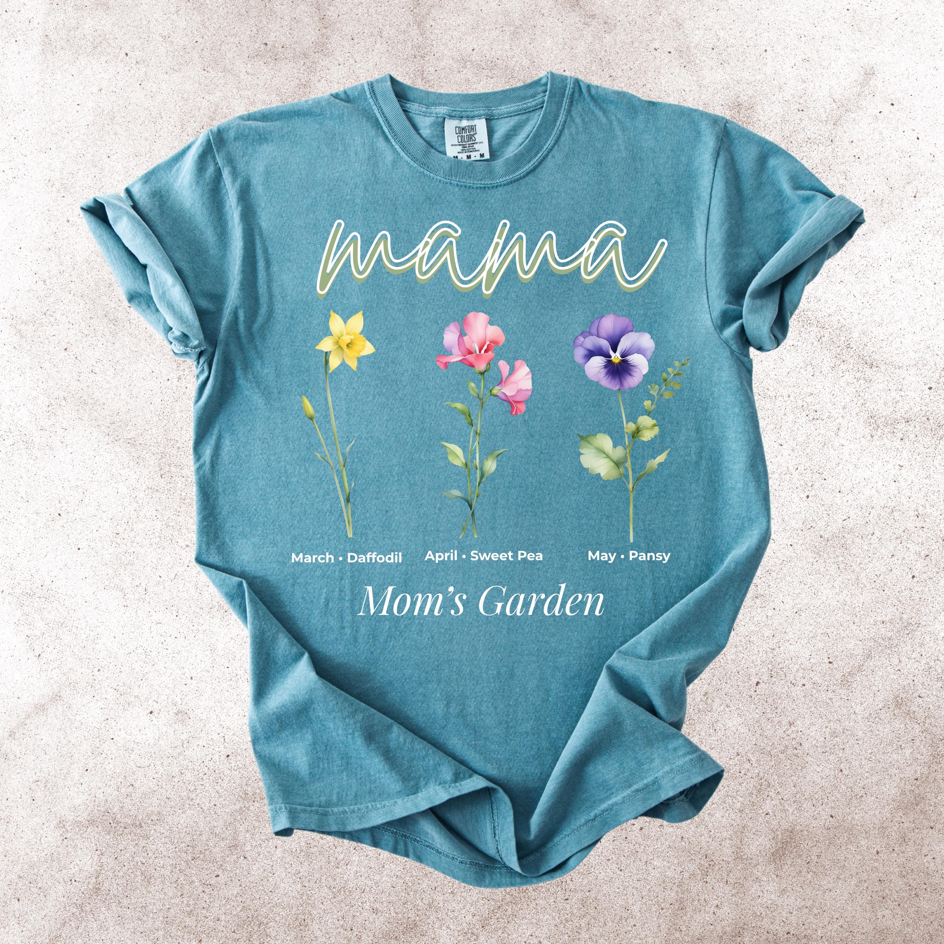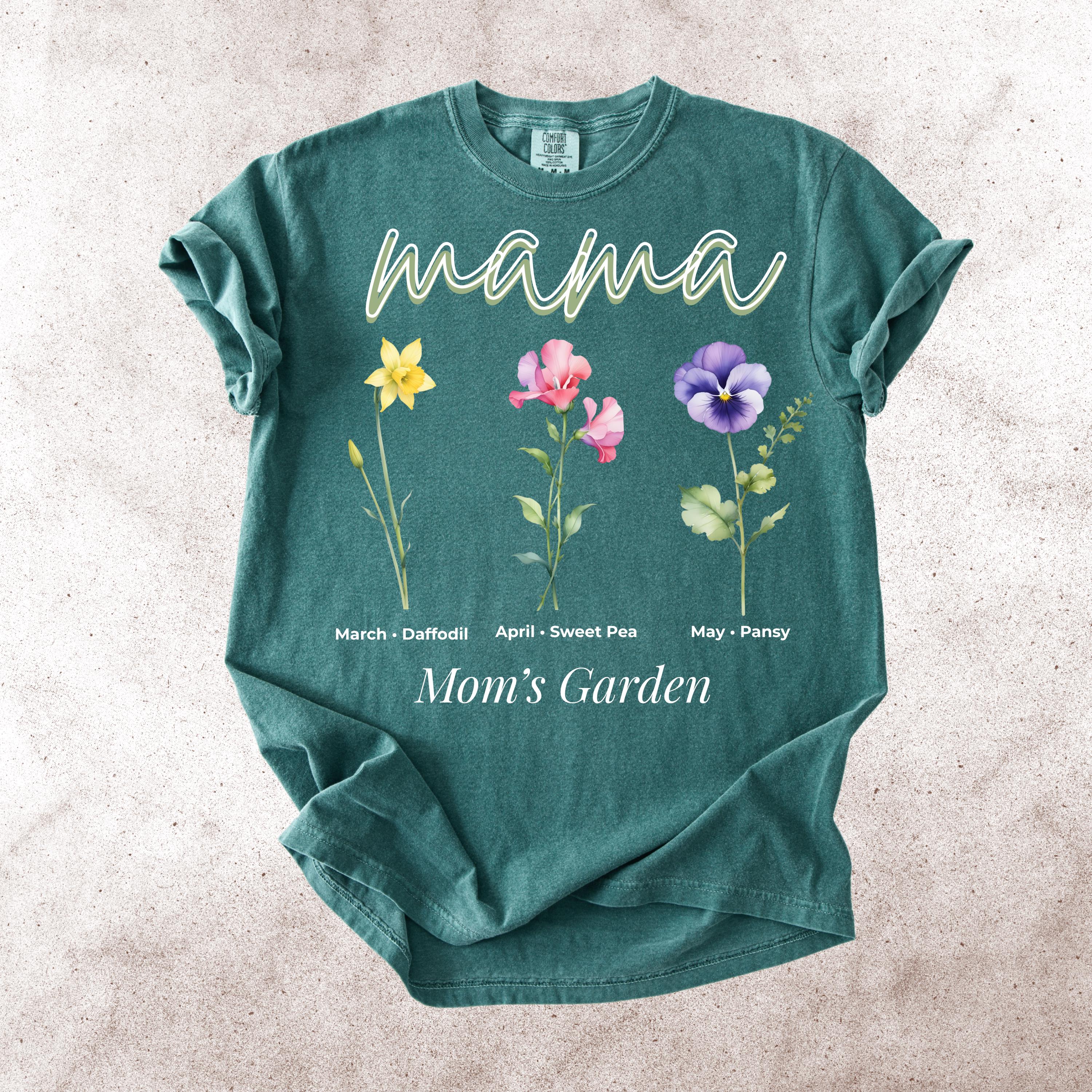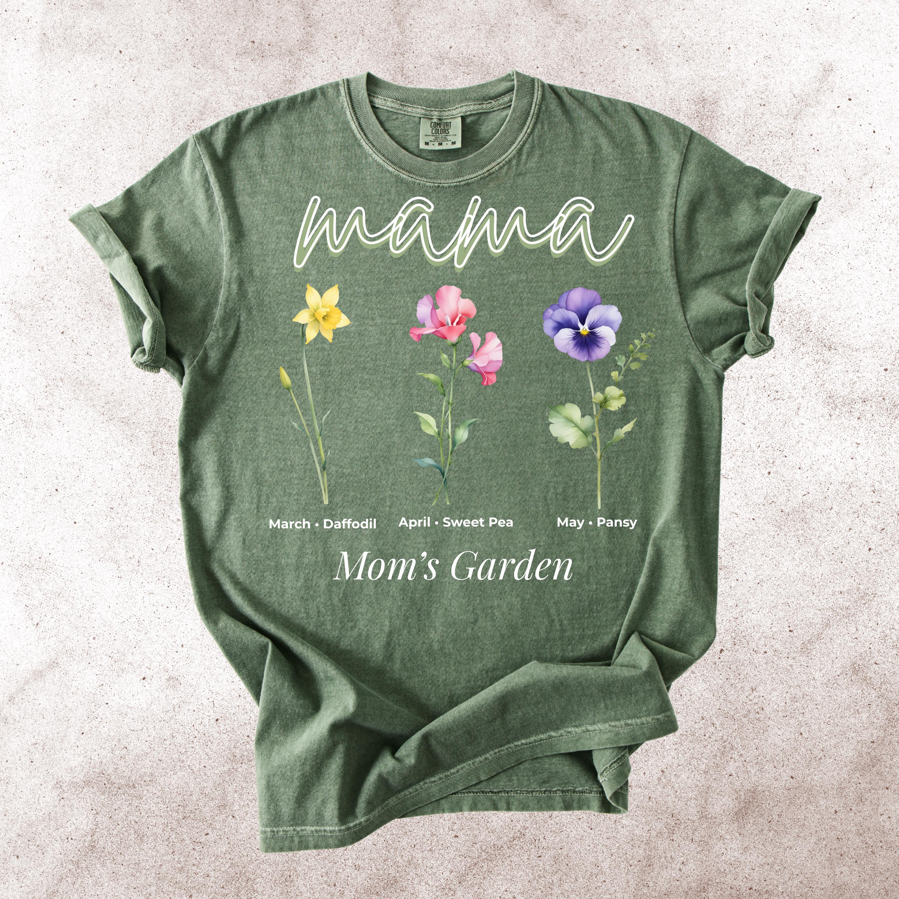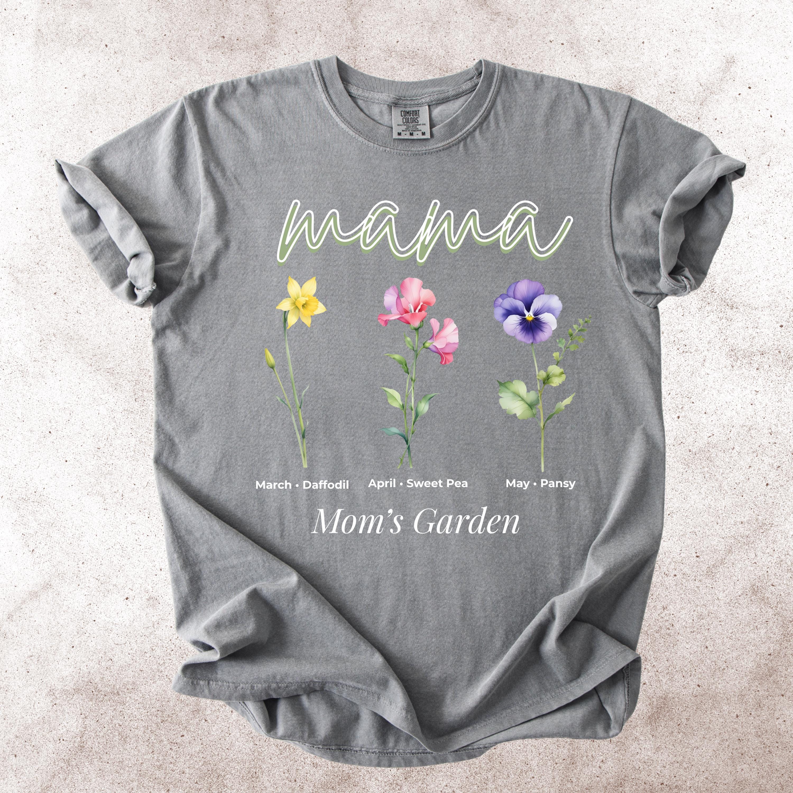 This Mama’s Garden Comfort Colors tee features a soft floral design with March daffodil, April sweet pea, and May pansy birth flowers. Designed with elegant “mama” lettering and a delicate botanical layout, this shirt is perfect for moms who love meaningful floral graphics and soft aesthetic style.