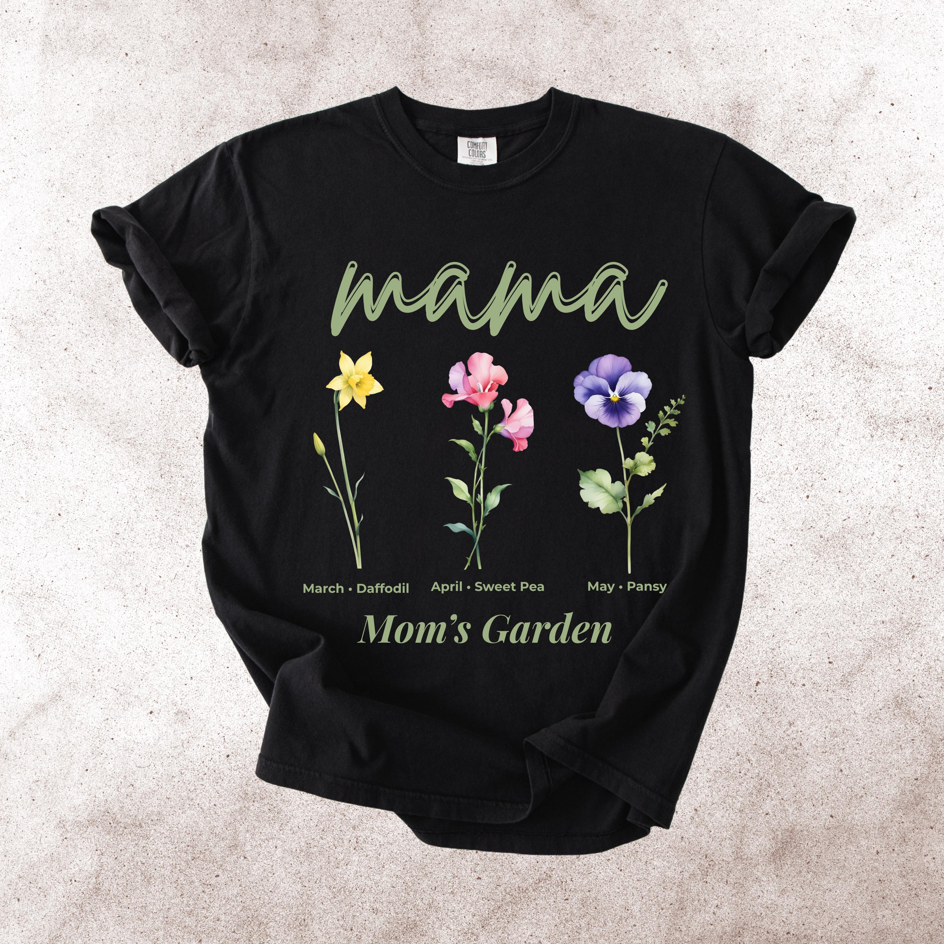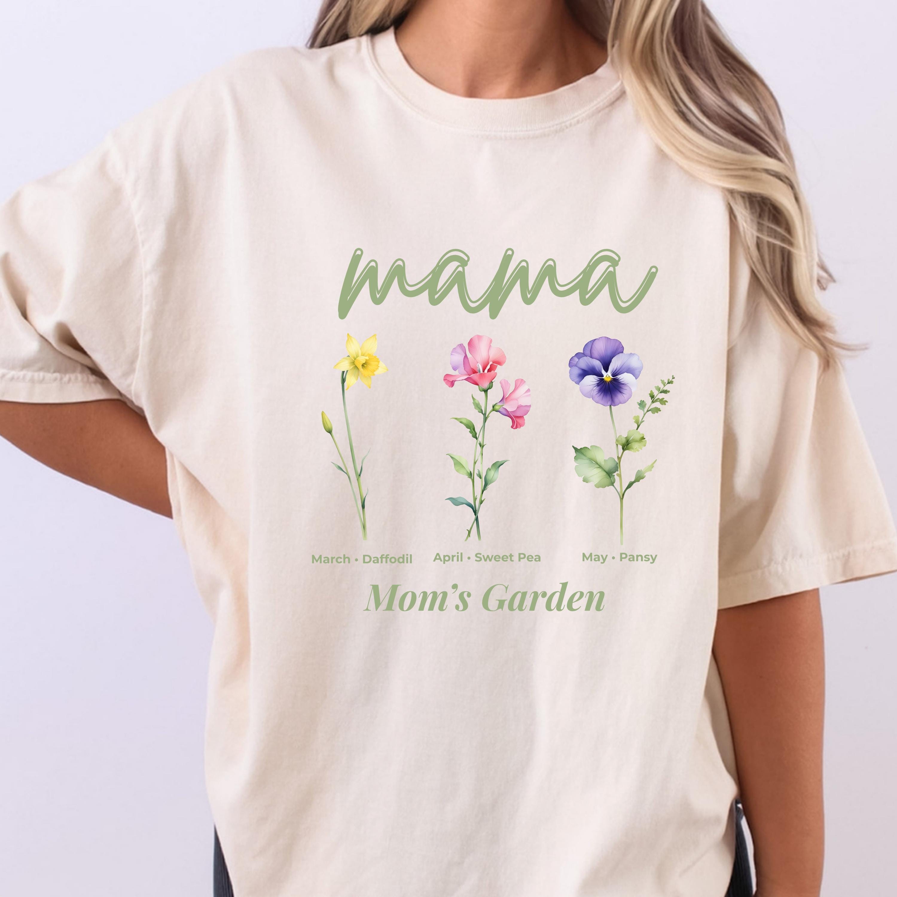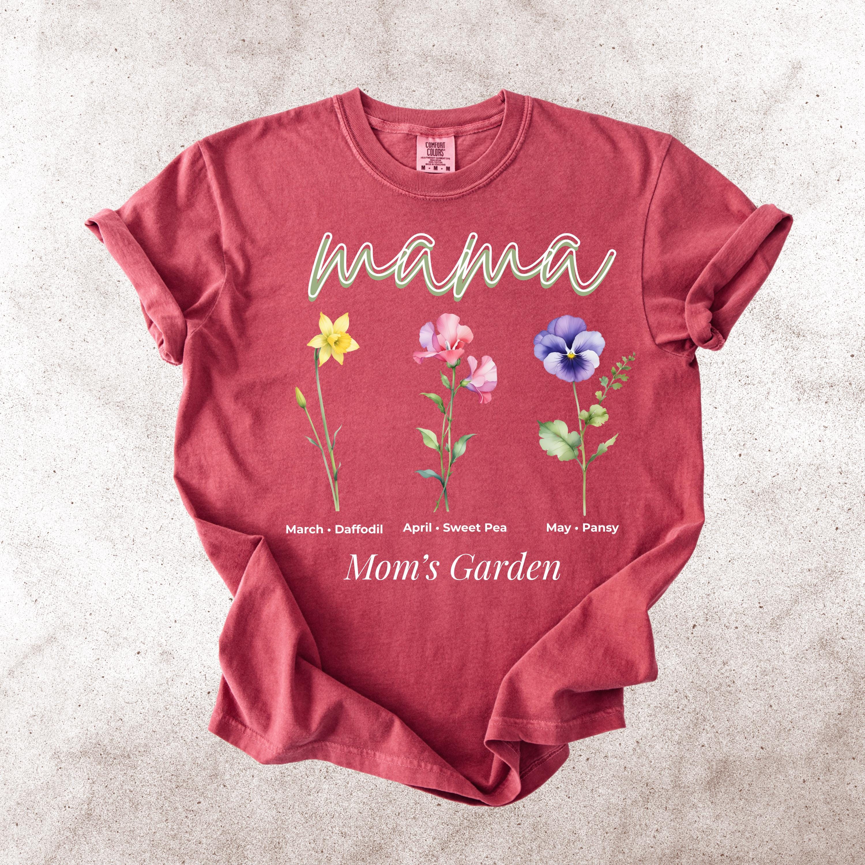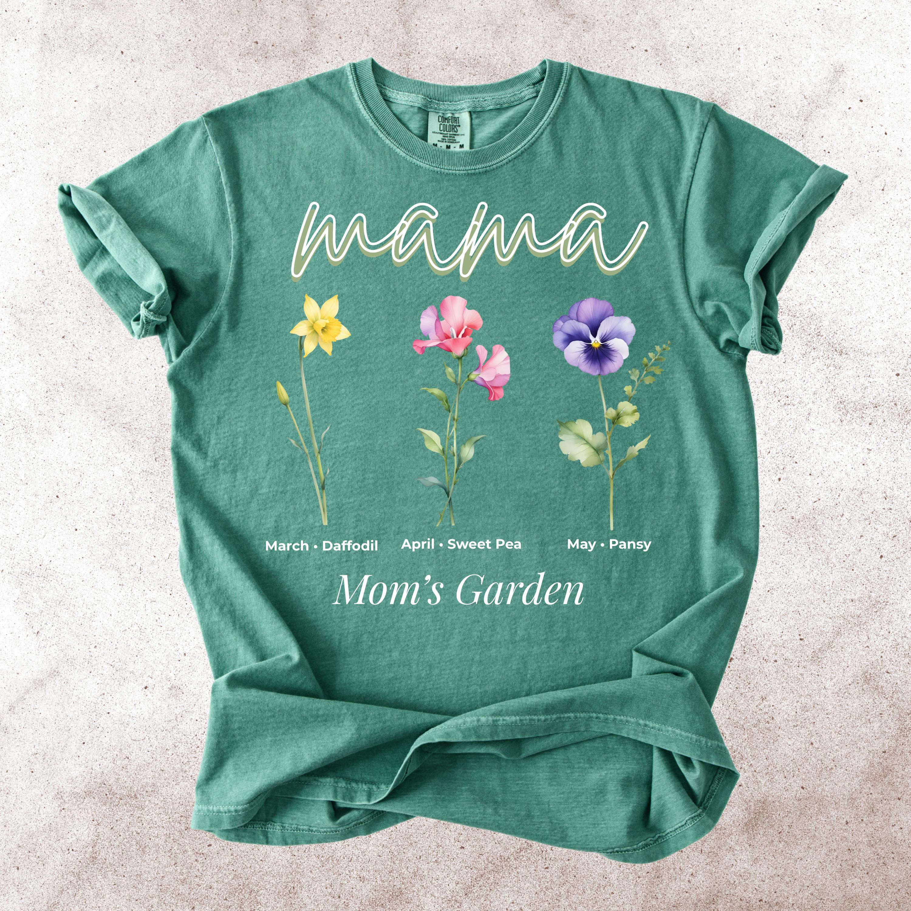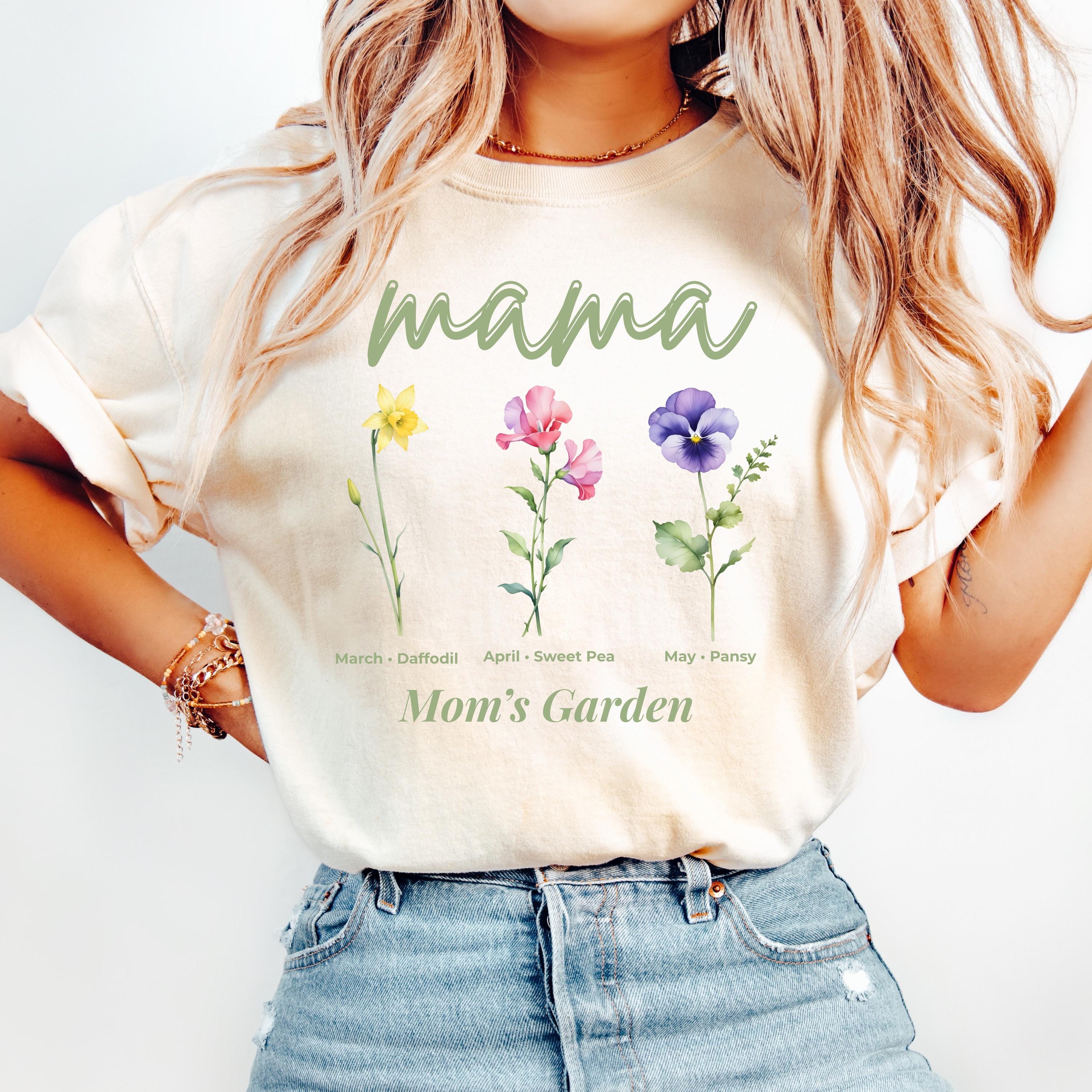 This Mama’s Garden Comfort Colors tee features a soft floral design with March daffodil, April sweet pea, and May pansy birth flowers. Designed with elegant “mama” lettering and a delicate botanical layout, this shirt is perfect for moms who love meaningful floral graphics and soft aesthetic style.