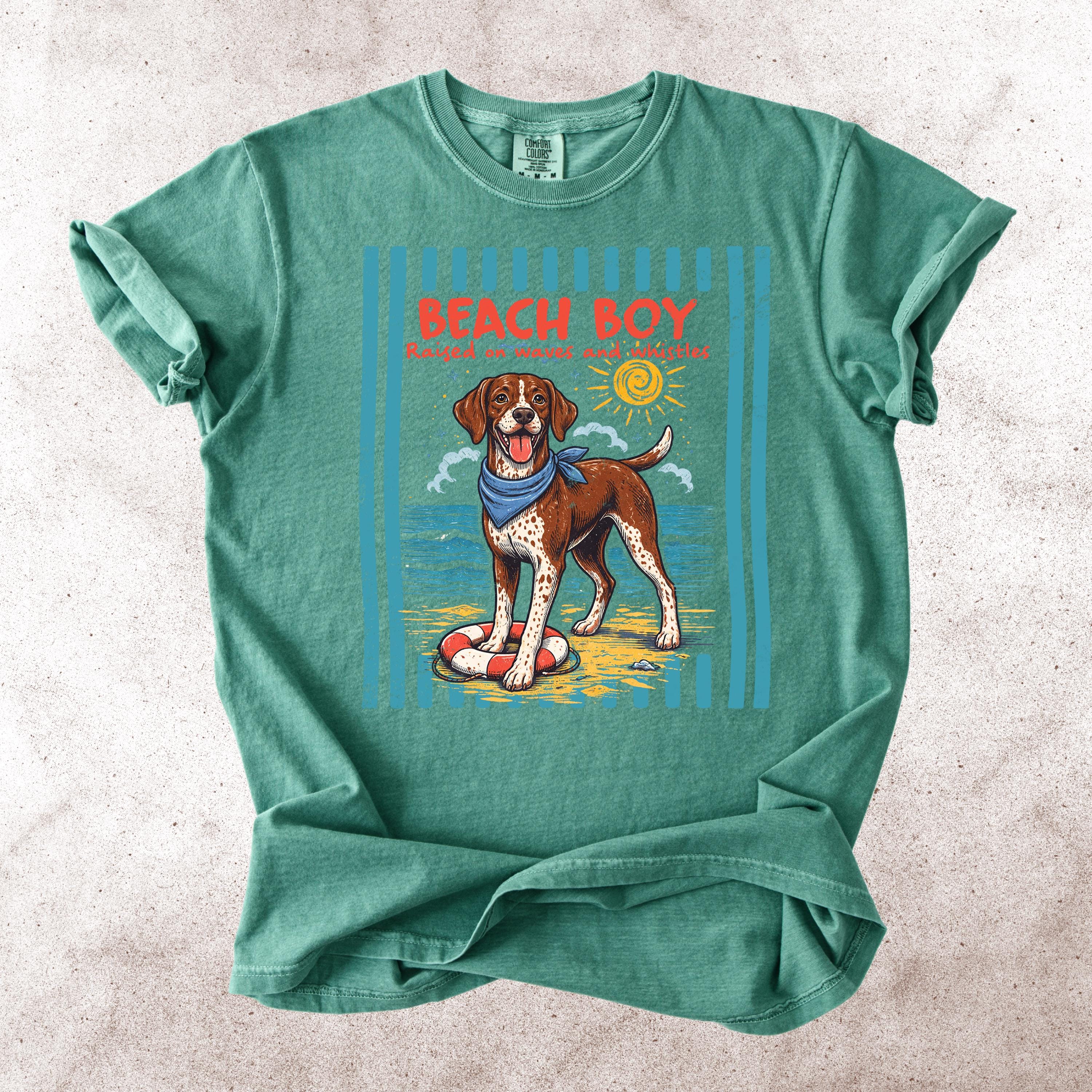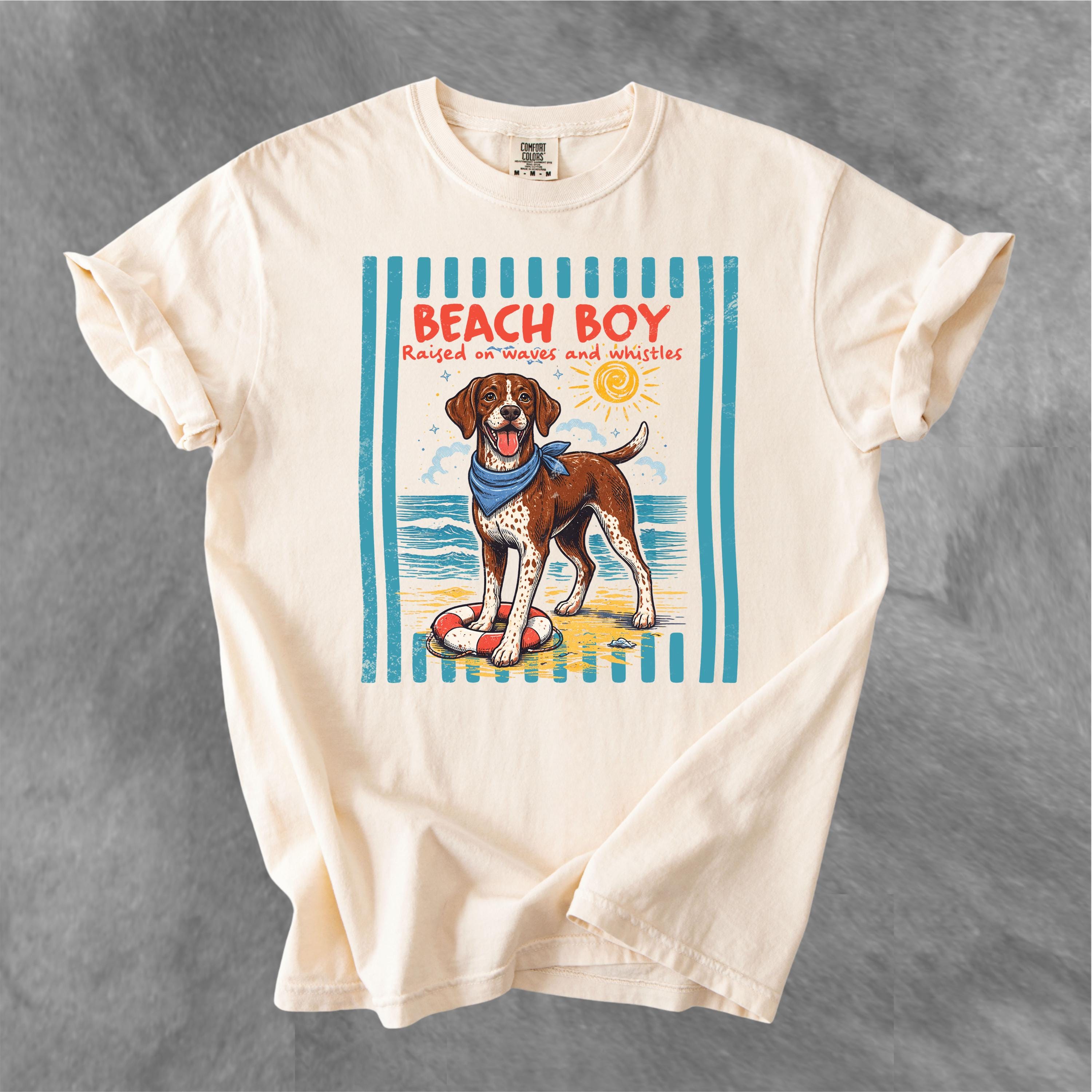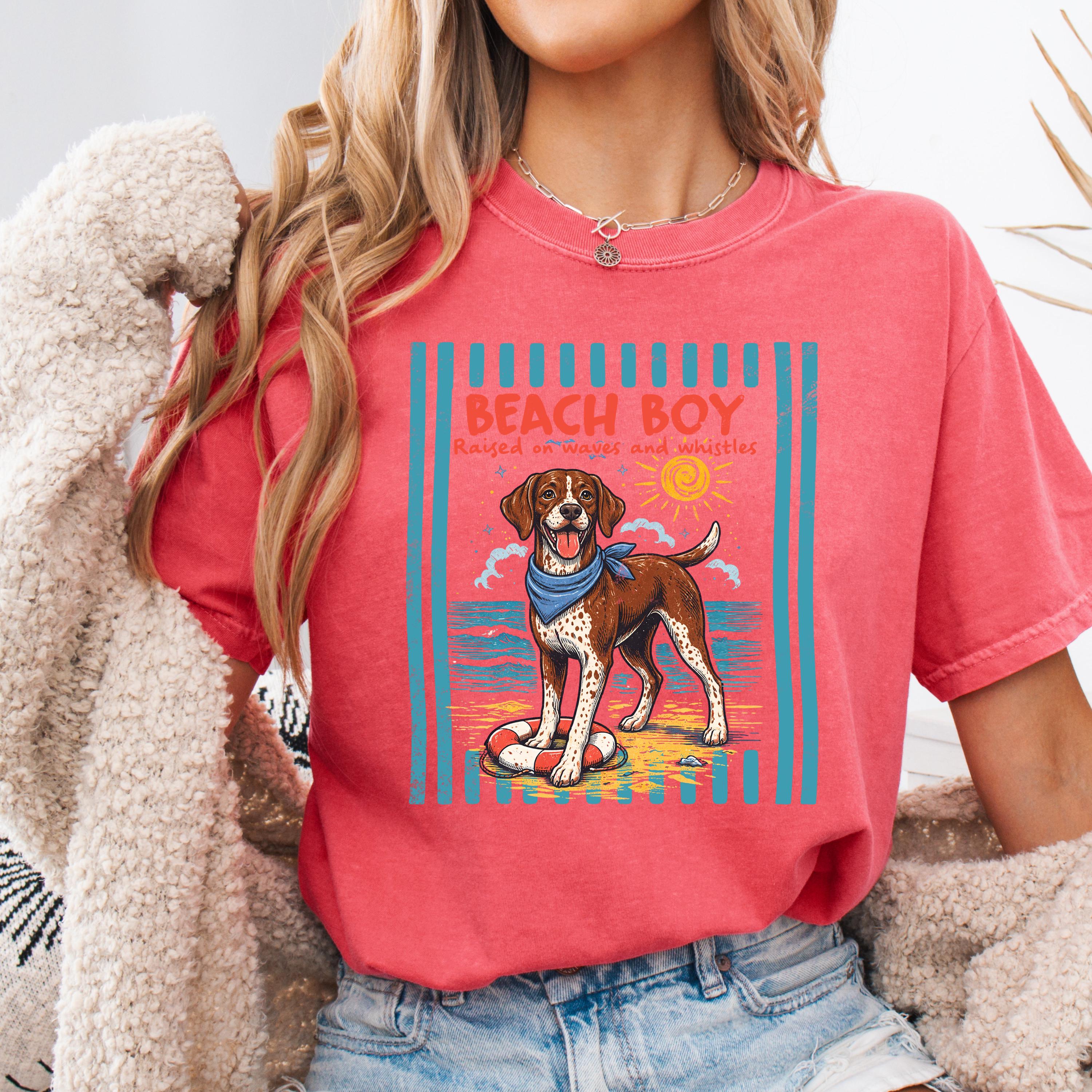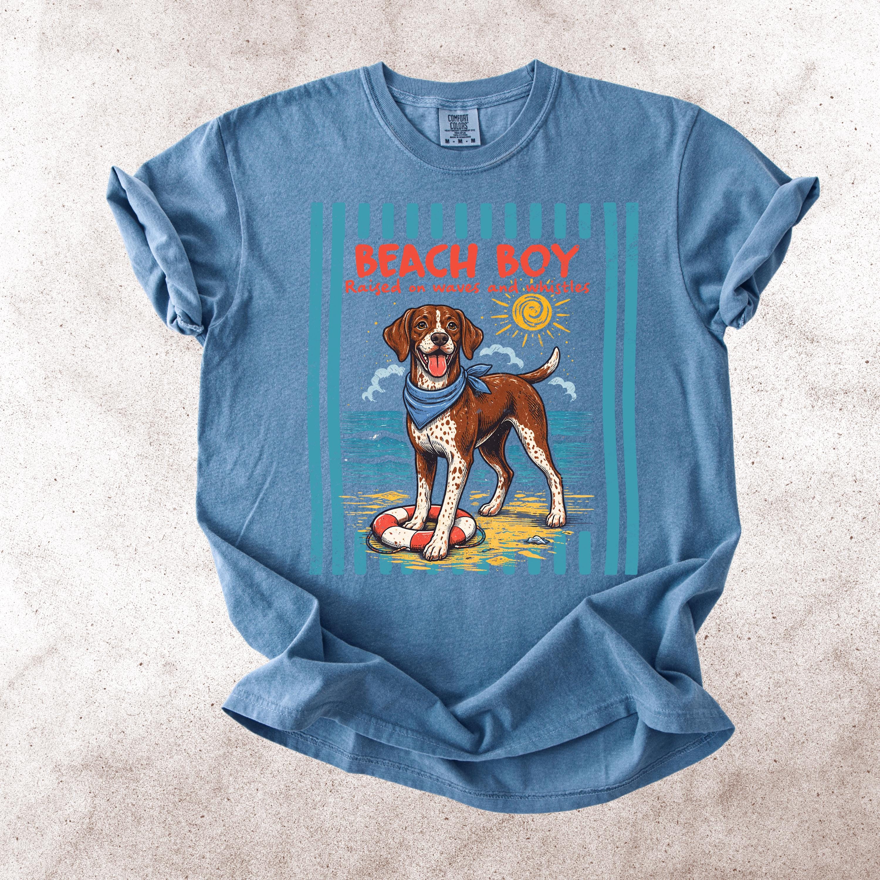 This Retro Style Beach Boy Dog Comfort Colors tee is the perfect shirt for dog lovers who enjoy sunny days, ocean vibes, and playful pups.