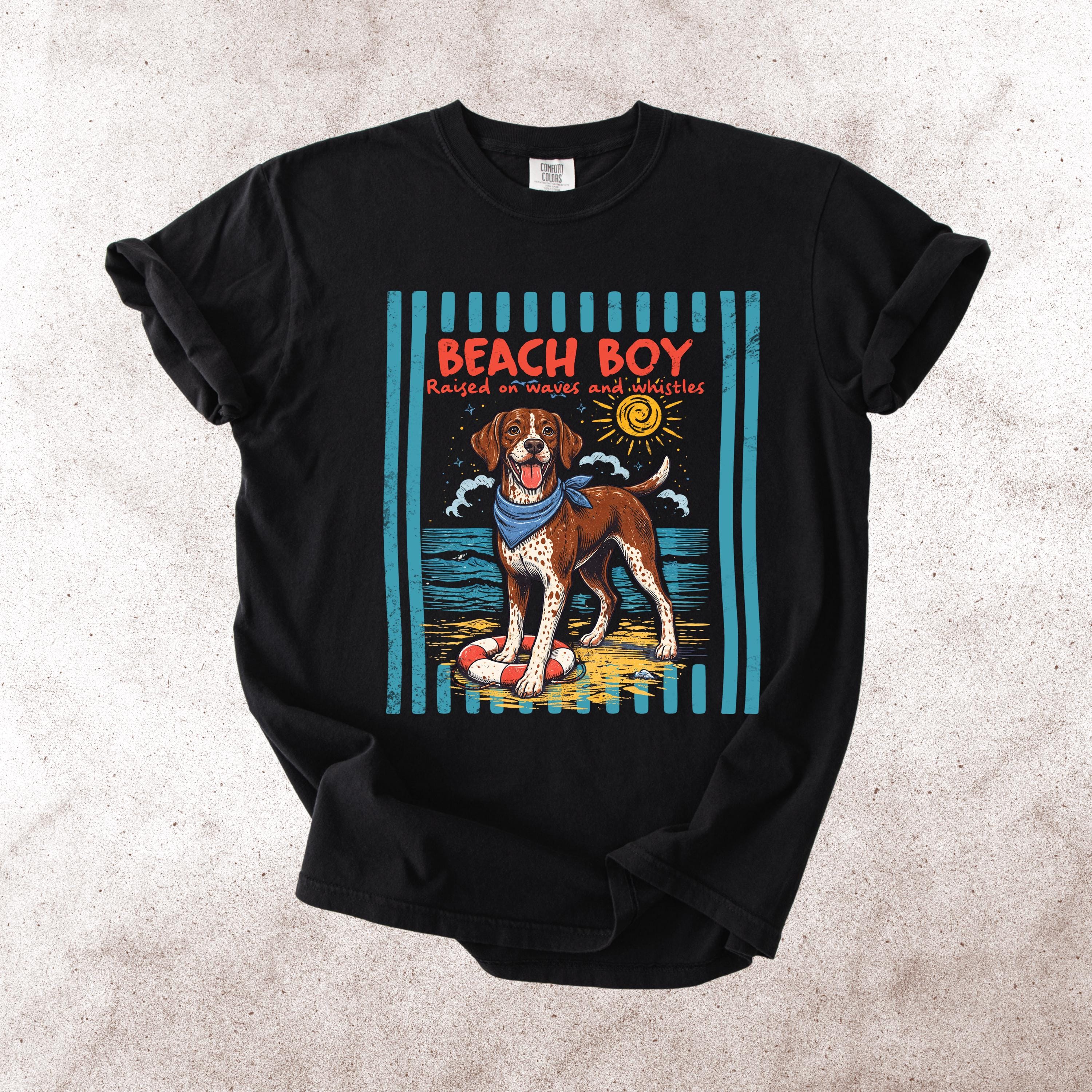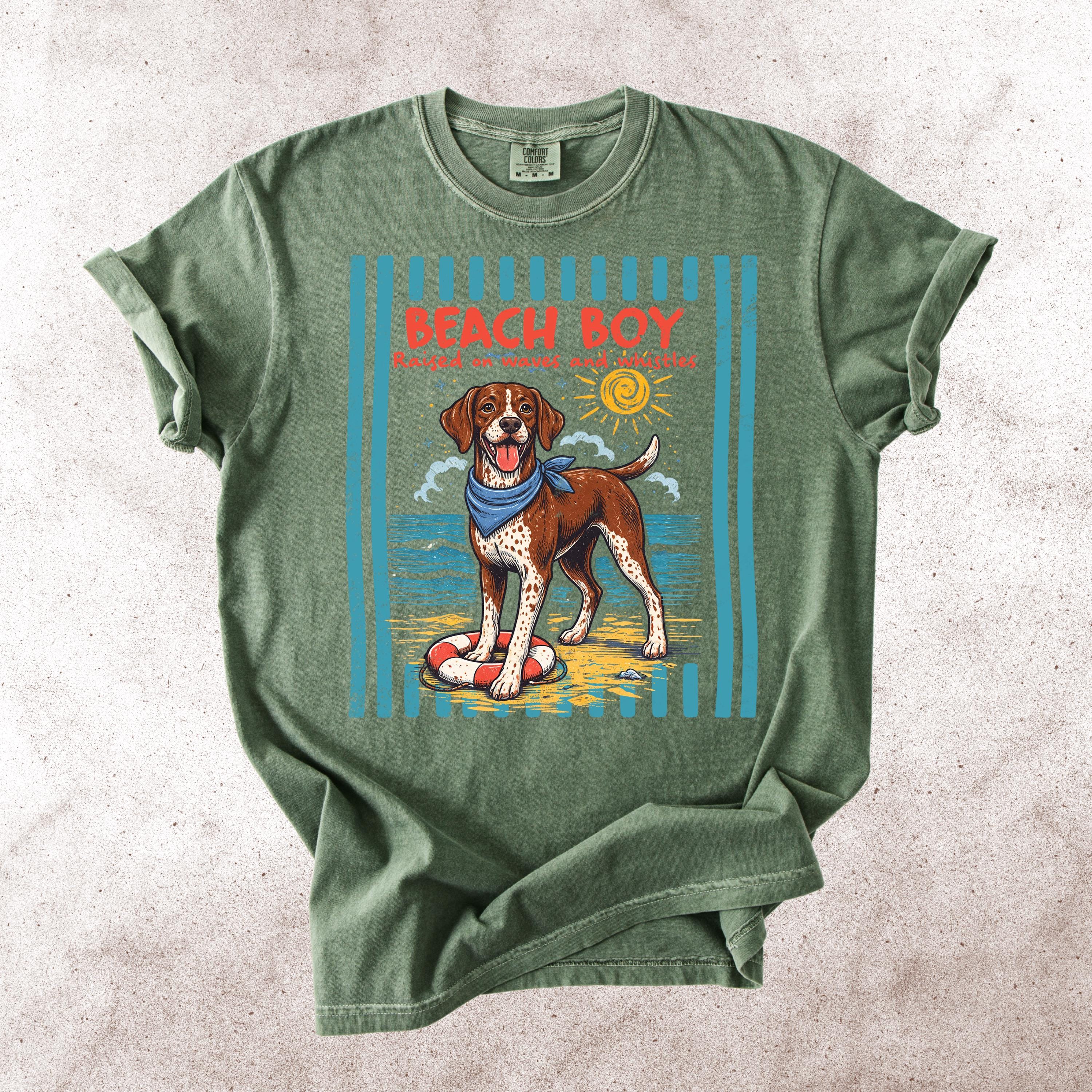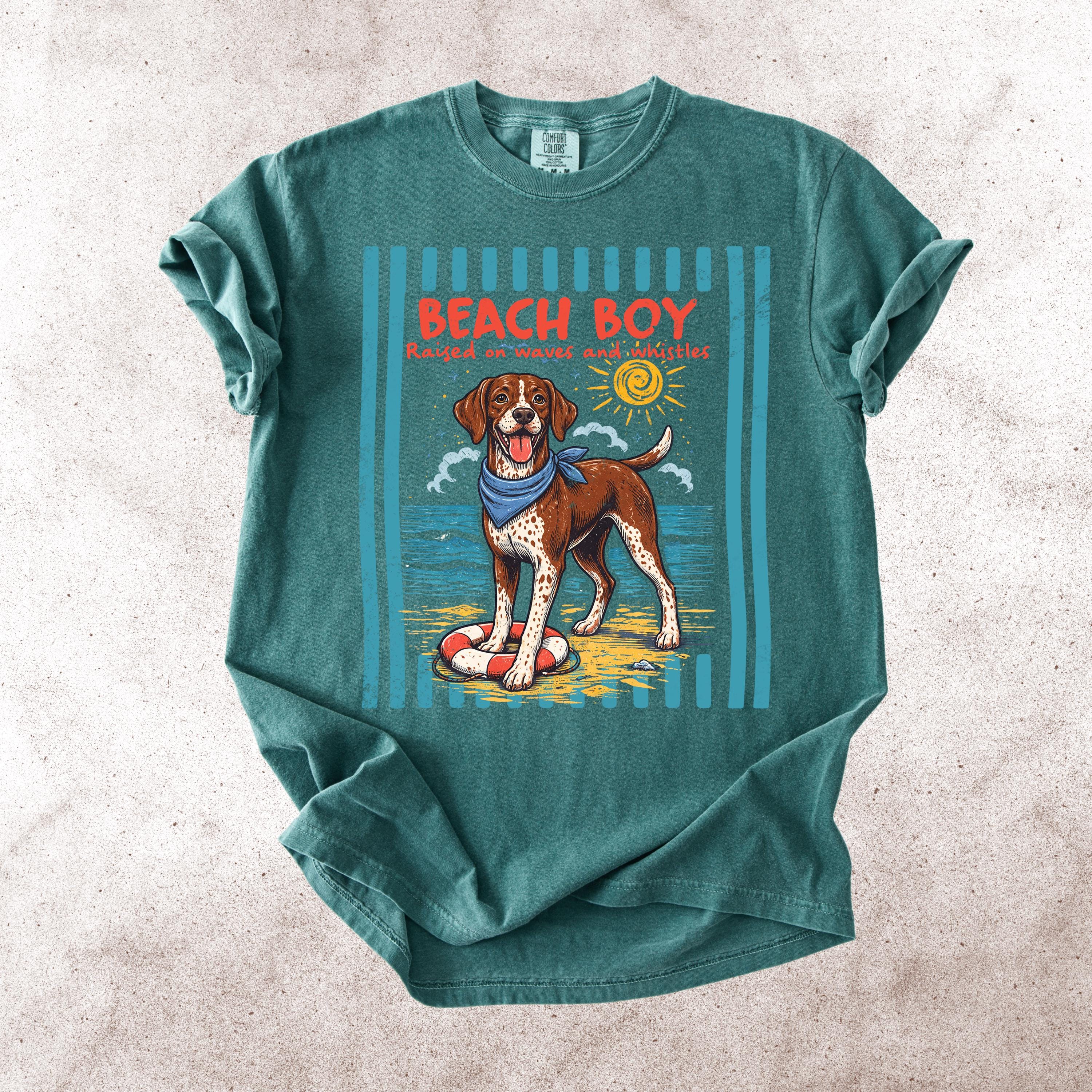 This Retro Style Beach Boy Dog Comfort Colors tee is the perfect shirt for dog lovers who enjoy sunny days, ocean vibes, and playful pups.