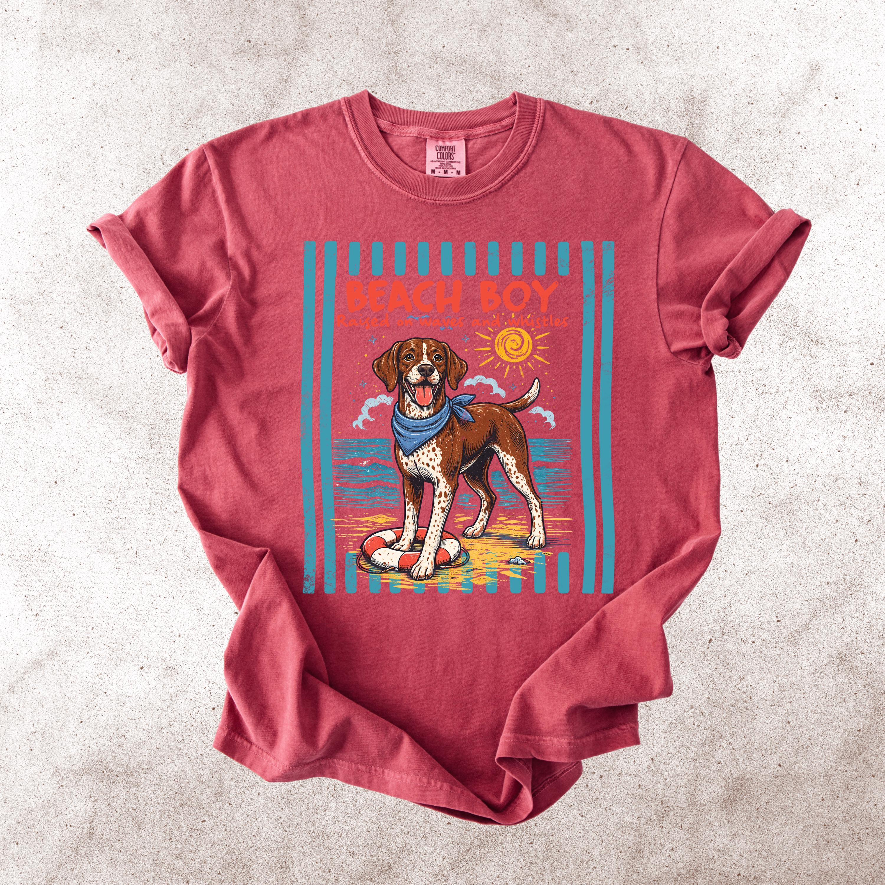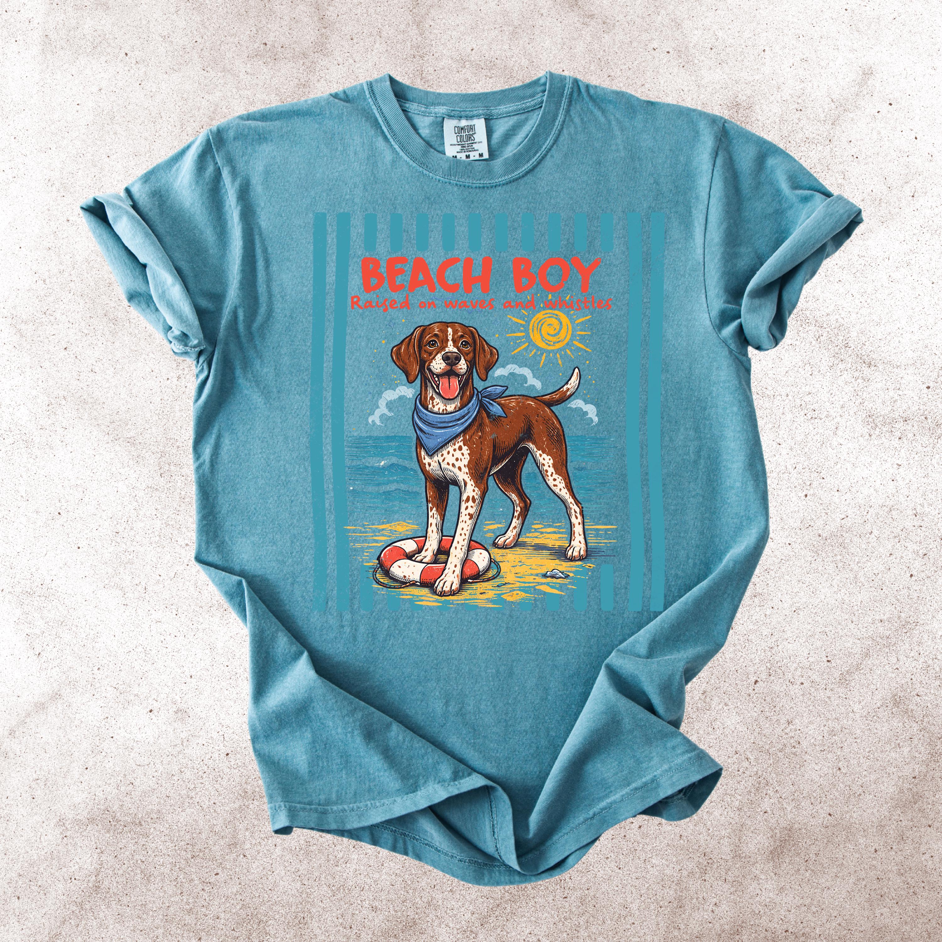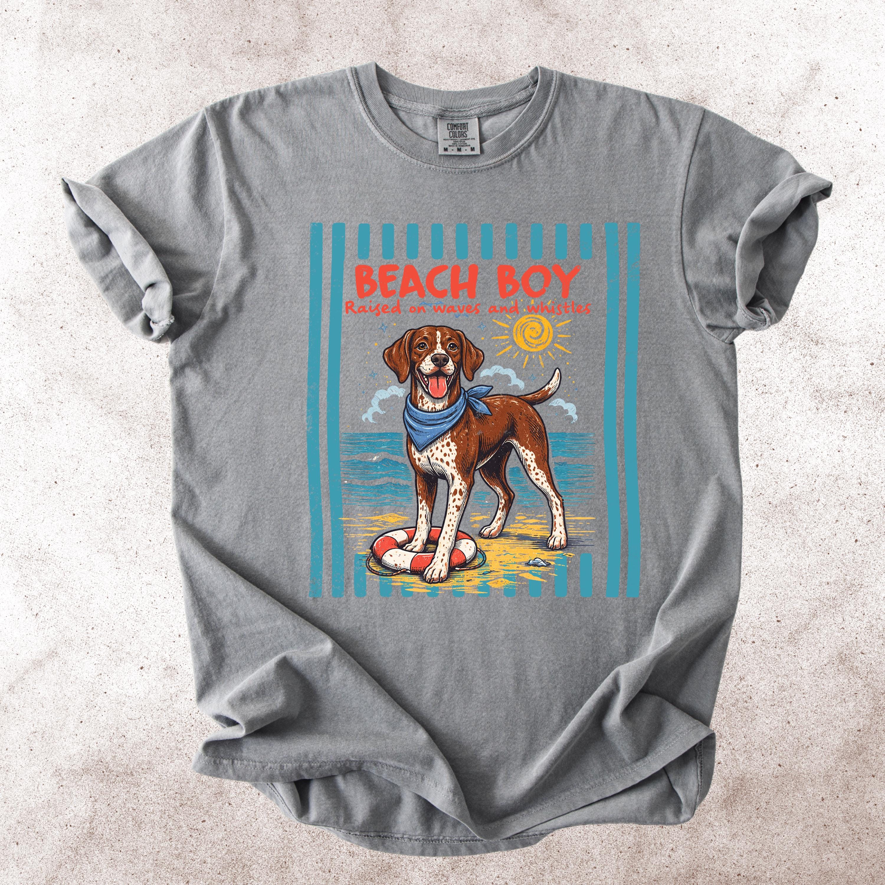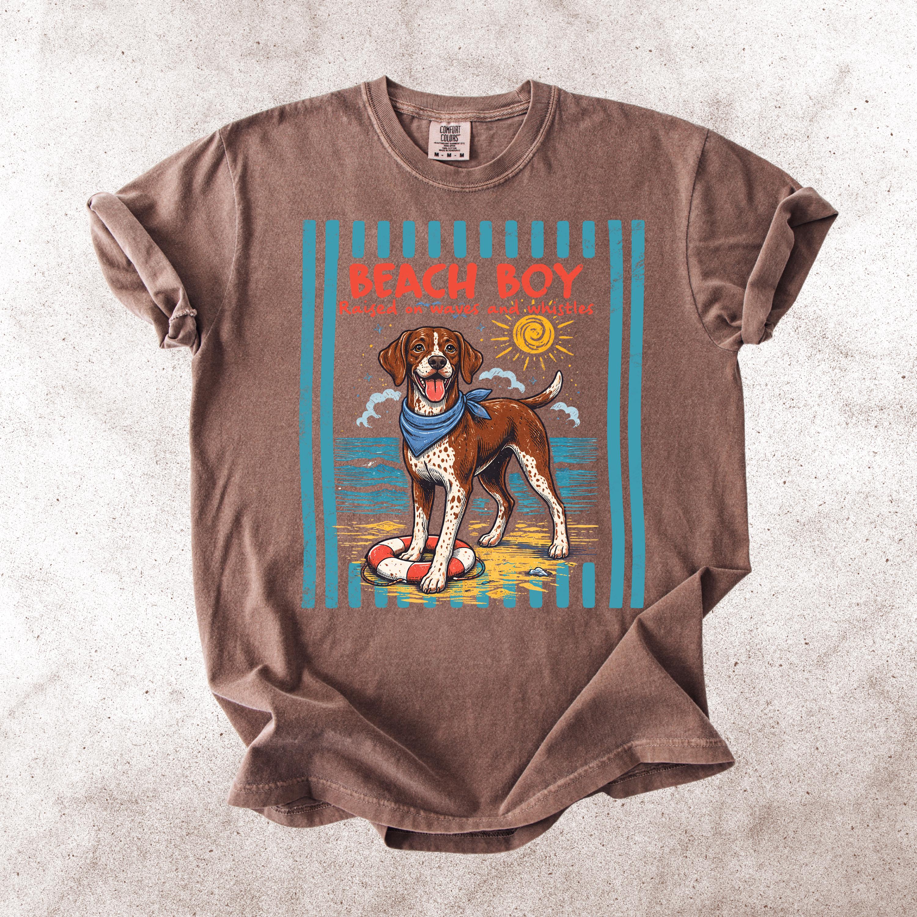 This Retro Style Beach Boy Dog Comfort Colors tee is the perfect shirt for dog lovers who enjoy sunny days, ocean vibes, and playful pups.
