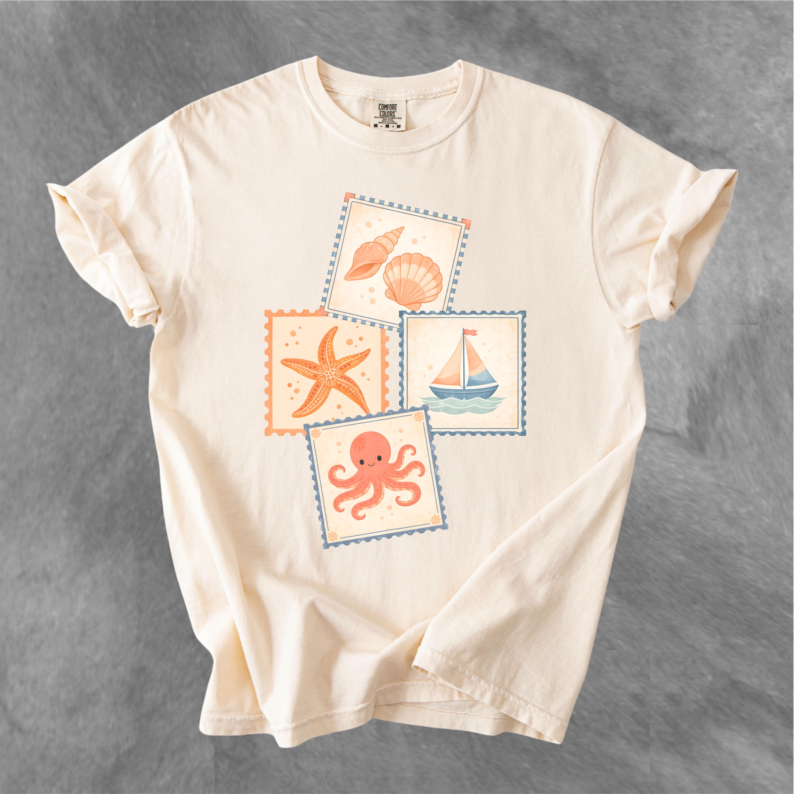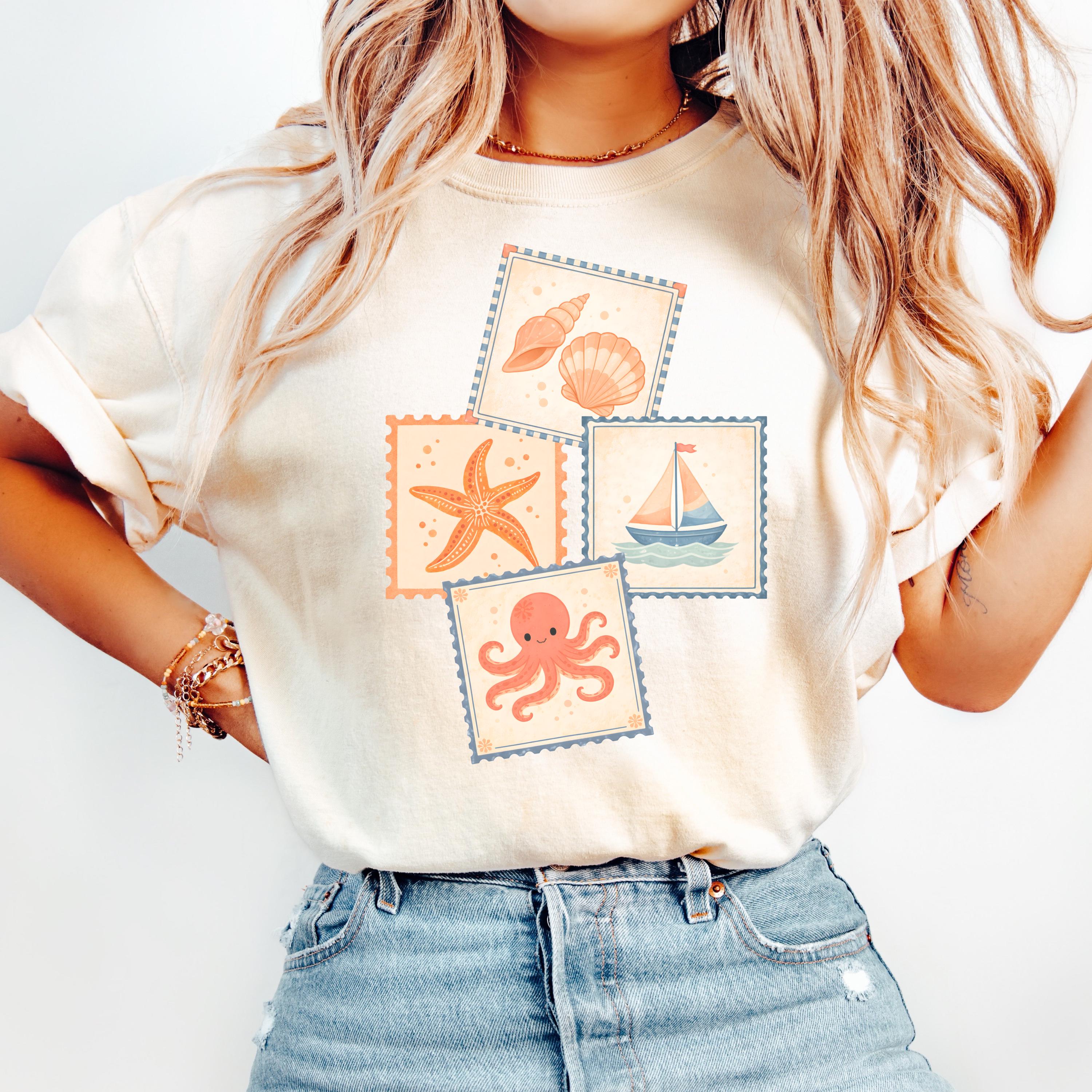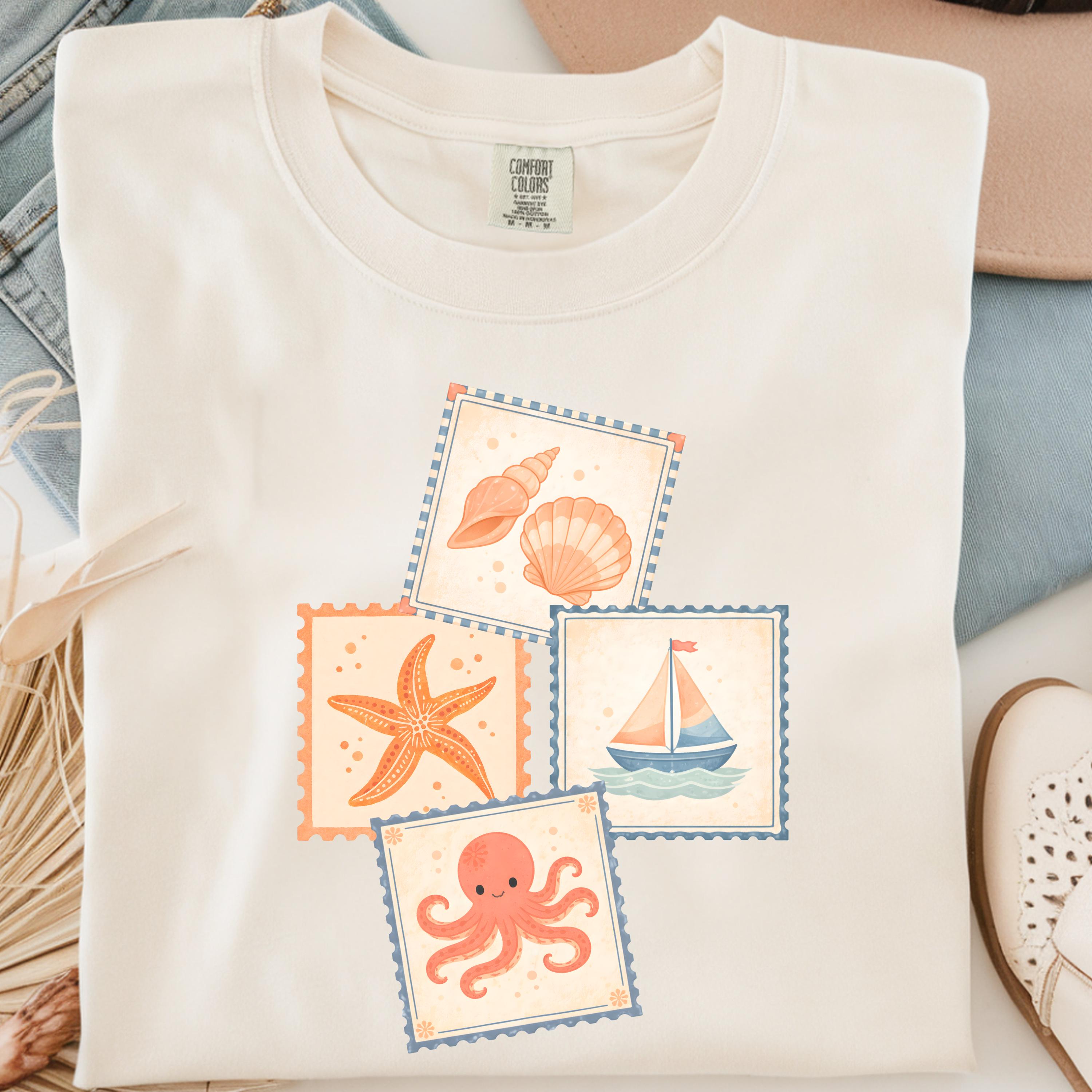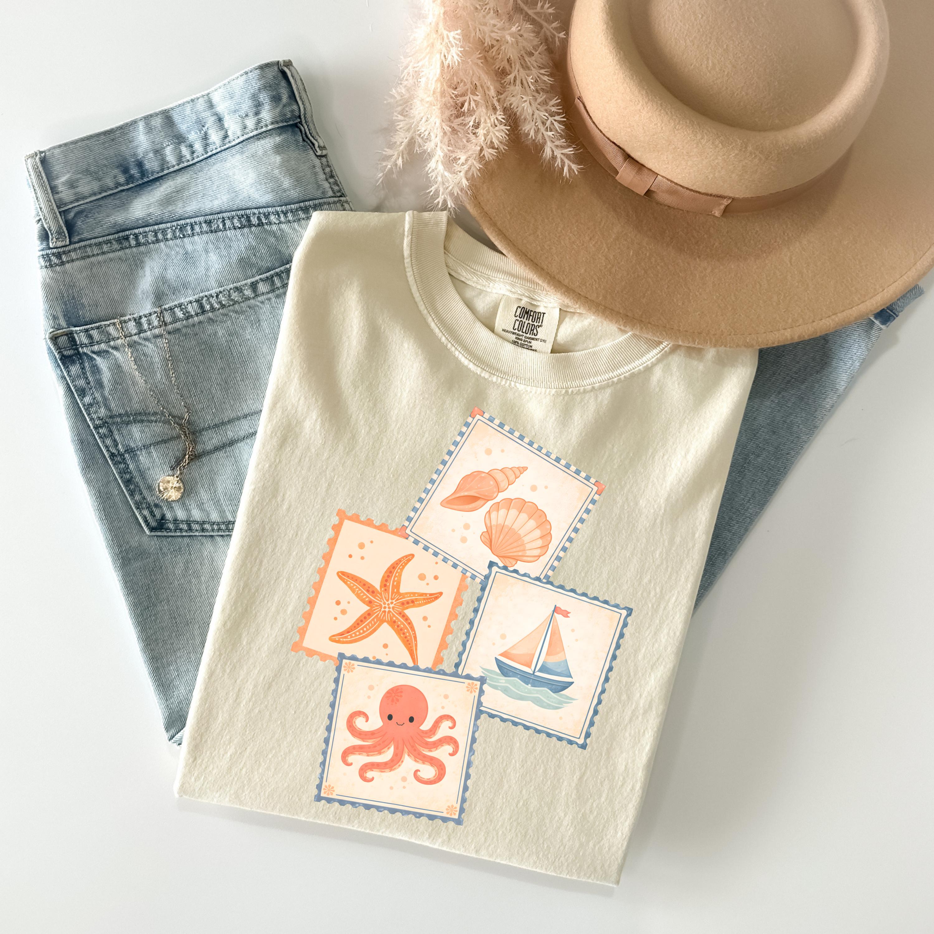 This soft, vintage-inspired design features a playful collection of coastal elements — seashells, starfish, sailboat, and a cute octopus — arranged in a charming stamp-style layout that feels like a postcard from your favorite seaside escape.