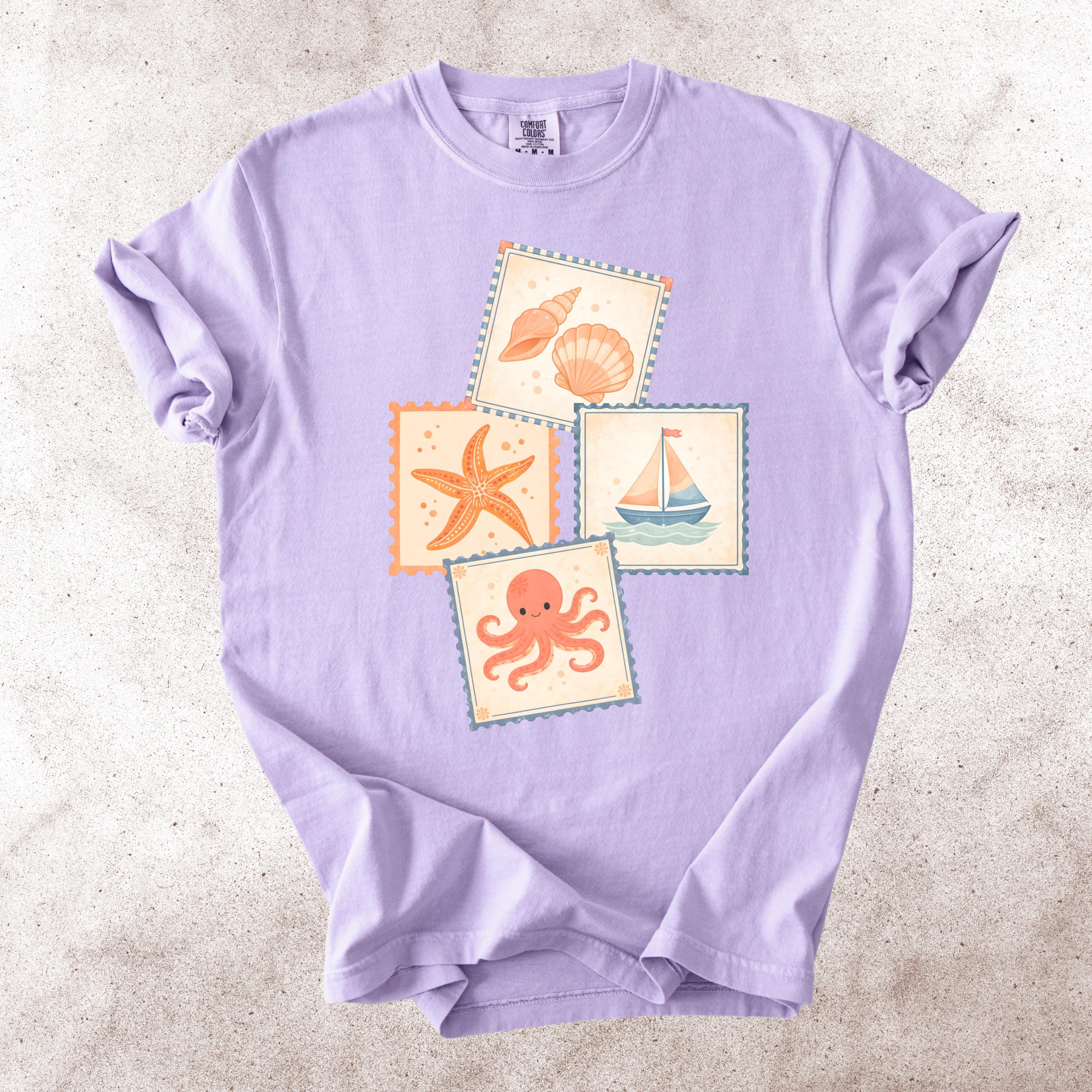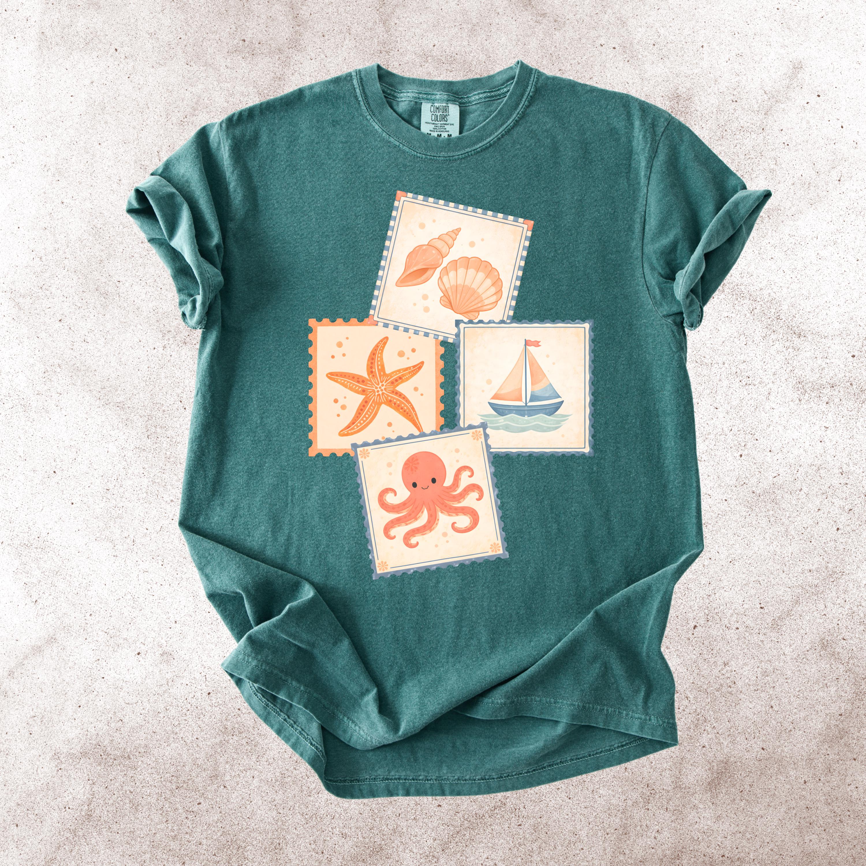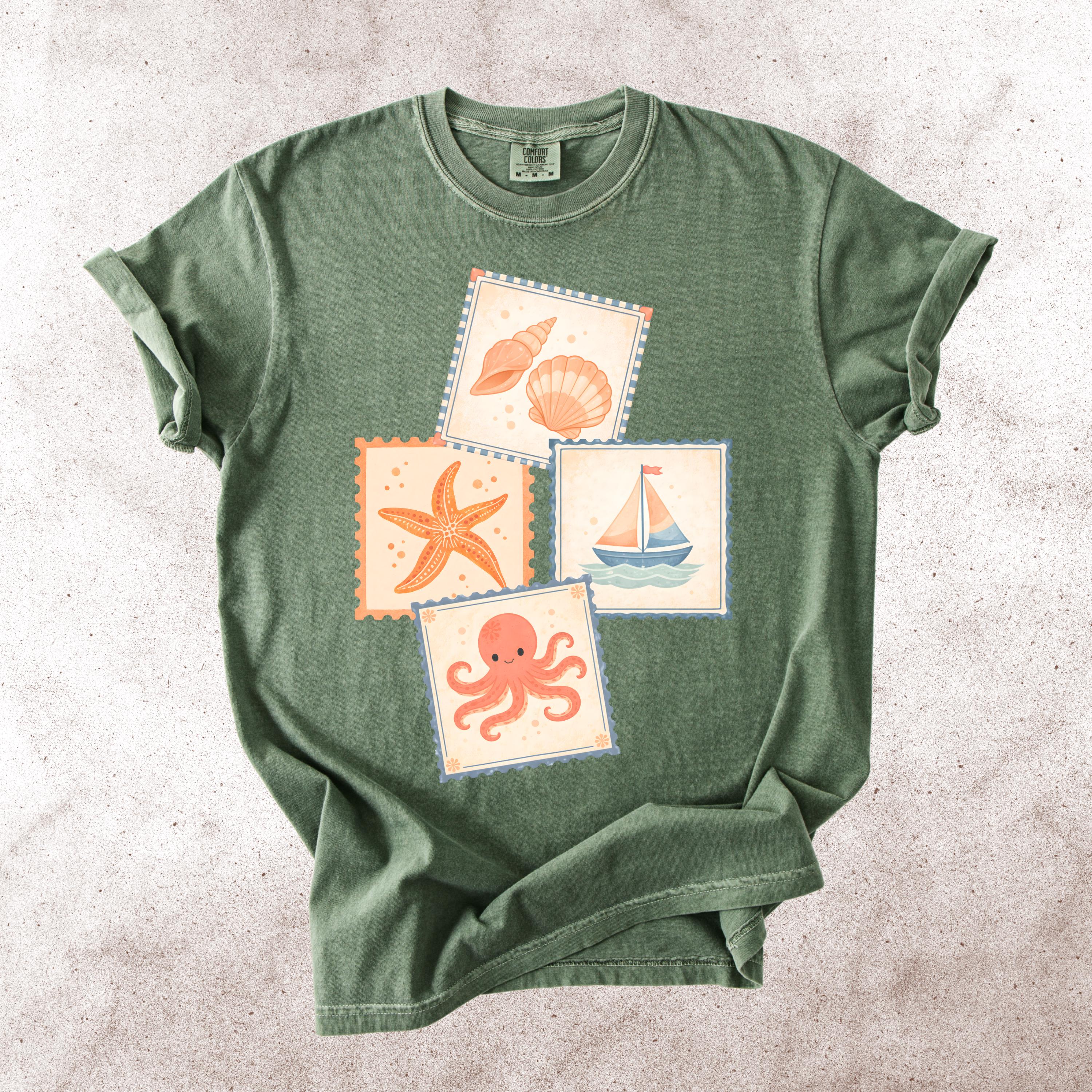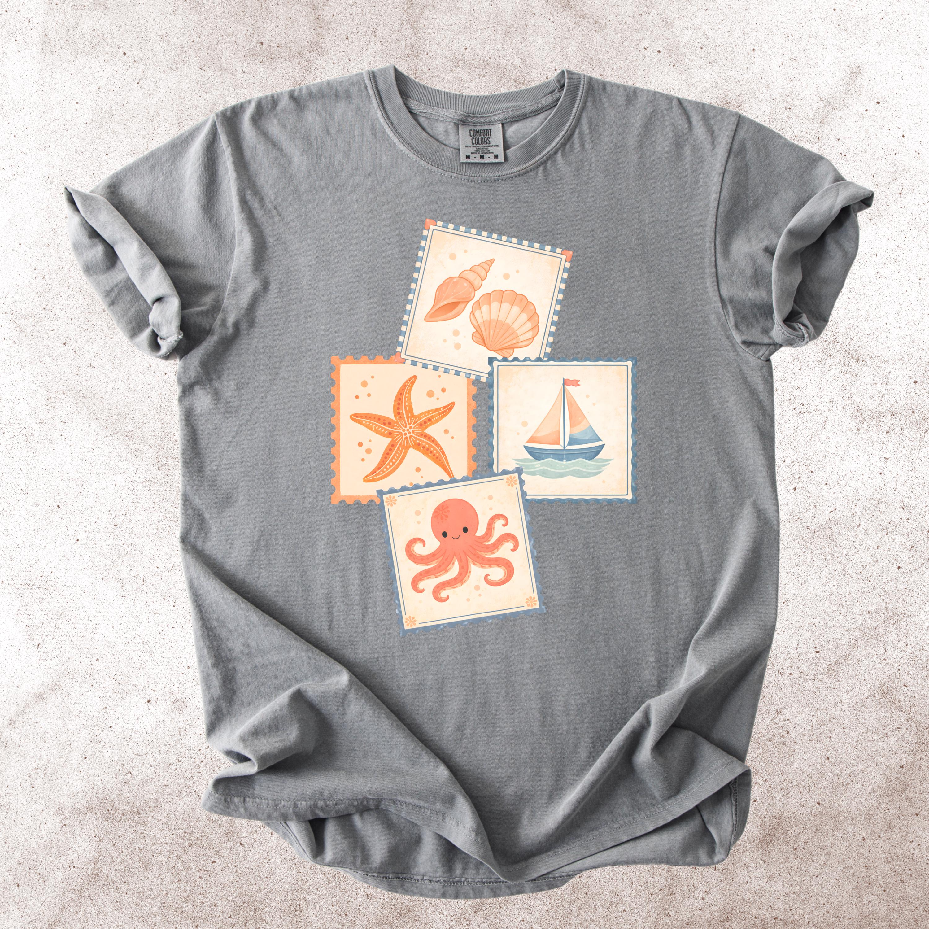 This soft, vintage-inspired design features a playful collection of coastal elements — seashells, starfish, sailboat, and a cute octopus — arranged in a charming stamp-style layout that feels like a postcard from your favorite seaside escape.